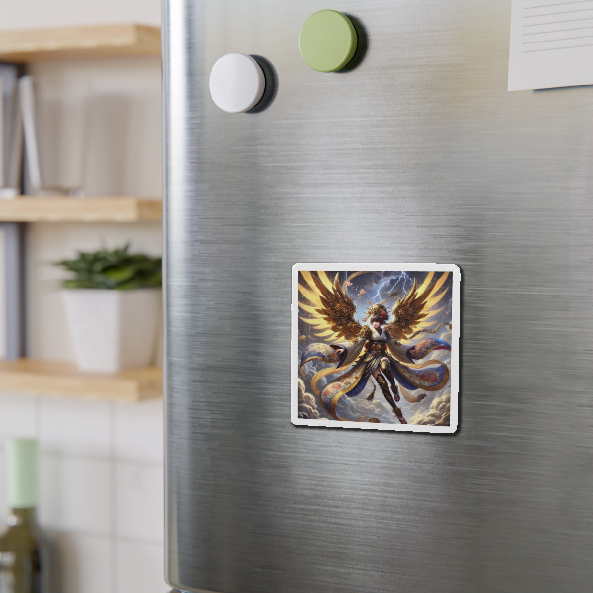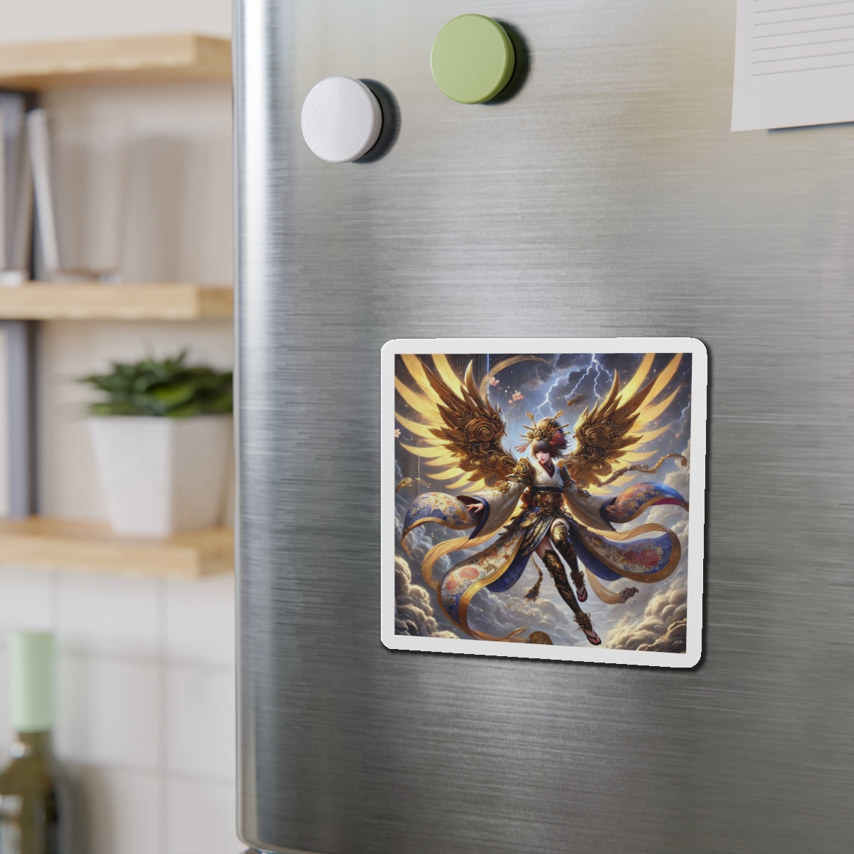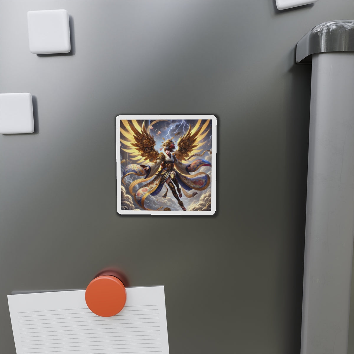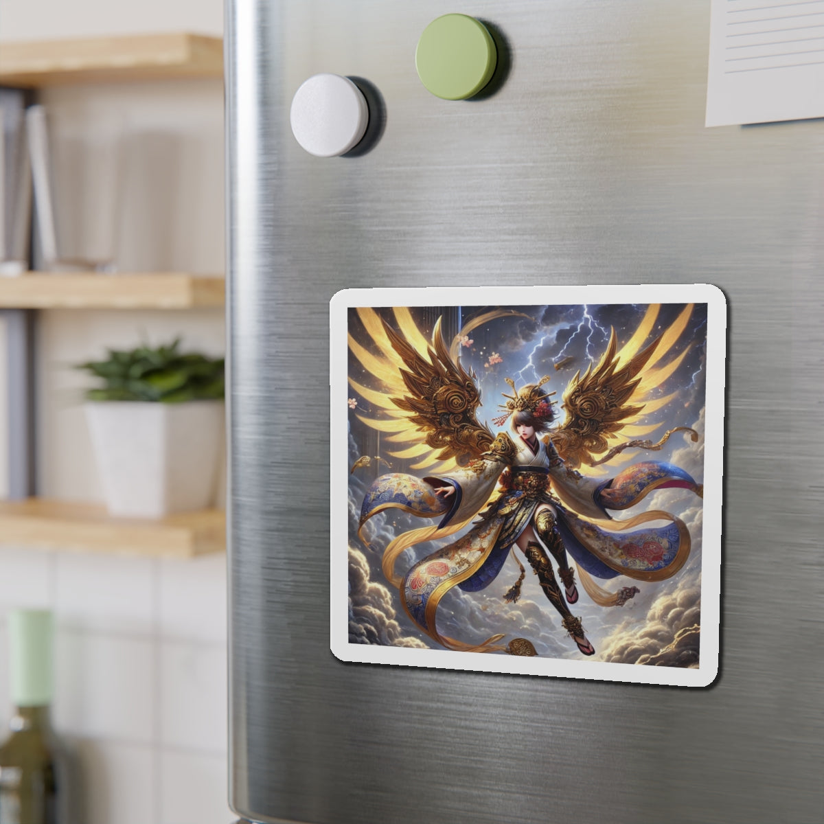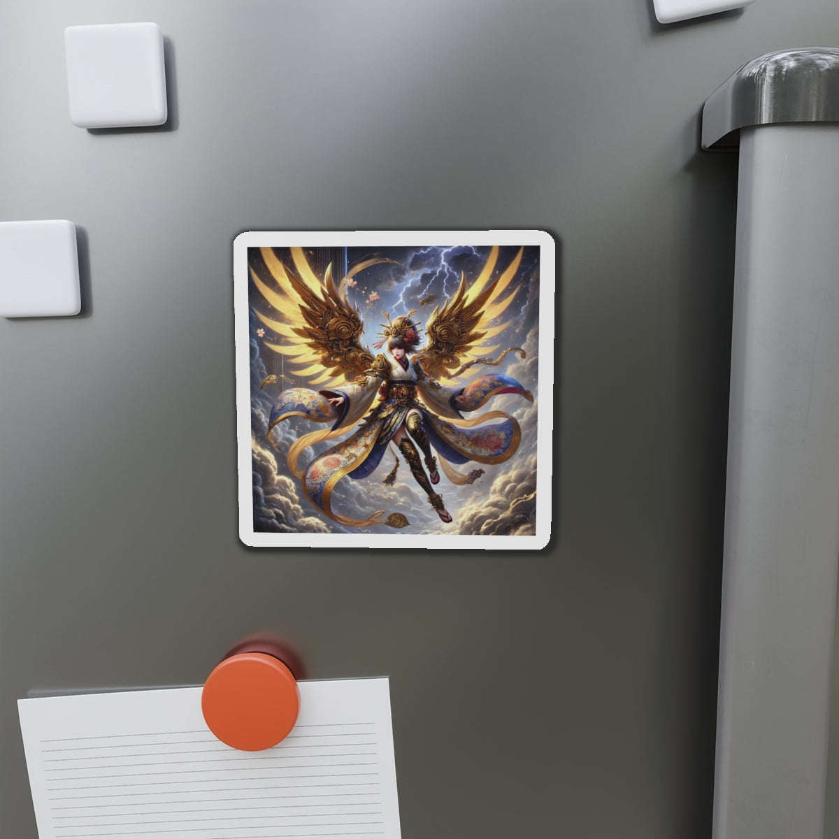 Add a touch of myth and artistry to any surface with these flexible, durable die-cut magnets. Available in four sizes, each magnet is precisely cut to highlight the dramatic design it carries: a Valkyrie descending through storm clouds, her kimono-inspired armored wings layered in gold waves and glowing runes. She wears ornate armor with a flowing sash and fully patterned leggings, every detail captured with sharp clarity and bold color. The stormy backdrop, alive with subtle lightning yet perfectly balanced, enhances the theatrical power of the scene. Blending Norse mythology with Japanese Kabuki aesthetics, these magnets transform everyday spaces into showcases of fantasy storytelling and timeless design.