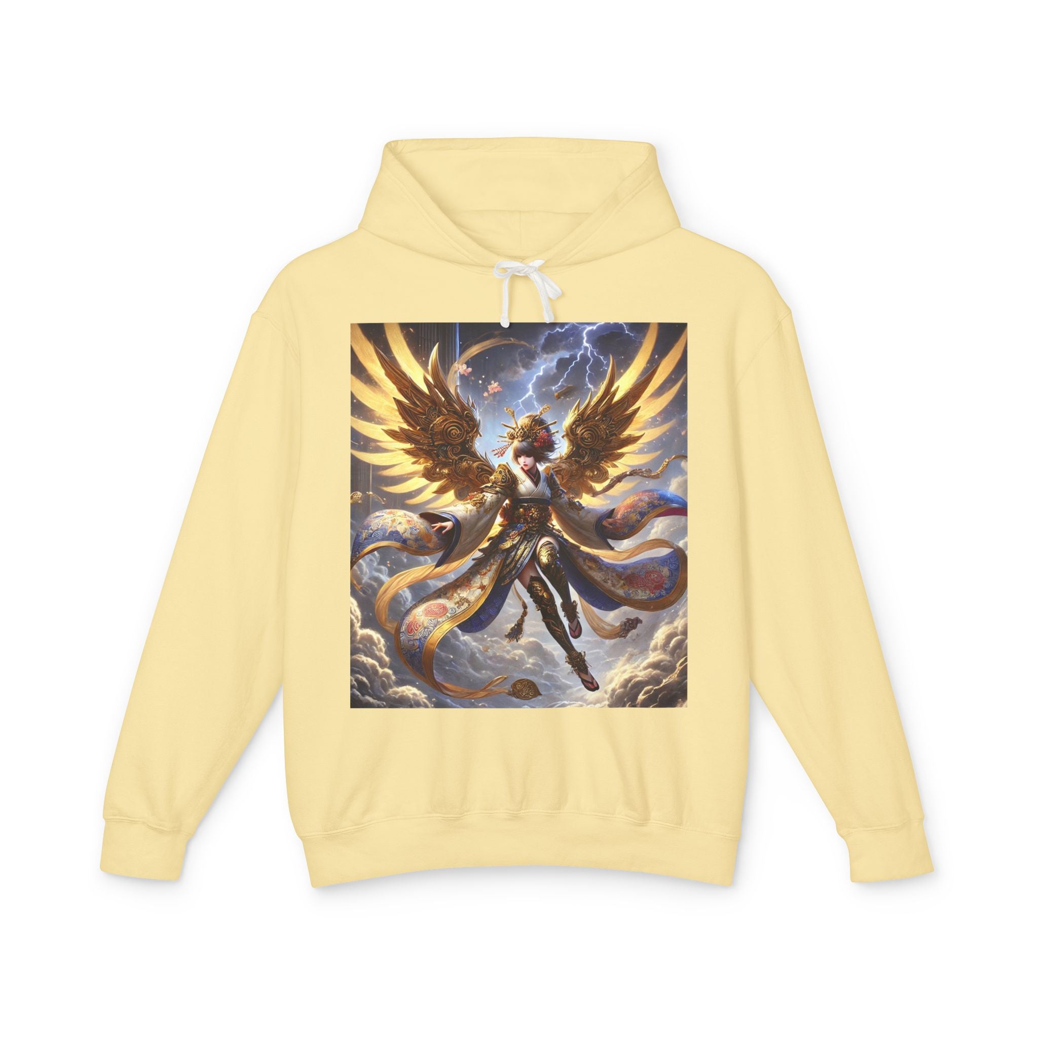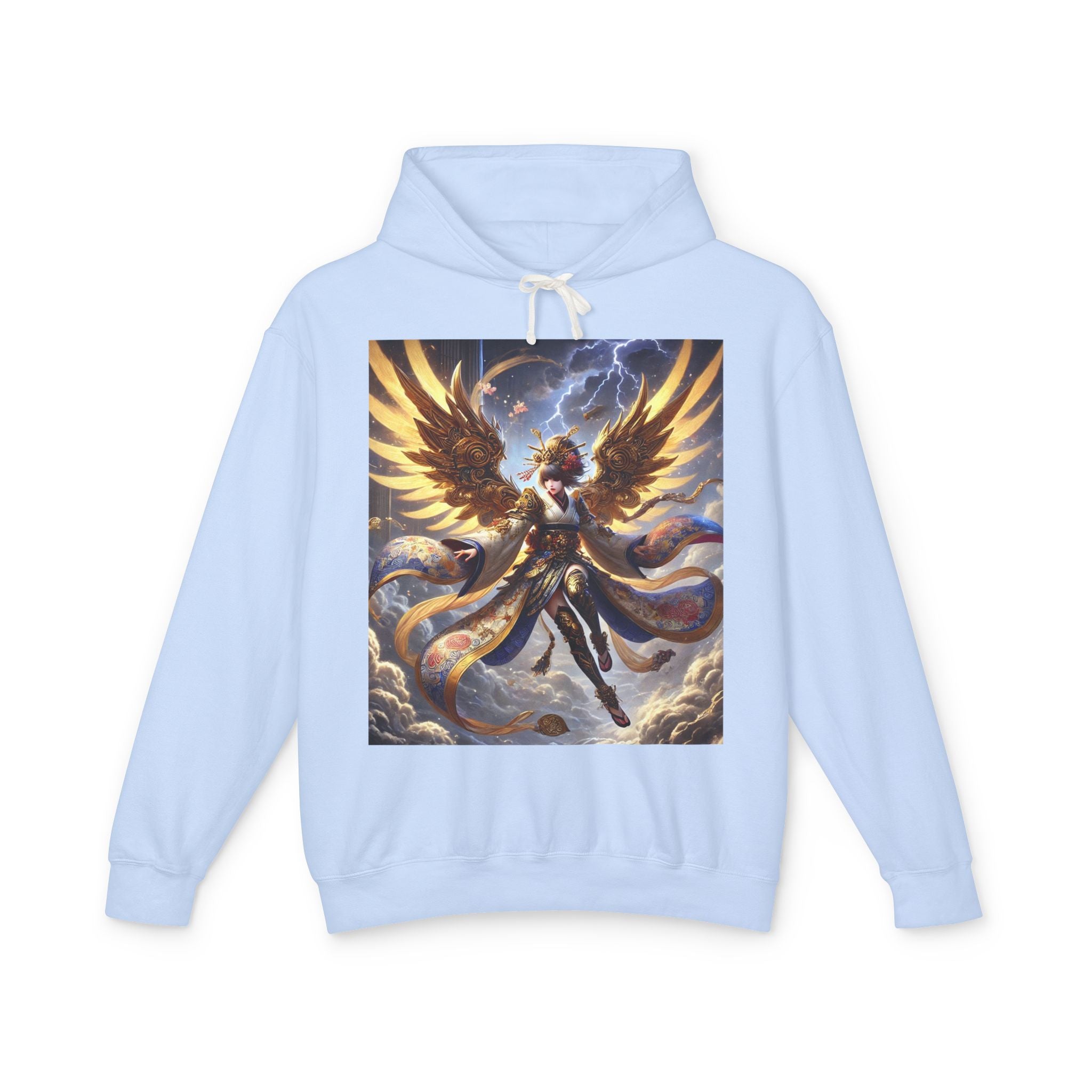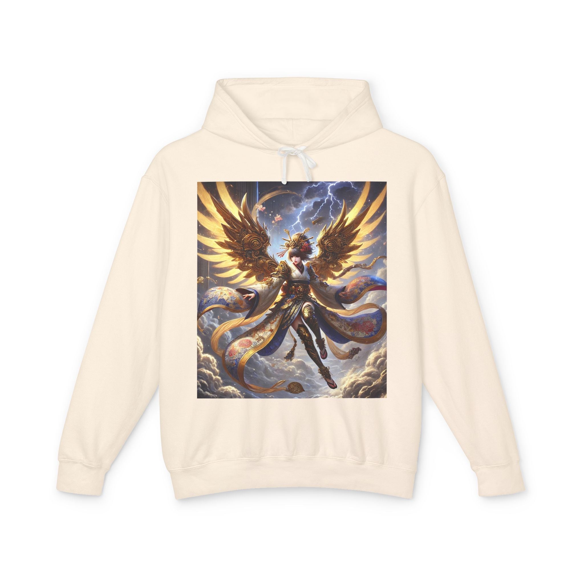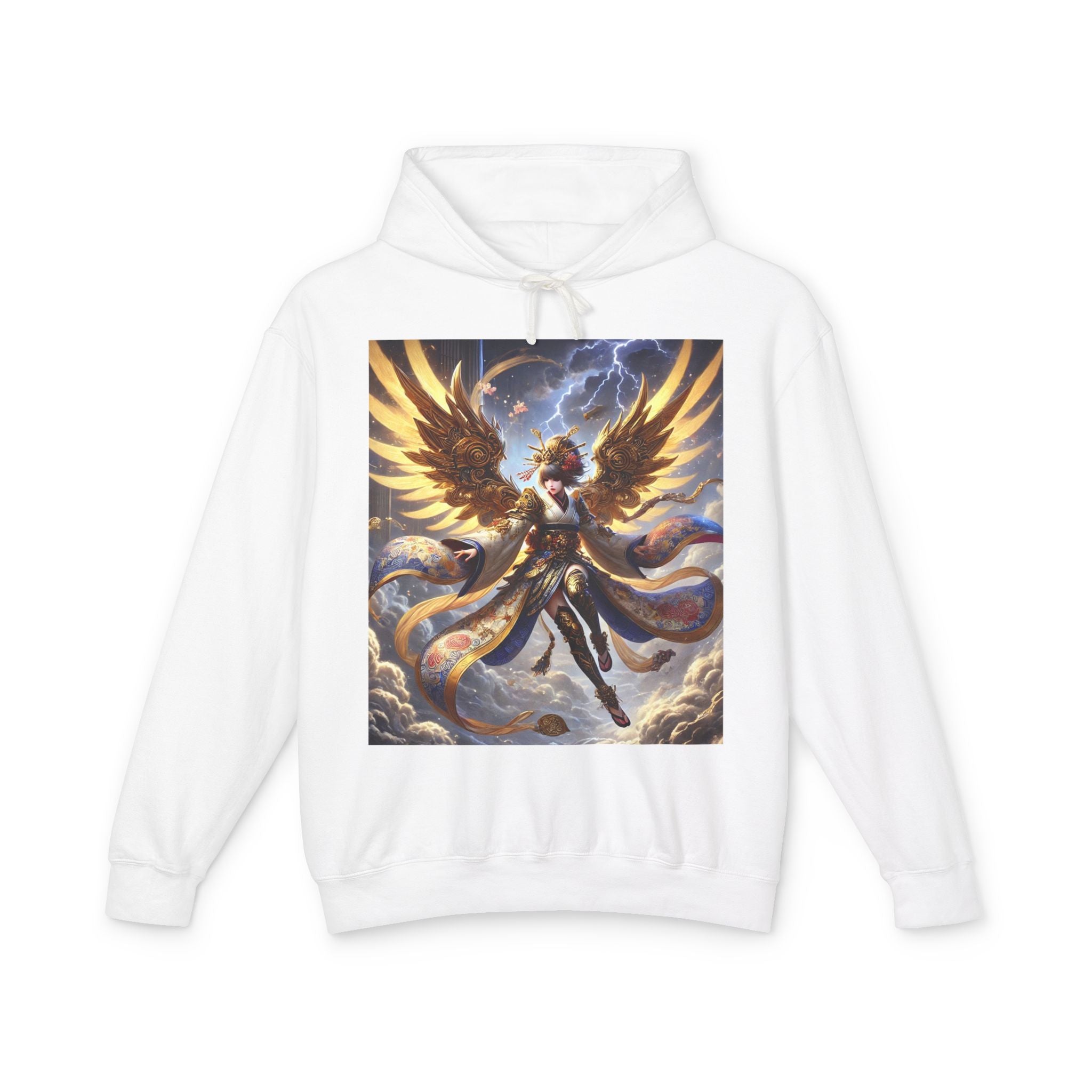 This striking artwork unites Norse mythology with the expressive drama of Japanese Kabuki aesthetics, portraying a Valkyrie descending through swirling storm clouds. Her kimono-inspired armored wings unfold in sweeping layers of gold waves and glowing runes, while ornate armor, a flowing sash, and patterned leggings are rendered with flawless clarity. Behind her, orderly storm clouds pulse with subtle lightning, adding tension and grandeur to the scene. Bold, balanced, and symbolically rich, the design transforms the hoodie into an unforgettable piece of wearable legend.