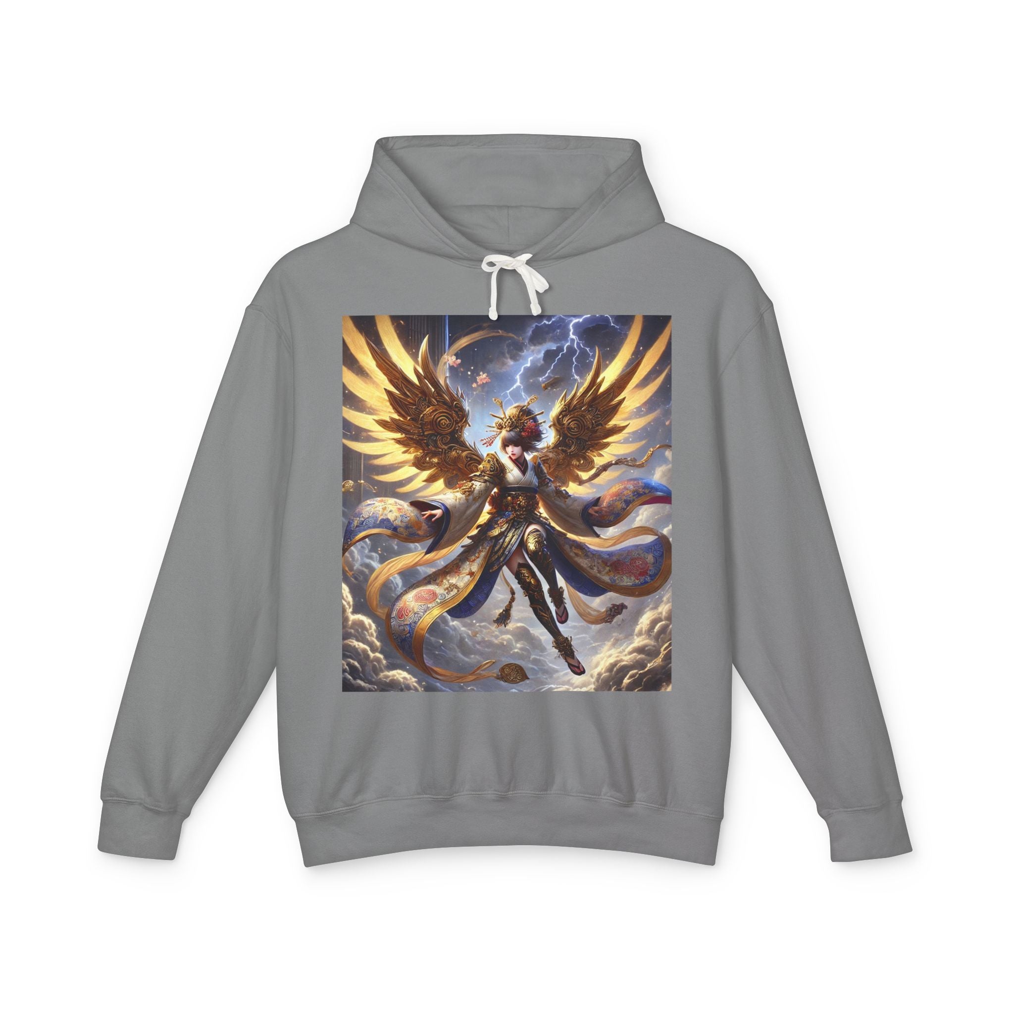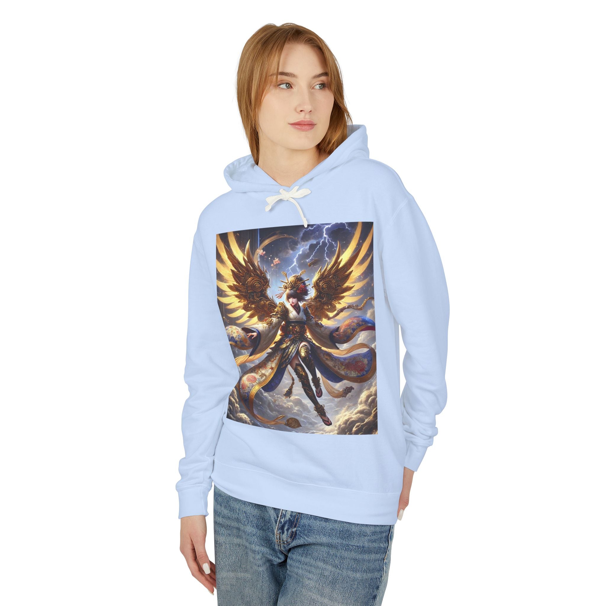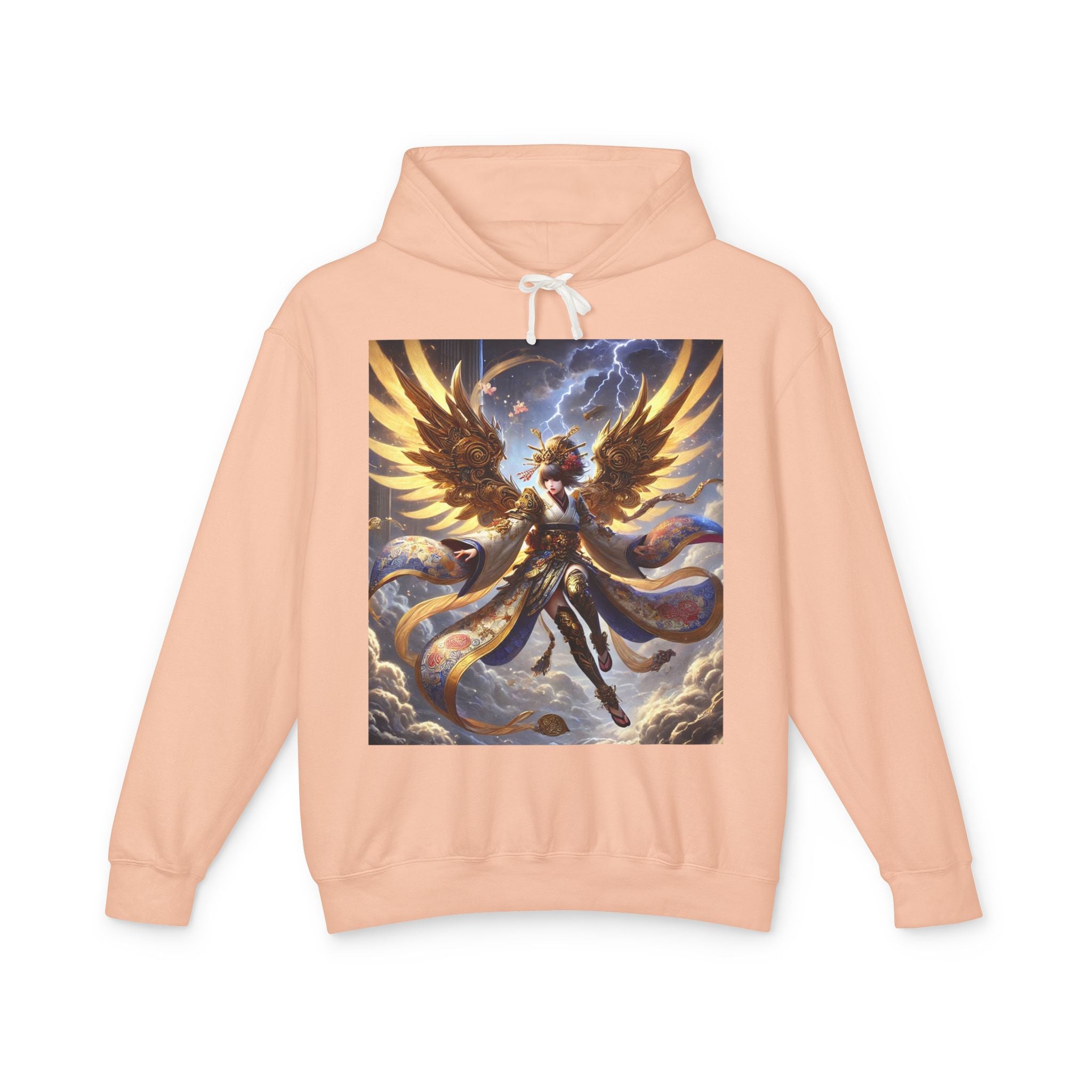 This striking artwork unites Norse mythology with the expressive drama of Japanese Kabuki aesthetics, portraying a Valkyrie descending through swirling storm clouds. Her kimono-inspired armored wings unfold in sweeping layers of gold waves and glowing runes, while ornate armor, a flowing sash, and patterned leggings are rendered with flawless clarity. Behind her, orderly storm clouds pulse with subtle lightning, adding tension and grandeur to the scene. Bold, balanced, and symbolically rich, the design transforms the hoodie into an unforgettable piece of wearable legend.