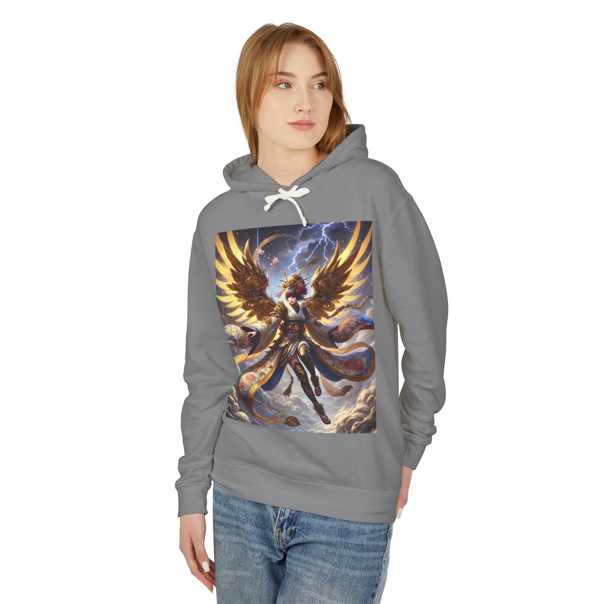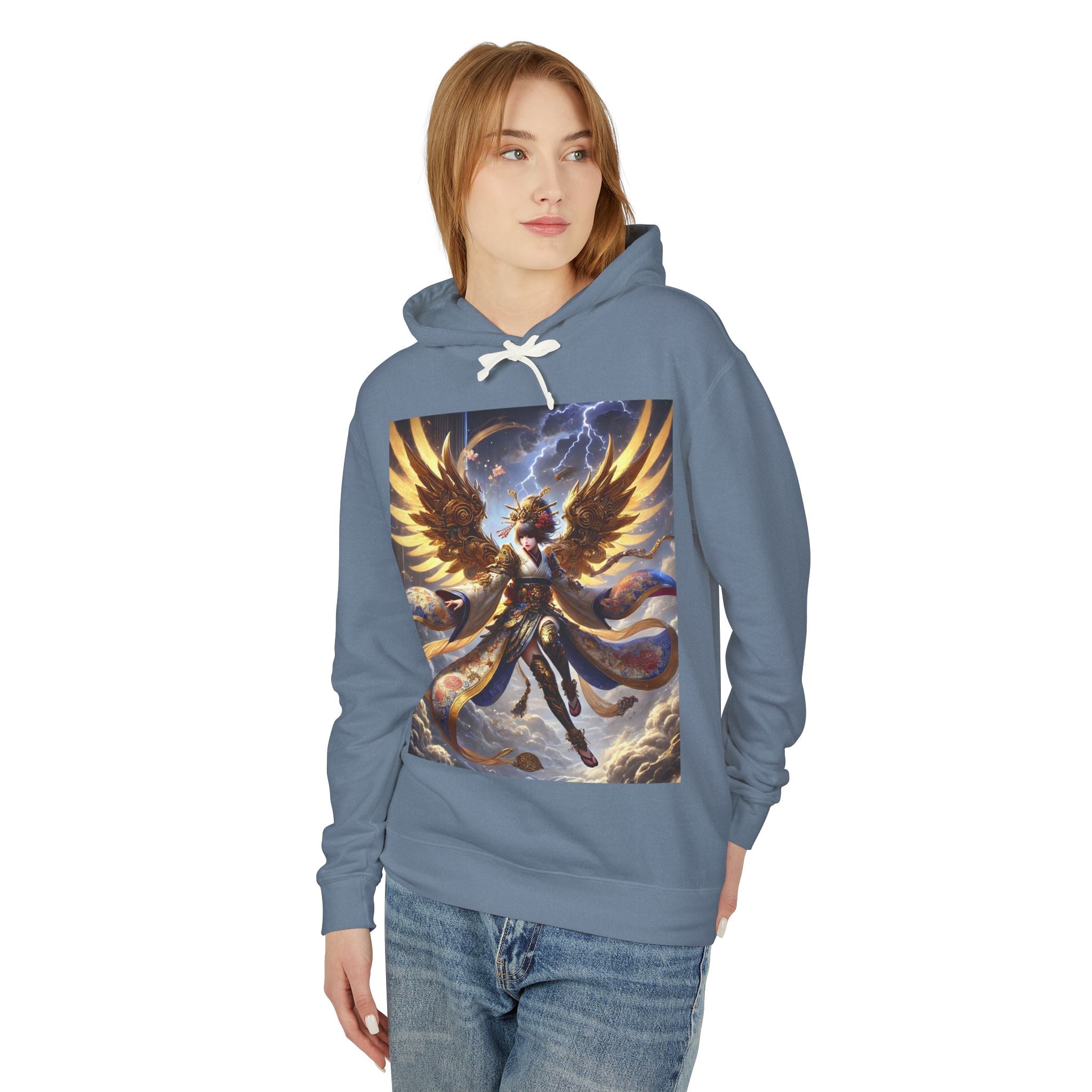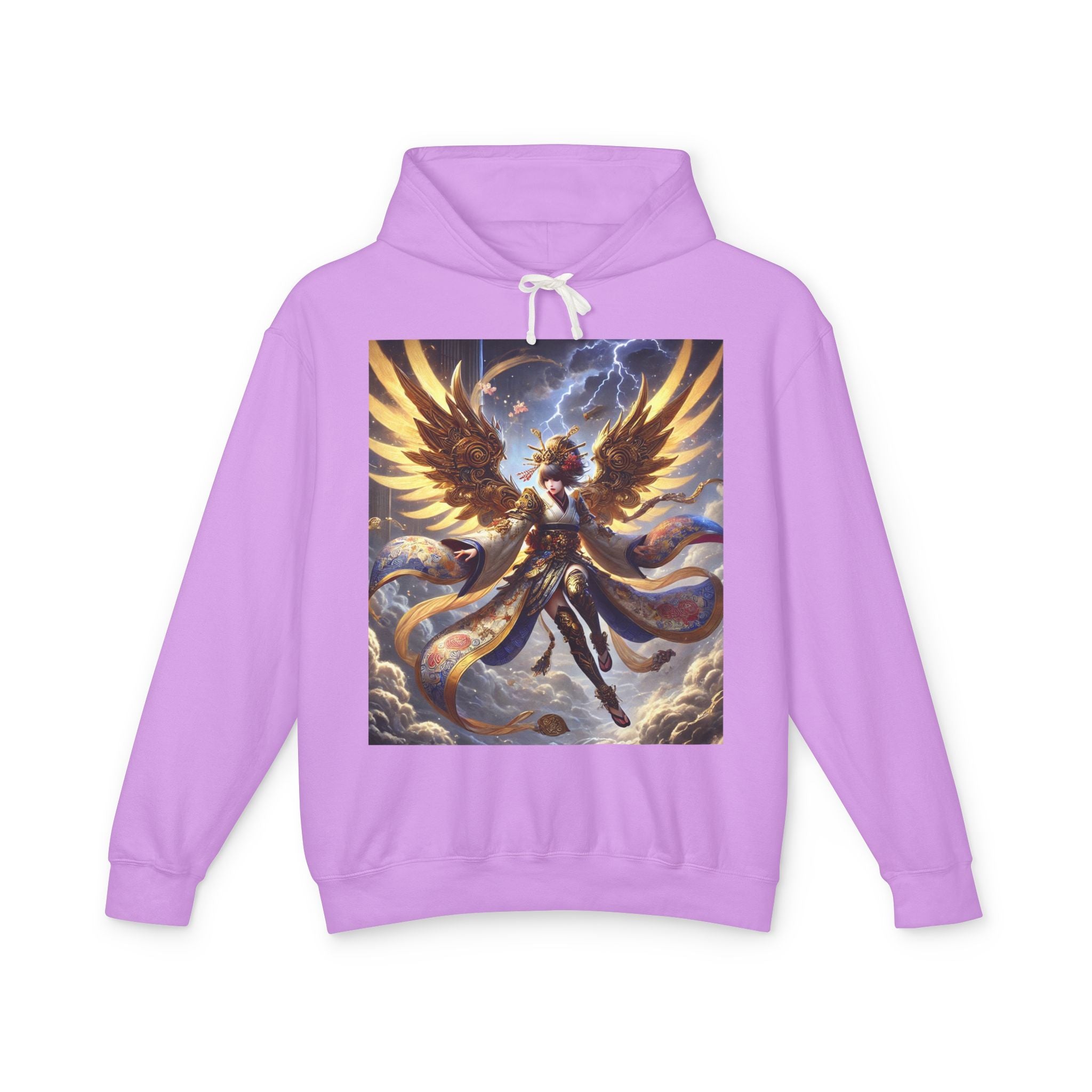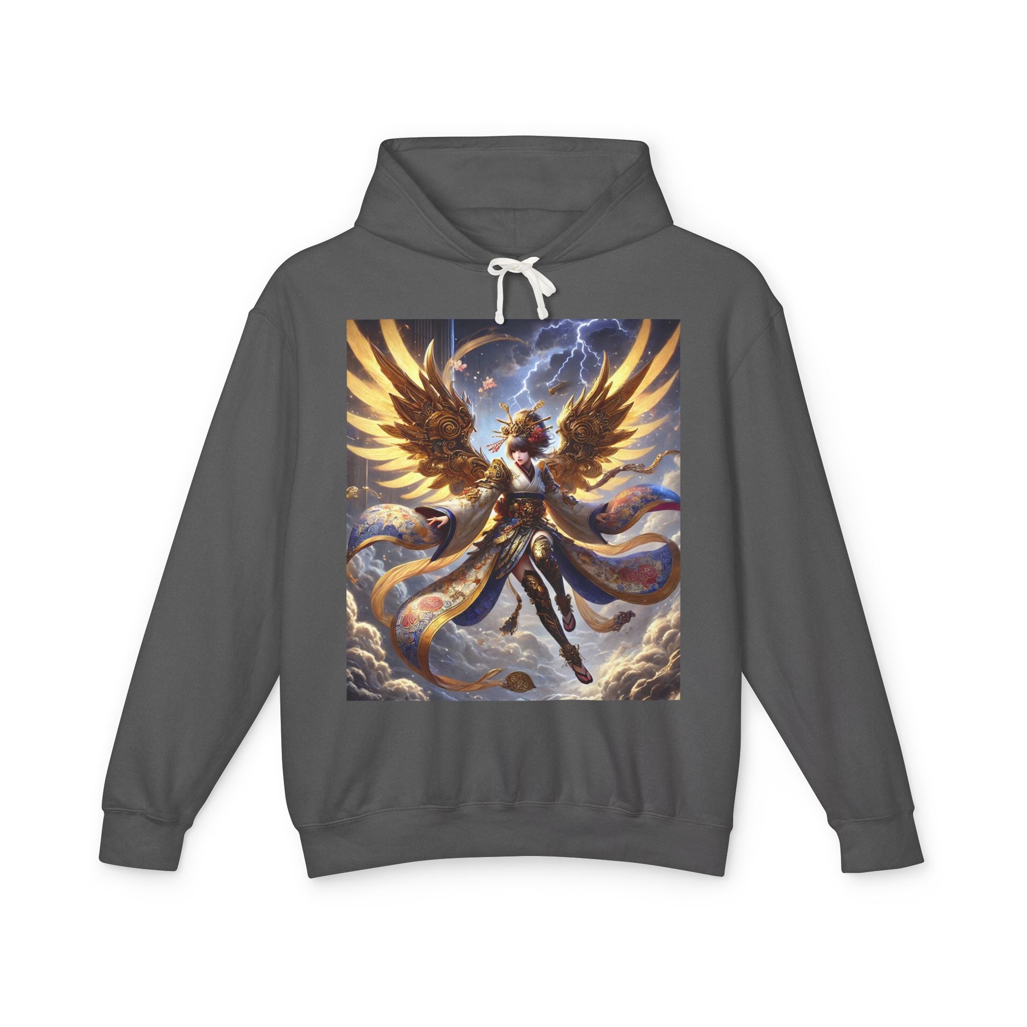 This striking artwork unites Norse mythology with the expressive drama of Japanese Kabuki aesthetics, portraying a Valkyrie descending through swirling storm clouds. Her kimono-inspired armored wings unfold in sweeping layers of gold waves and glowing runes, while ornate armor, a flowing sash, and patterned leggings are rendered with flawless clarity. Behind her, orderly storm clouds pulse with subtle lightning, adding tension and grandeur to the scene. Bold, balanced, and symbolically rich, the design transforms the hoodie into an unforgettable piece of wearable legend.