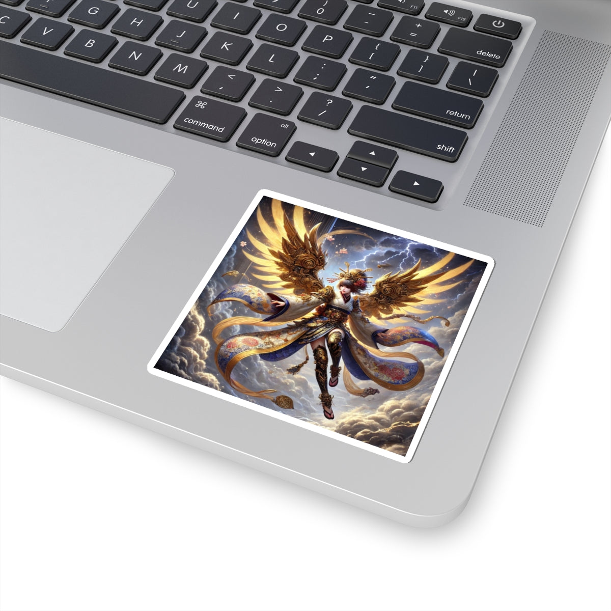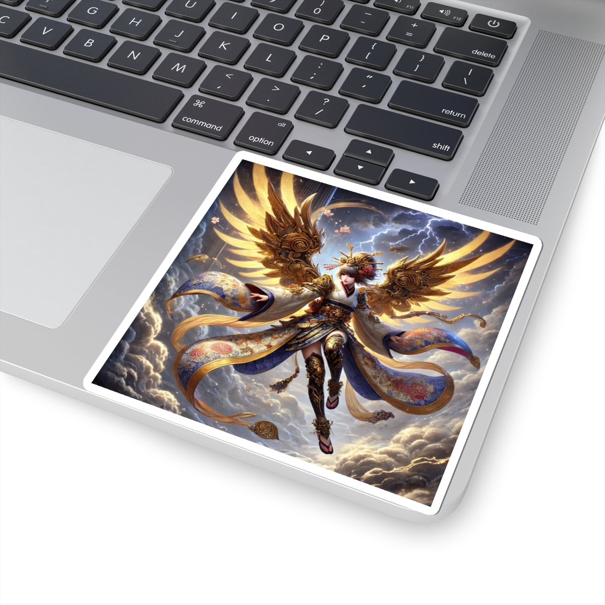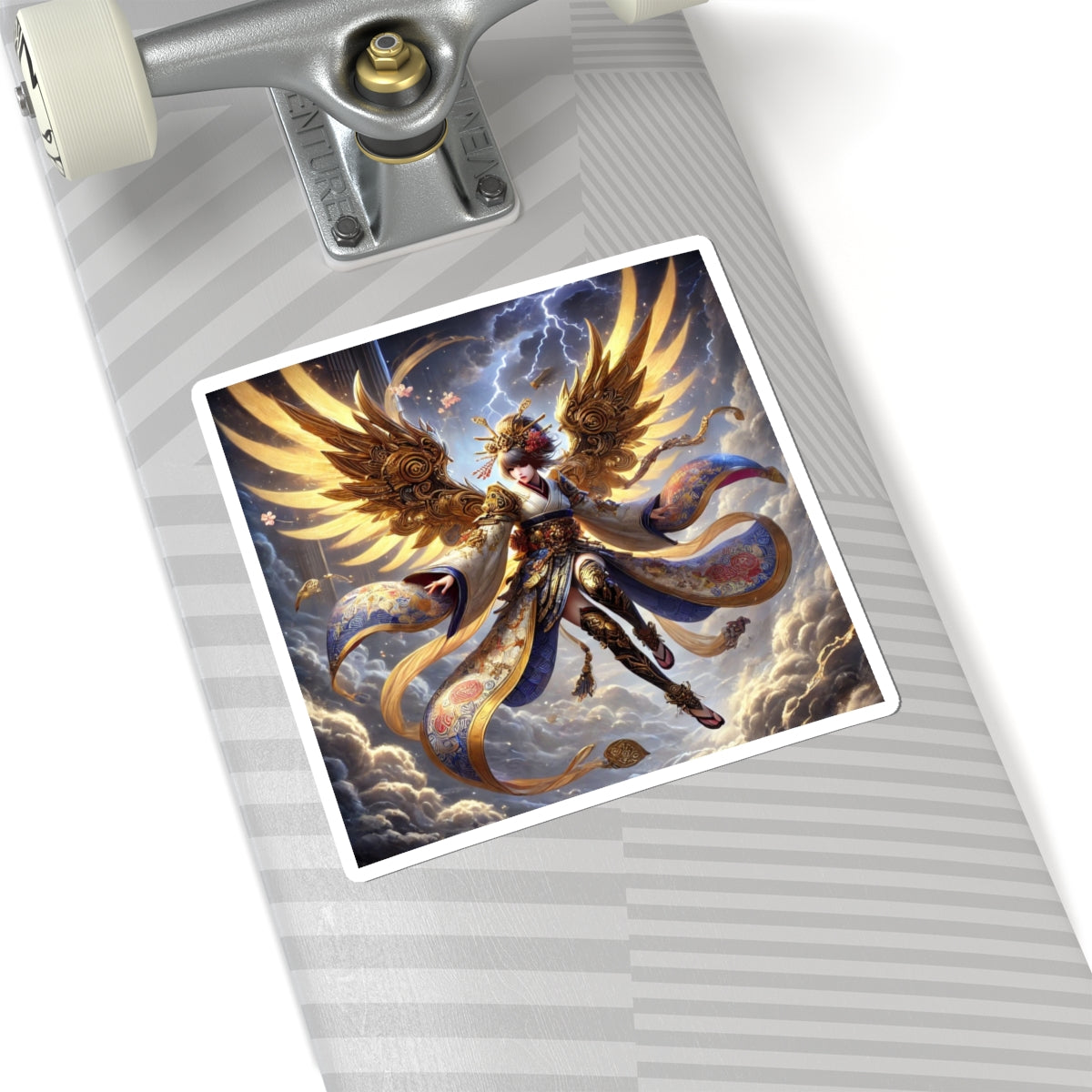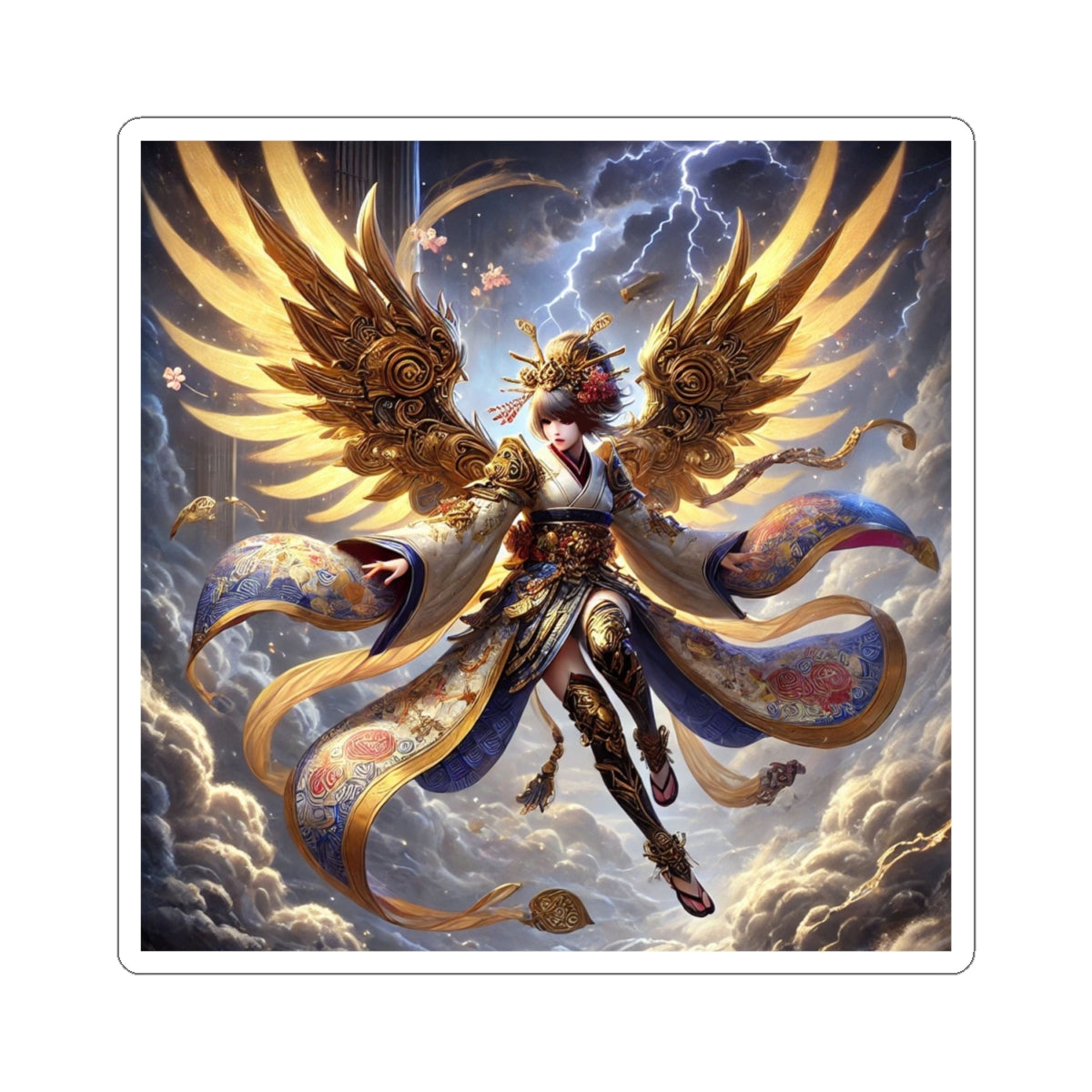 Bring myth and drama to your everyday items with this set of four kiss-cut stickers, precisely shaped for smooth peeling while leaving the backing intact. Each sticker carries a breathtaking artwork that unites Norse mythology with Japanese Kabuki aesthetics, showcasing a Valkyrie descending through storm clouds. Her kimono-inspired armored wings are layered in gold waves and glowing runes, while her ornate armor, flowing sash, and patterned leggings are rendered with flawless clarity. Set against a stormy backdrop alive with subtle lightning, the bold colors and symbolic detail create a balanced, distortion-free composition. These stickers transform laptops, journals, or any surface into a stage for fantasy storytelling and striking design.