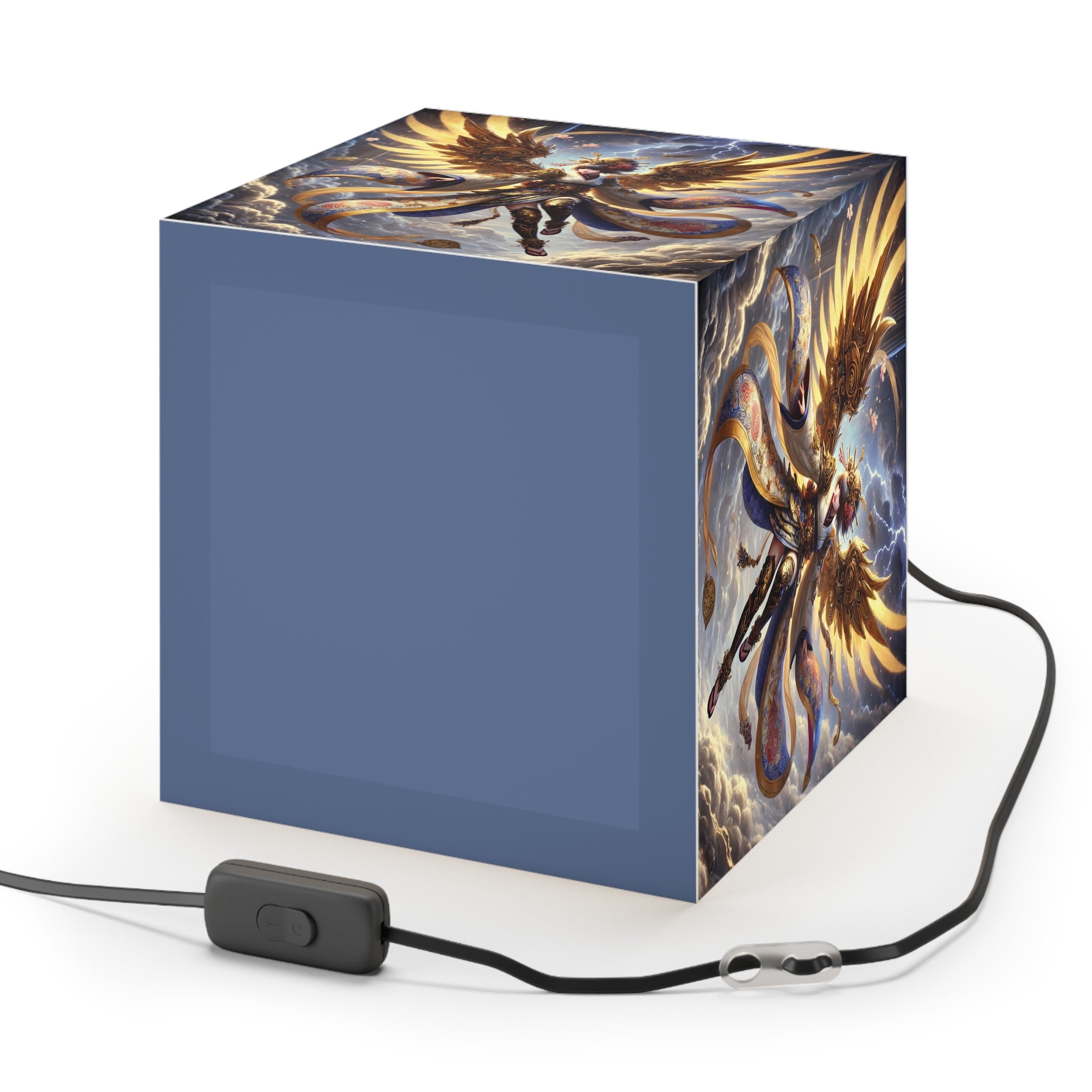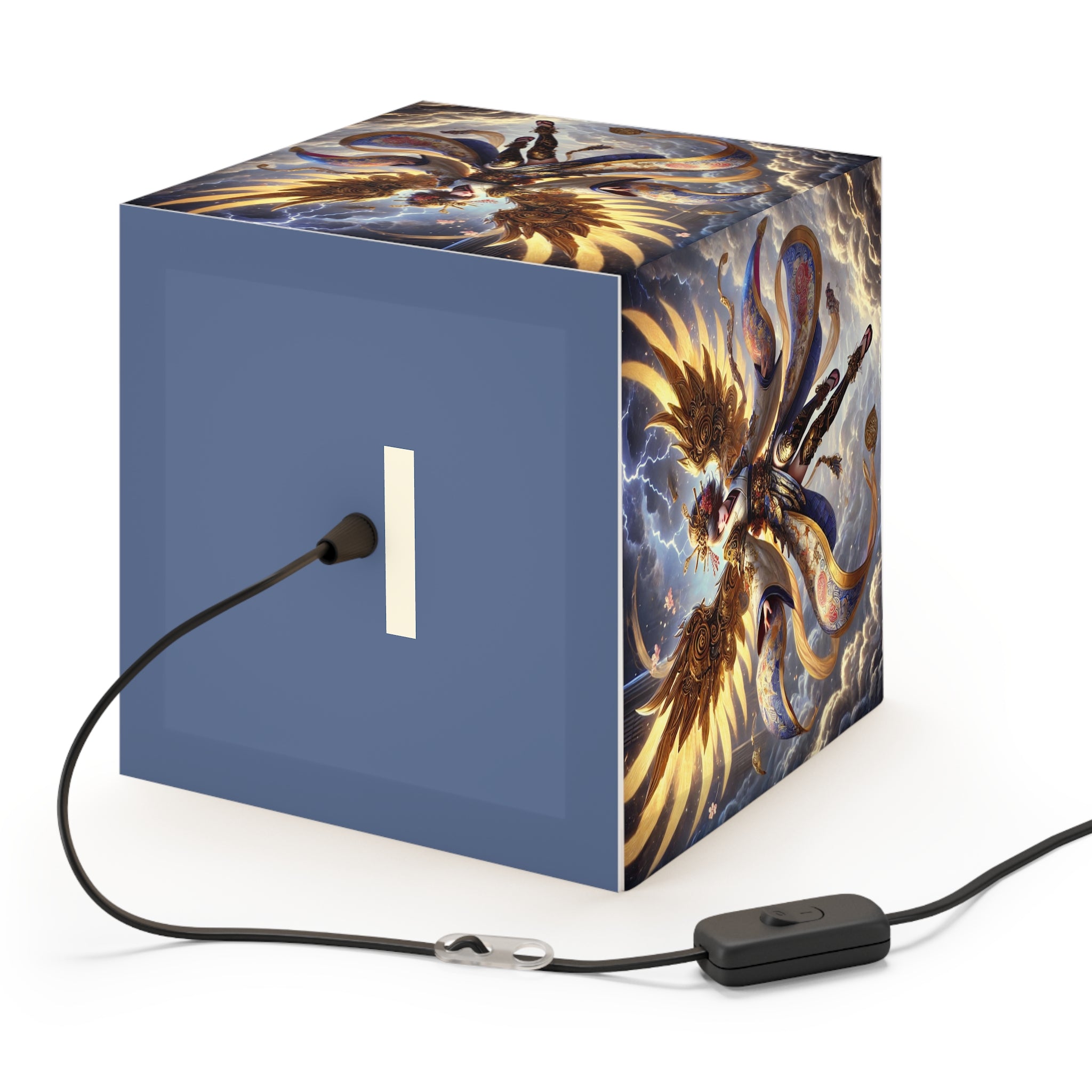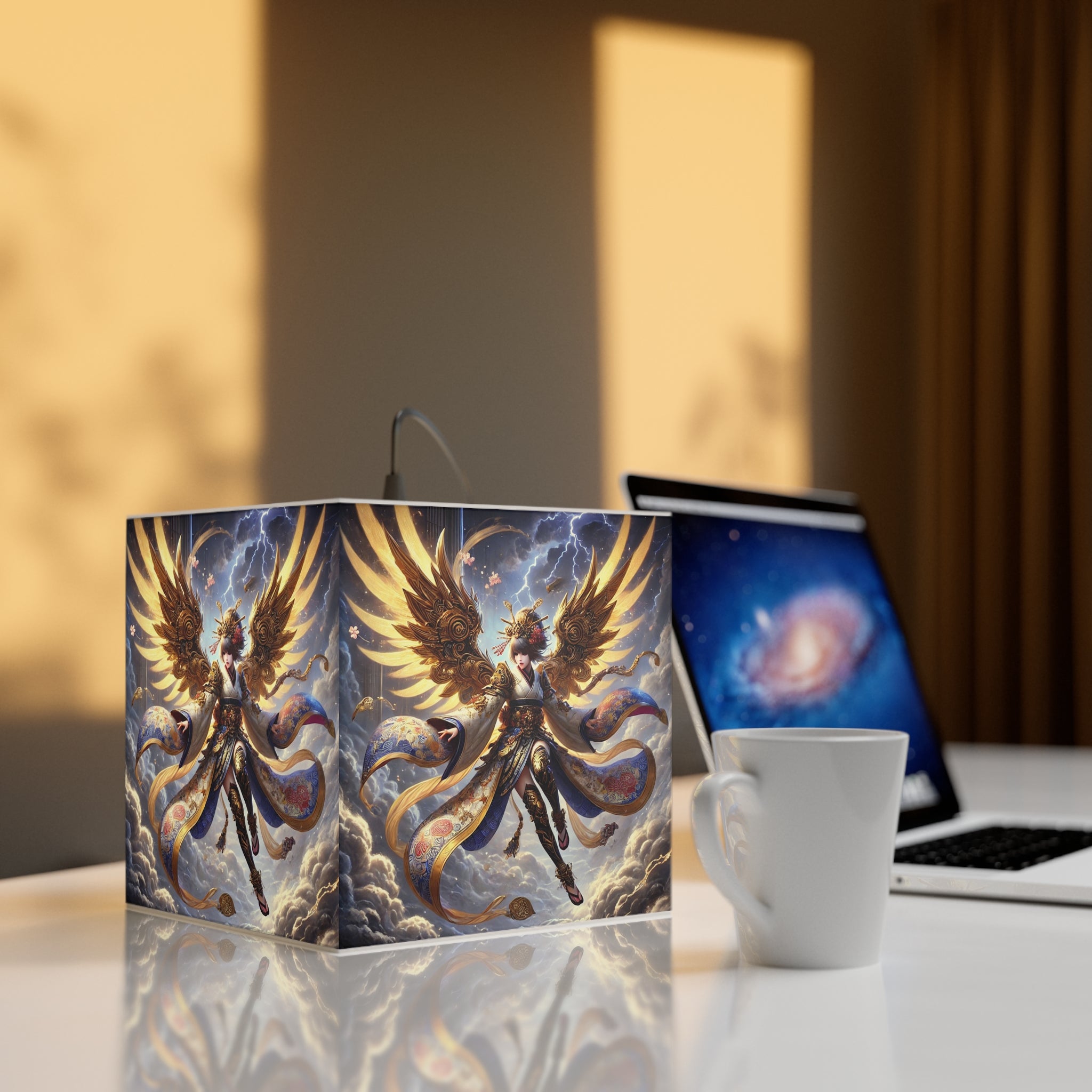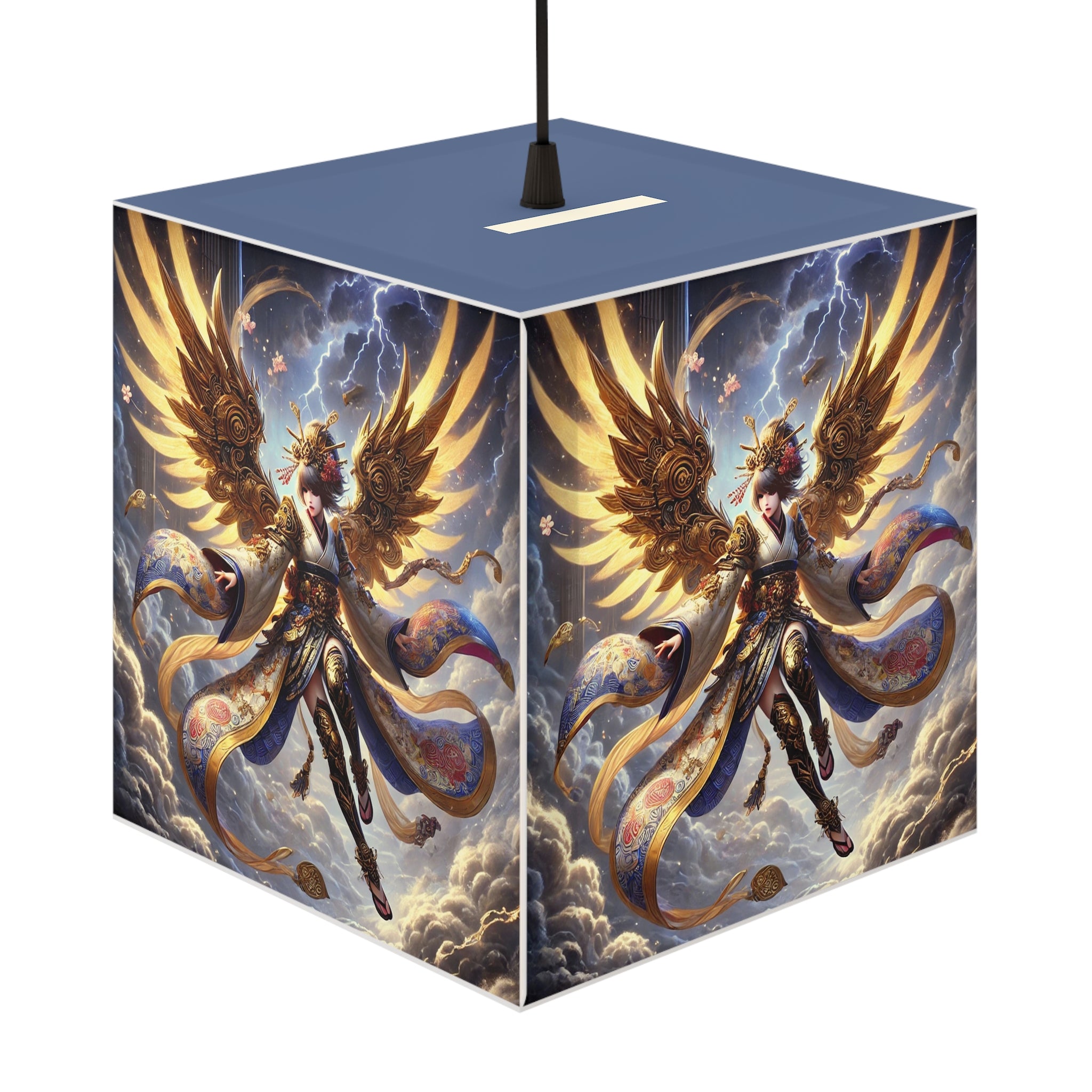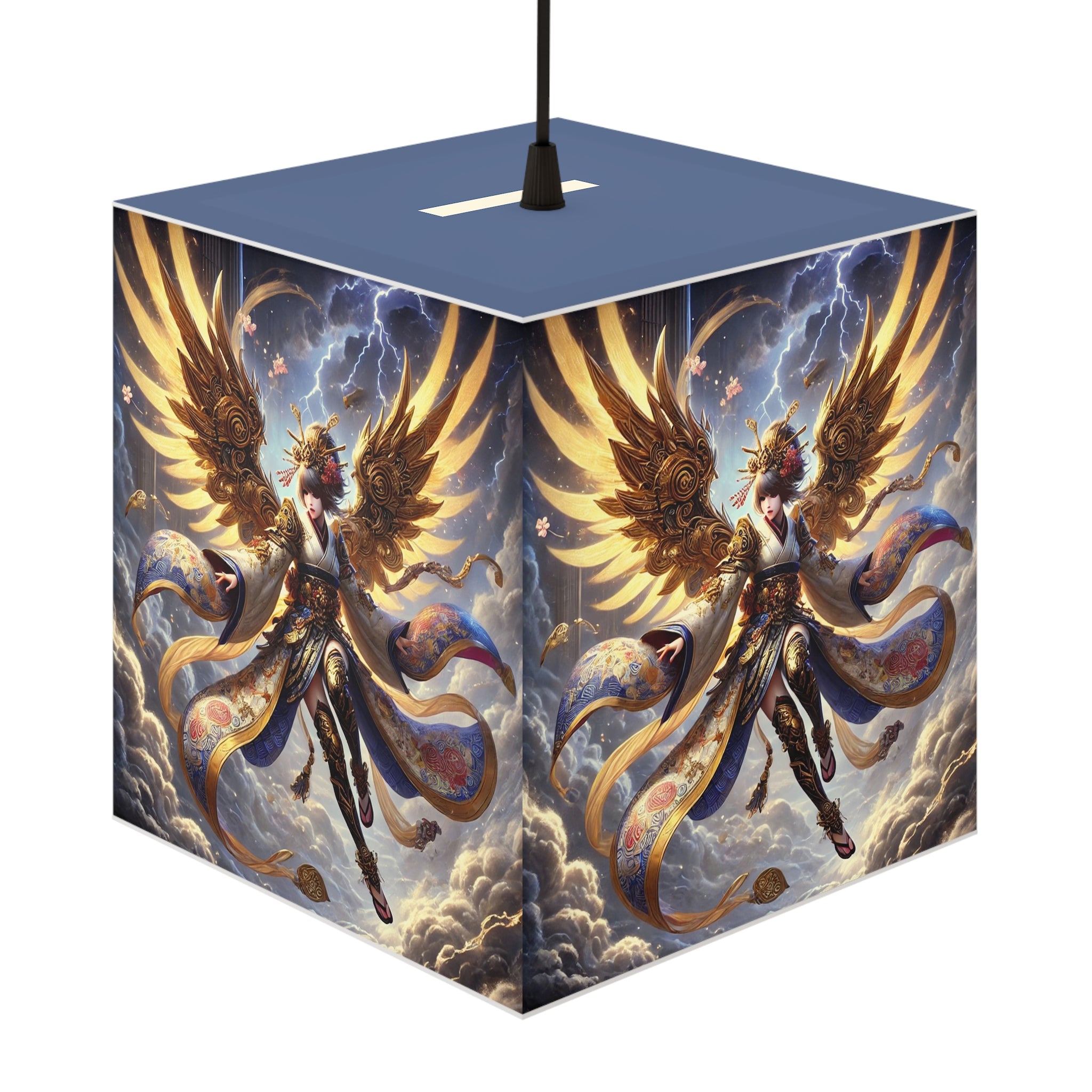 Transform any room into a stage of myth and light with this lightweight cube lamp, designed to create a tranquil atmosphere while showcasing bold artistry. The lamp comes with your choice of cords: a Standard cord with a plug compatible with US (Type A) or Europe (Type C) outlets, or a chic Pendant cord for a plug-free aesthetic. Wrapped across its panels is a breathtaking artwork that unites Norse mythology with Japanese Kabuki aesthetics, capturing a Valkyrie descending through storm clouds. Her kimono-inspired armored wings are layered in gold waves and glowing runes, while her ornate armor, flowing sash, and patterned leggings are rendered with flawless clarity. Behind her, stormy skies illuminated with subtle lightning add balance and drama, making the scene vibrant yet perfectly composed. More than lighting, this lamp becomes a centerpiece of fantasy storytelling—blending Eastern theatrical drama with Western mythic legend in a way that is bold, decorative, and unforgettable.