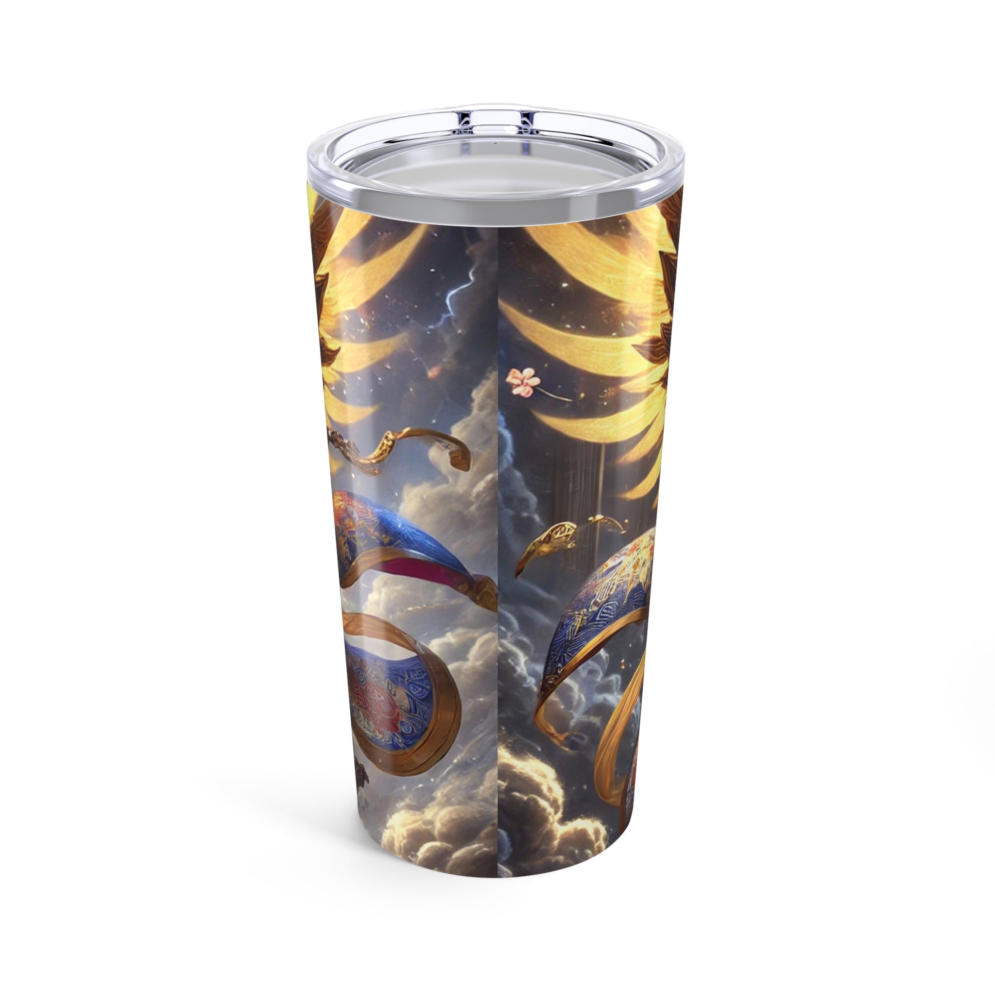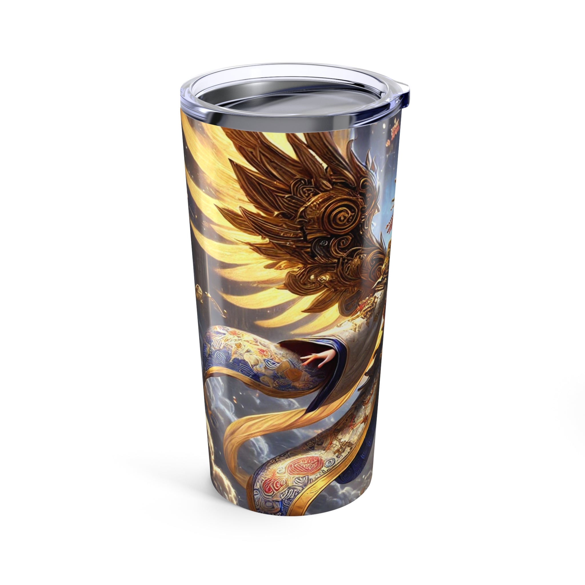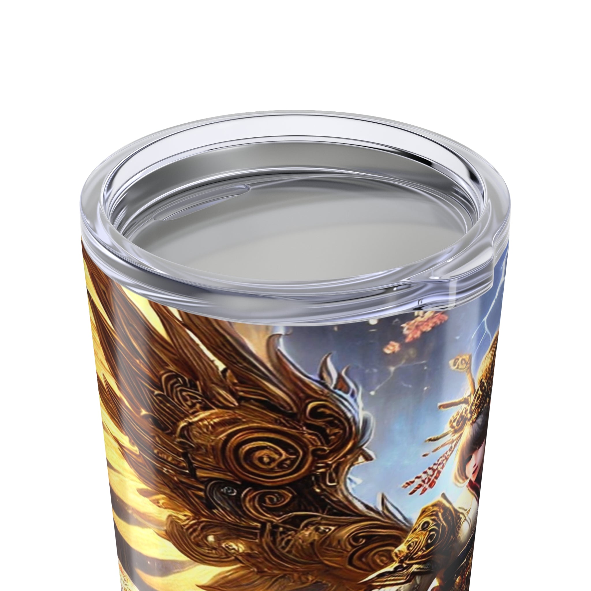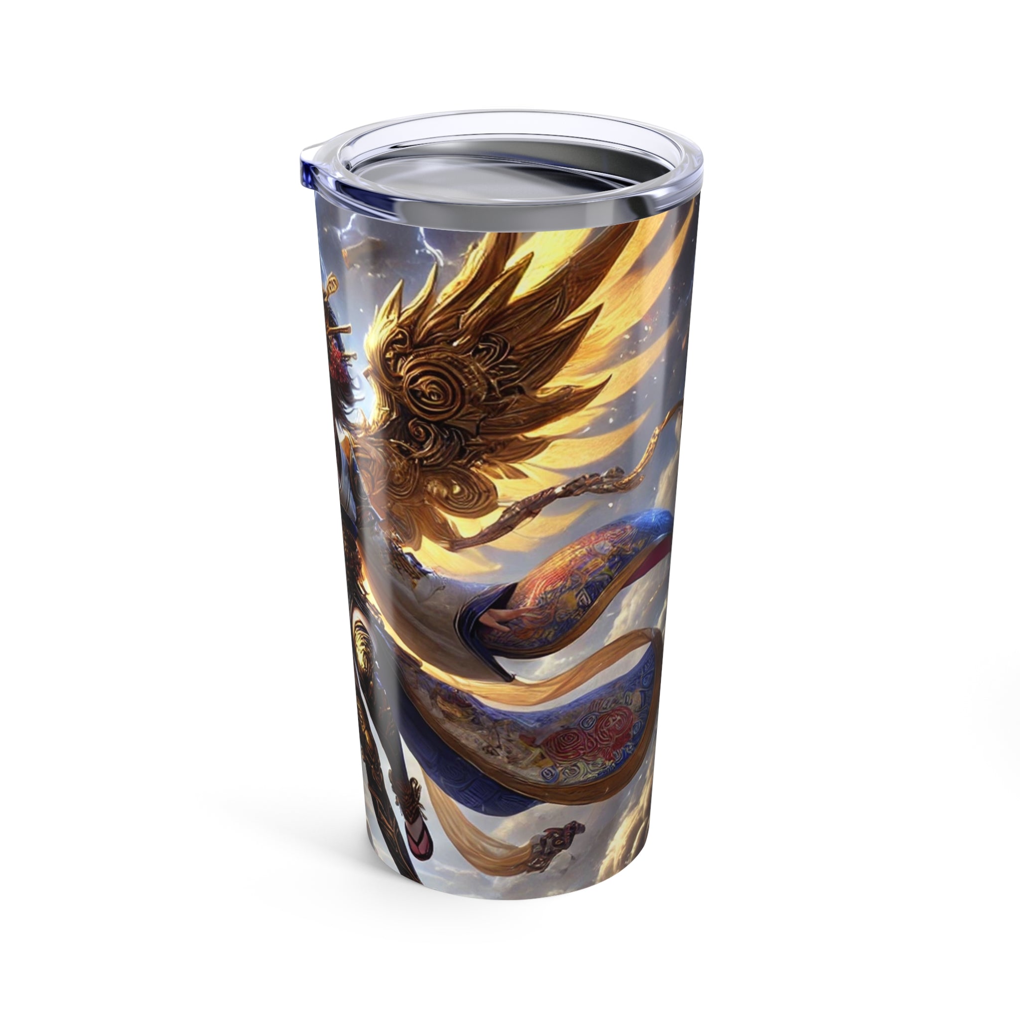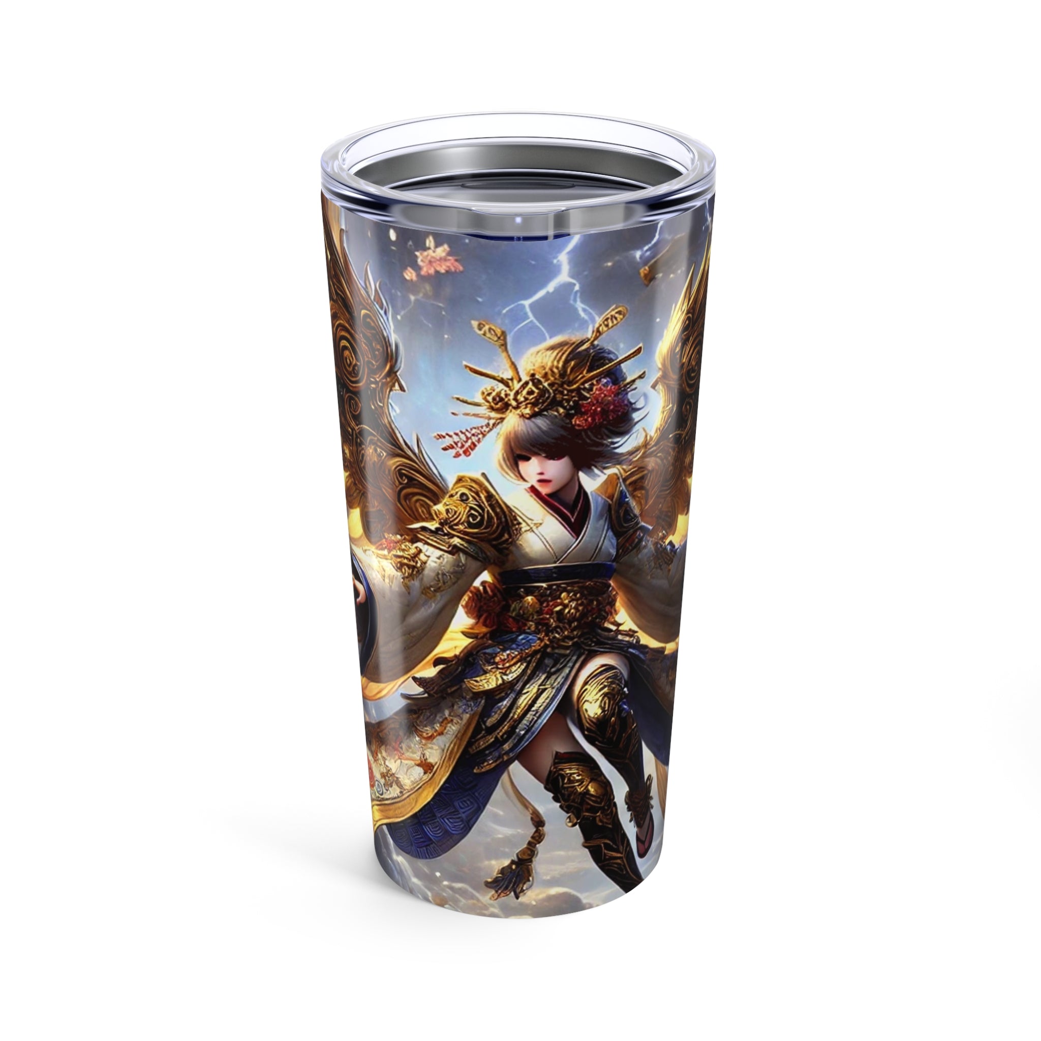Enjoy your favorite drinks in a tumbler that fuses everyday function with mythic artistry. With a 20oz capacity and double-wall insulation, it keeps beverages hot or cold for hours, while the durable stainless steel body ensures long-lasting use. Dishwasher safe for added convenience, this tumbler is as practical as it is striking. Wrapped around its glossy finish is a breathtaking design of a Valkyrie descending through storm clouds, her kimono-inspired armored wings layered in gold waves and glowing runes. She wears ornate armor with a flowing sash and fully patterned leggings, every detail rendered with flawless clarity. Set against a stormy sky alive with subtle lightning, the artwork blends Norse mythology with Japanese Kabuki aesthetics, transforming a simple tumbler into a bold, balanced work of functional fantasy art.
