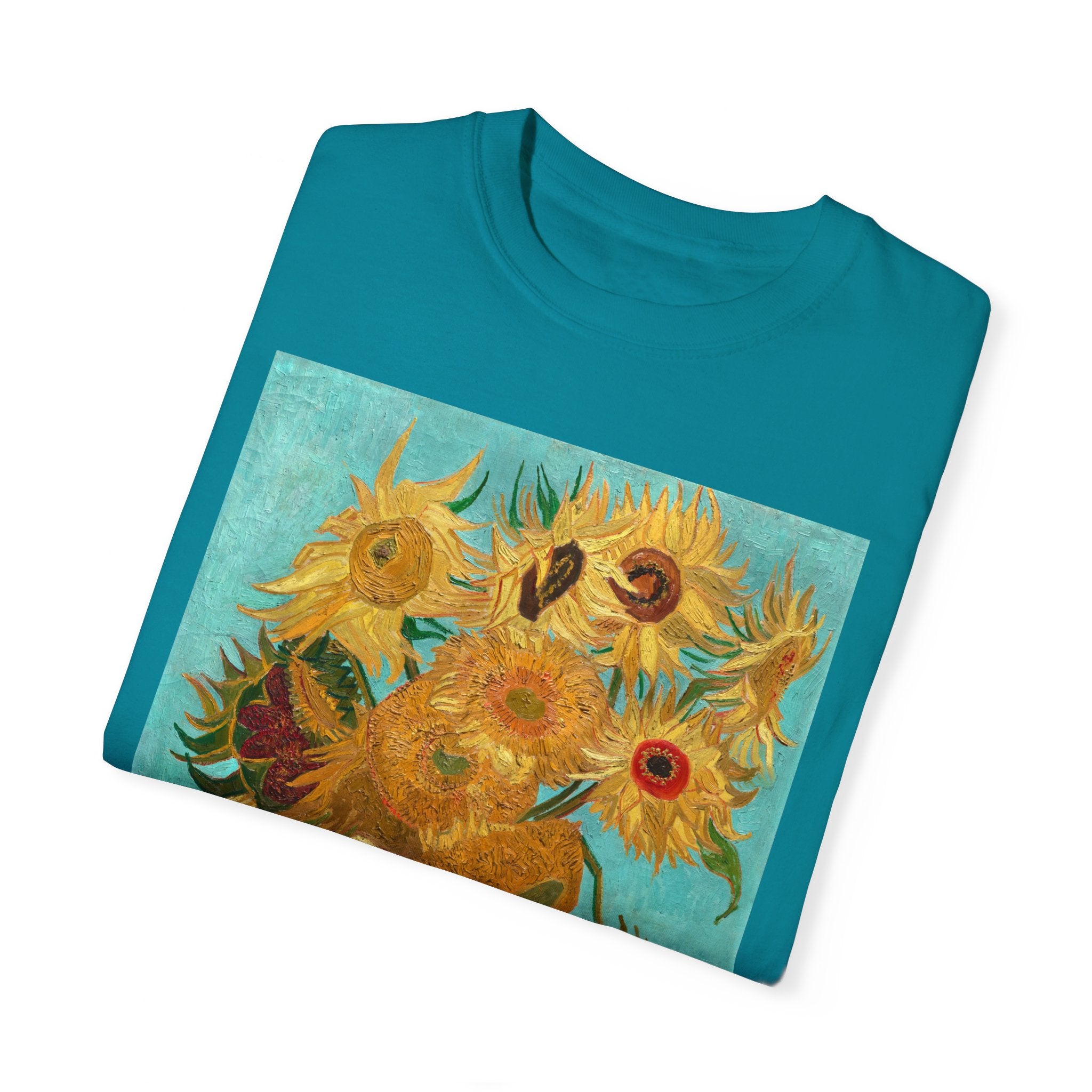 Artwork designed and digitally remastered by Sarasvati Designs. "Vase with Twelve Sunflowers" is one of Vincent Van Gogh's most iconic and celebrated works of art. Created in 1888, it is part of a series of sunflower paintings that the Dutch post-impressionist artist produced during his time in Arles, France. The artwork features a simple, rustic vase filled with twelve sunflowers arranged in a tight bouquet. The sunflowers are depicted in various stages of bloom, displaying a rich spectrum of yellows and oranges, creating a striking contrast with the blue and violet background. Van Gogh's thick and impasto brushwork adds depth and texture to the painting, giving the sunflowers a three-dimensional quality. "Vase with Twelve Sunflowers" is an enduring masterpiece that showcases Vincent Van Gogh's unique artistic style, emotional intensity, and his ability to convey complex emotions through the use of color, texture, and composition. It remains an iconic work of art, admired for its brilliance and its ability to convey the artist's inner world.