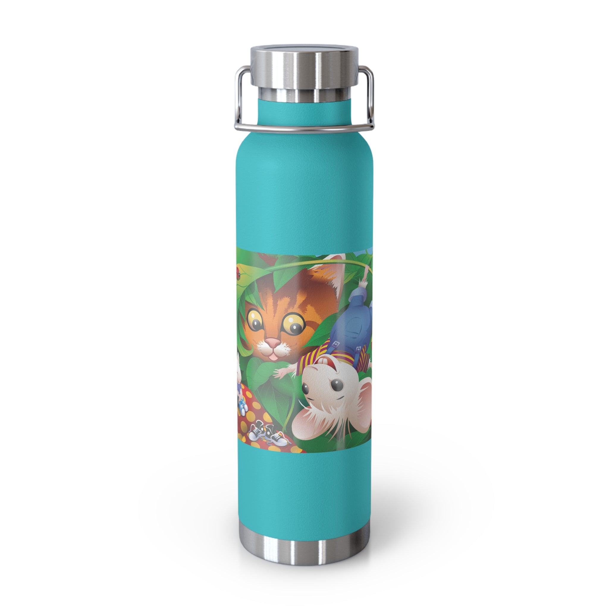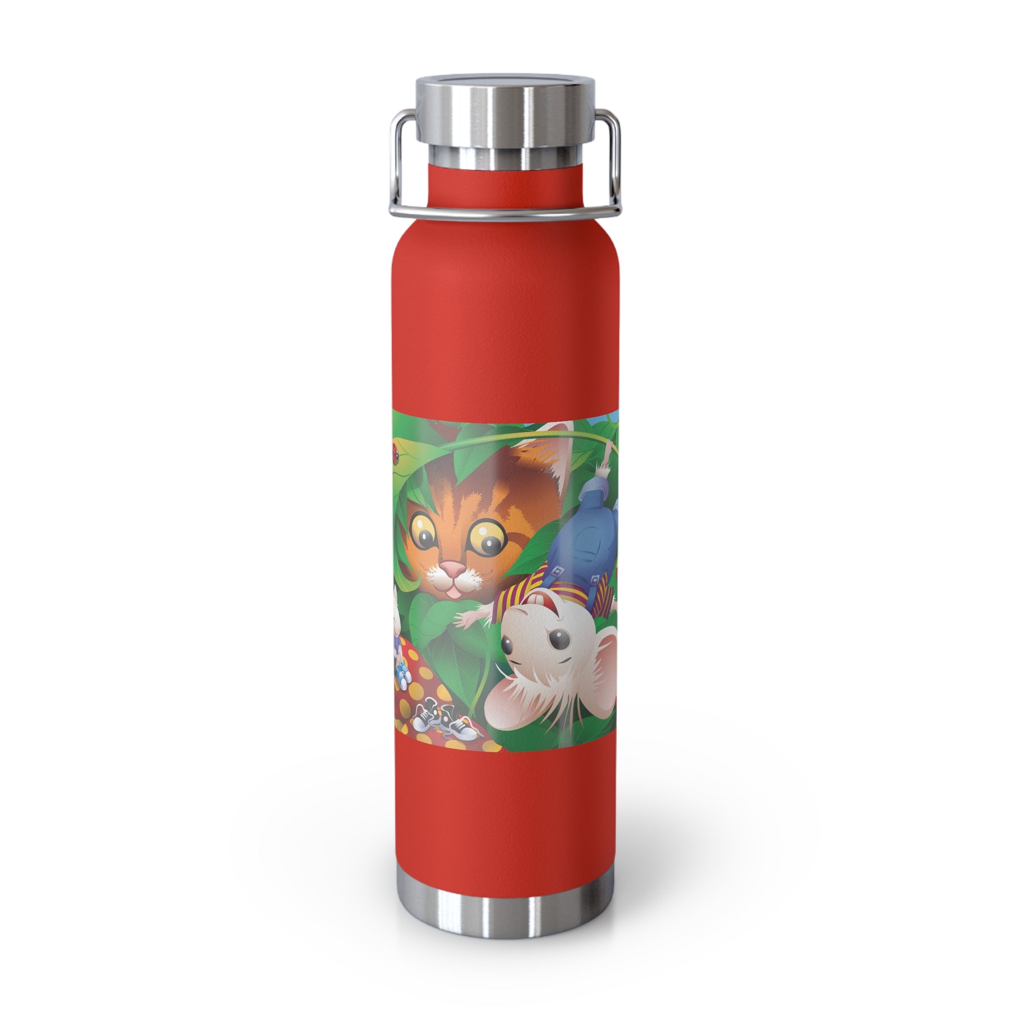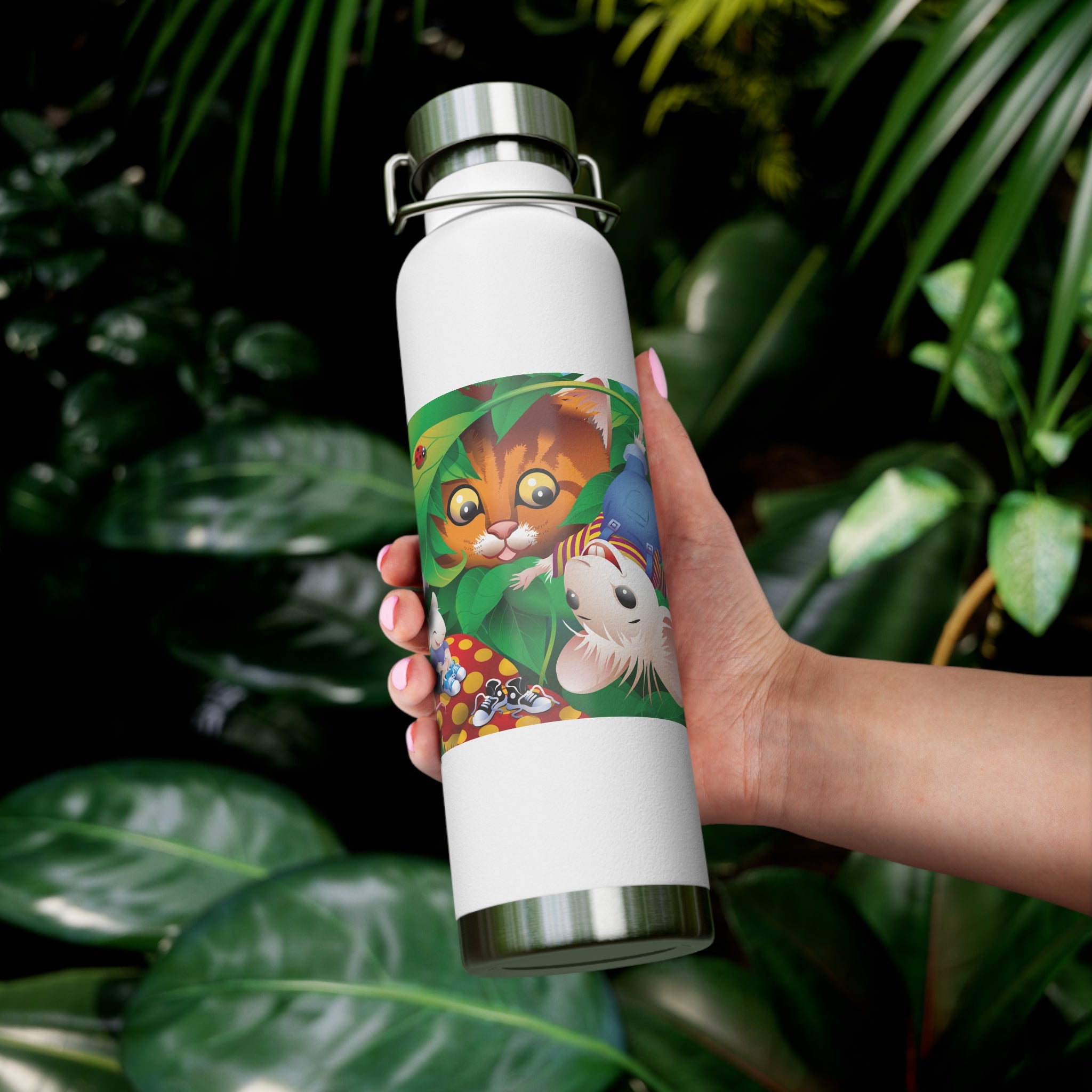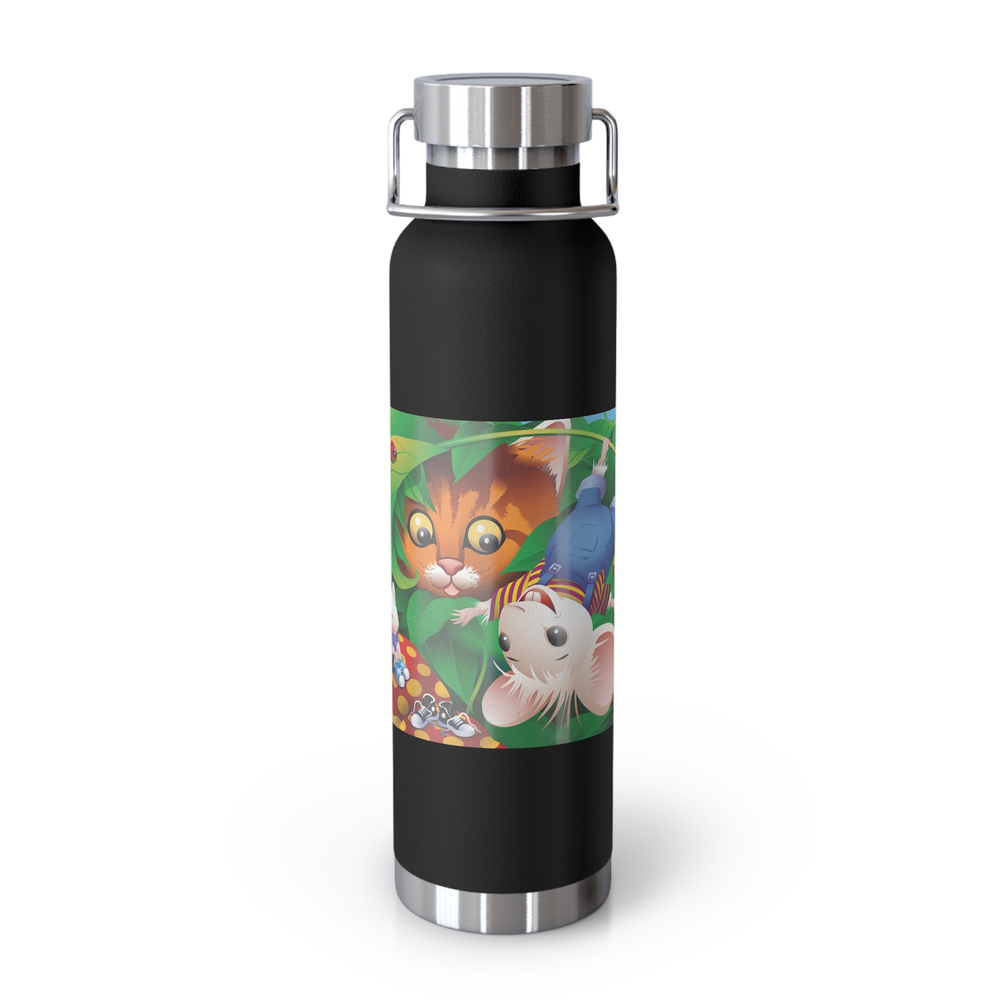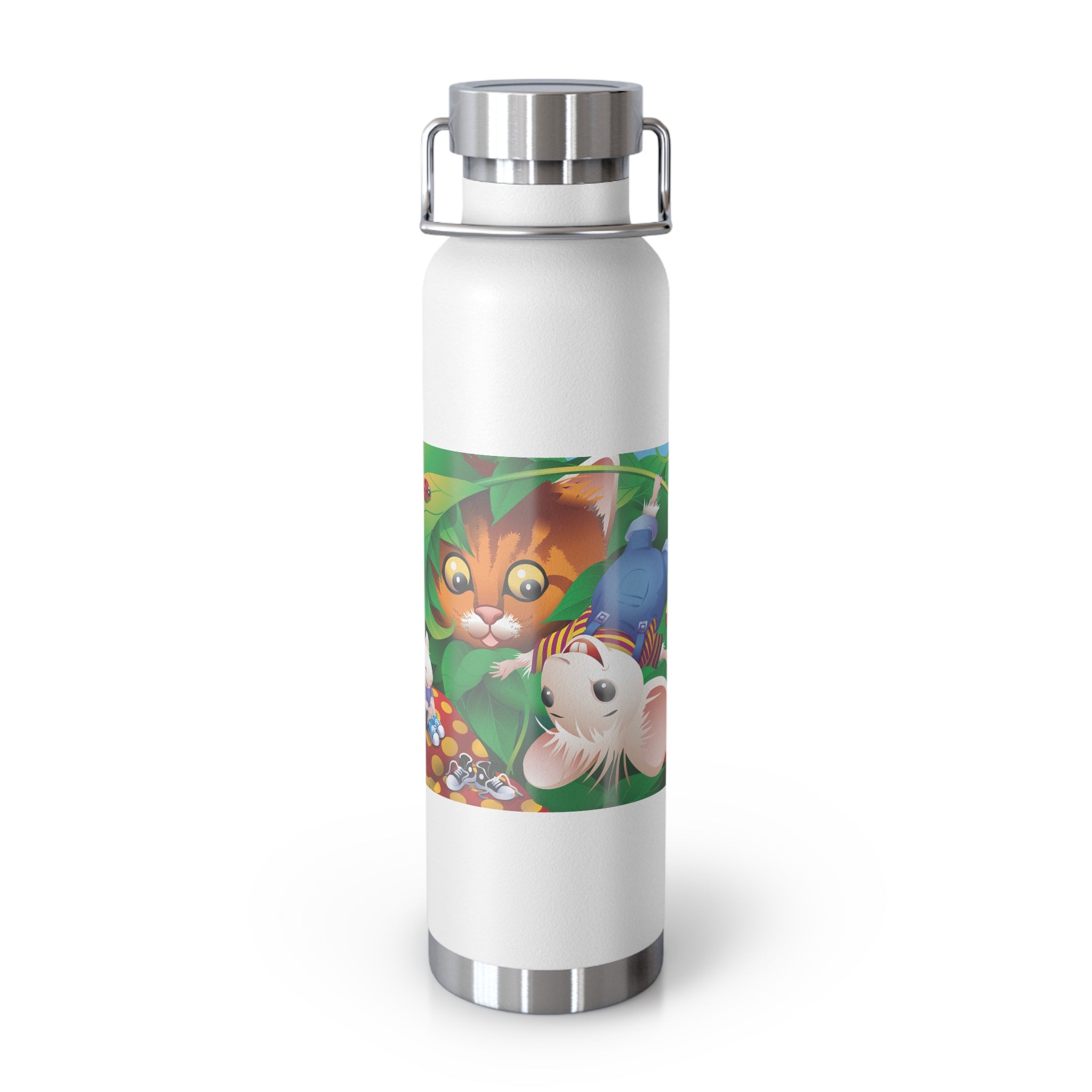 Artwork created, designed and digitally remastered by Sarasvati Designs. A colorful and whimsical animated artwork depicting a curious tabby cat and two cheerful mice on a playful adventure in the lush foliage.