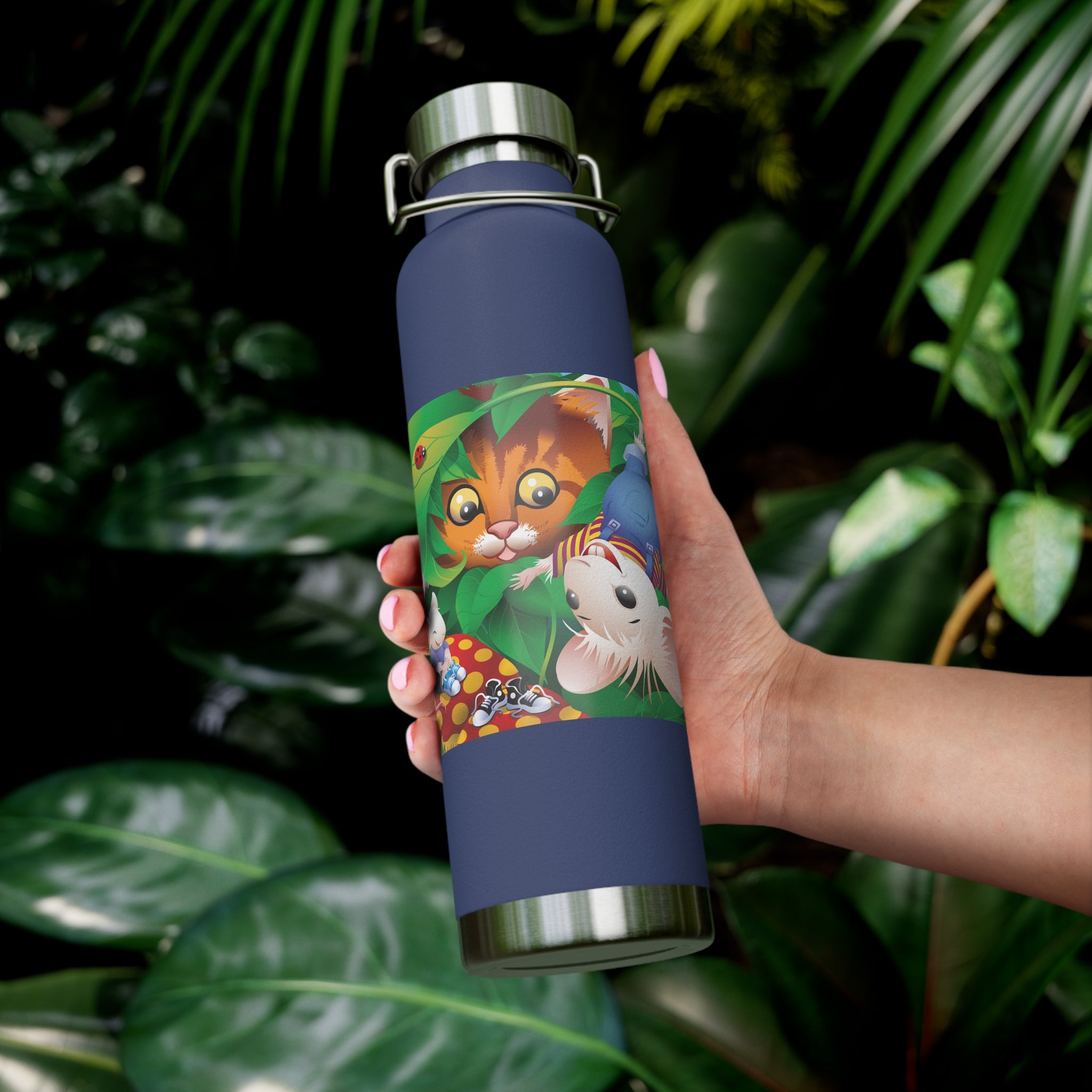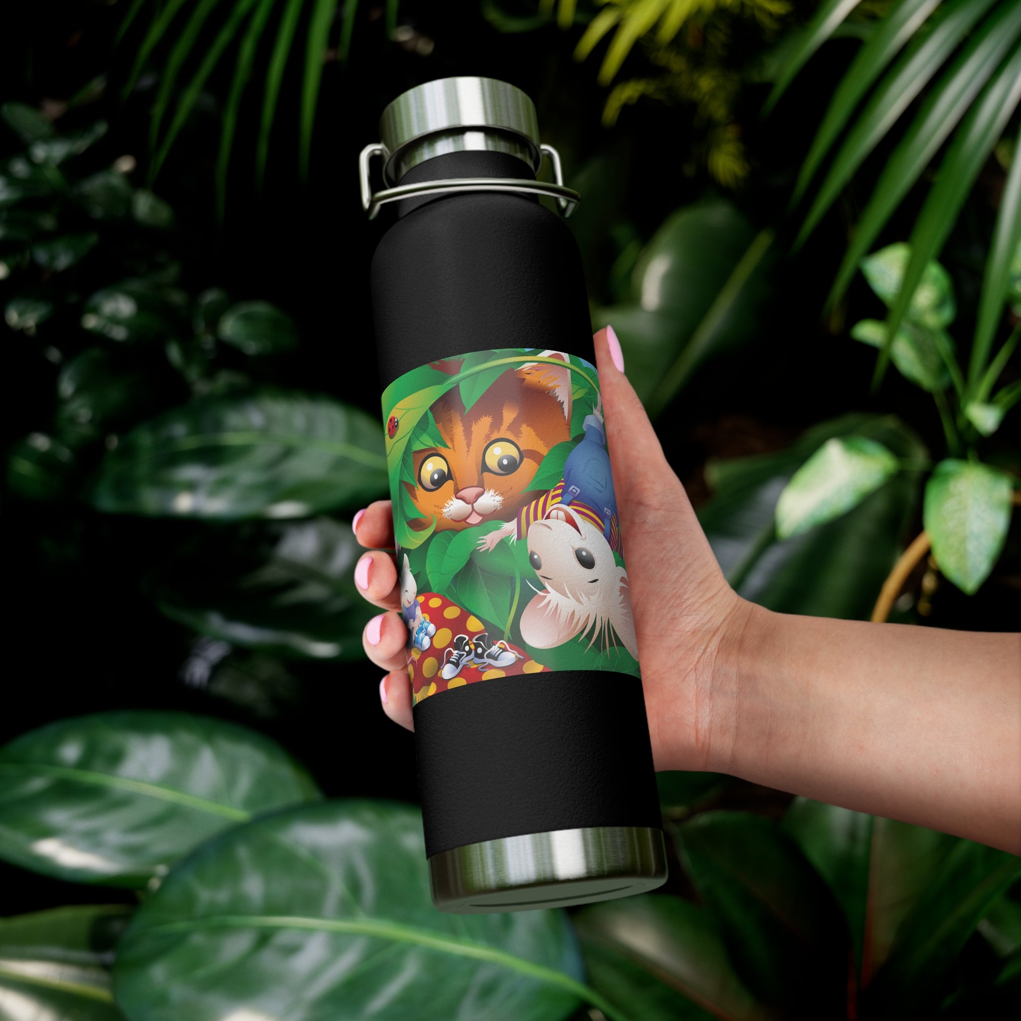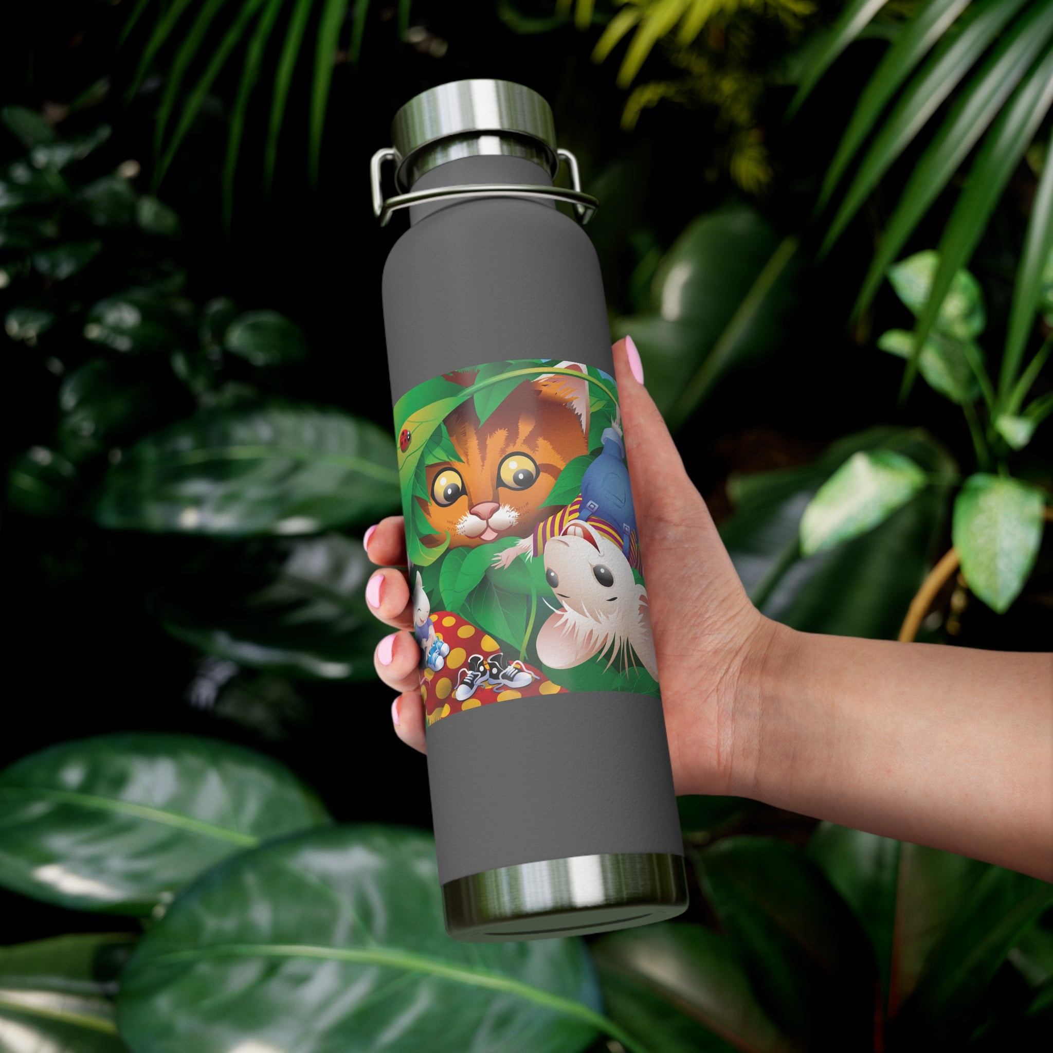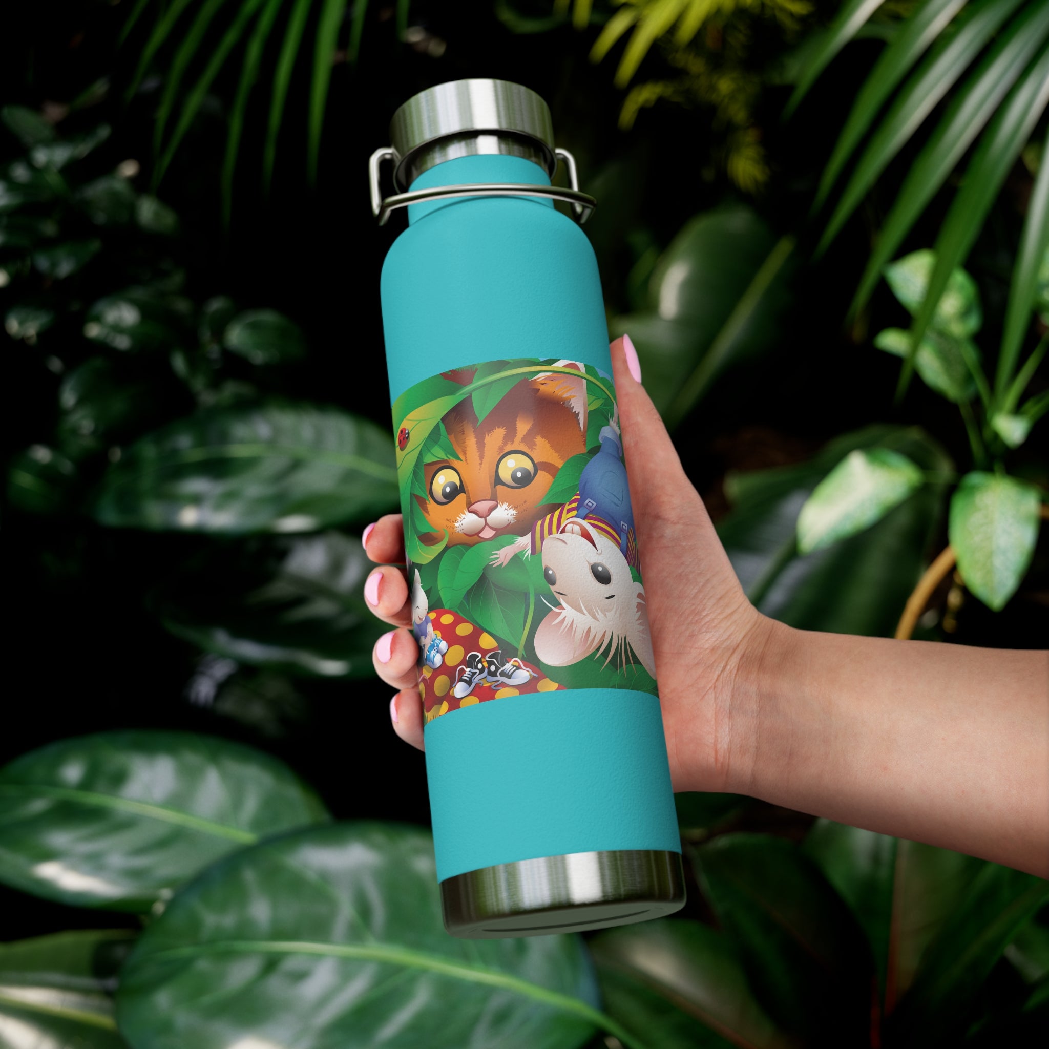 Artwork created, designed and digitally remastered by Sarasvati Designs. A colorful and whimsical animated artwork depicting a curious tabby cat and two cheerful mice on a playful adventure in the lush foliage.