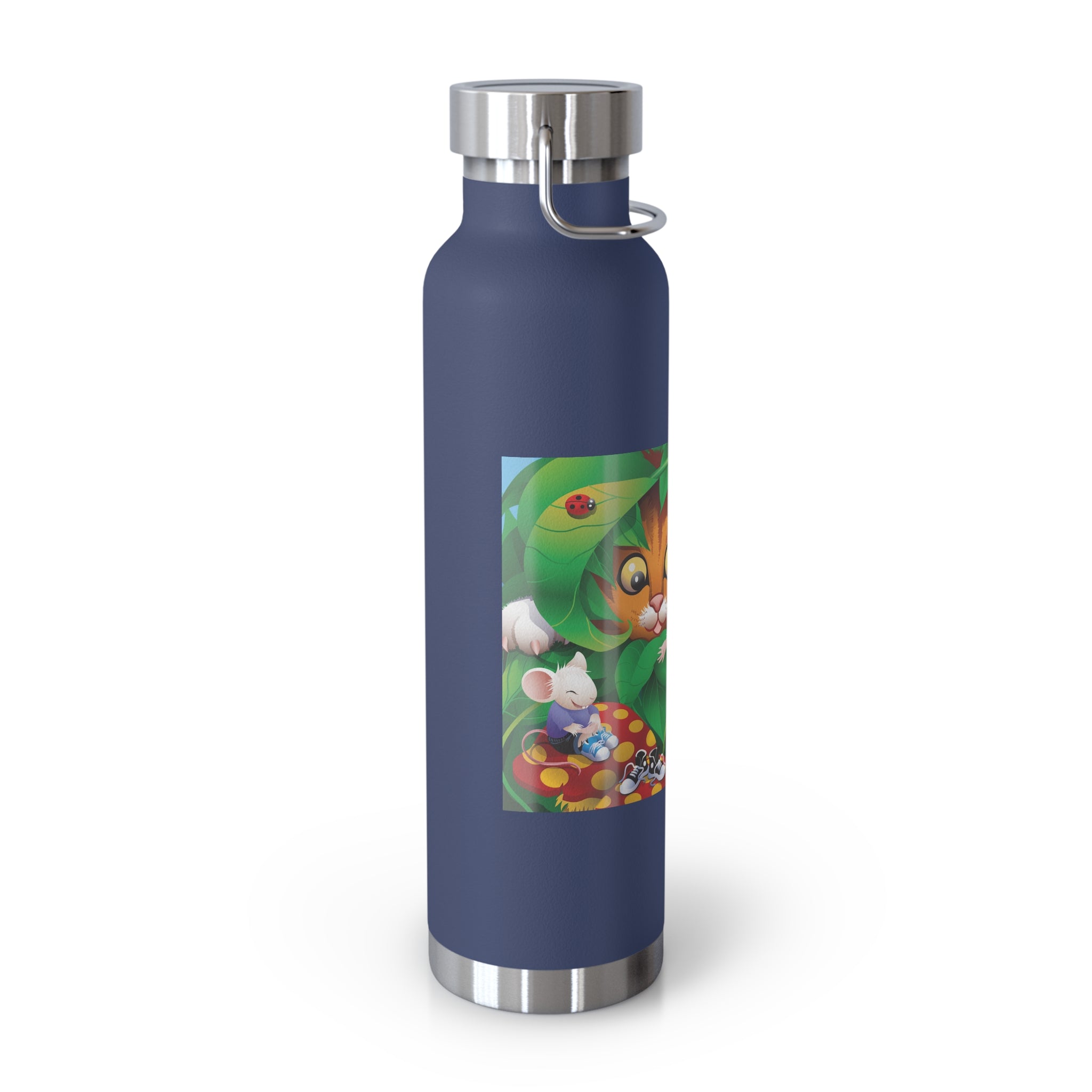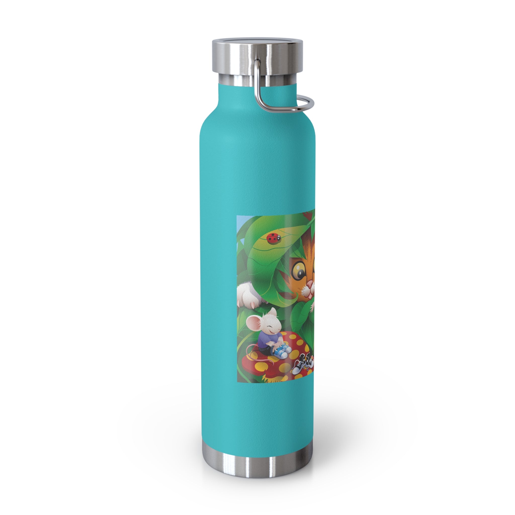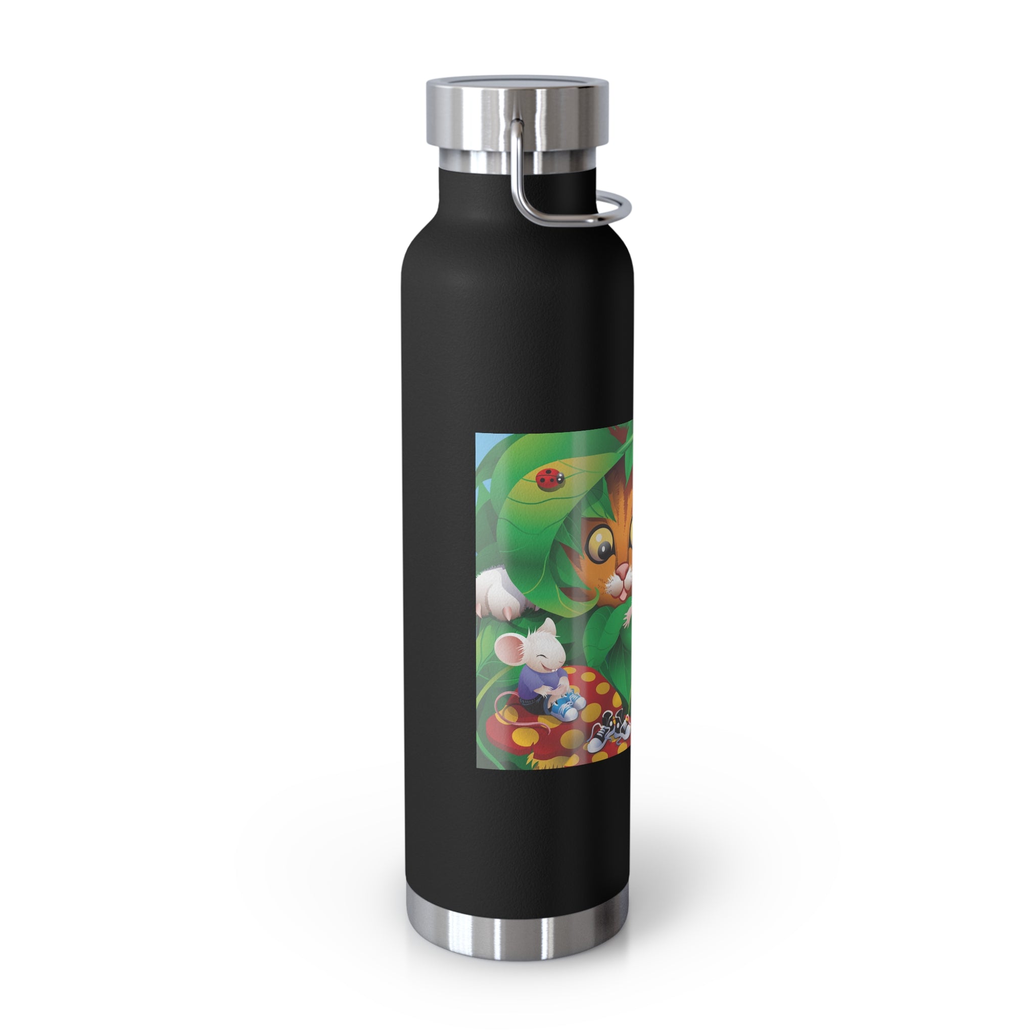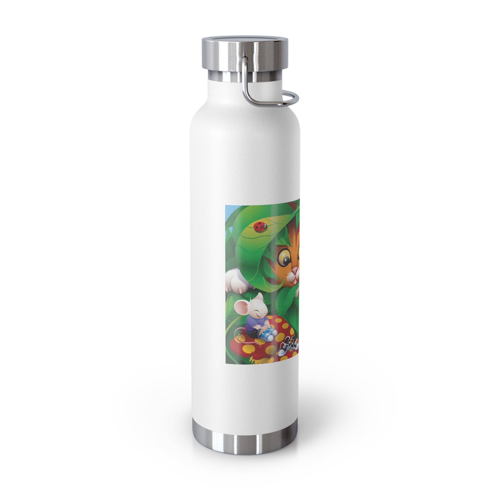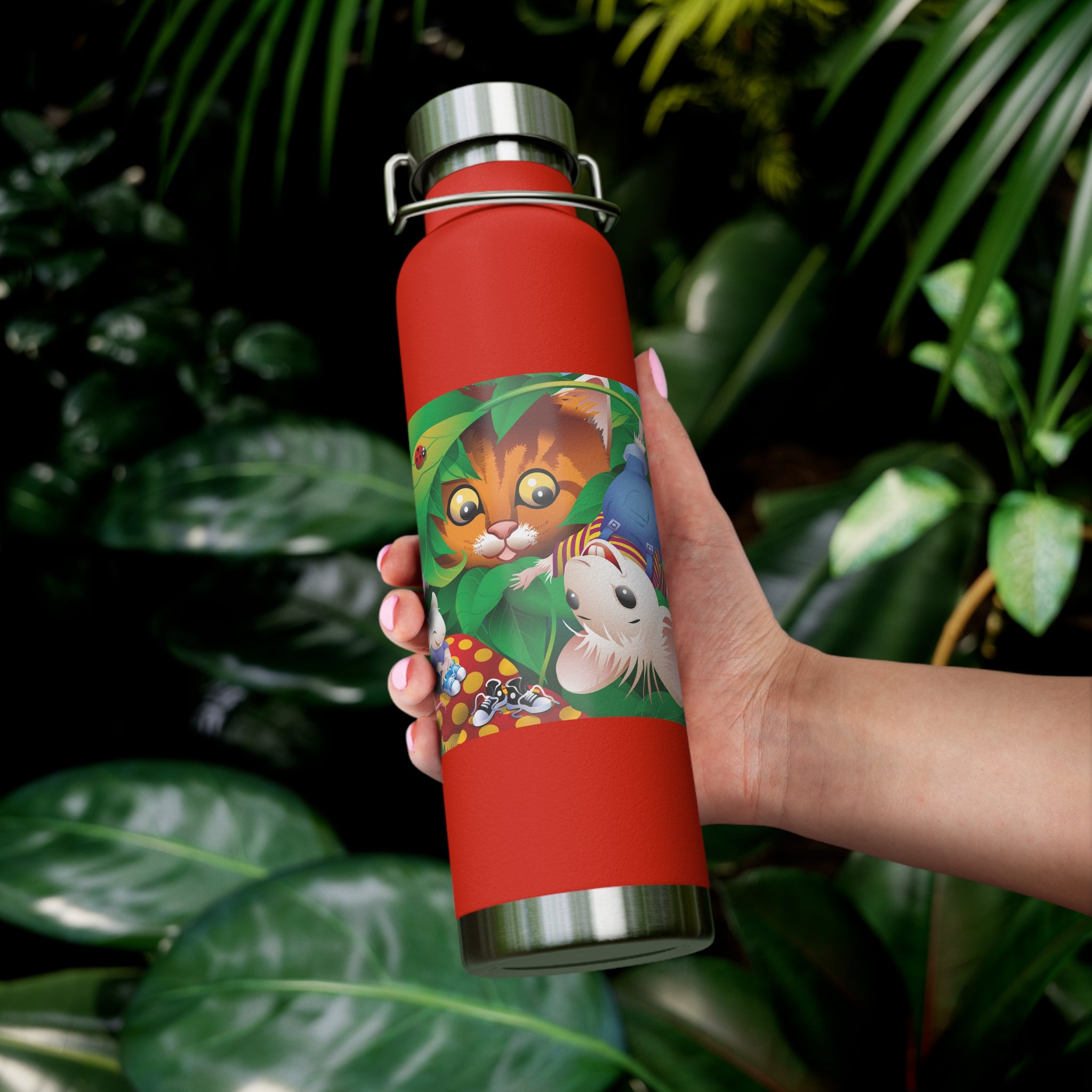 Artwork created, designed and digitally remastered by Sarasvati Designs. A colorful and whimsical animated artwork depicting a curious tabby cat and two cheerful mice on a playful adventure in the lush foliage.