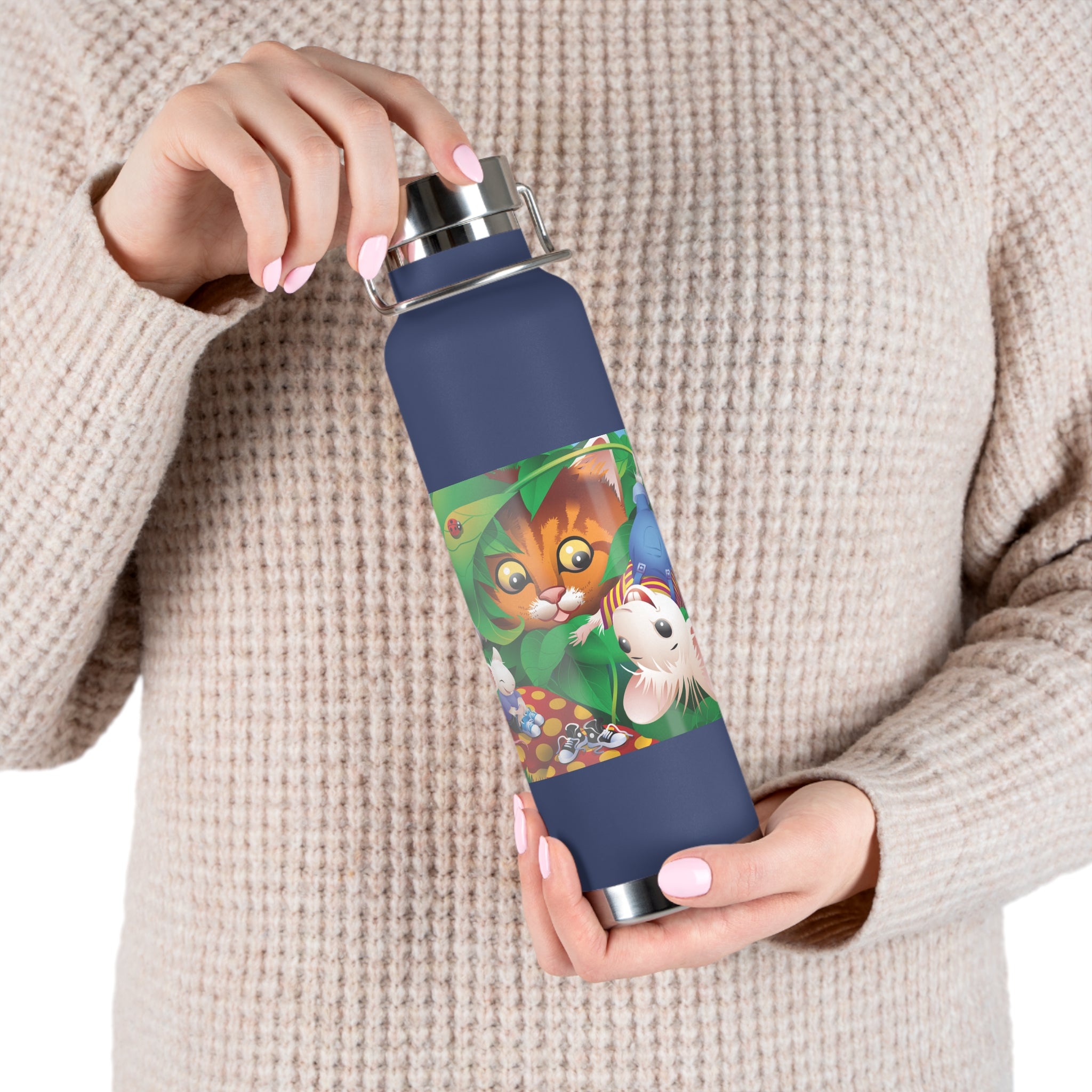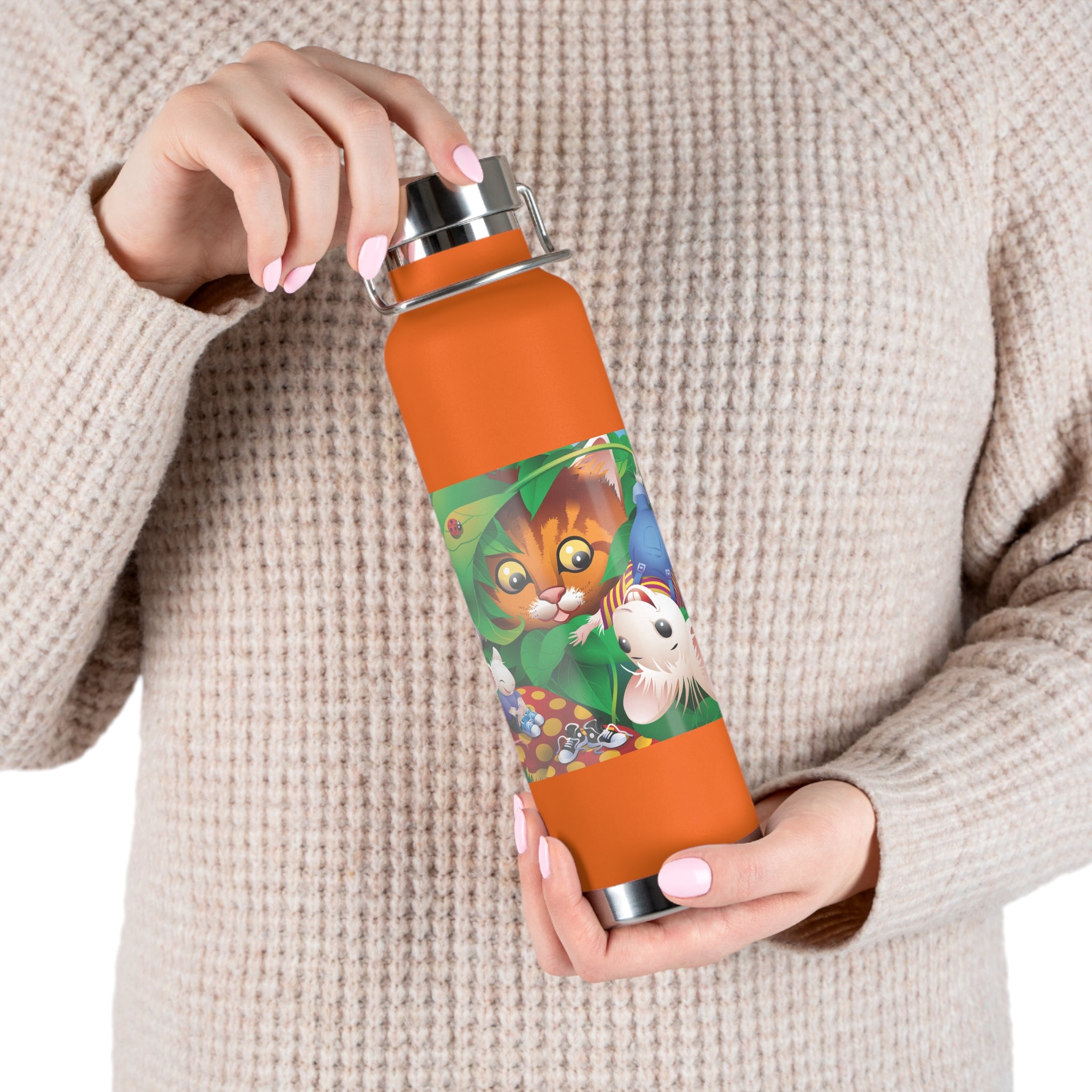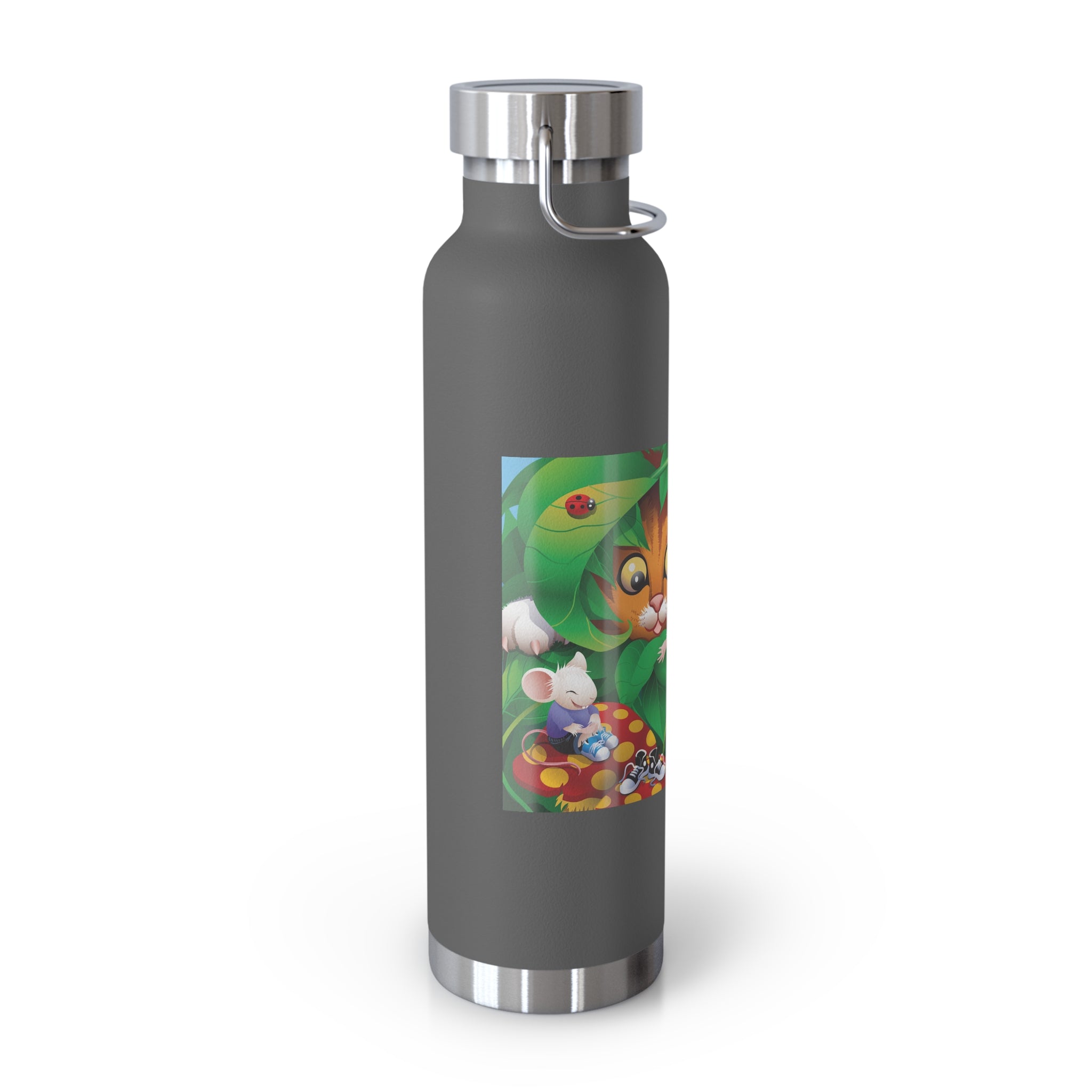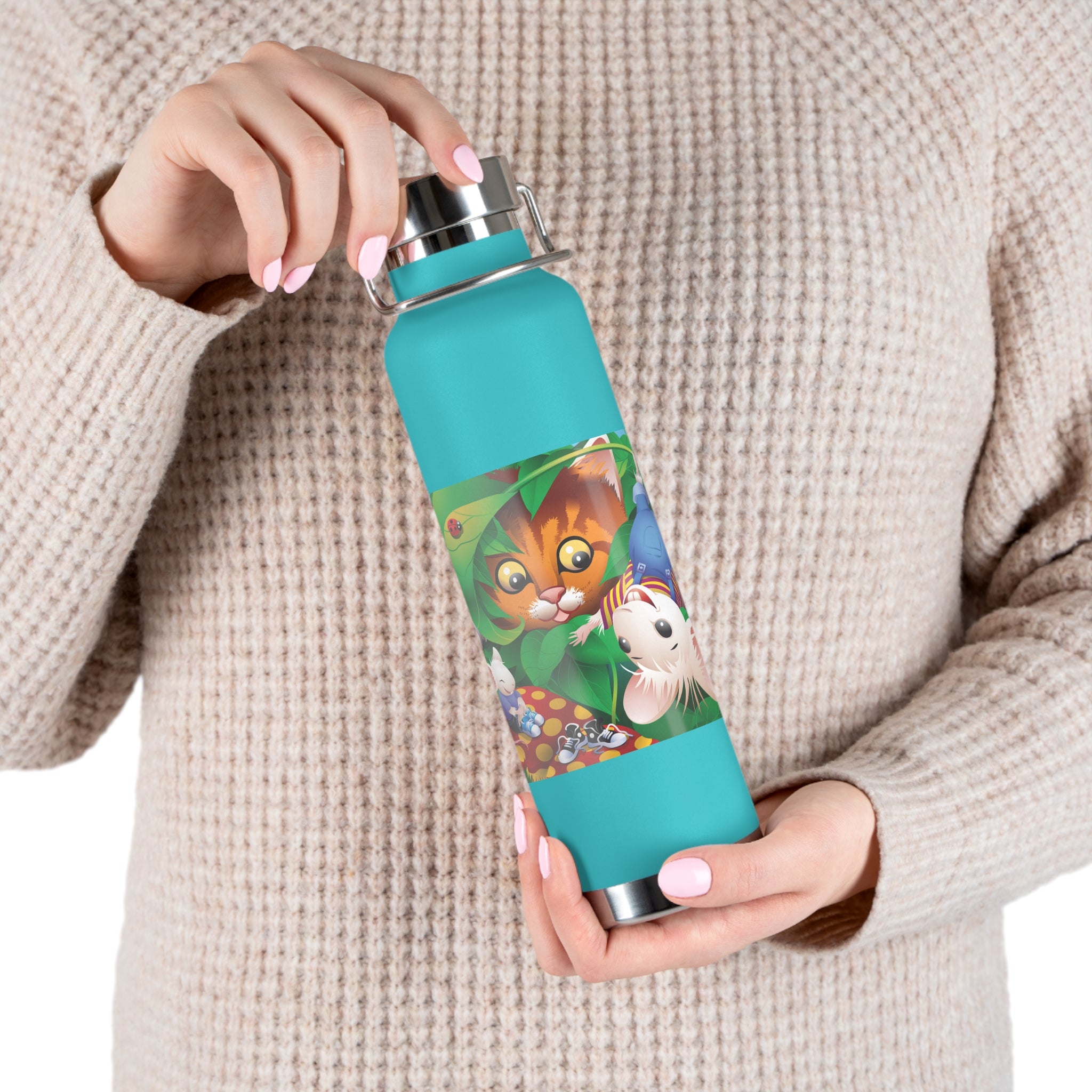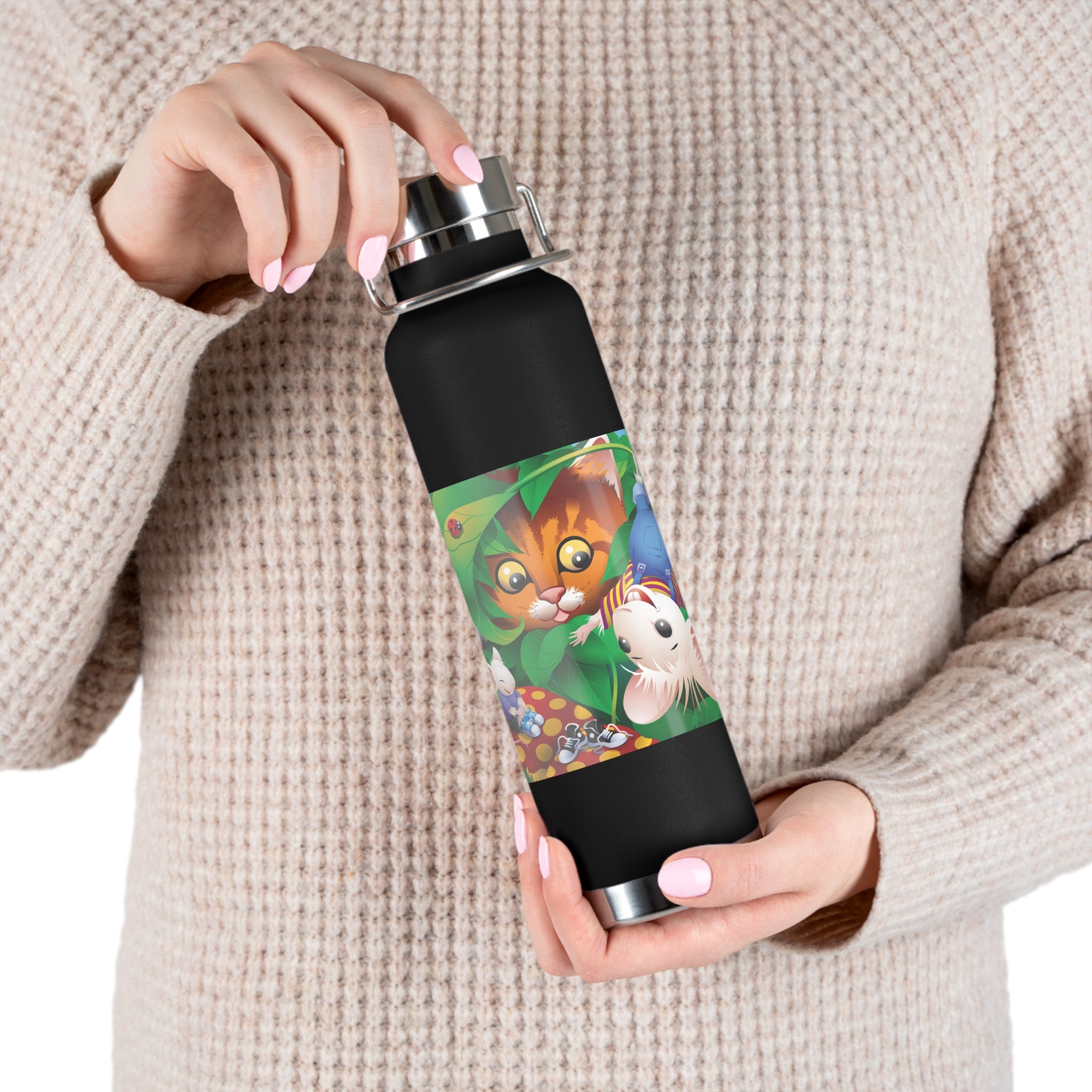 Artwork created, designed and digitally remastered by Sarasvati Designs. A colorful and whimsical animated artwork depicting a curious tabby cat and two cheerful mice on a playful adventure in the lush foliage.