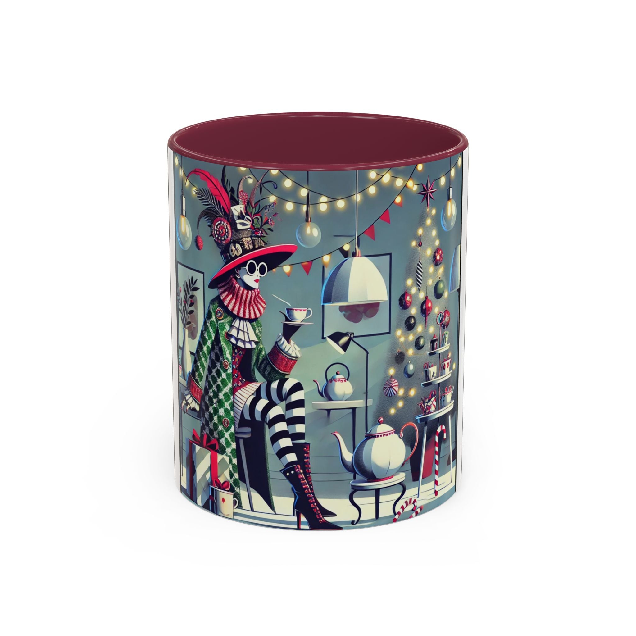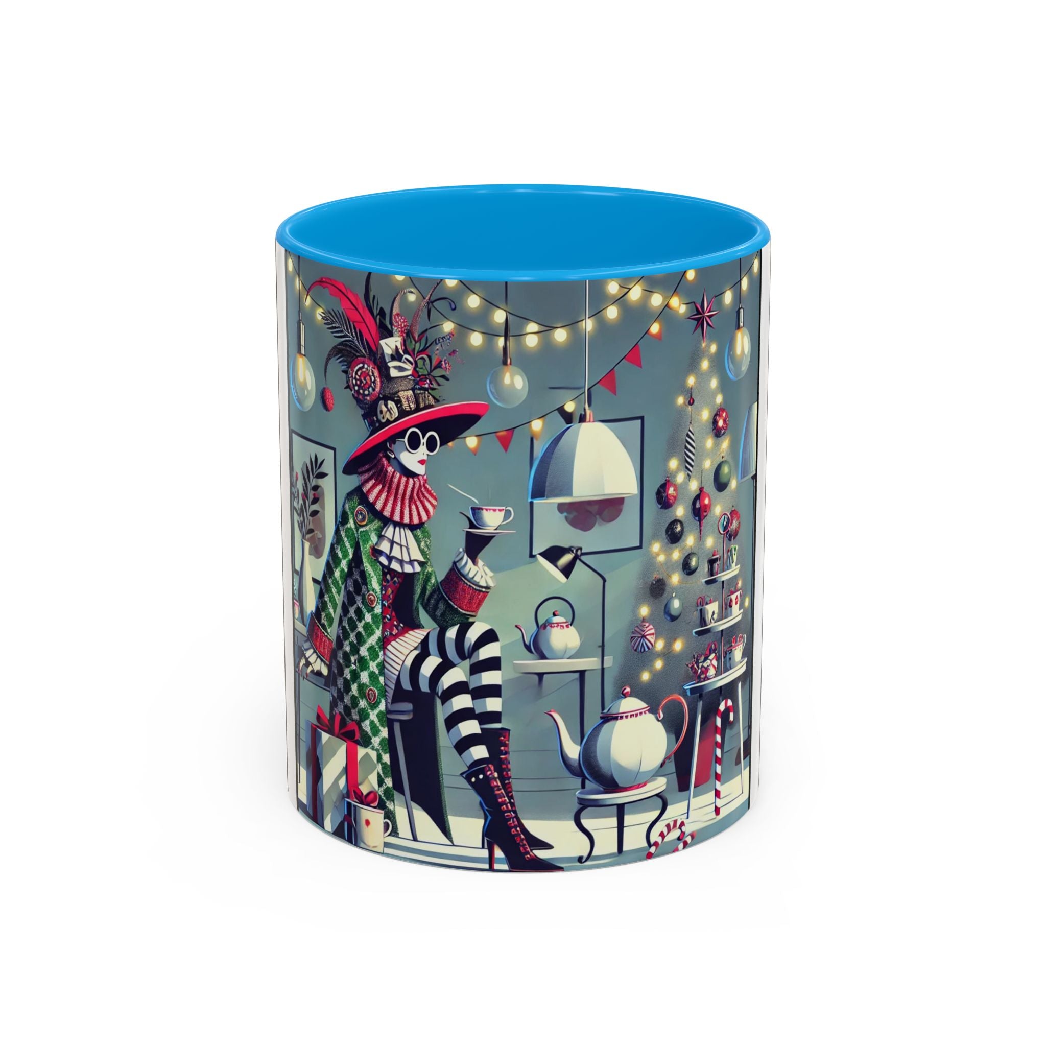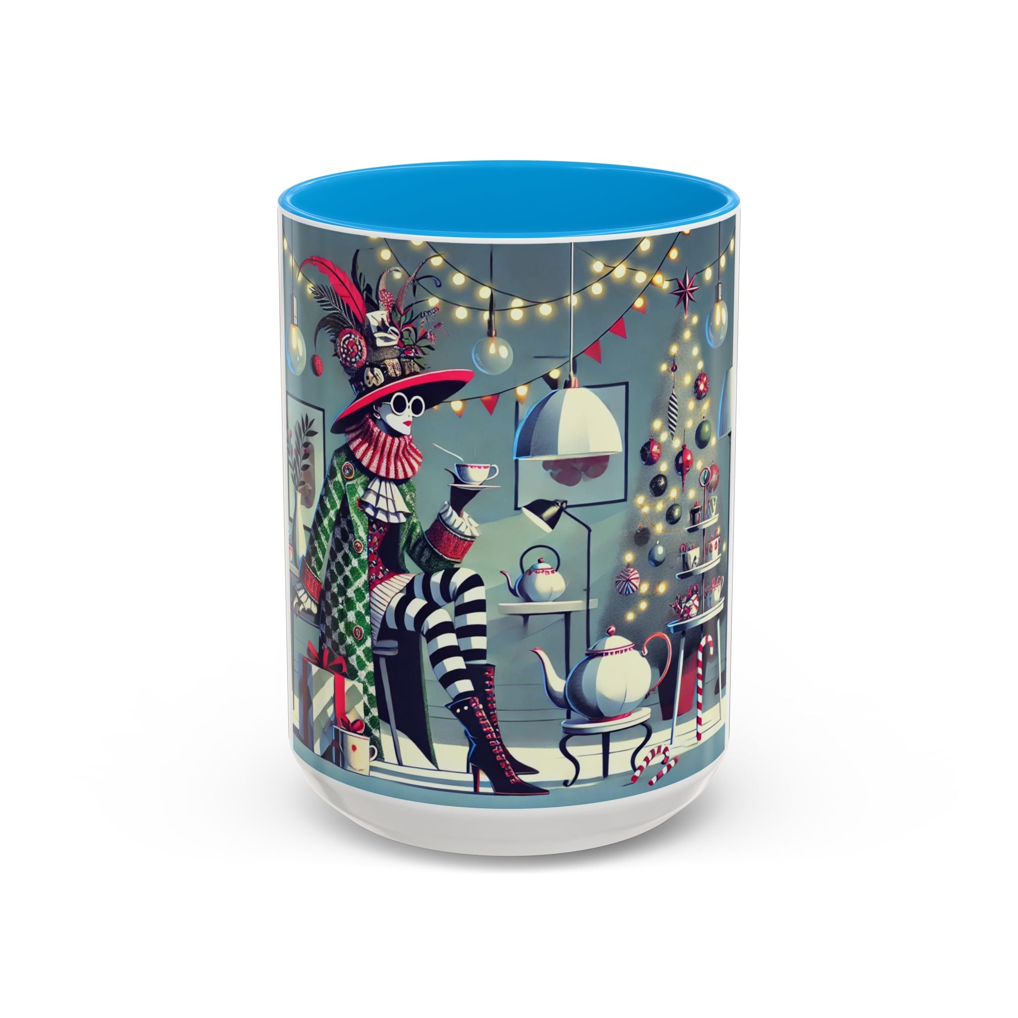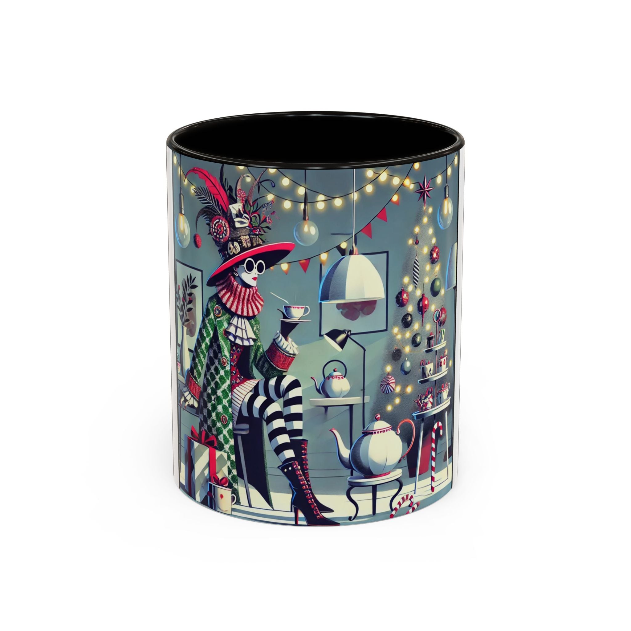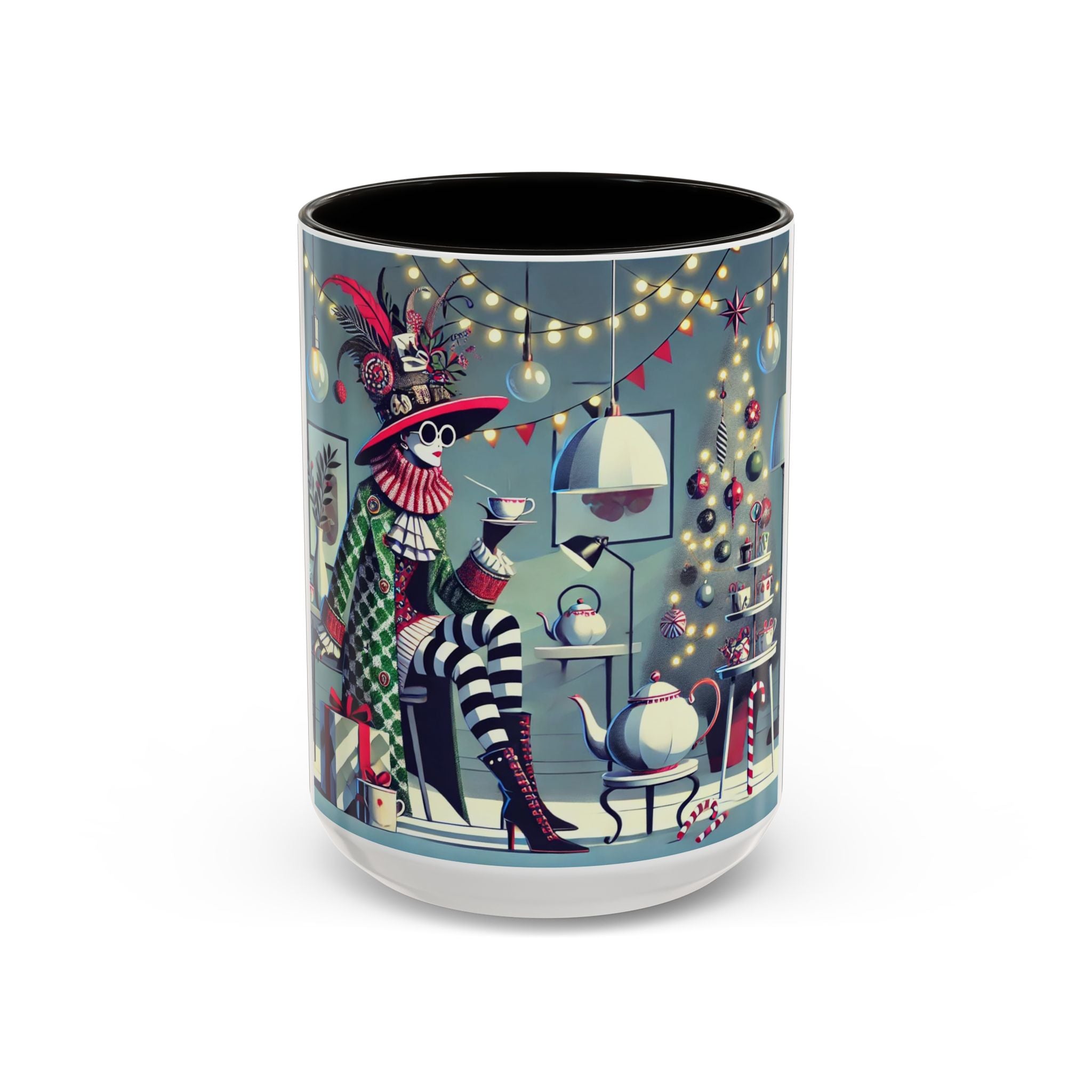 Begin your morning in style with a mug that feels like a celebration of the season itself. This whimsical Christmas tea party artwork wraps around each mug in vivid, high-fidelity color, turning a simple sip into an elegant ritual. A chic lady, dressed in a lavish feathered hat and patterned coat, pauses to savor her tea amidst glowing holiday lights. Her striped stockings, high-heeled boots, and bold accessories create a fashionable, theatrical presence that feels both modern and timeless.