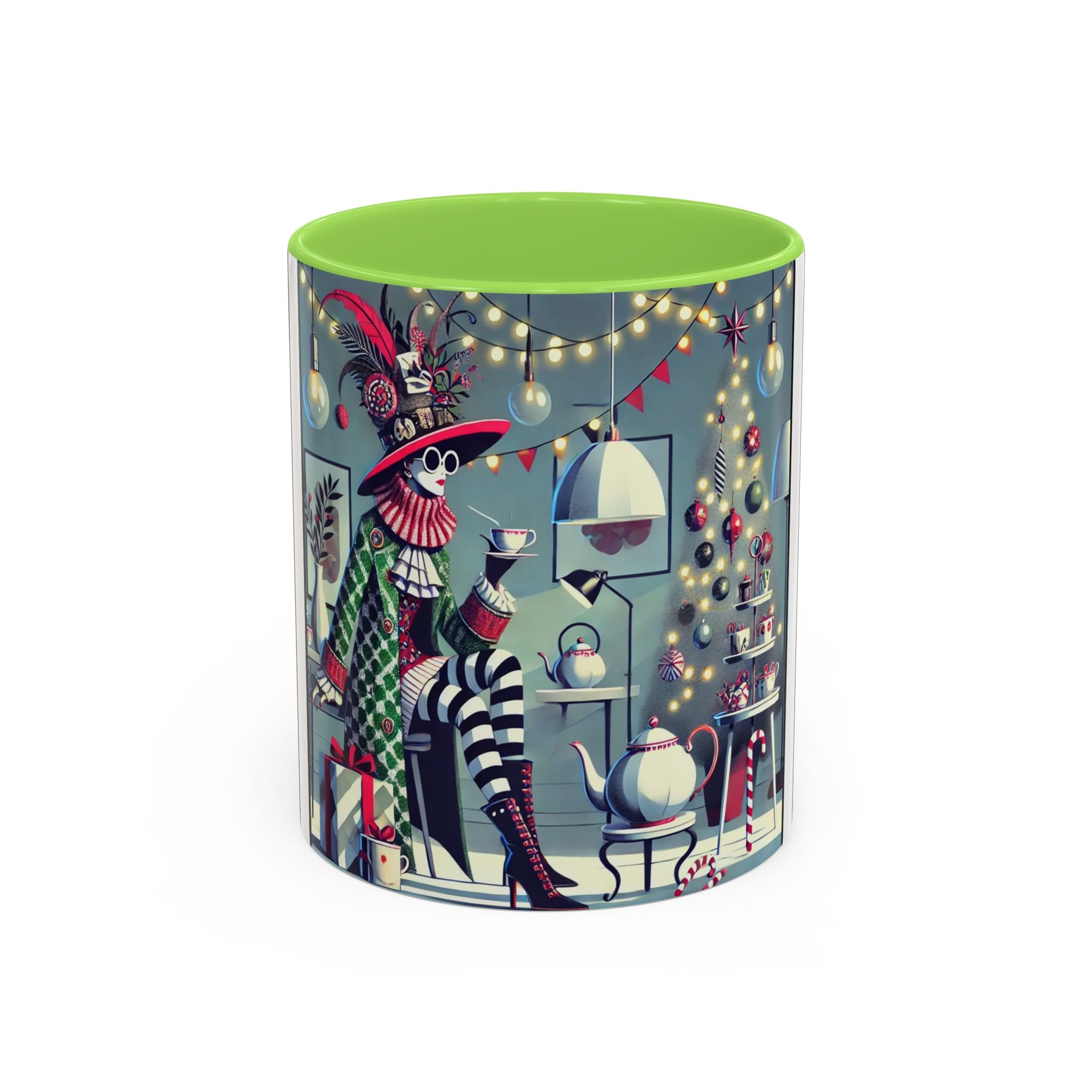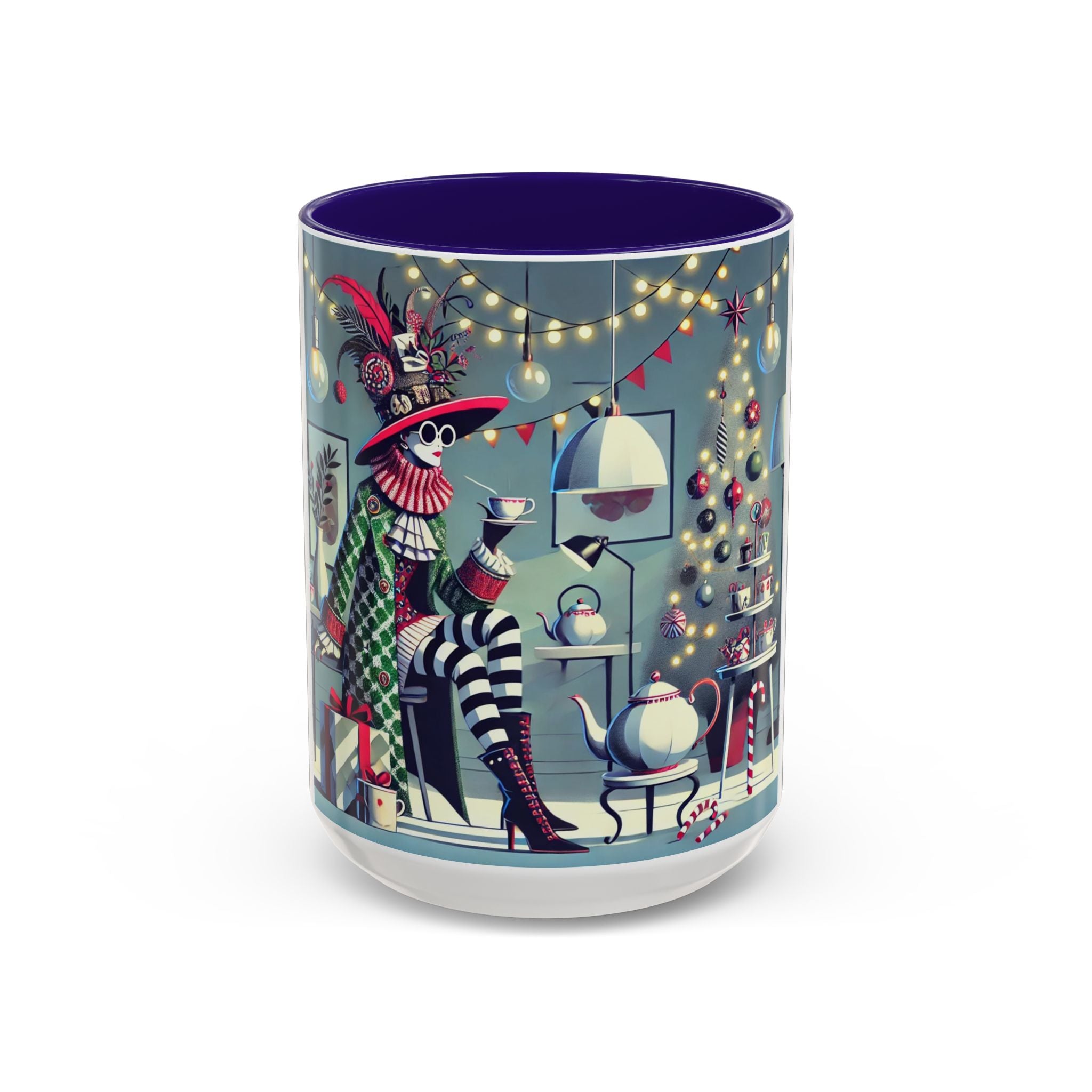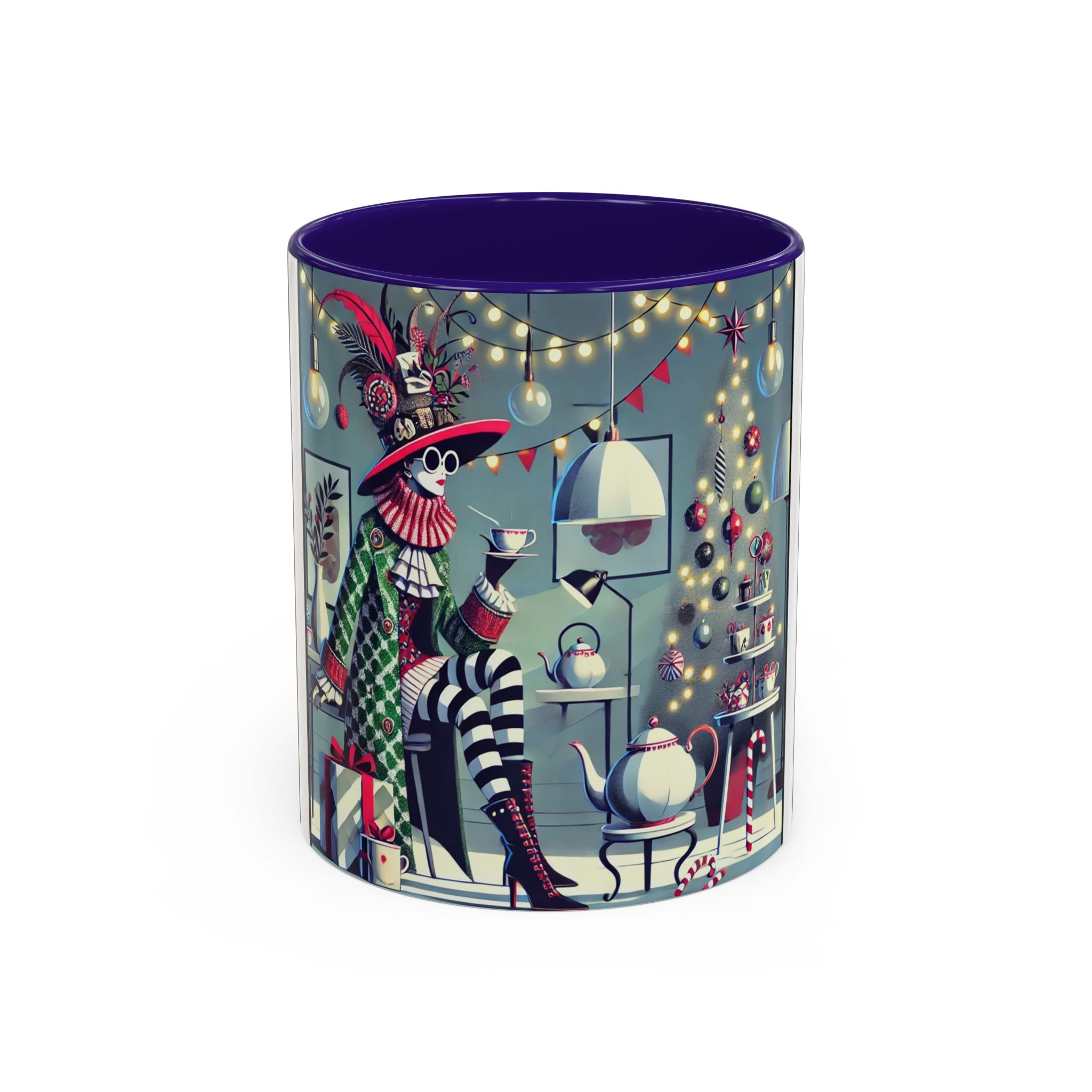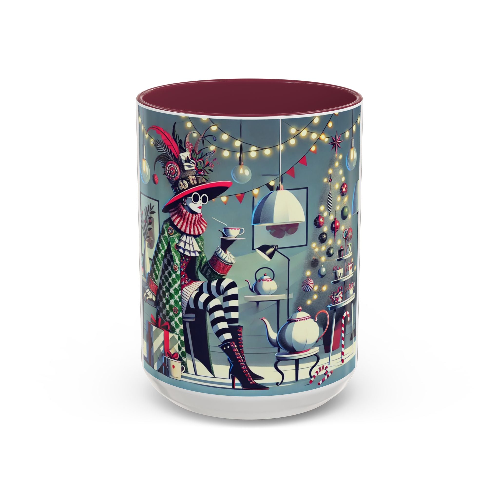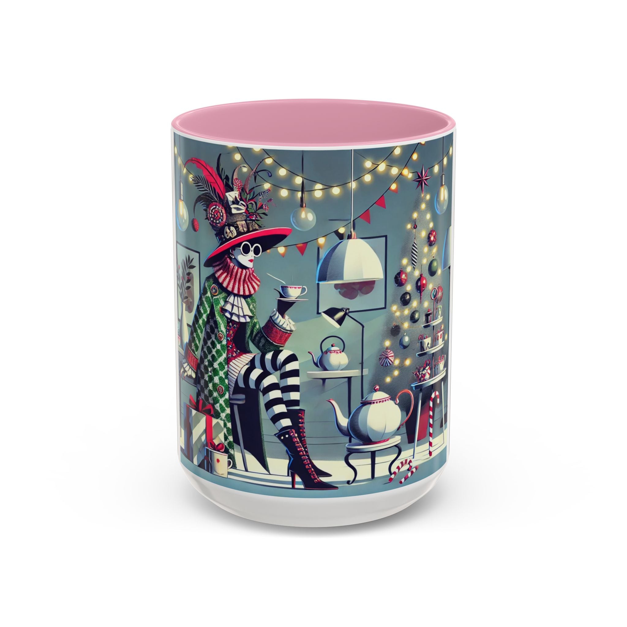 Begin your morning in style with a mug that feels like a celebration of the season itself. This whimsical Christmas tea party artwork wraps around each mug in vivid, high-fidelity color, turning a simple sip into an elegant ritual. A chic lady, dressed in a lavish feathered hat and patterned coat, pauses to savor her tea amidst glowing holiday lights. Her striped stockings, high-heeled boots, and bold accessories create a fashionable, theatrical presence that feels both modern and timeless.