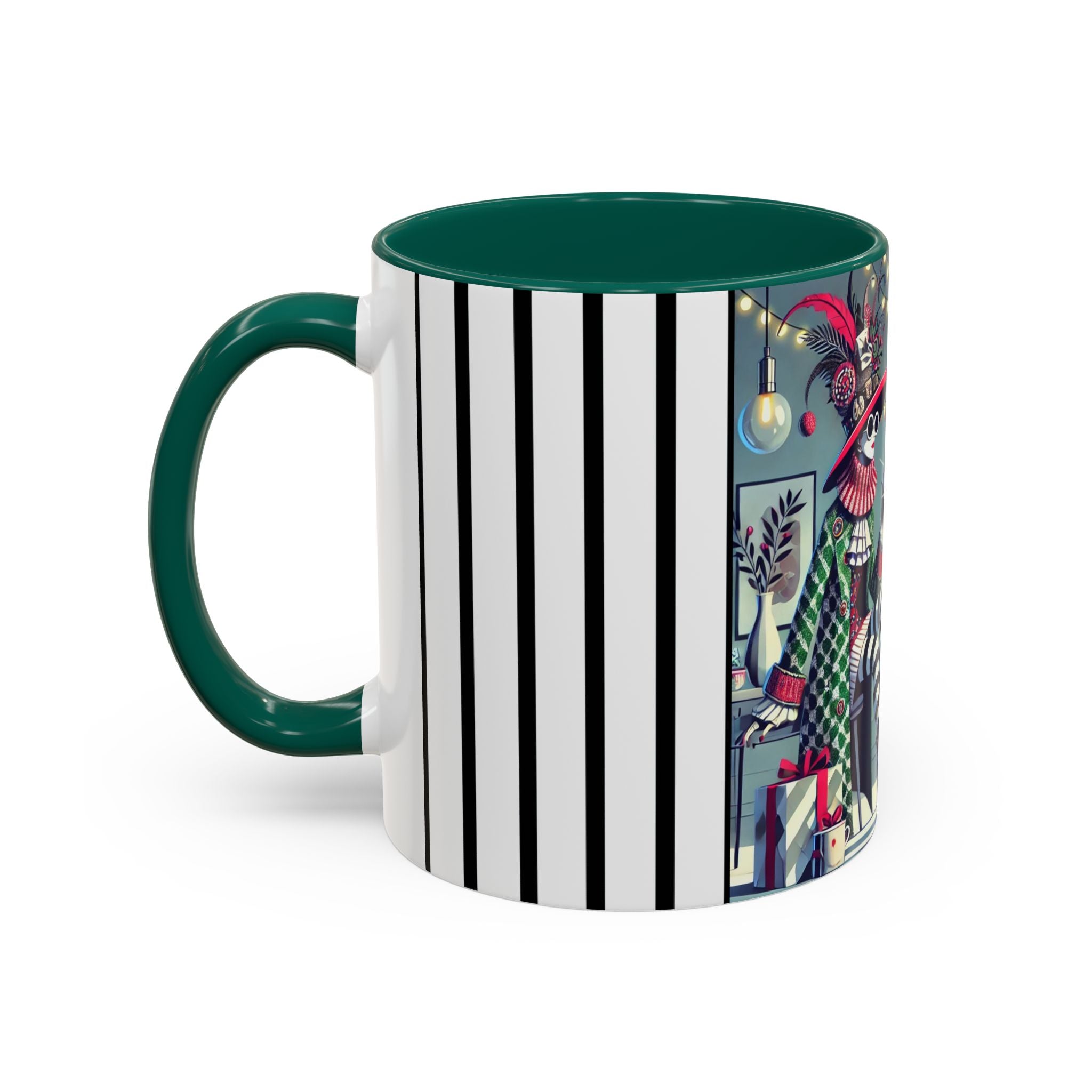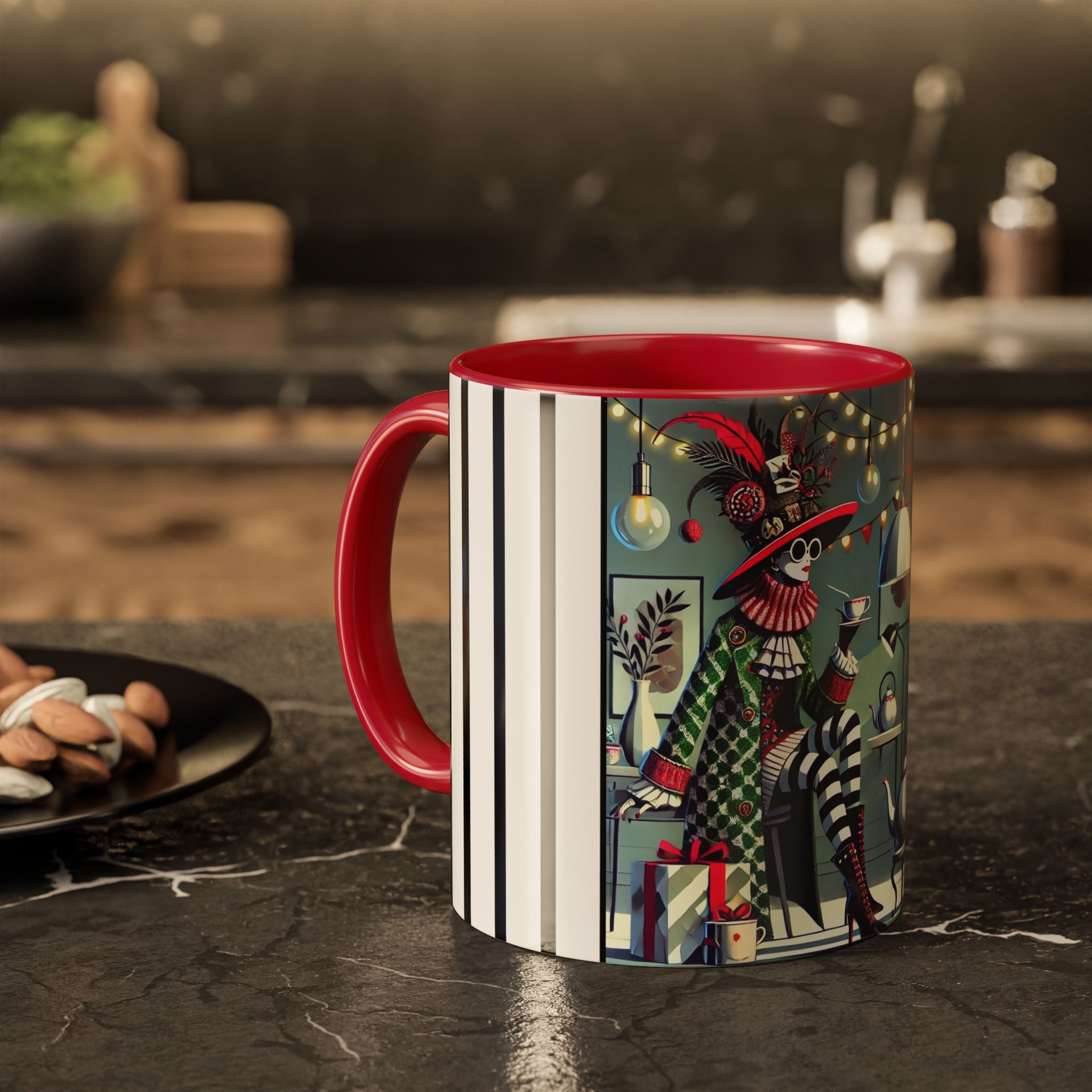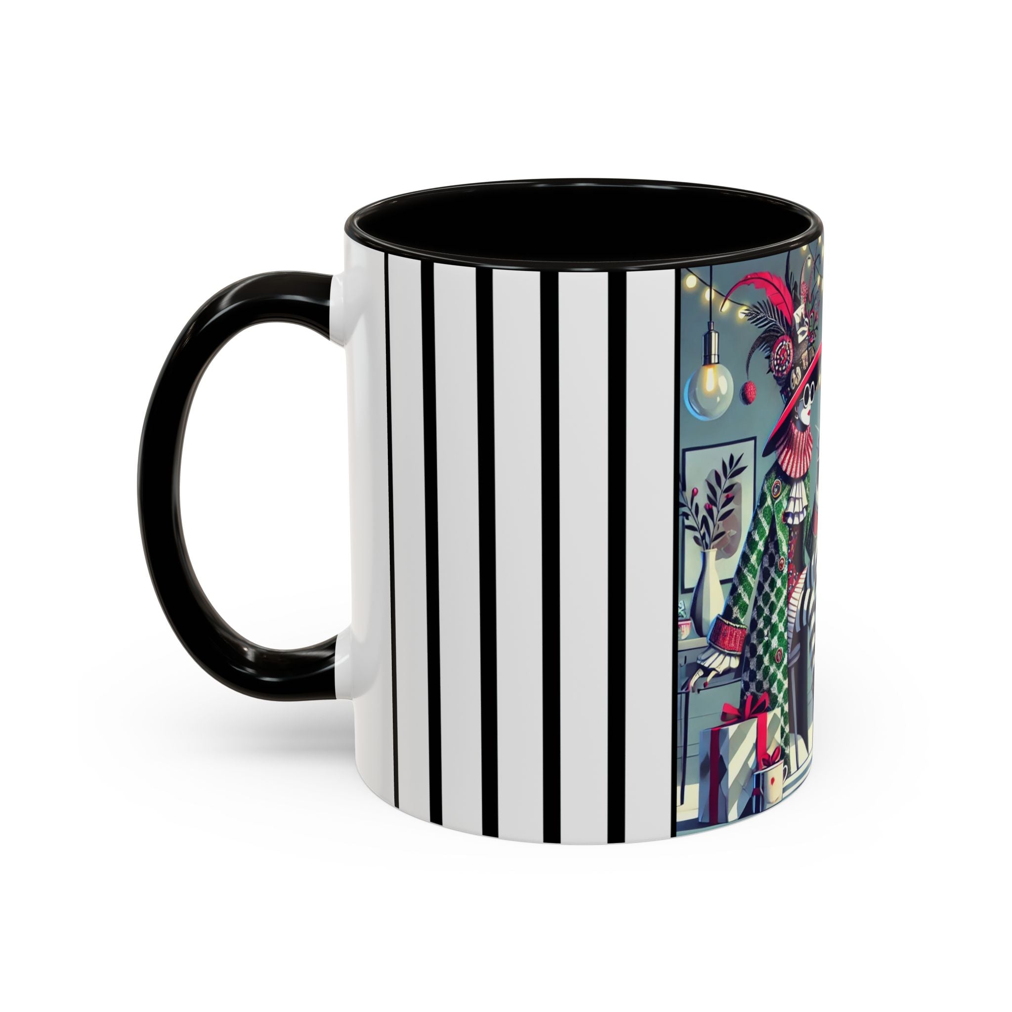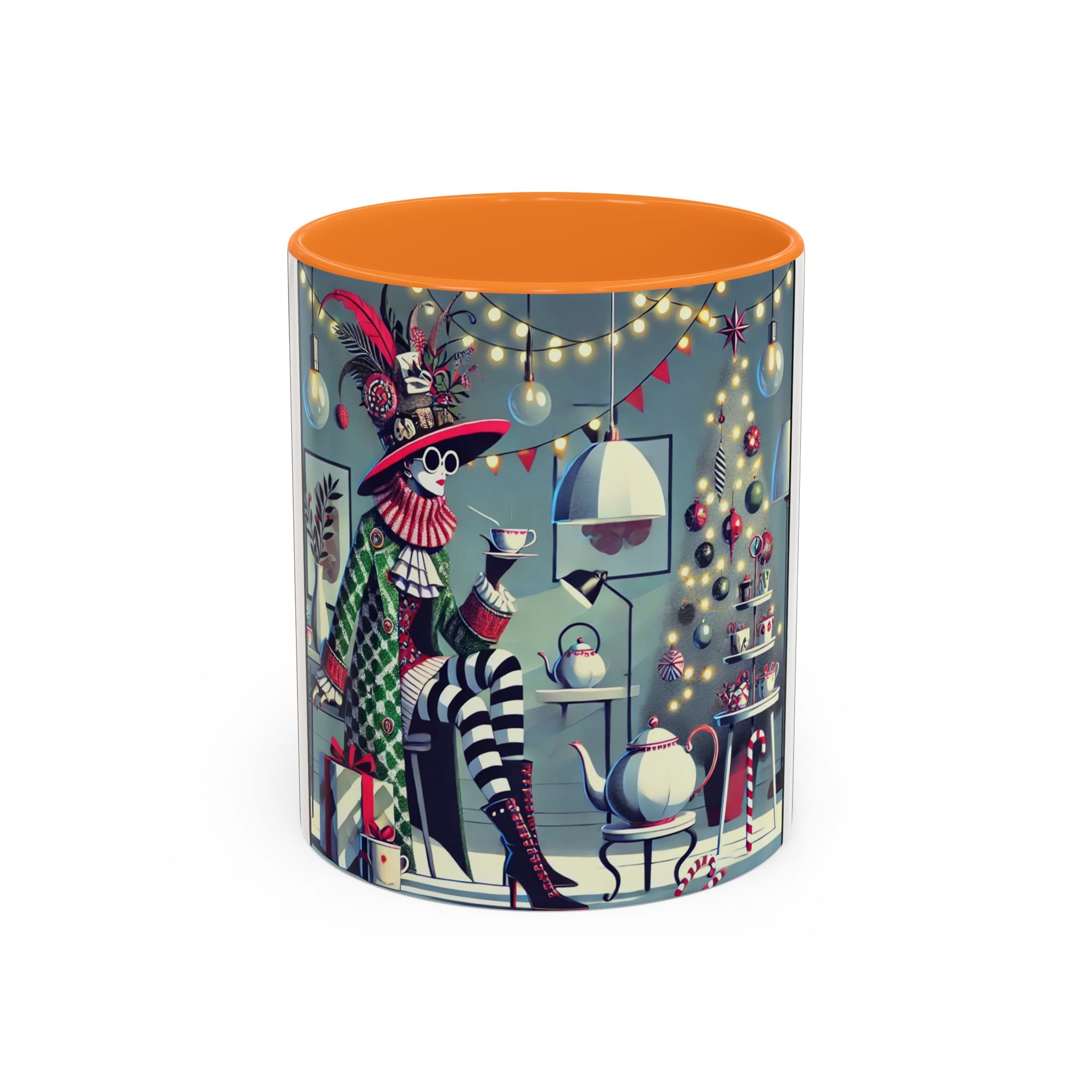 Begin your morning in style with a mug that feels like a celebration of the season itself. This whimsical Christmas tea party artwork wraps around each mug in vivid, high-fidelity color, turning a simple sip into an elegant ritual. A chic lady, dressed in a lavish feathered hat and patterned coat, pauses to savor her tea amidst glowing holiday lights. Her striped stockings, high-heeled boots, and bold accessories create a fashionable, theatrical presence that feels both modern and timeless.