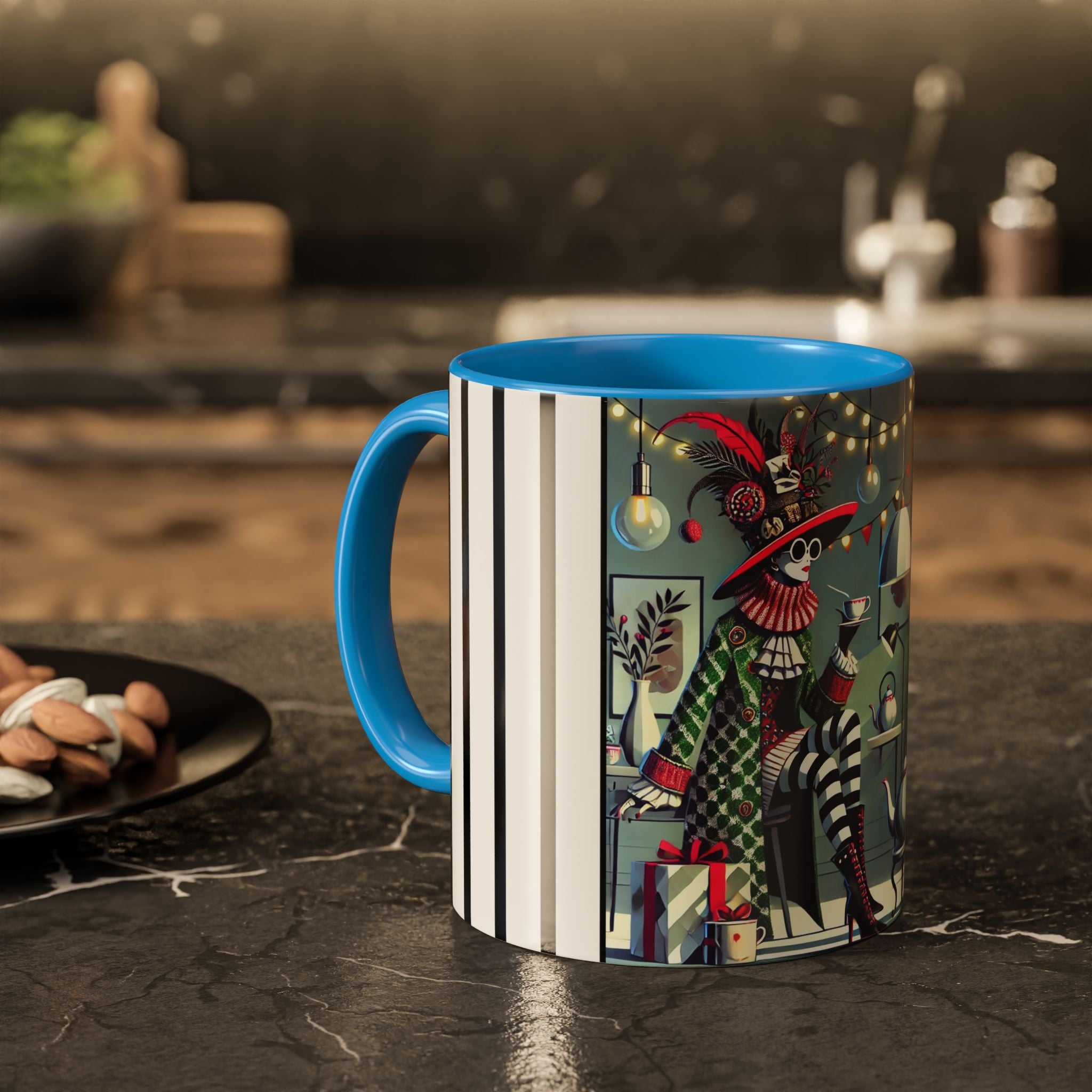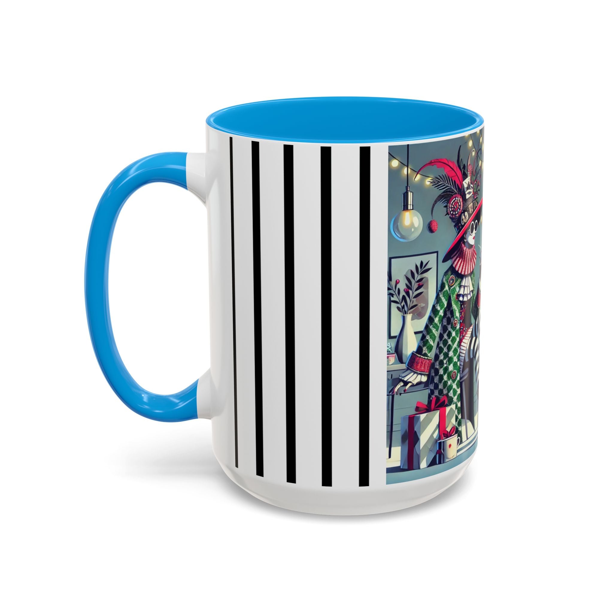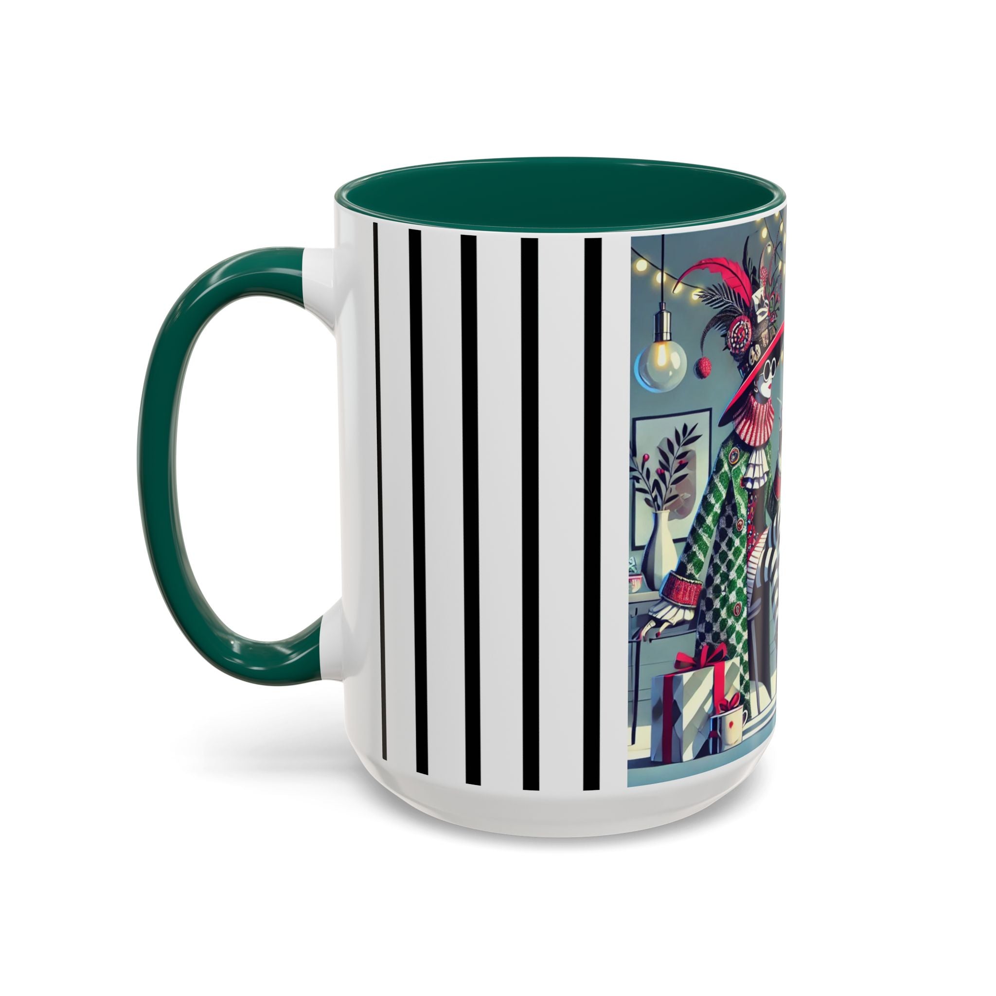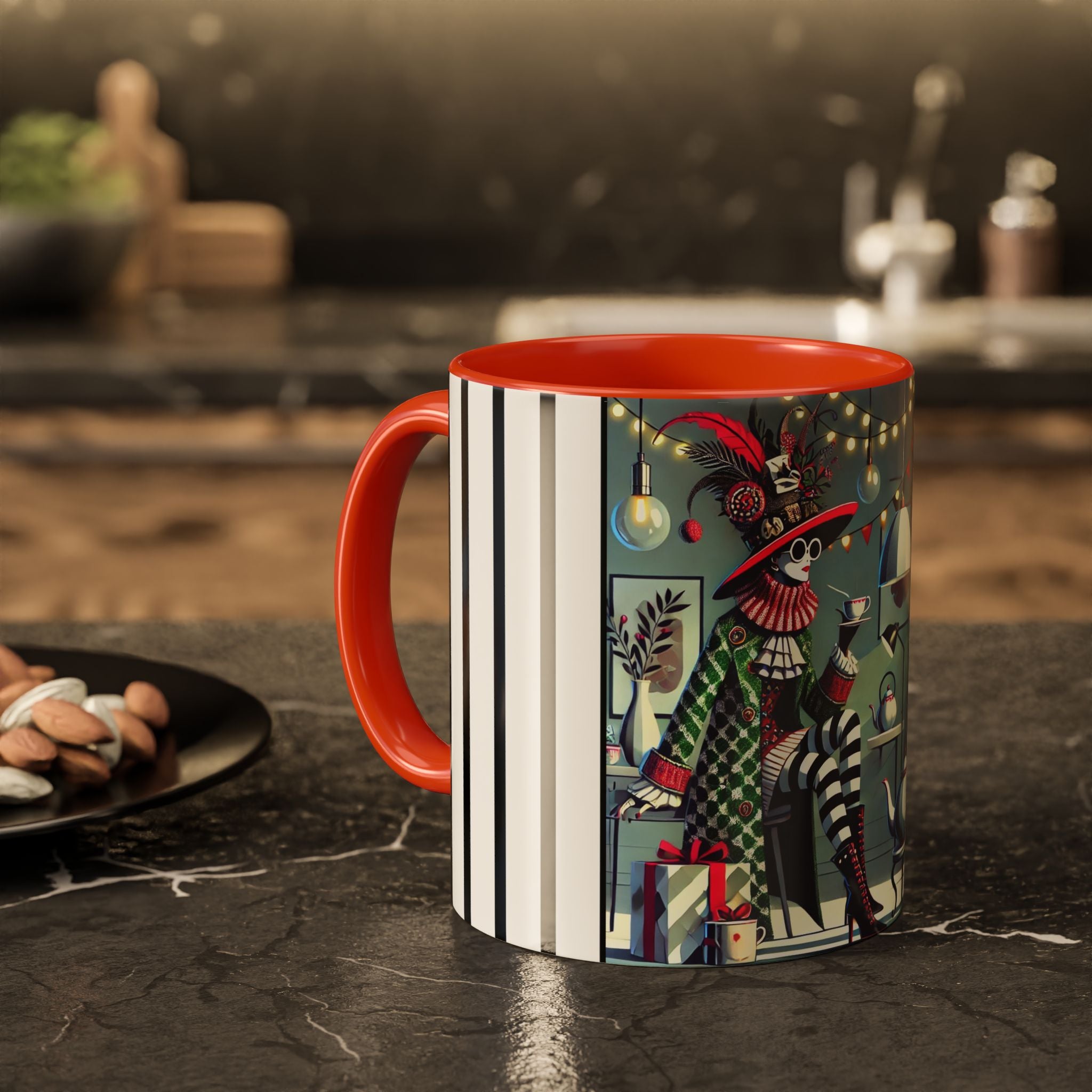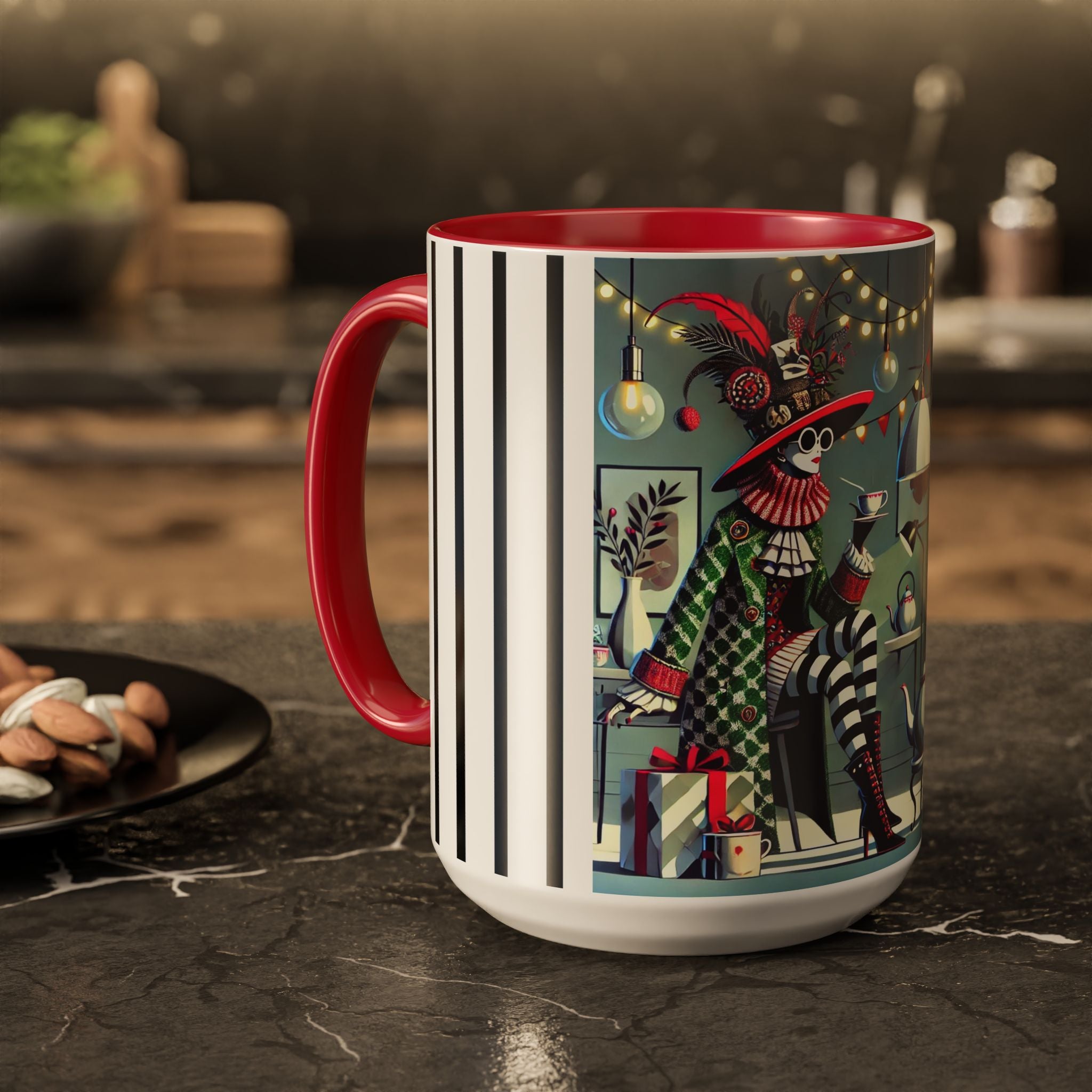 Begin your morning in style with a mug that feels like a celebration of the season itself. This whimsical Christmas tea party artwork wraps around each mug in vivid, high-fidelity color, turning a simple sip into an elegant ritual. A chic lady, dressed in a lavish feathered hat and patterned coat, pauses to savor her tea amidst glowing holiday lights. Her striped stockings, high-heeled boots, and bold accessories create a fashionable, theatrical presence that feels both modern and timeless.
