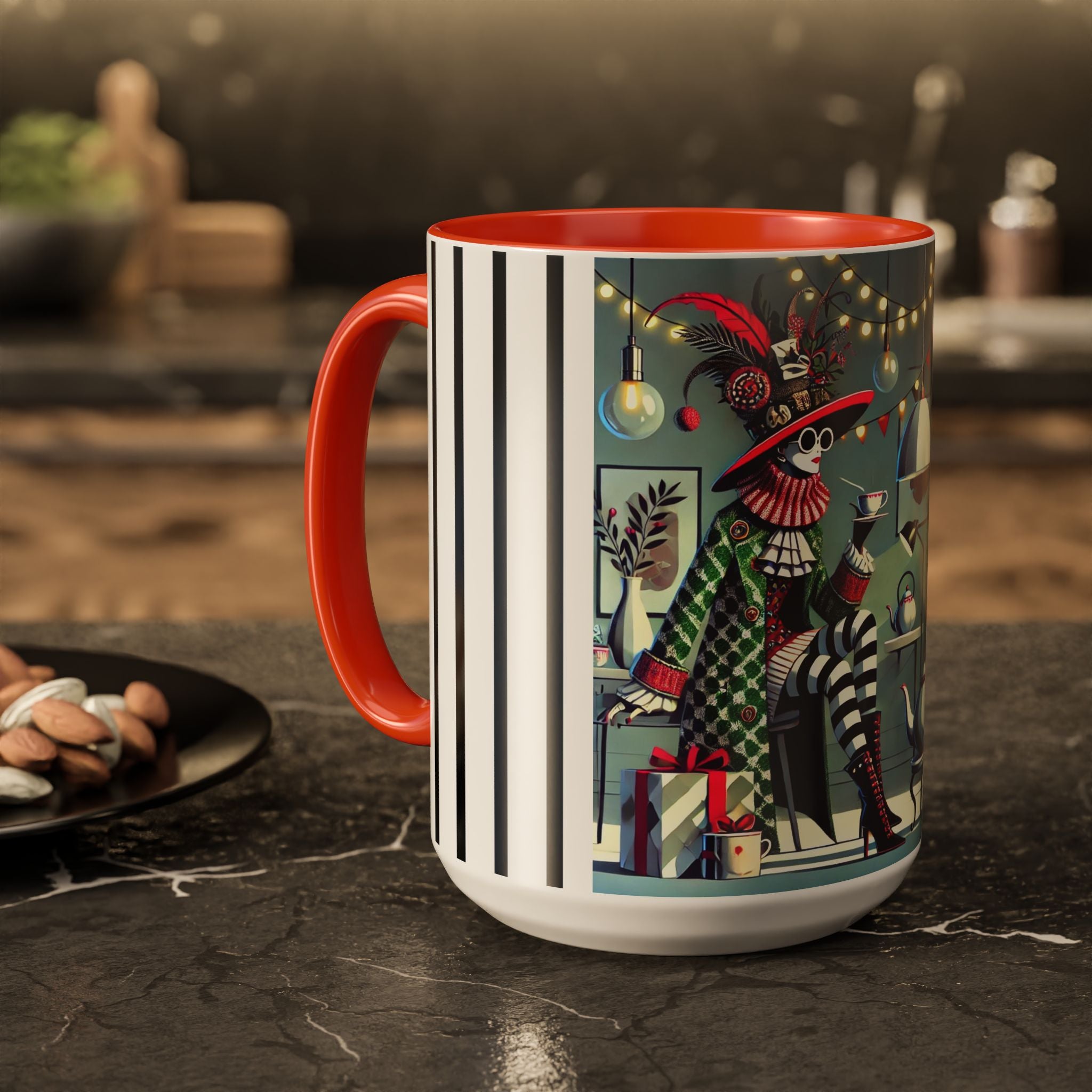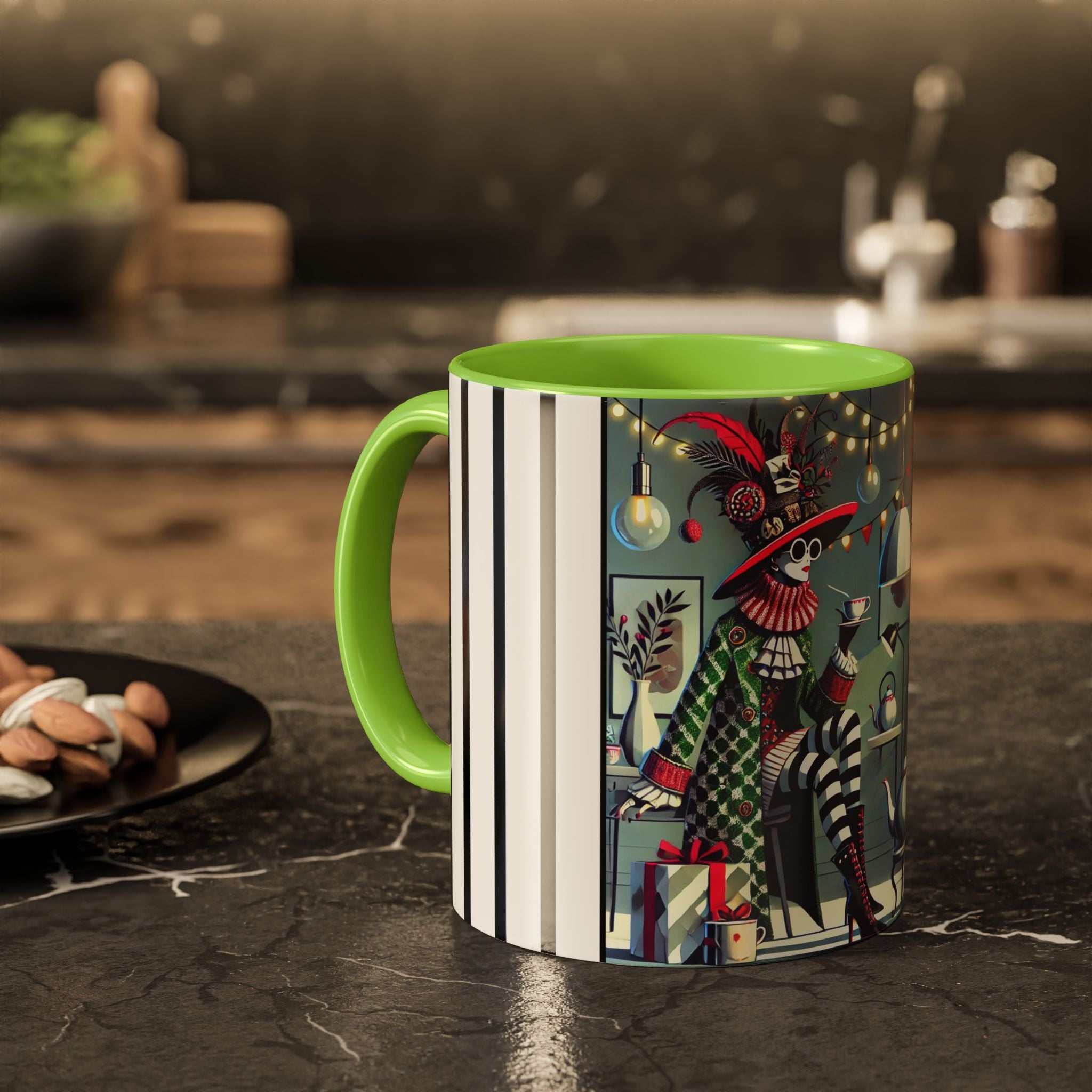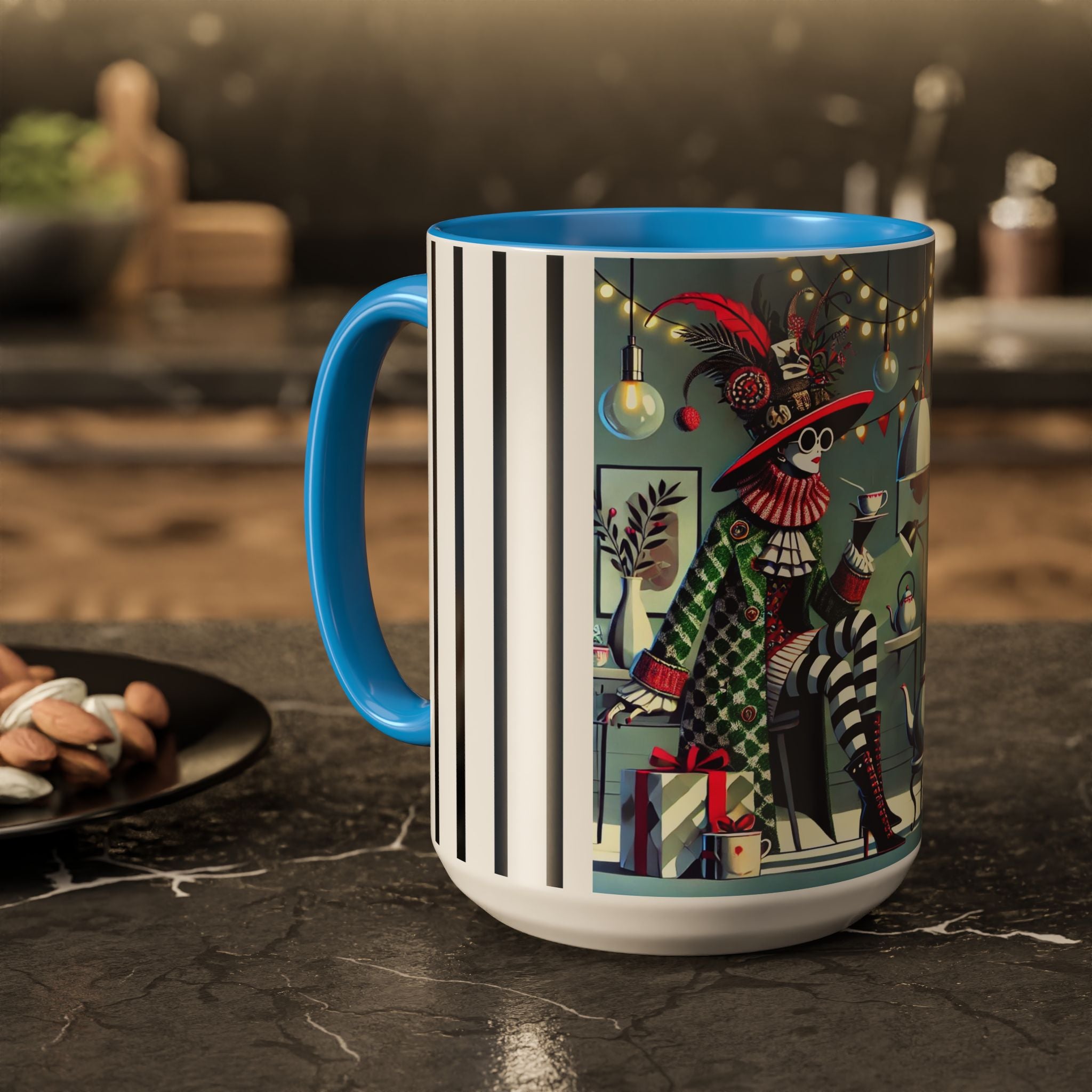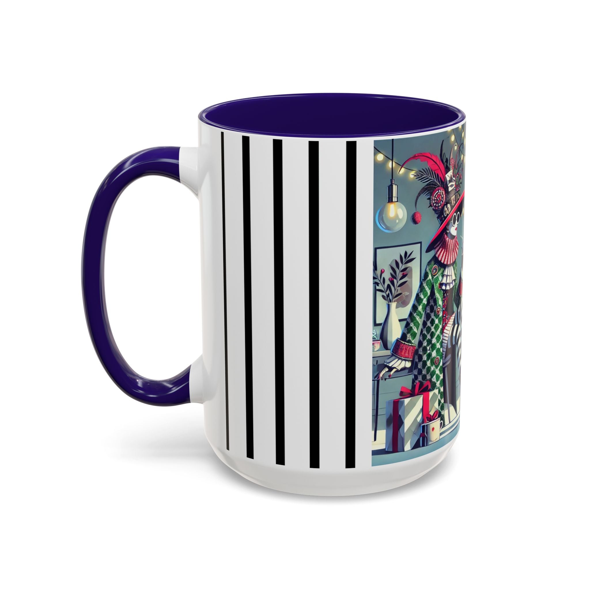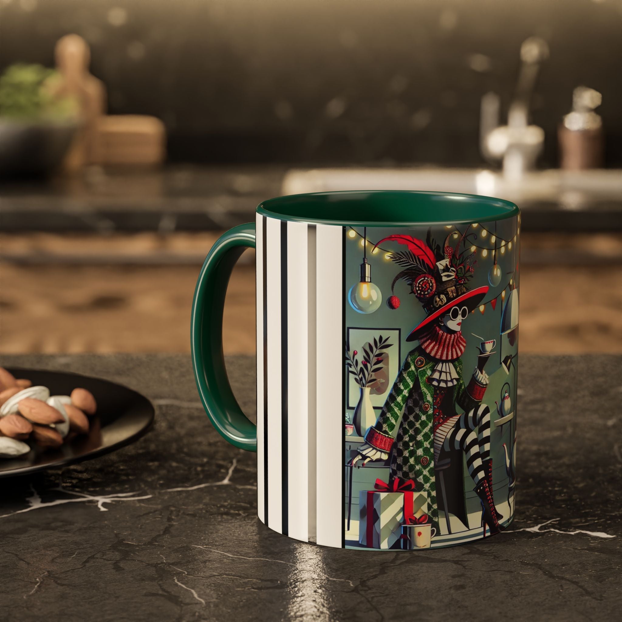 Begin your morning in style with a mug that feels like a celebration of the season itself. This whimsical Christmas tea party artwork wraps around each mug in vivid, high-fidelity color, turning a simple sip into an elegant ritual. A chic lady, dressed in a lavish feathered hat and patterned coat, pauses to savor her tea amidst glowing holiday lights. Her striped stockings, high-heeled boots, and bold accessories create a fashionable, theatrical presence that feels both modern and timeless.
