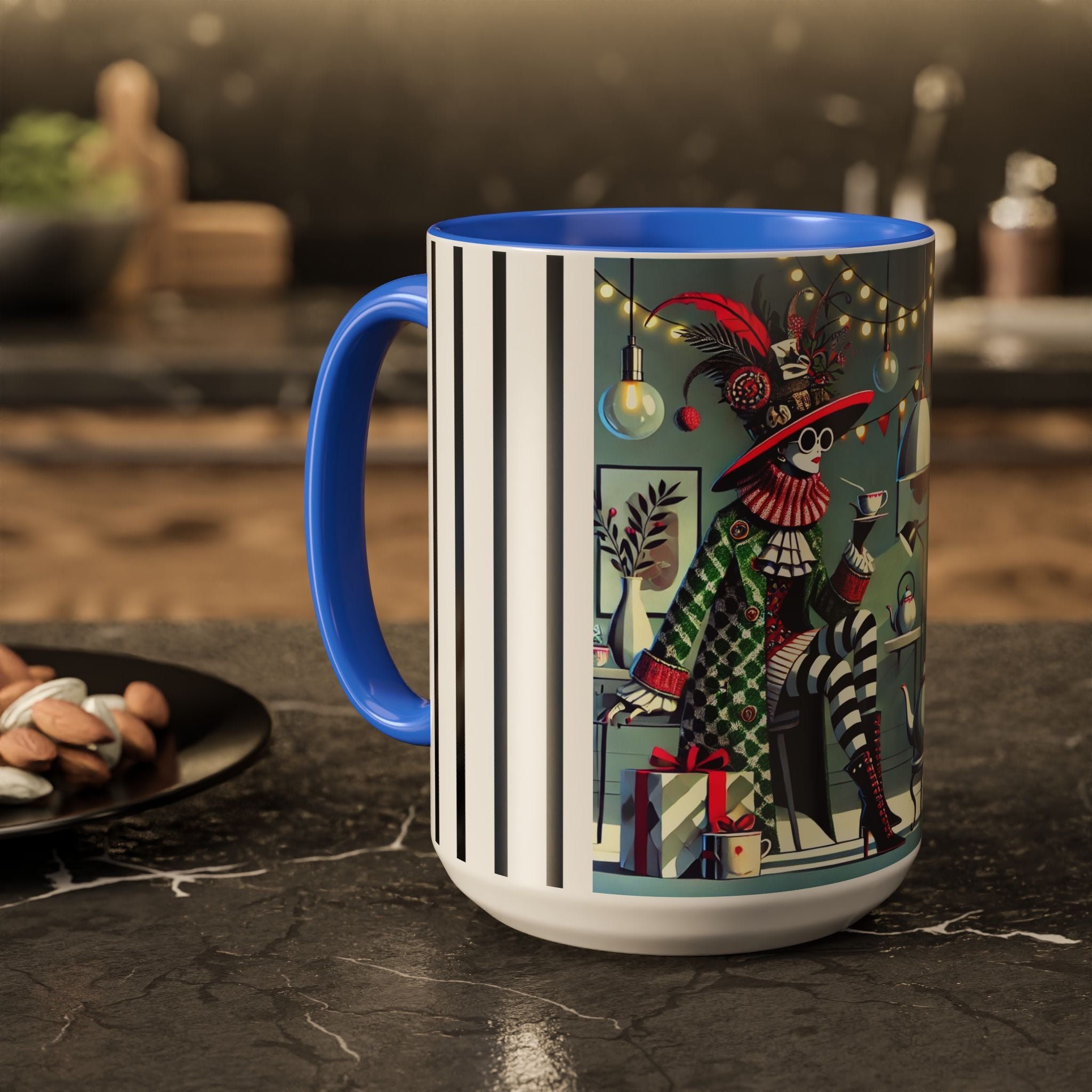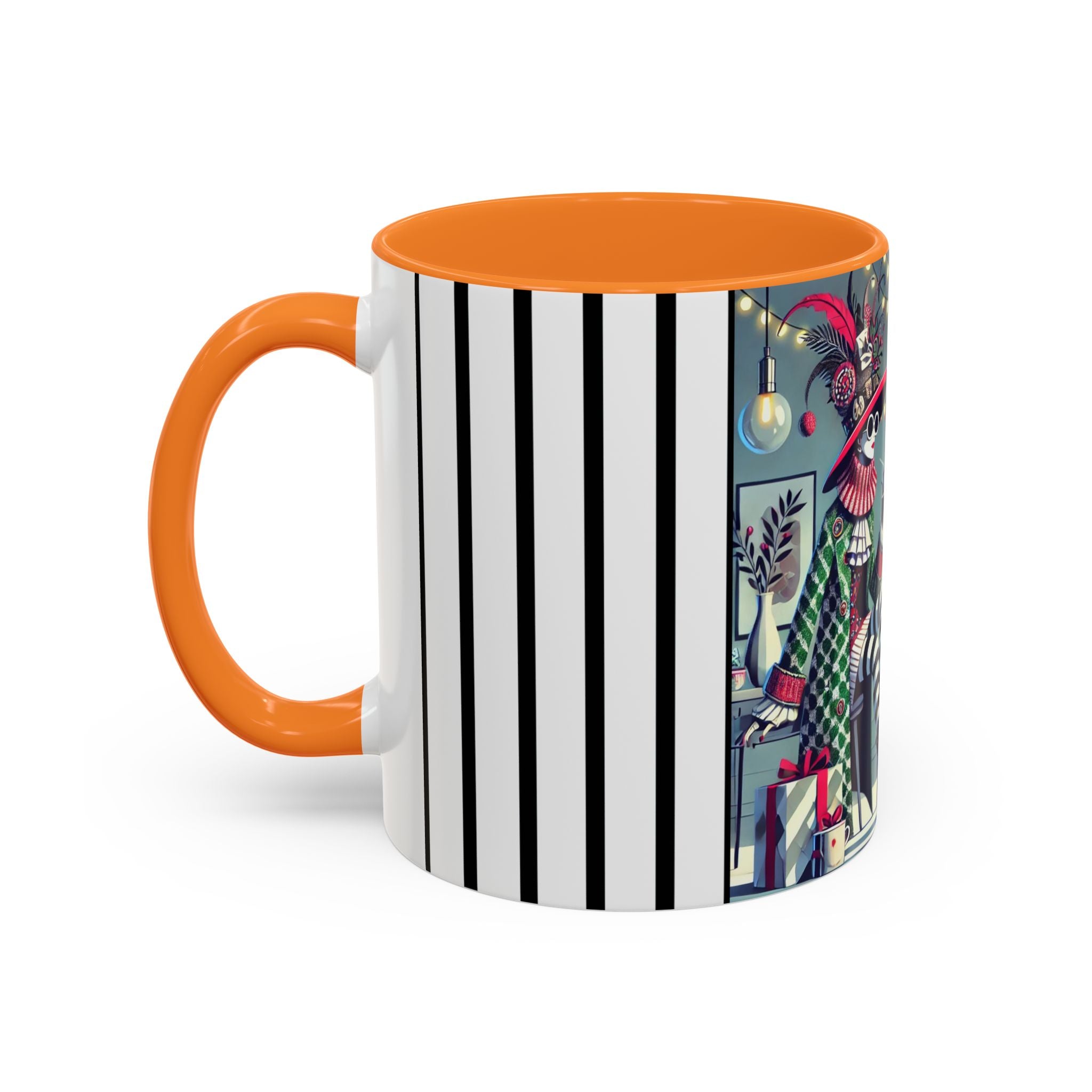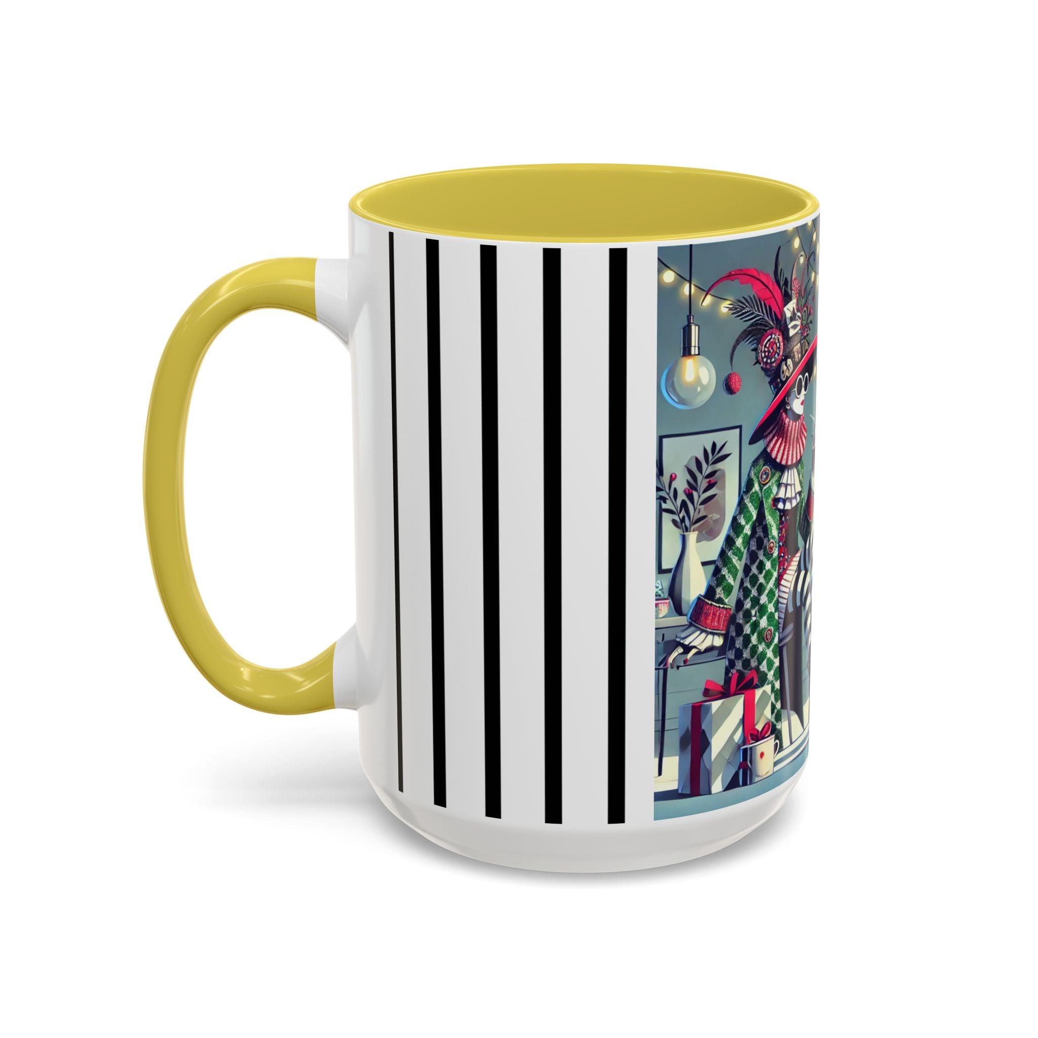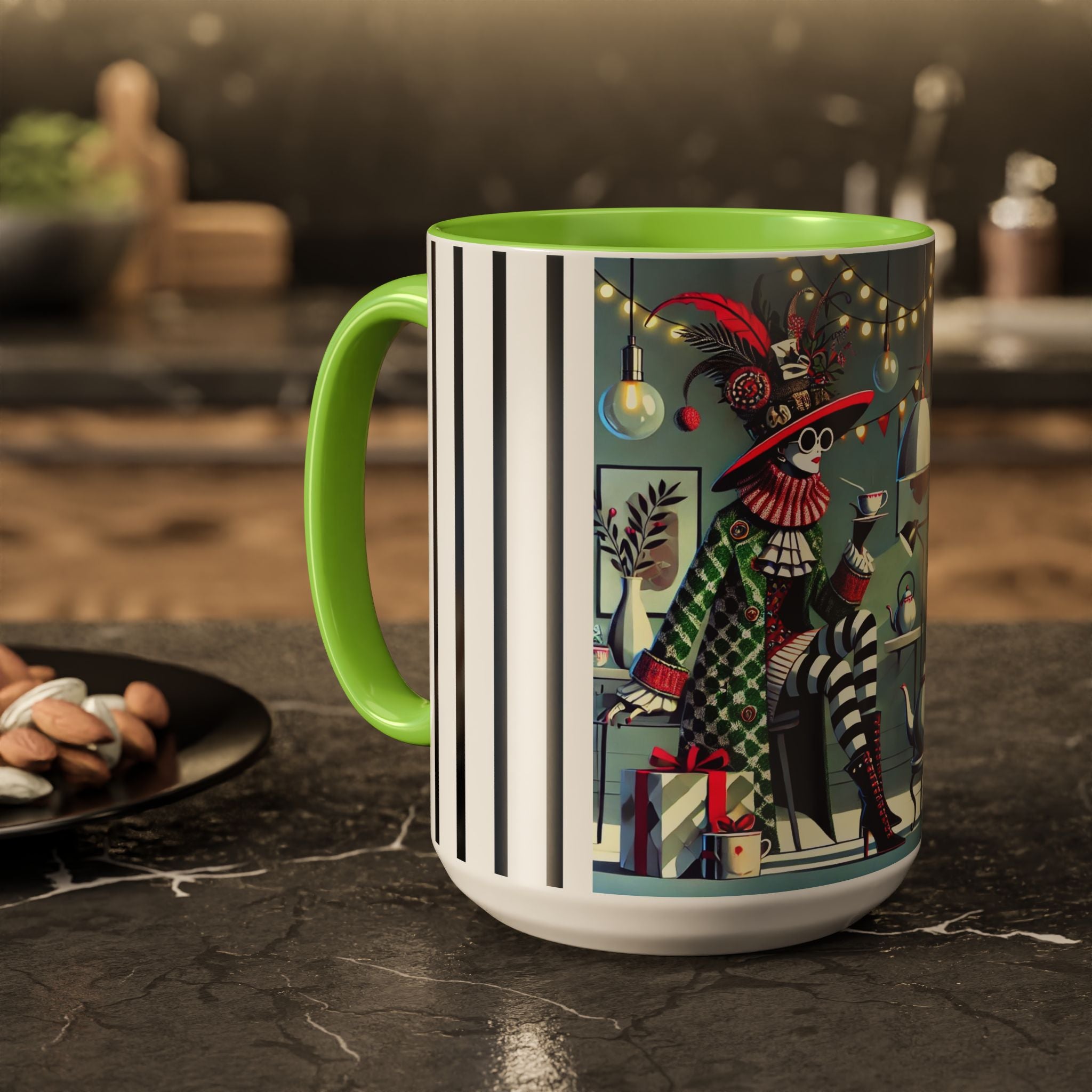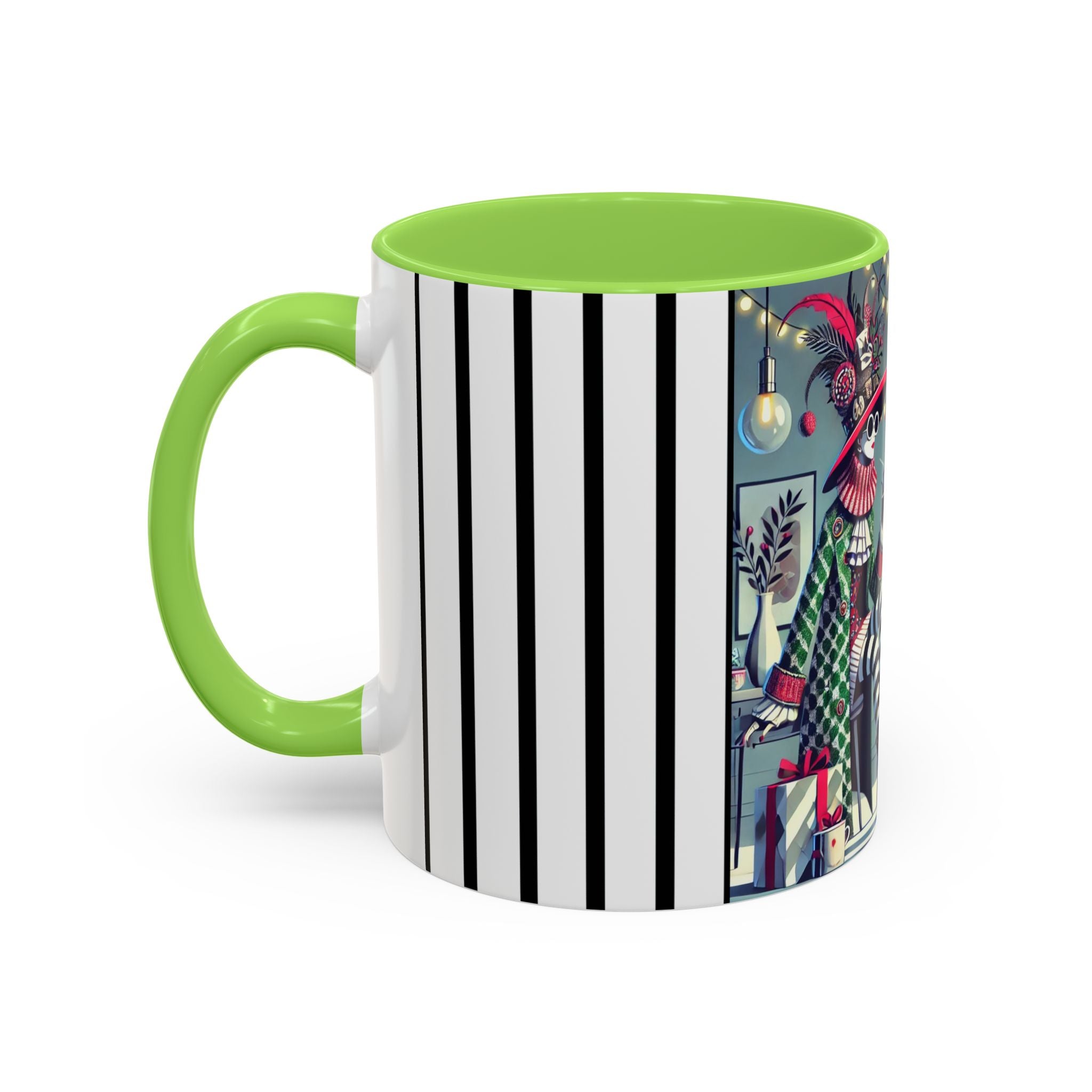 Begin your morning in style with a mug that feels like a celebration of the season itself. This whimsical Christmas tea party artwork wraps around each mug in vivid, high-fidelity color, turning a simple sip into an elegant ritual. A chic lady, dressed in a lavish feathered hat and patterned coat, pauses to savor her tea amidst glowing holiday lights. Her striped stockings, high-heeled boots, and bold accessories create a fashionable, theatrical presence that feels both modern and timeless.