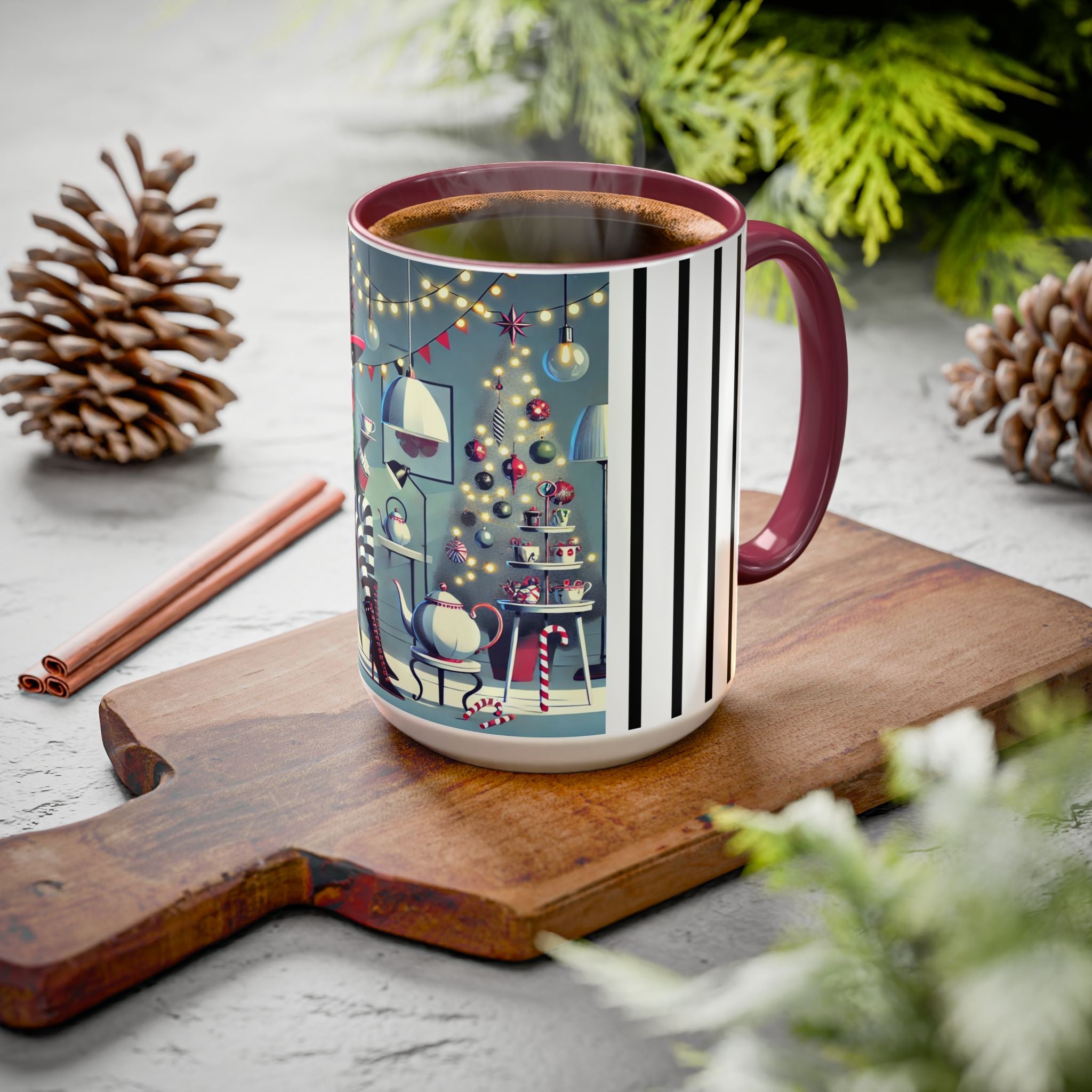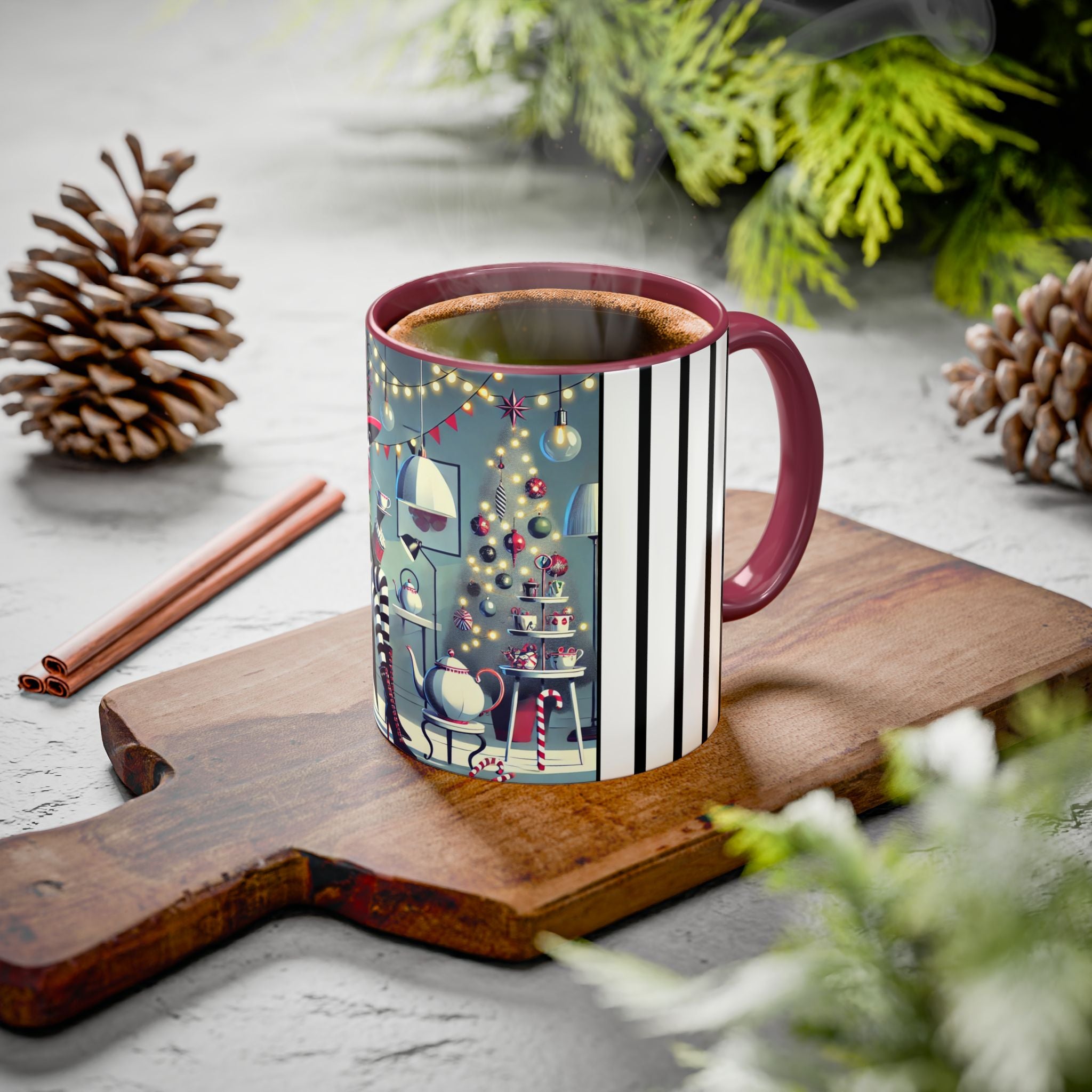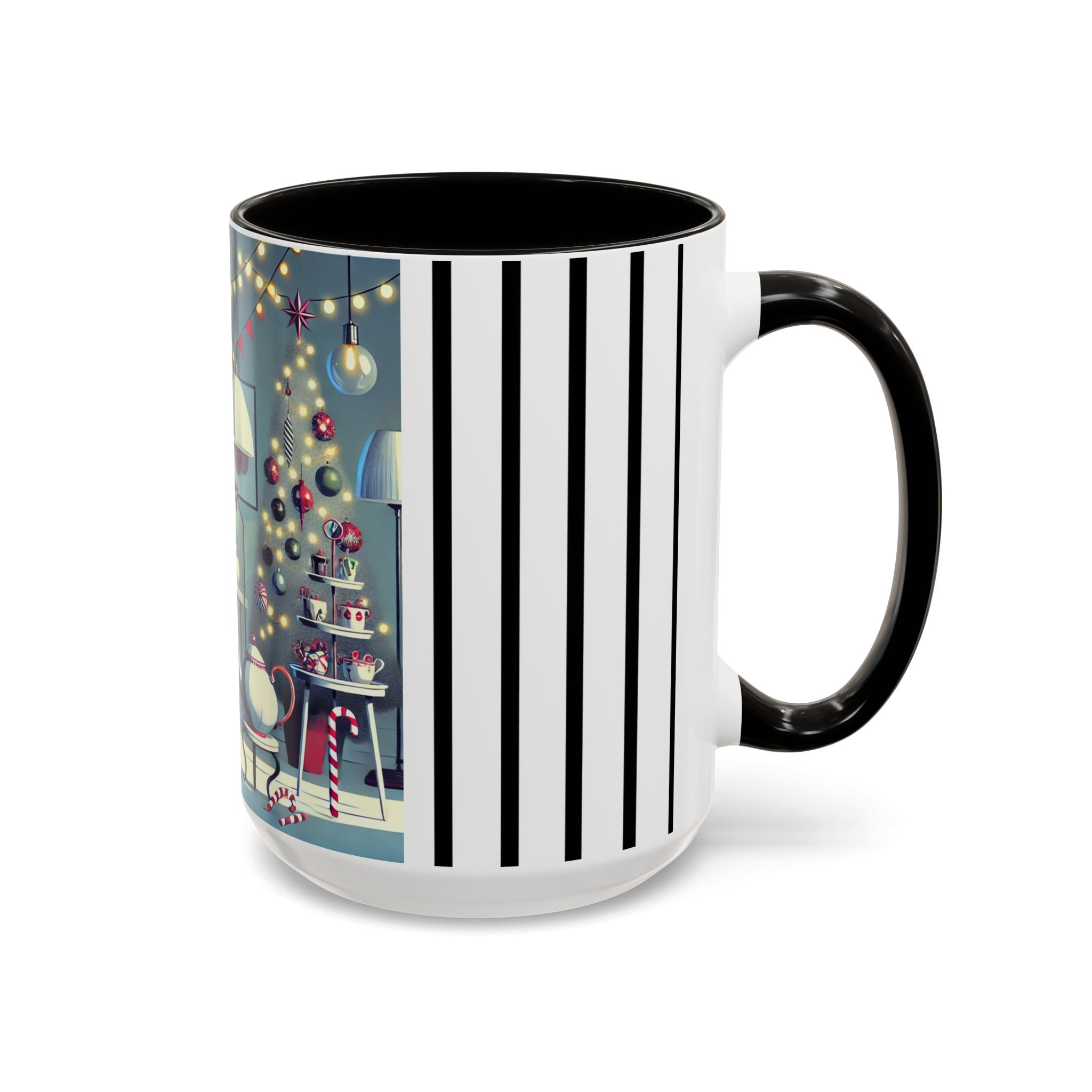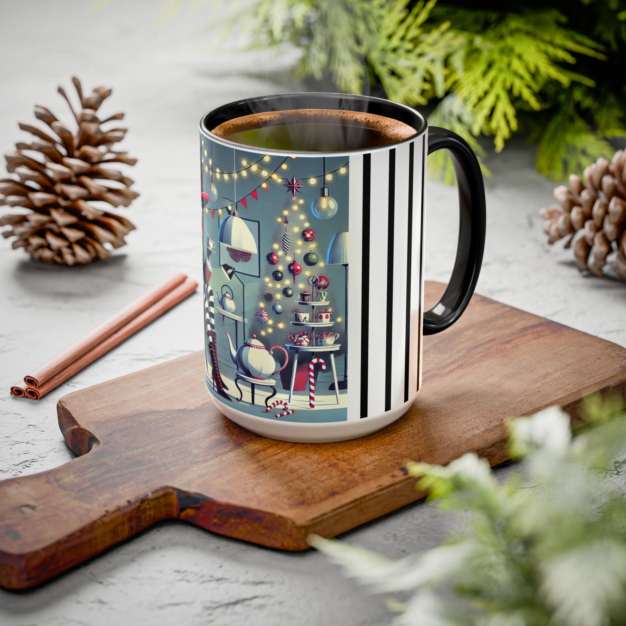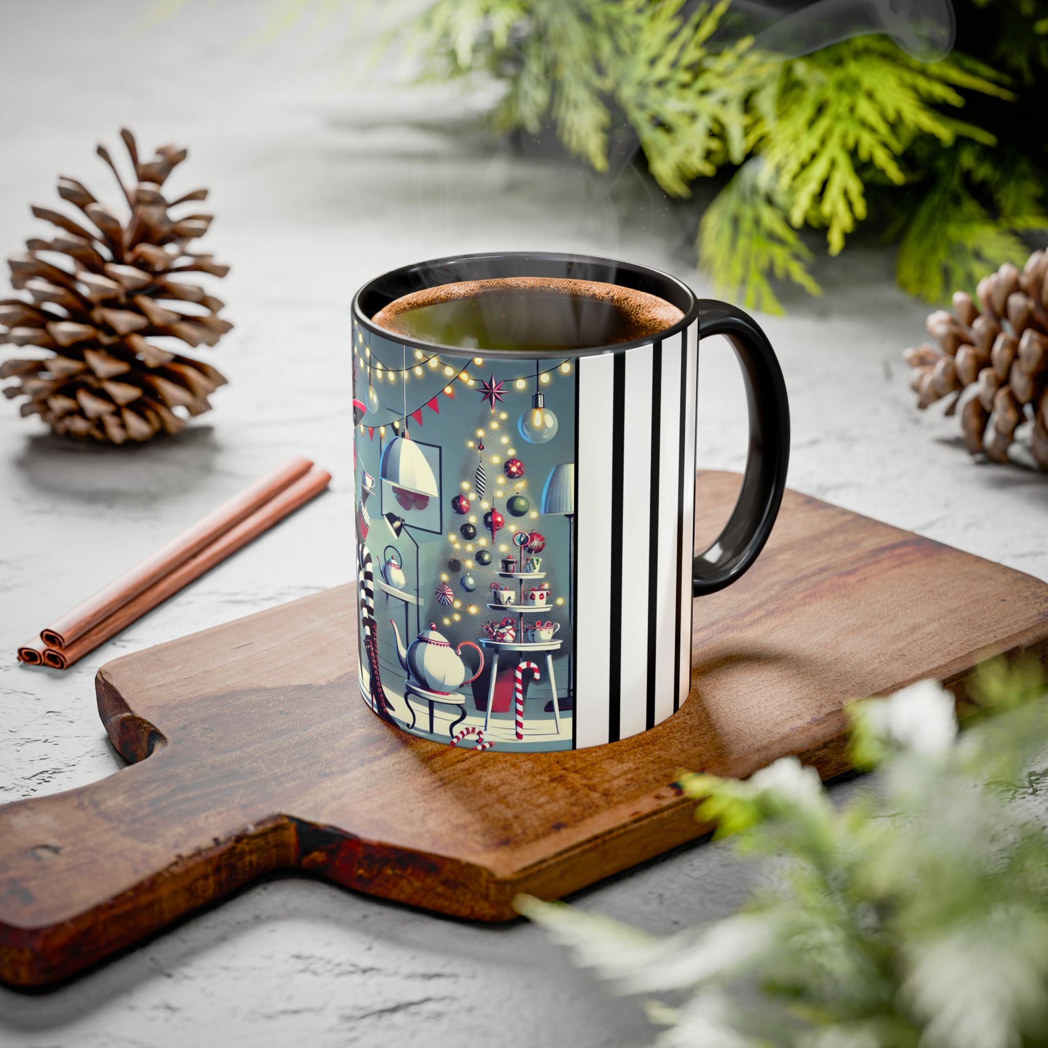 Every detail of the scene comes alive as you hold the cup in your hand—the sparkle of ornaments on the tree, the candy canes and ribbons tucked into the décor, and the inviting glow of a festive tea set. The glossy finish of the mug enhances the artwork’s radiance, ensuring each line and color shines through with warmth and cheer.
