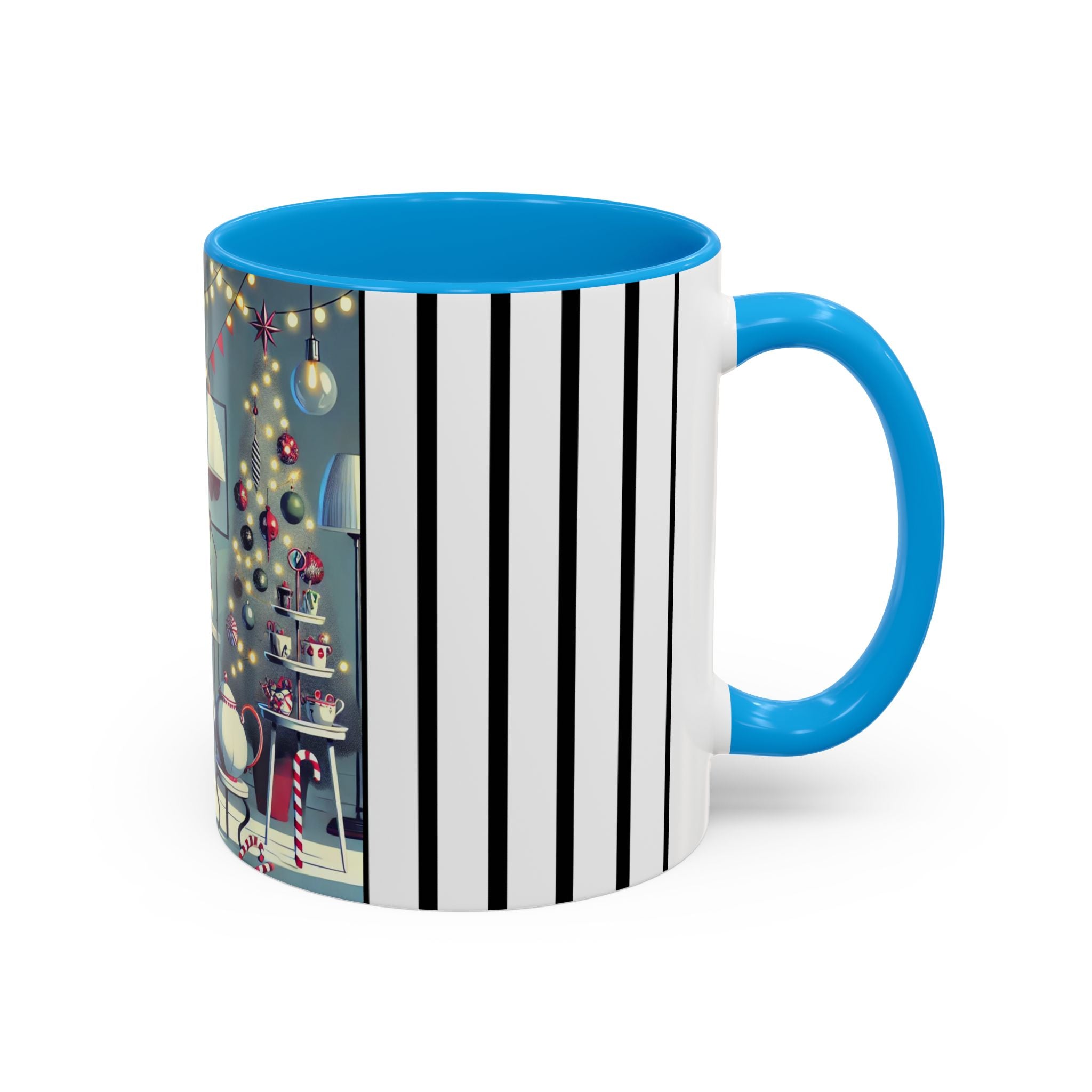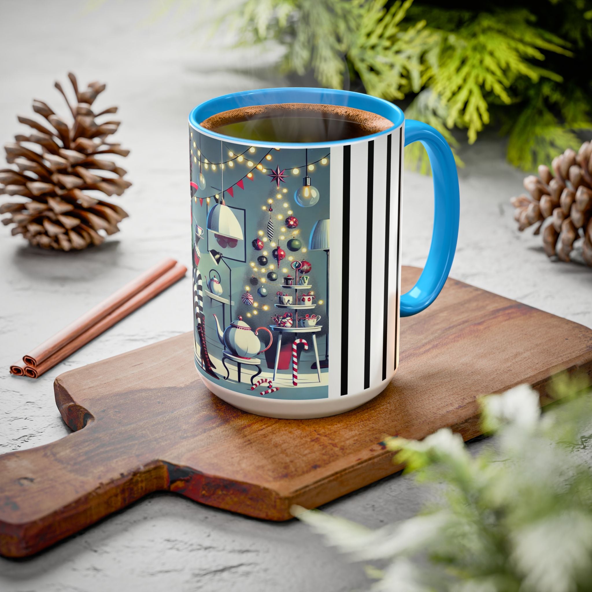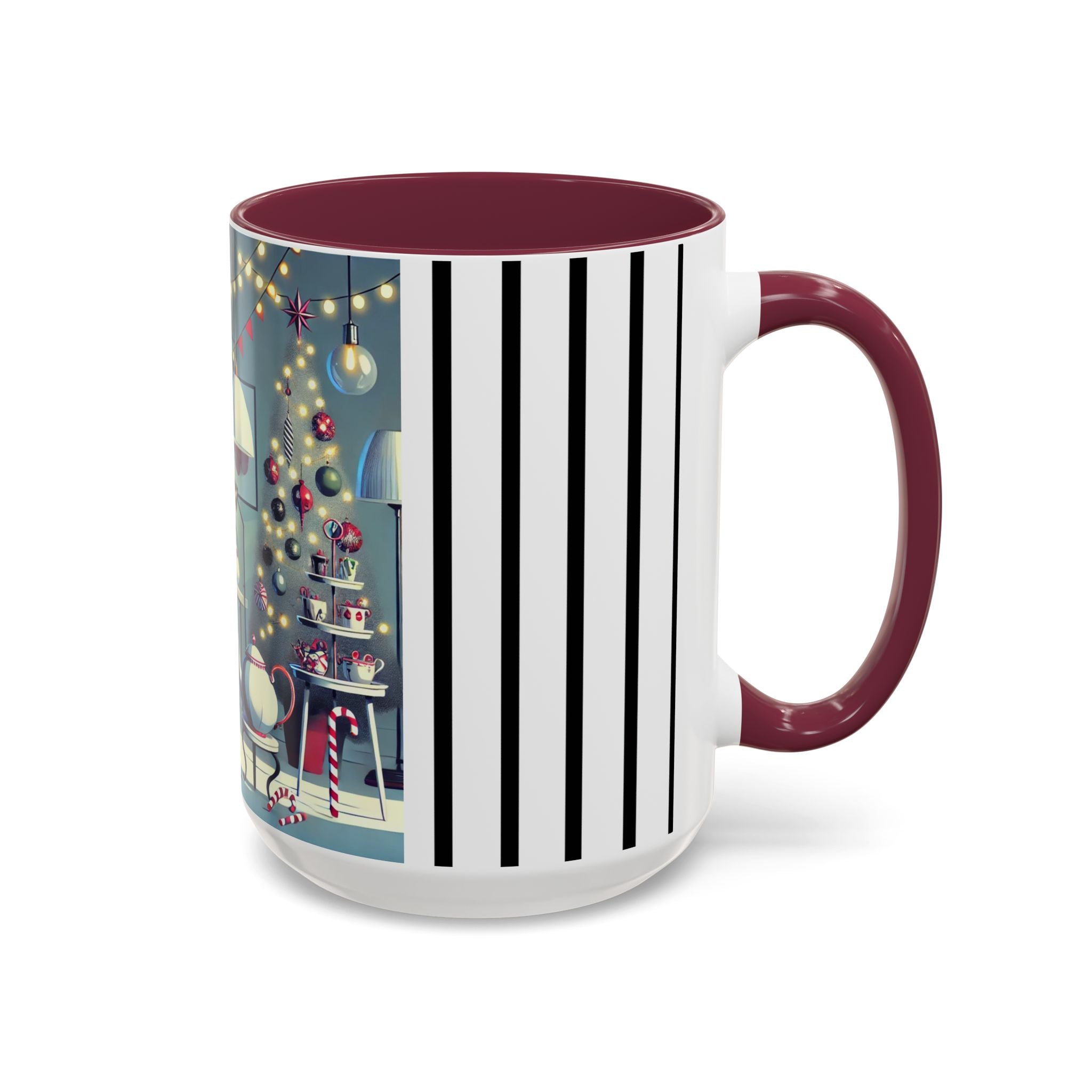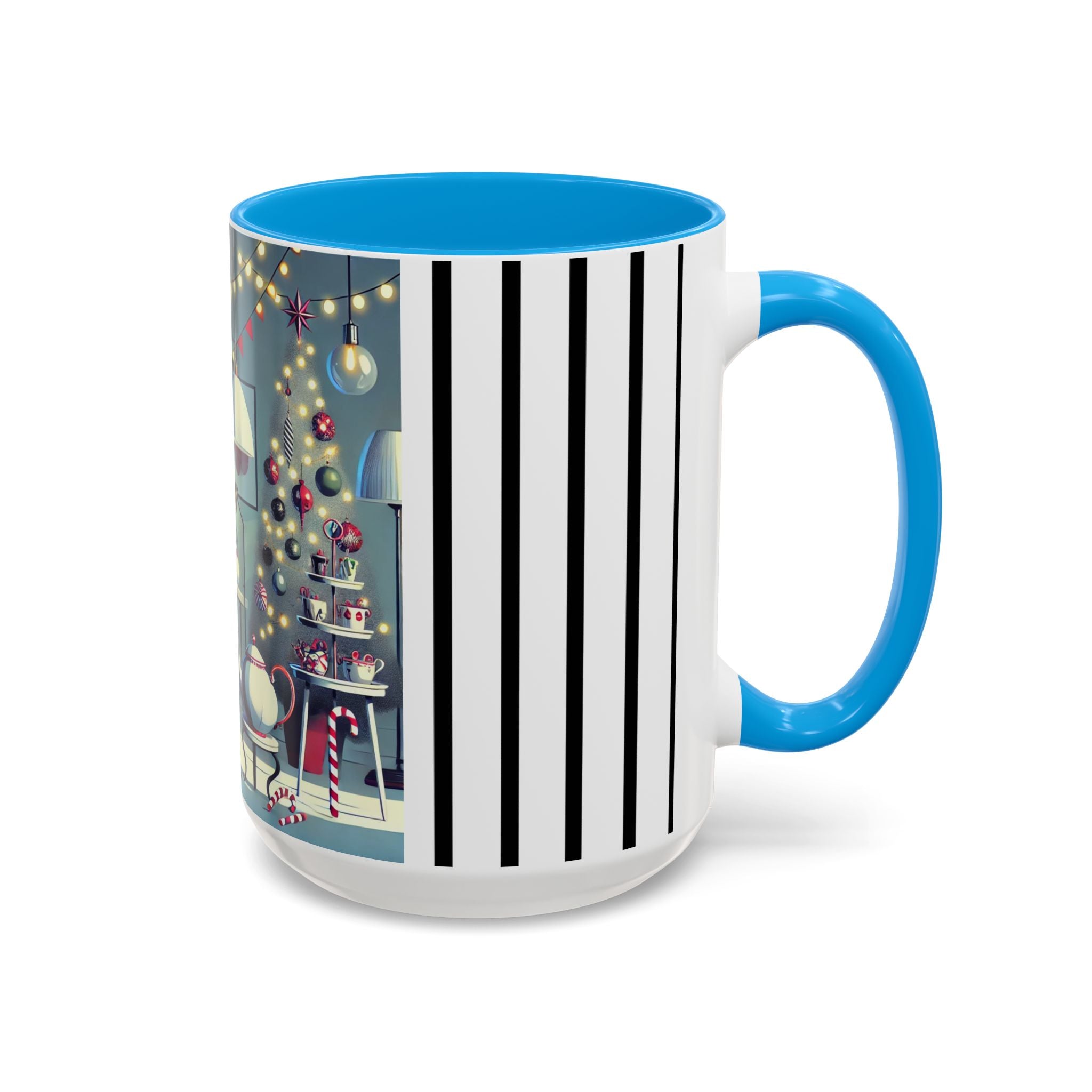 Every detail of the scene comes alive as you hold the cup in your hand—the sparkle of ornaments on the tree, the candy canes and ribbons tucked into the décor, and the inviting glow of a festive tea set. The glossy finish of the mug enhances the artwork’s radiance, ensuring each line and color shines through with warmth and cheer.
