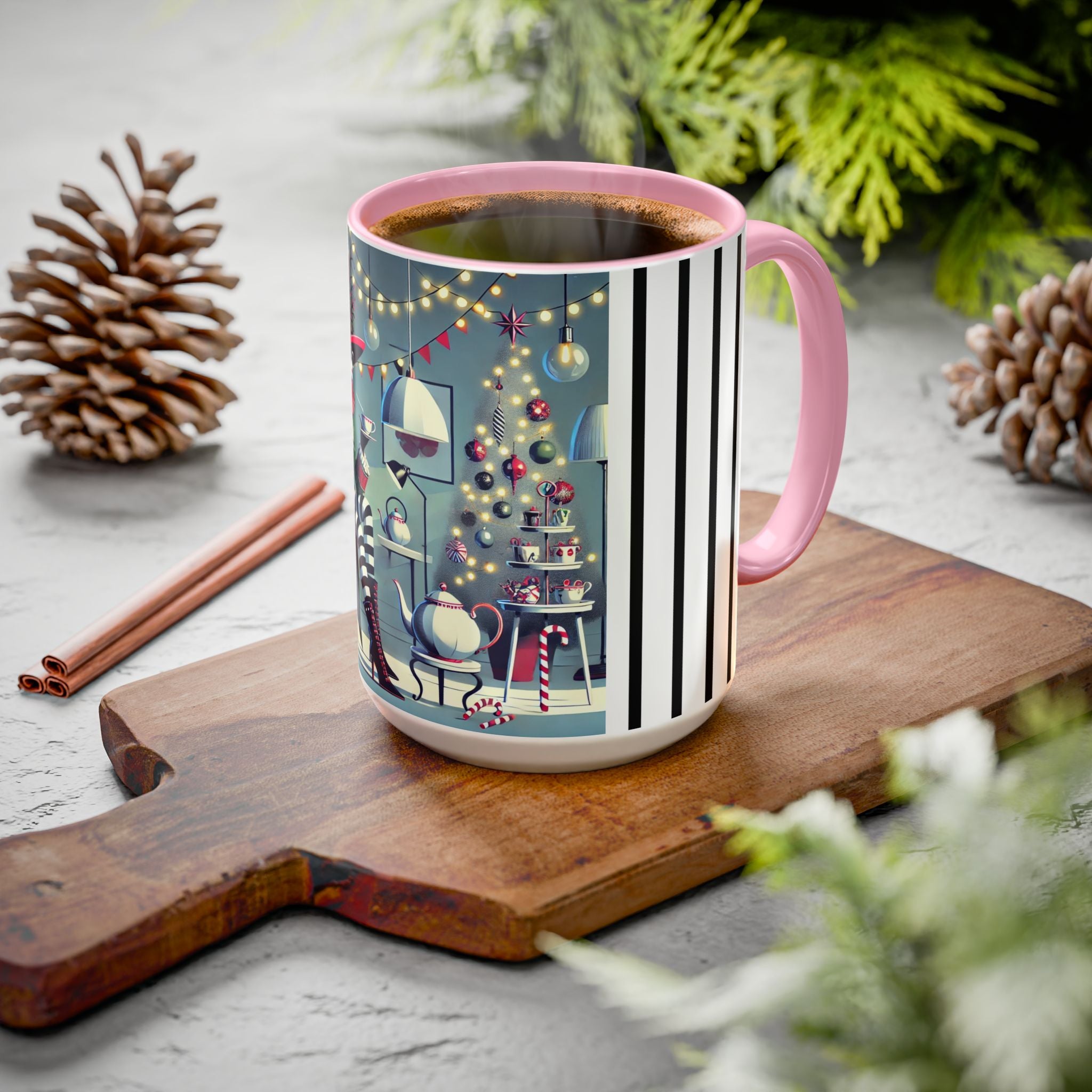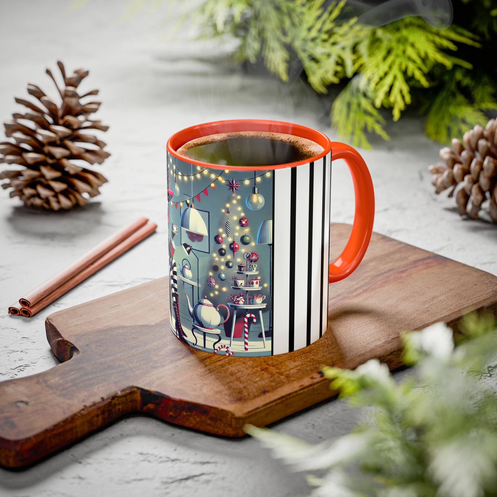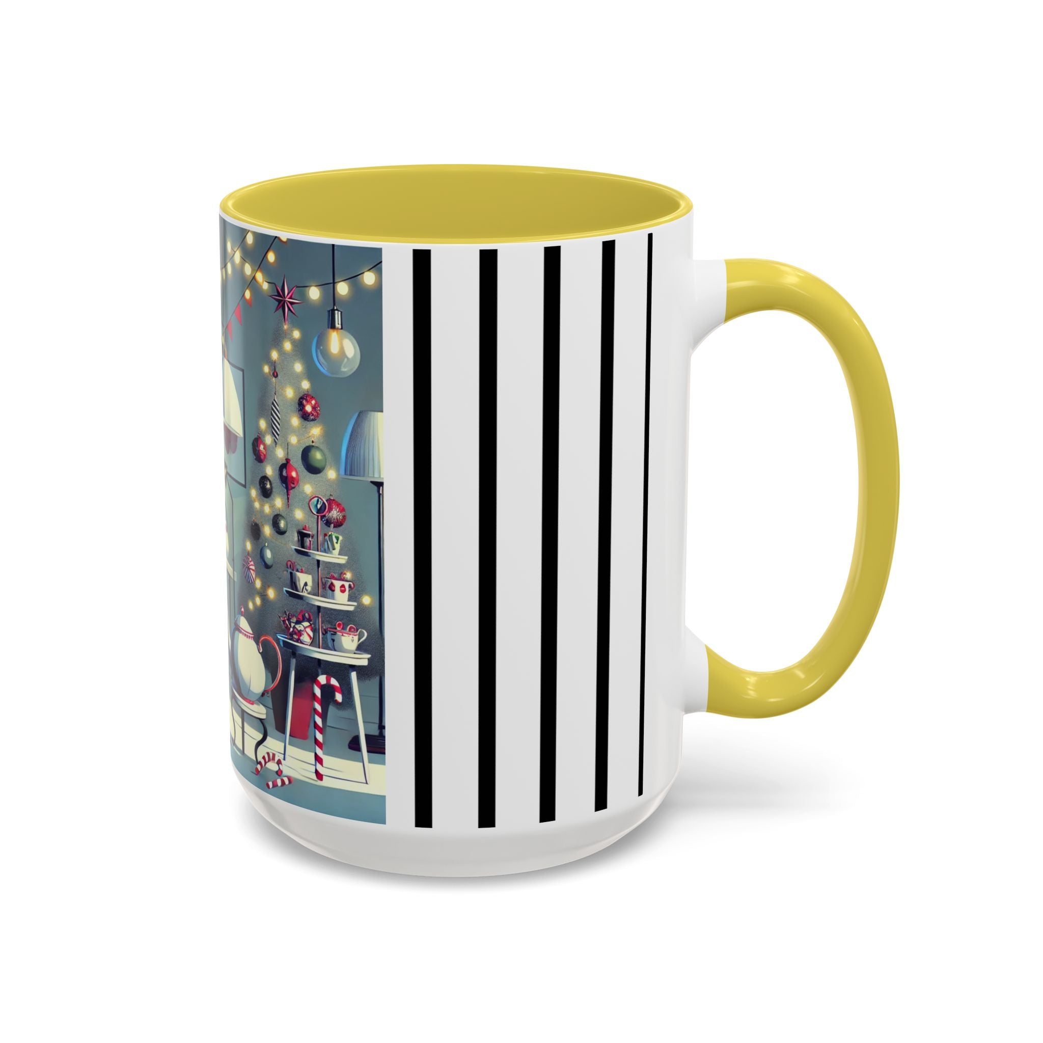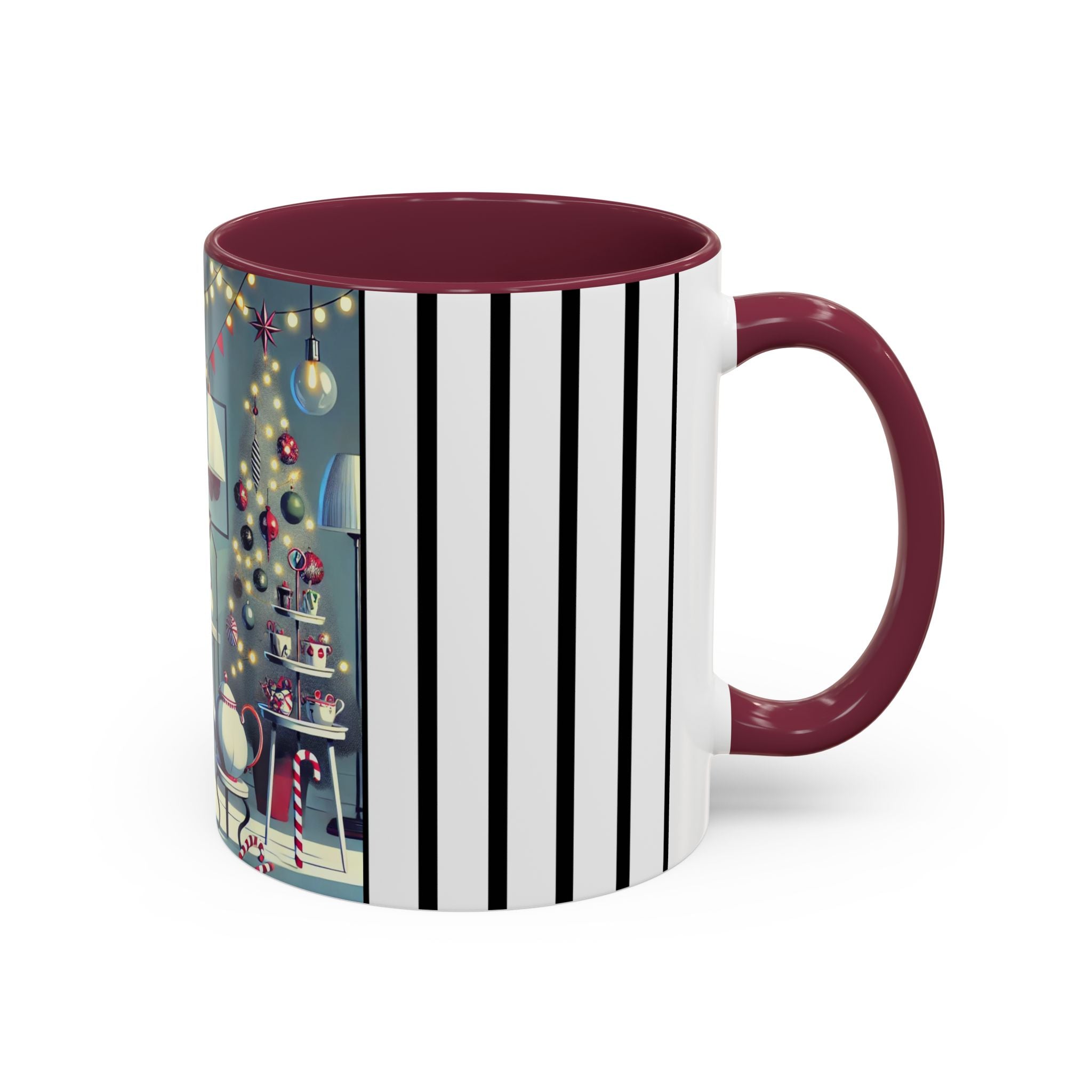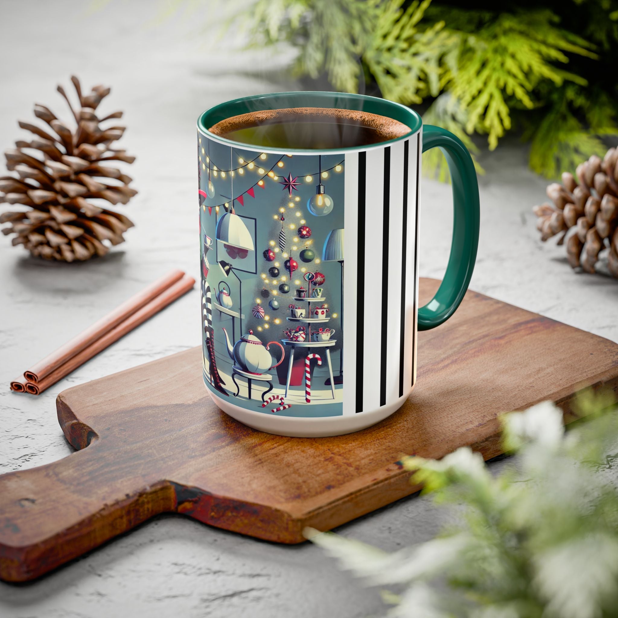 Every detail of the scene comes alive as you hold the cup in your hand—the sparkle of ornaments on the tree, the candy canes and ribbons tucked into the décor, and the inviting glow of a festive tea set. The glossy finish of the mug enhances the artwork’s radiance, ensuring each line and color shines through with warmth and cheer.