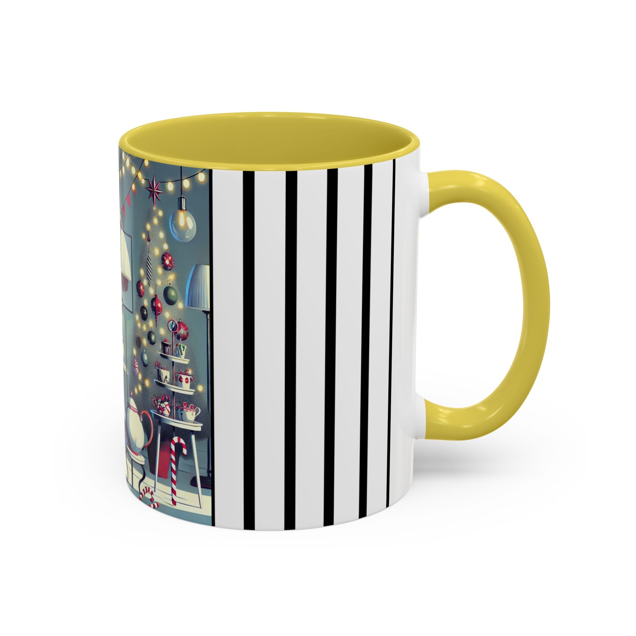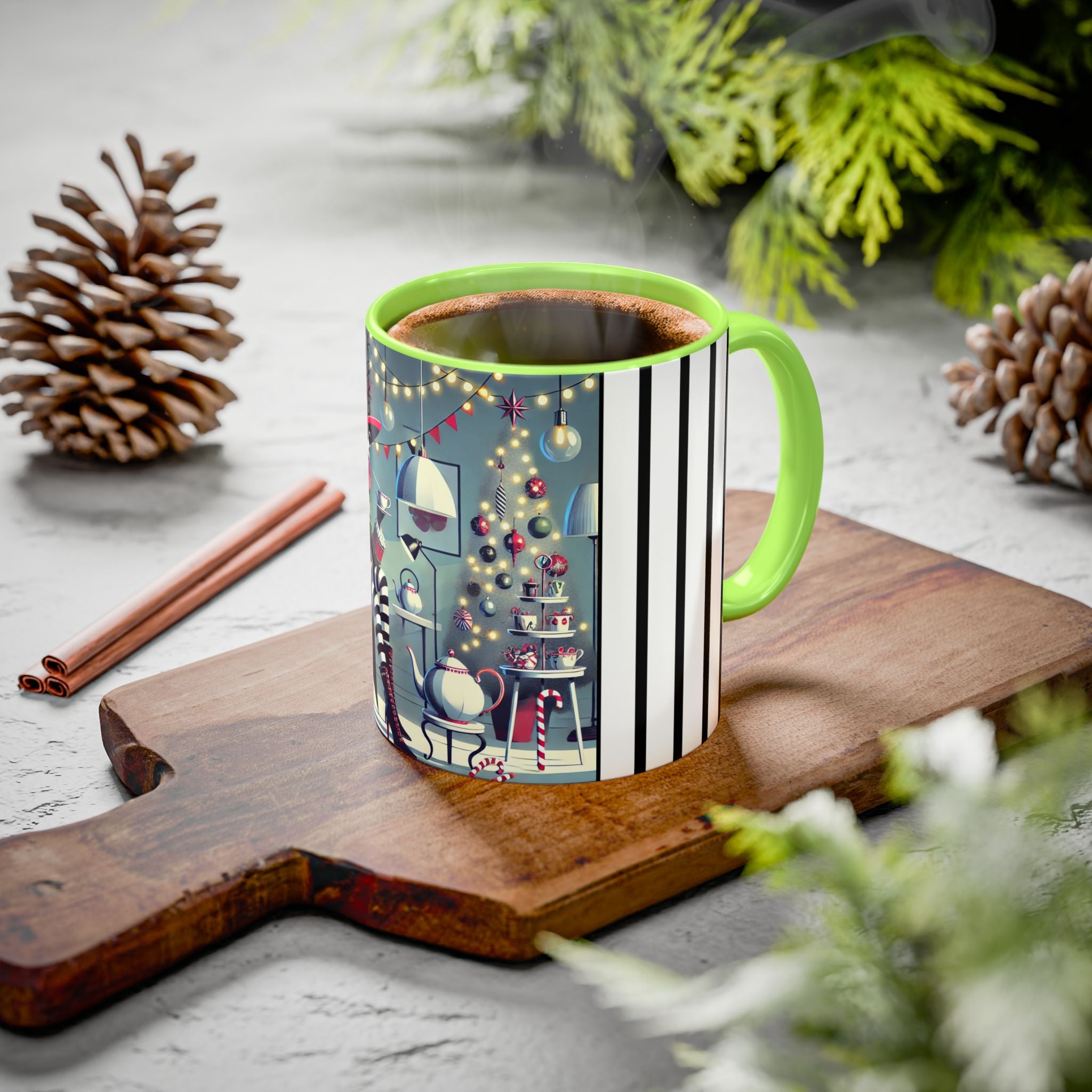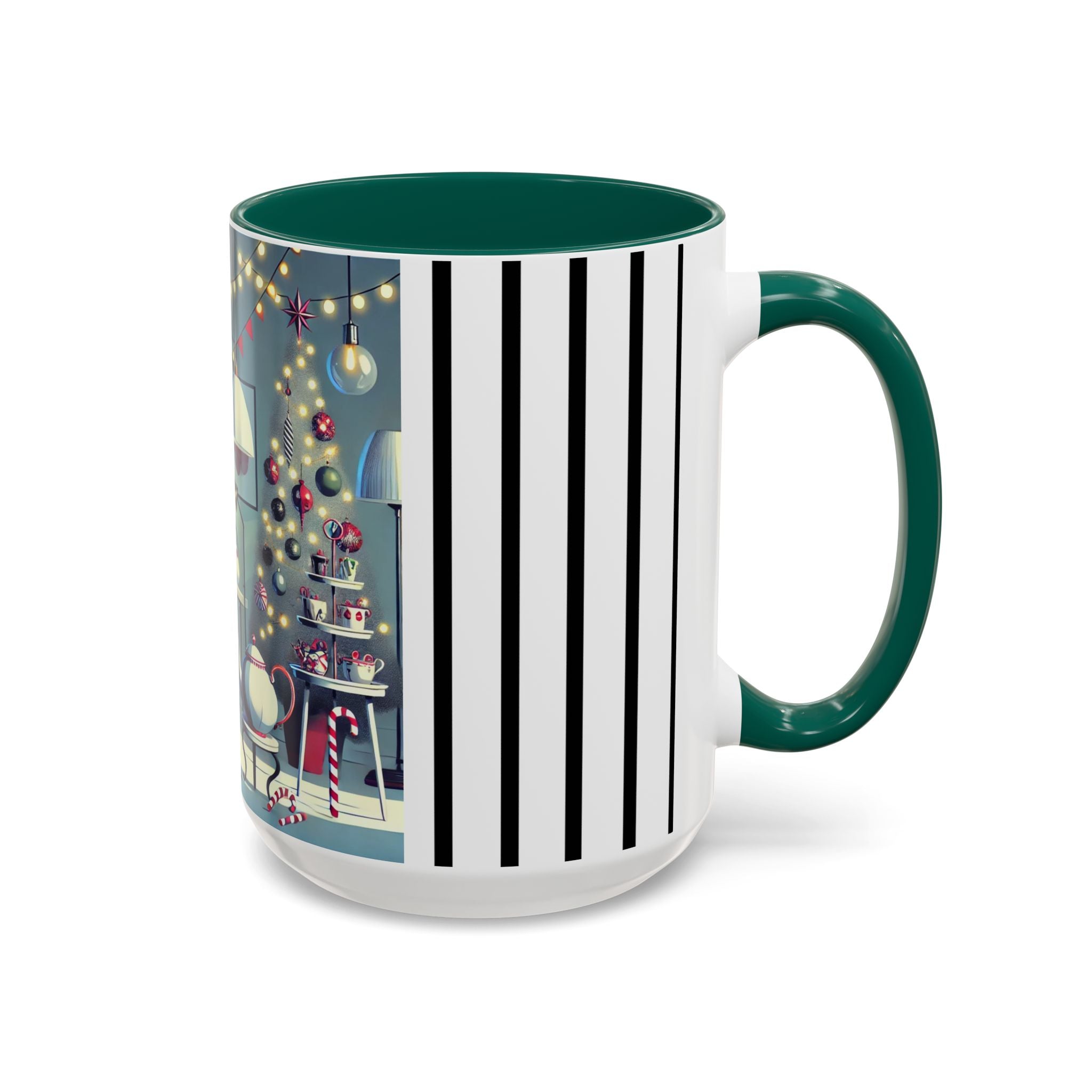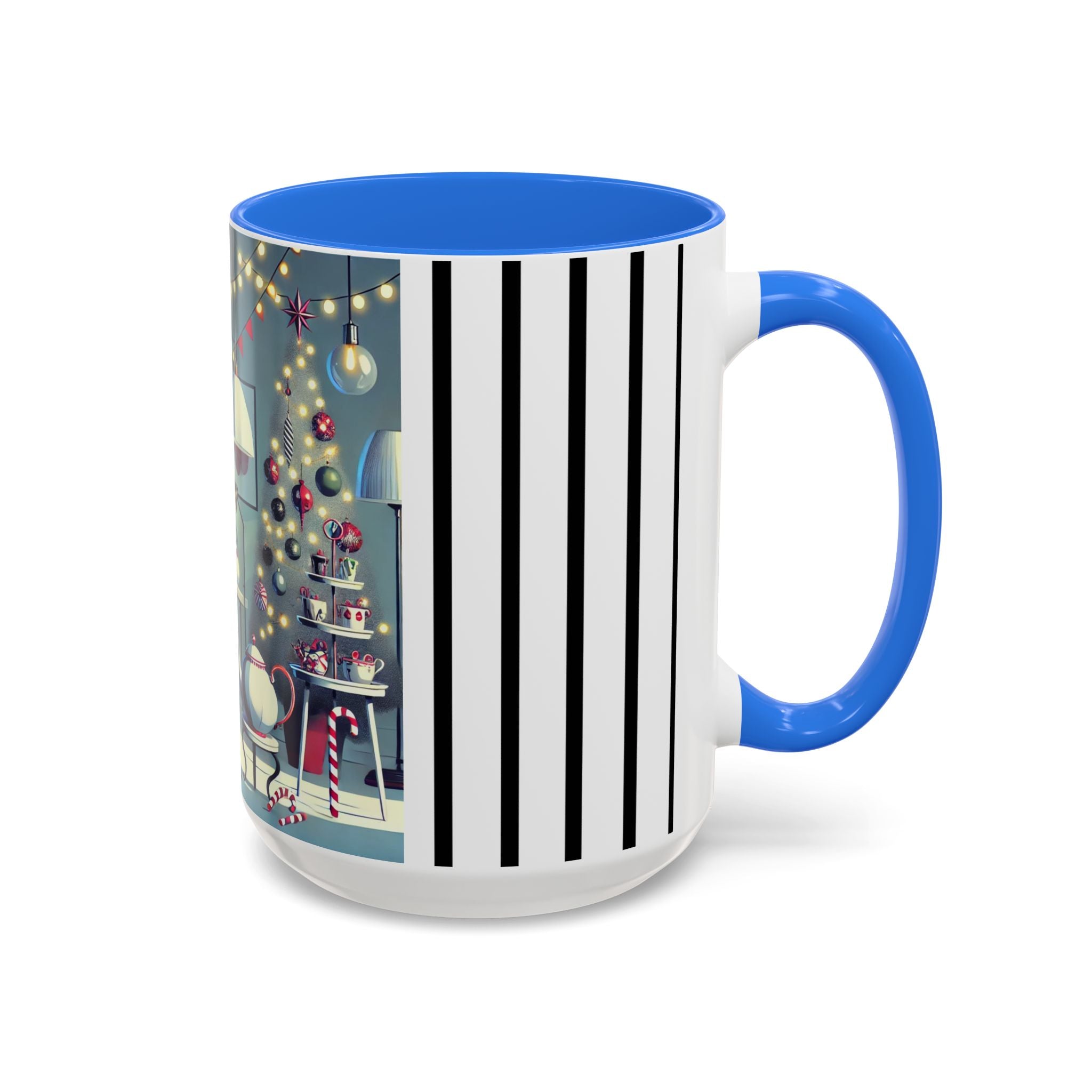 Every detail of the scene comes alive as you hold the cup in your hand—the sparkle of ornaments on the tree, the candy canes and ribbons tucked into the décor, and the inviting glow of a festive tea set. The glossy finish of the mug enhances the artwork’s radiance, ensuring each line and color shines through with warmth and cheer.