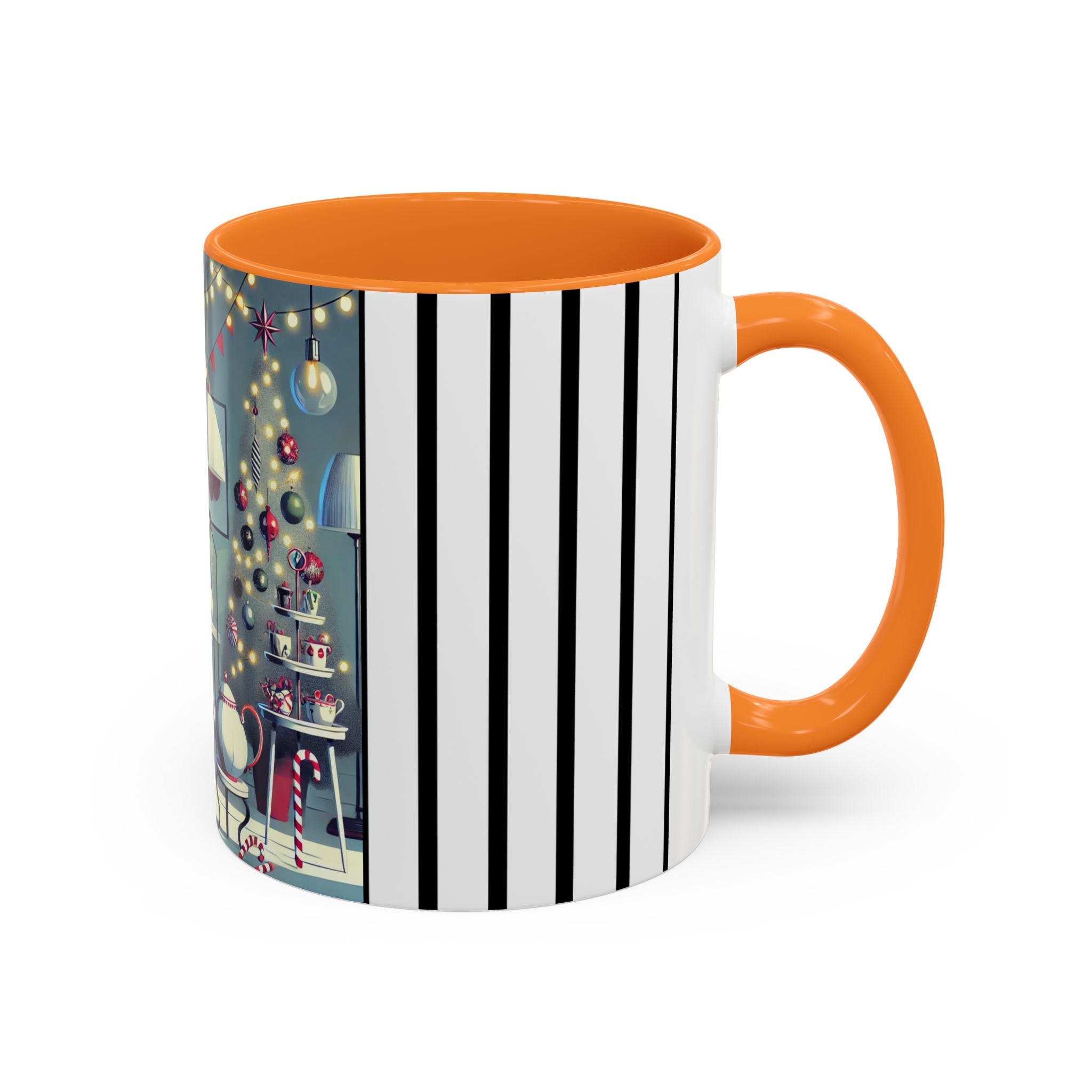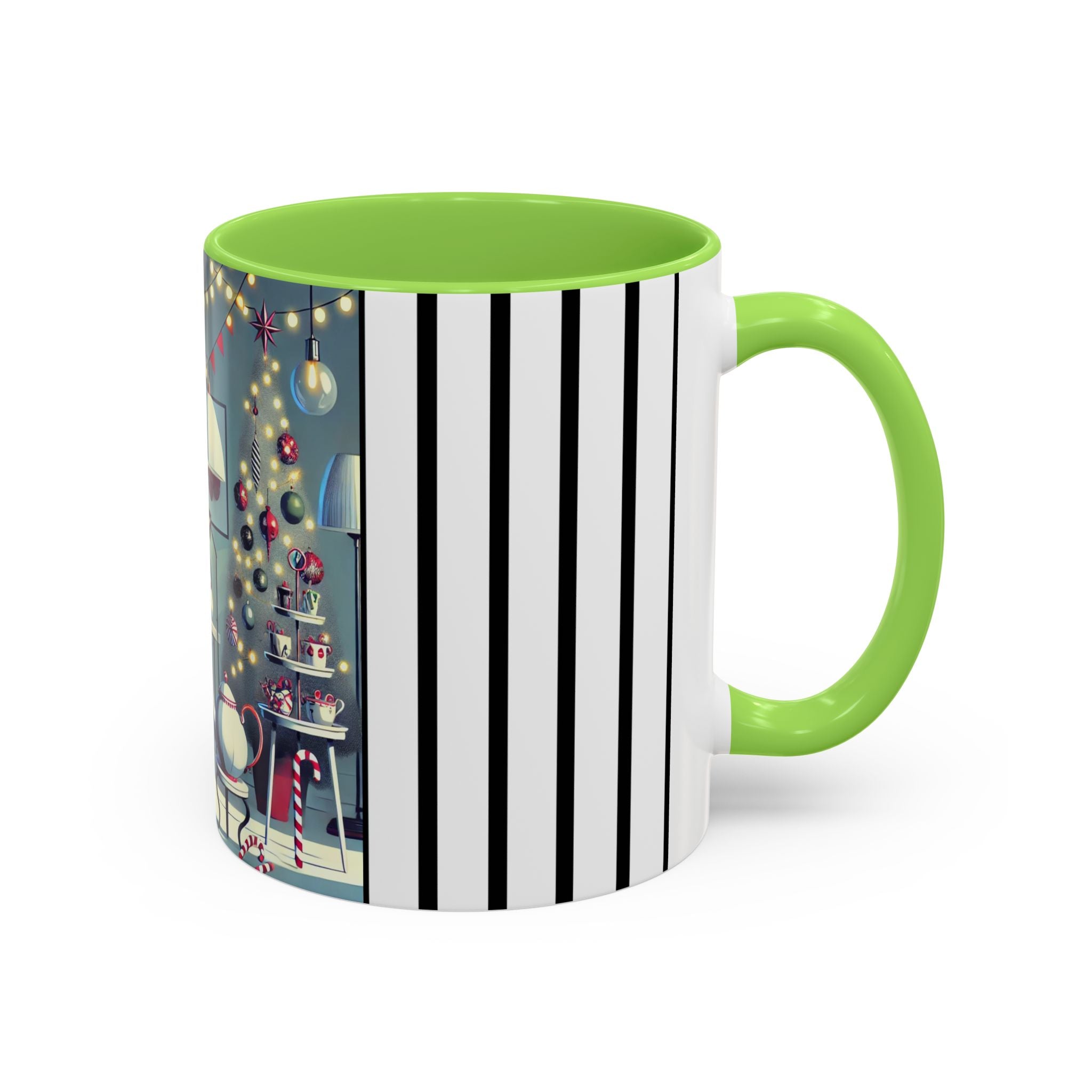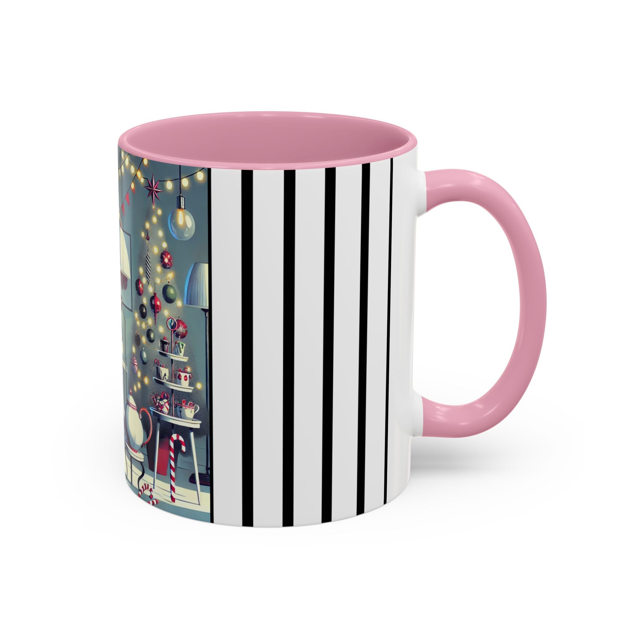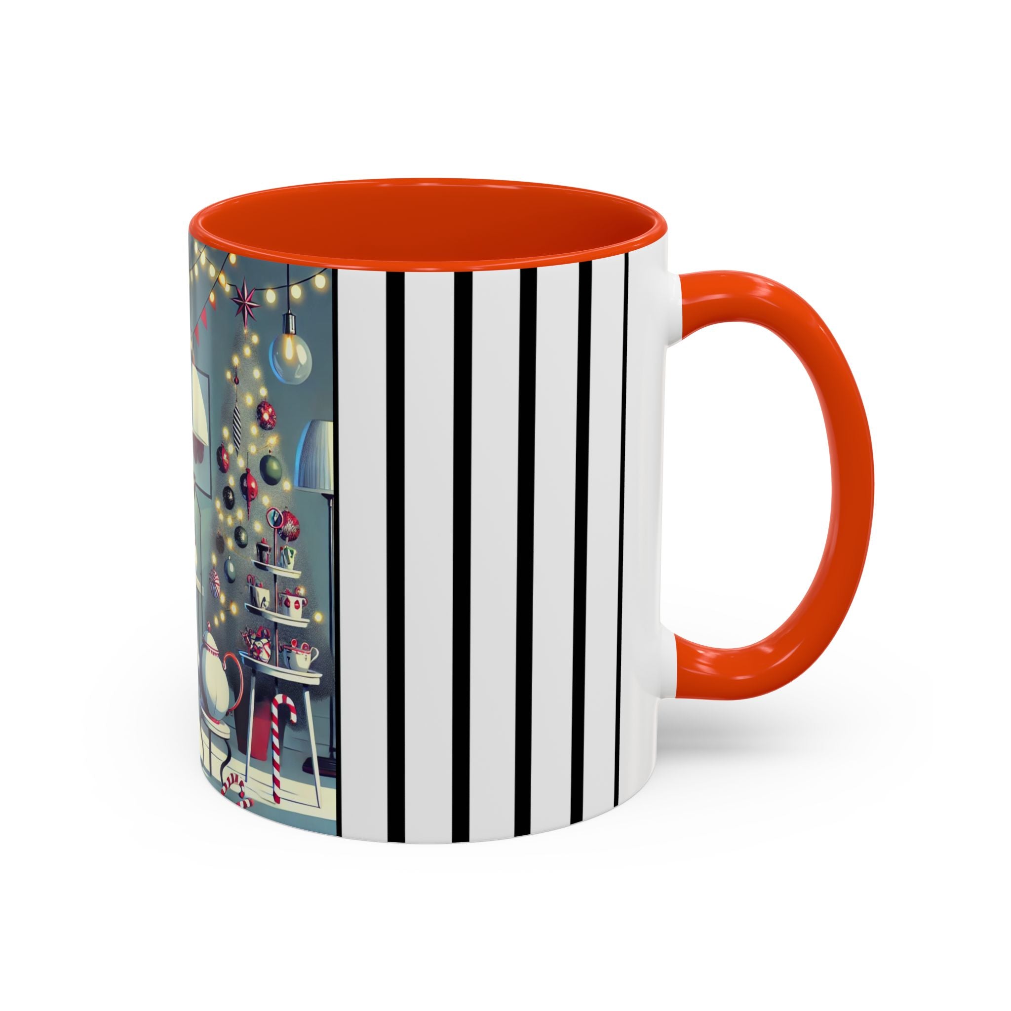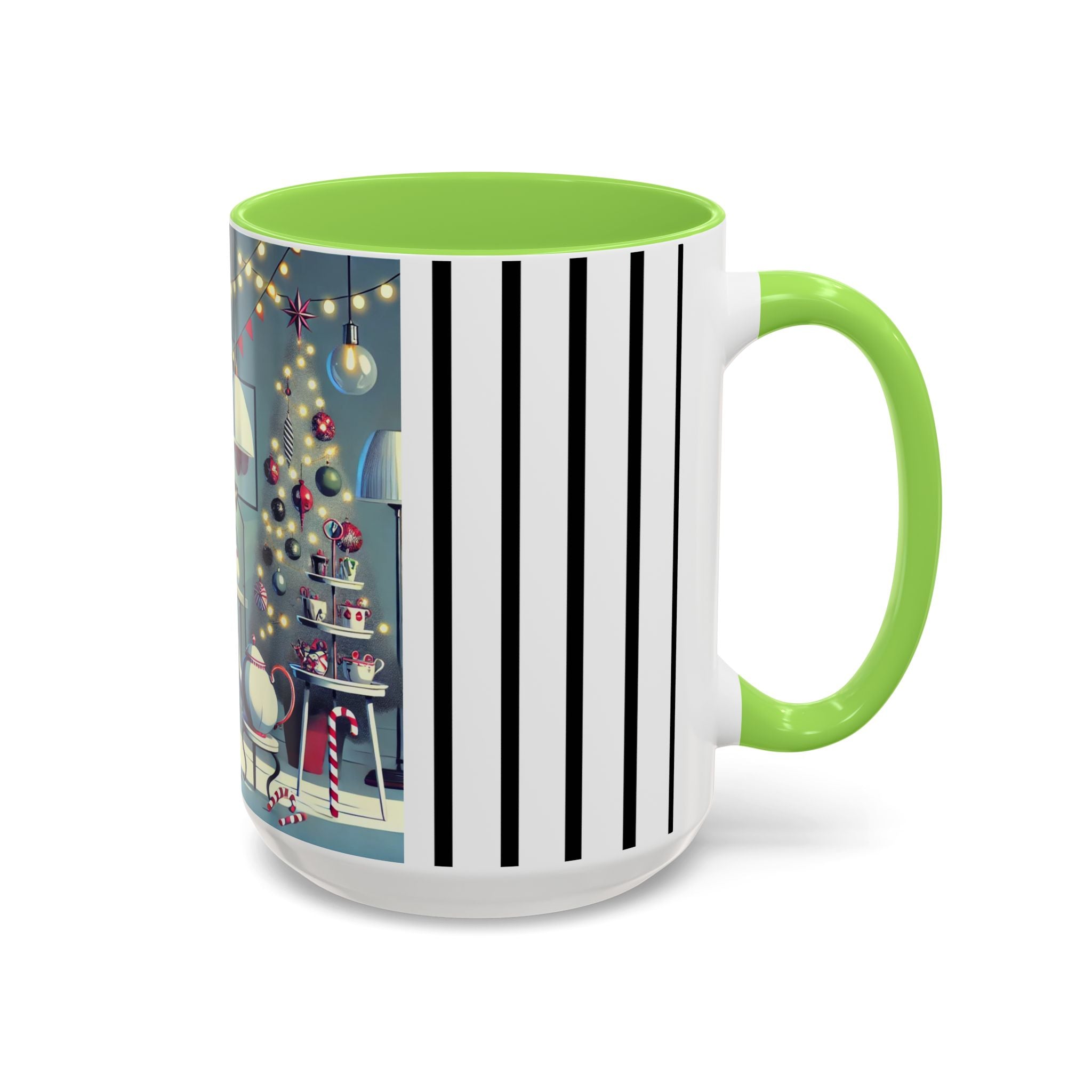 Every detail of the scene comes alive as you hold the cup in your hand—the sparkle of ornaments on the tree, the candy canes and ribbons tucked into the décor, and the inviting glow of a festive tea set. The glossy finish of the mug enhances the artwork’s radiance, ensuring each line and color shines through with warmth and cheer.