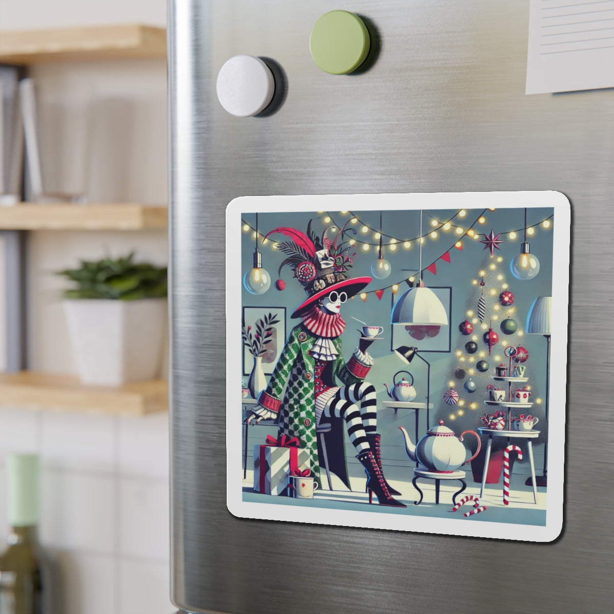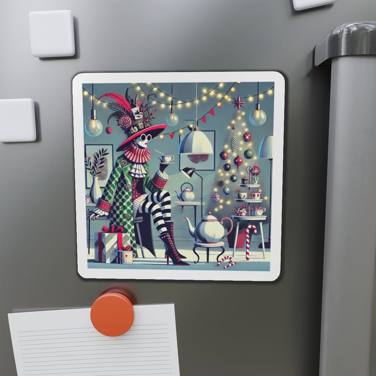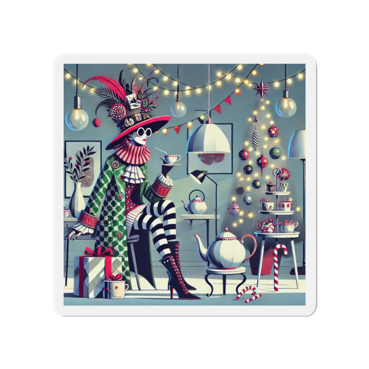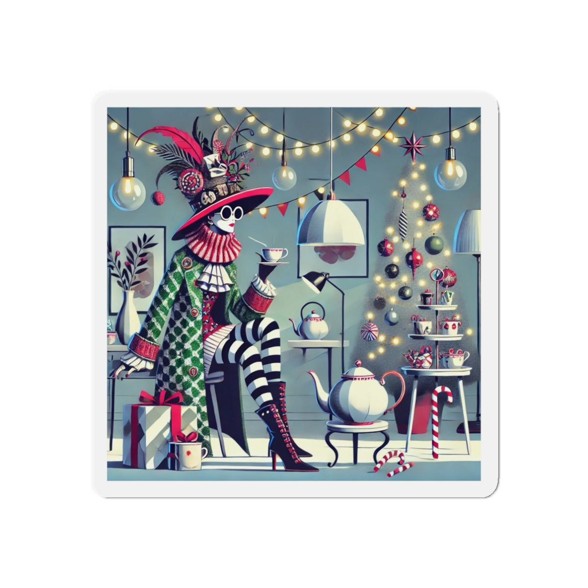 The artwork transforms each magnet into a miniature holiday scene. A chic lady in a lavish feathered hat and patterned coat pauses to sip tea beneath glowing string lights. Her striped stockings, high-heeled boots, and bold accessories create a fashionable, theatrical look that feels both playful and sophisticated.