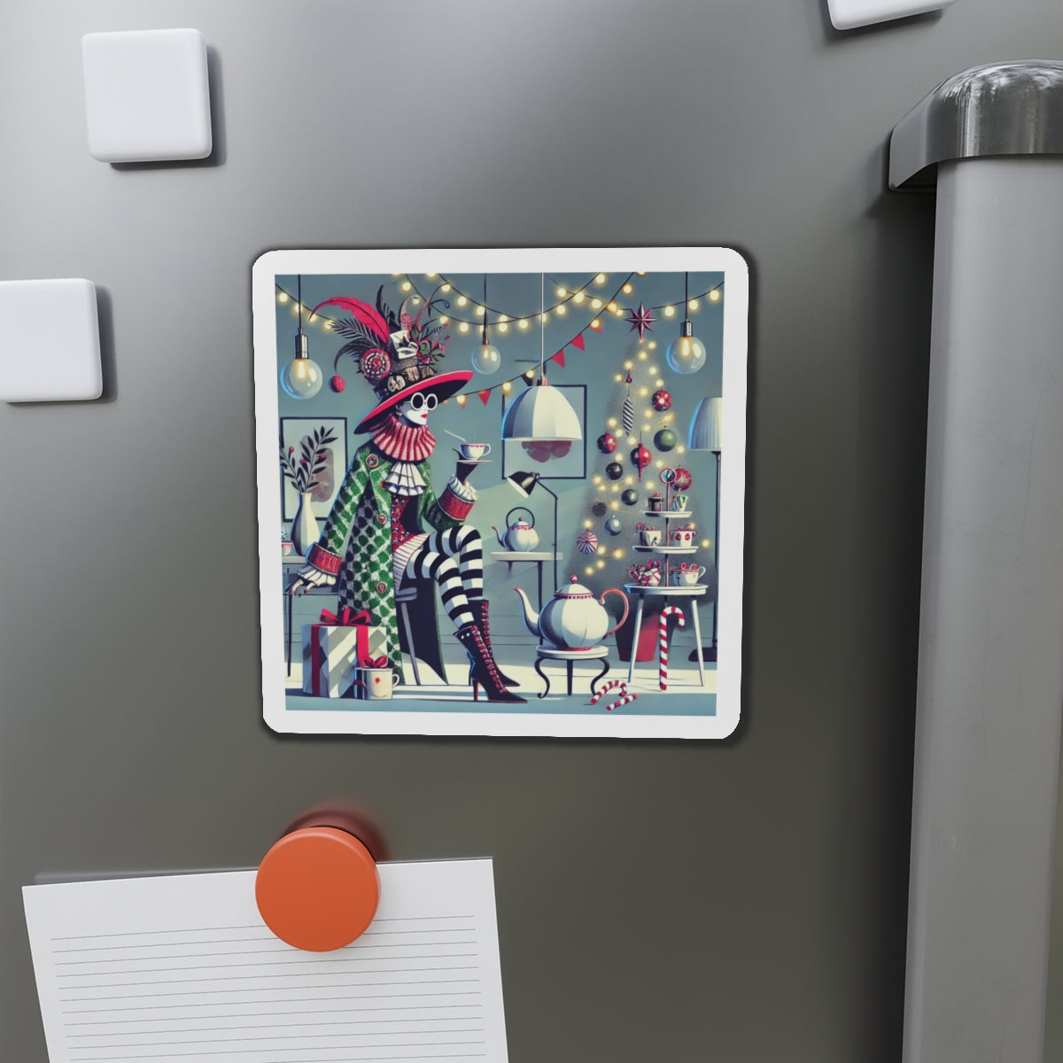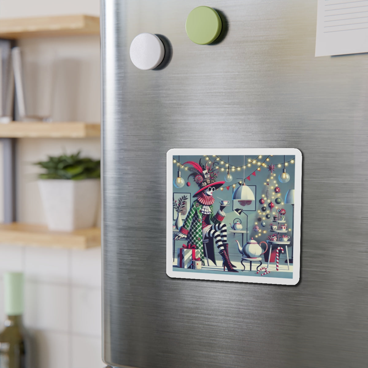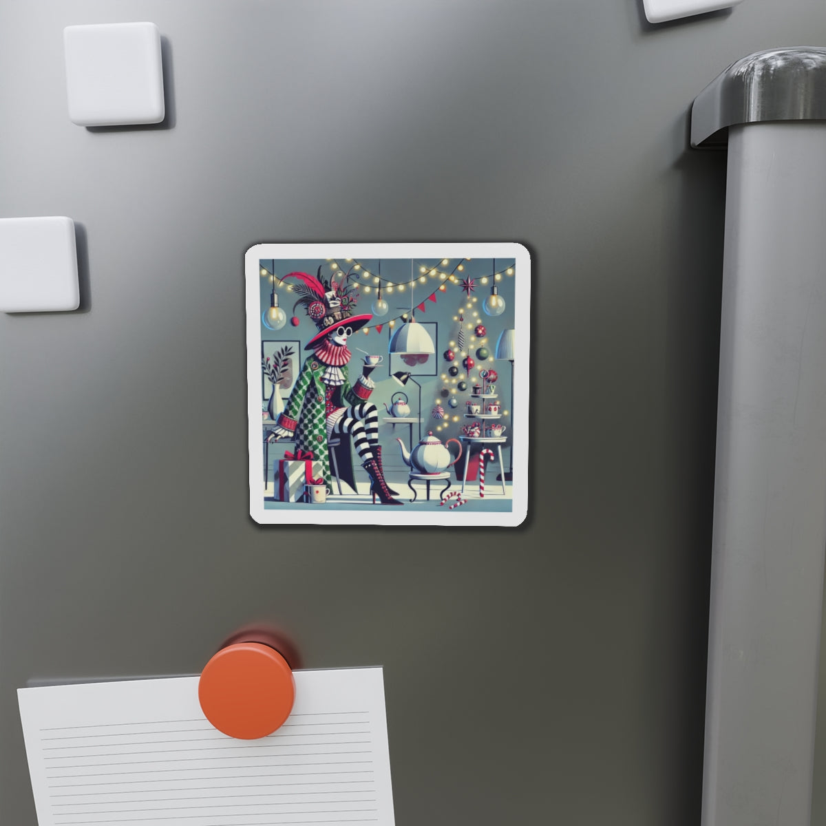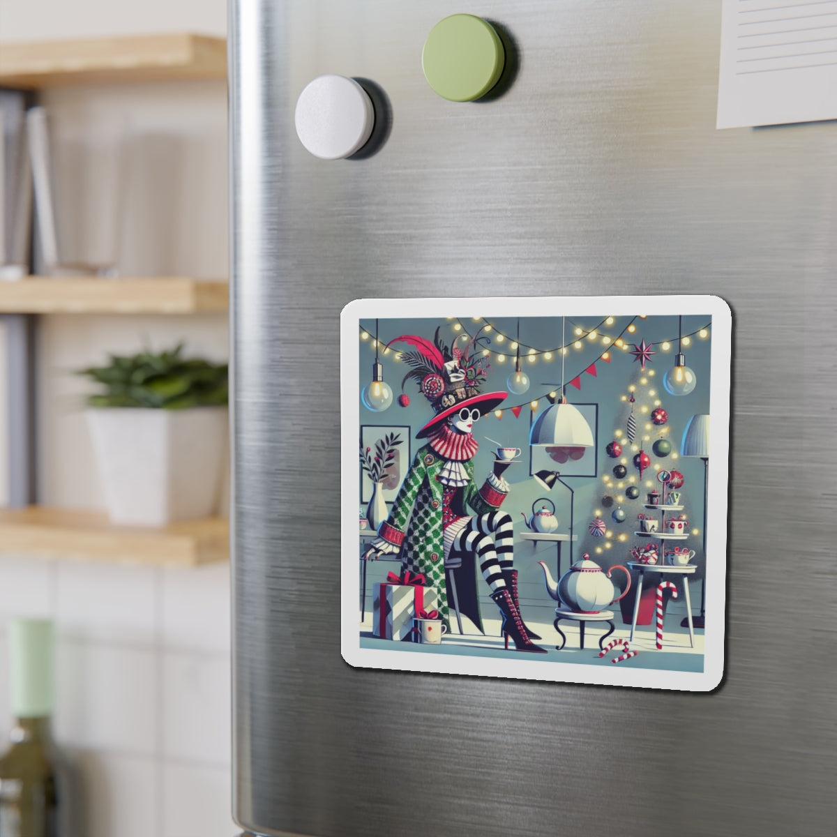 The artwork transforms each magnet into a miniature holiday scene. A chic lady in a lavish feathered hat and patterned coat pauses to sip tea beneath glowing string lights. Her striped stockings, high-heeled boots, and bold accessories create a fashionable, theatrical look that feels both playful and sophisticated.