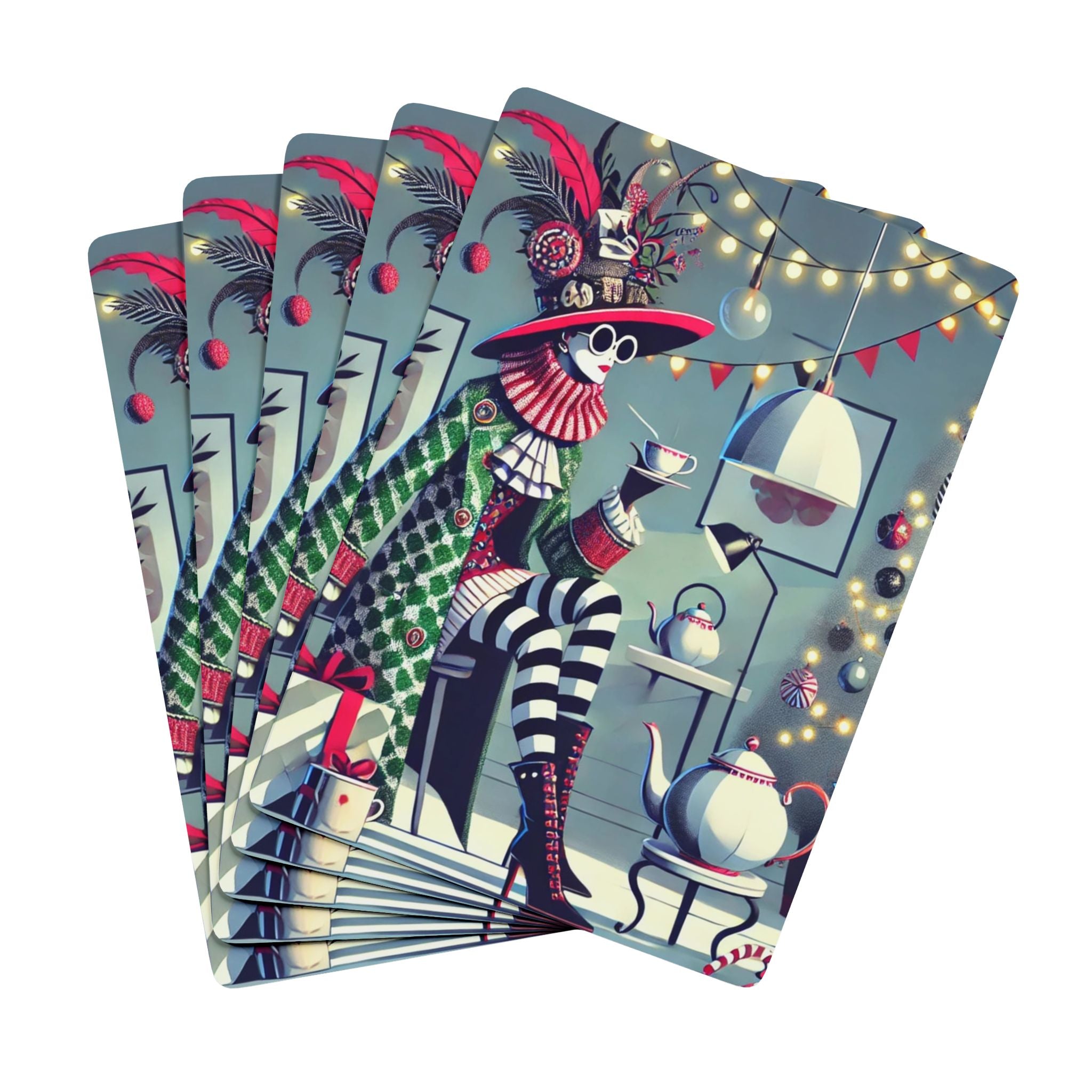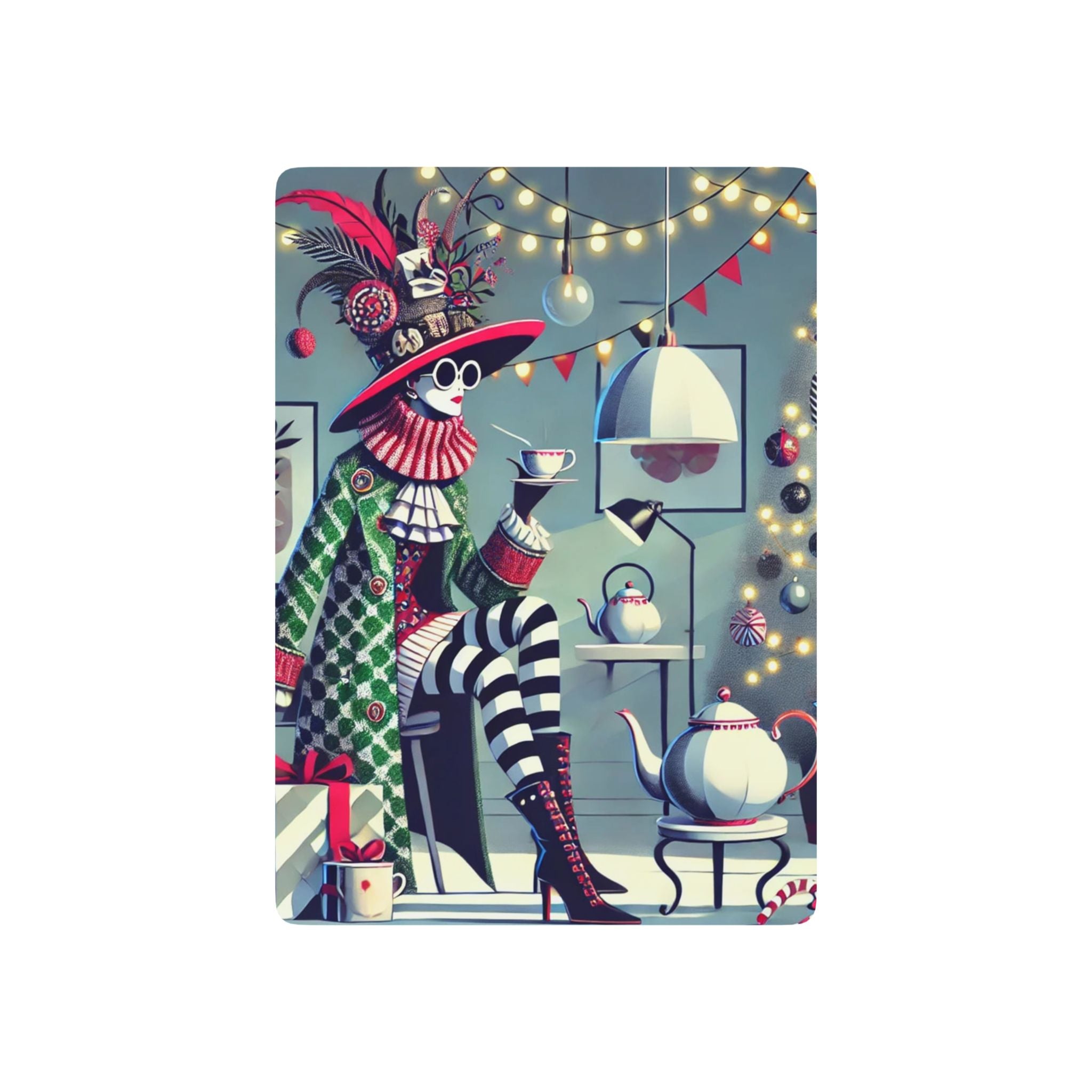 The artwork transforms this deck into something extraordinary. A chic lady in a lavish feathered hat and patterned coat takes a pause to sip her tea beneath glowing holiday lights. Her striped stockings, high-heeled boots, and bold accessories lend her a fashionable, theatrical flair that combines playful charm with modern sophistication.