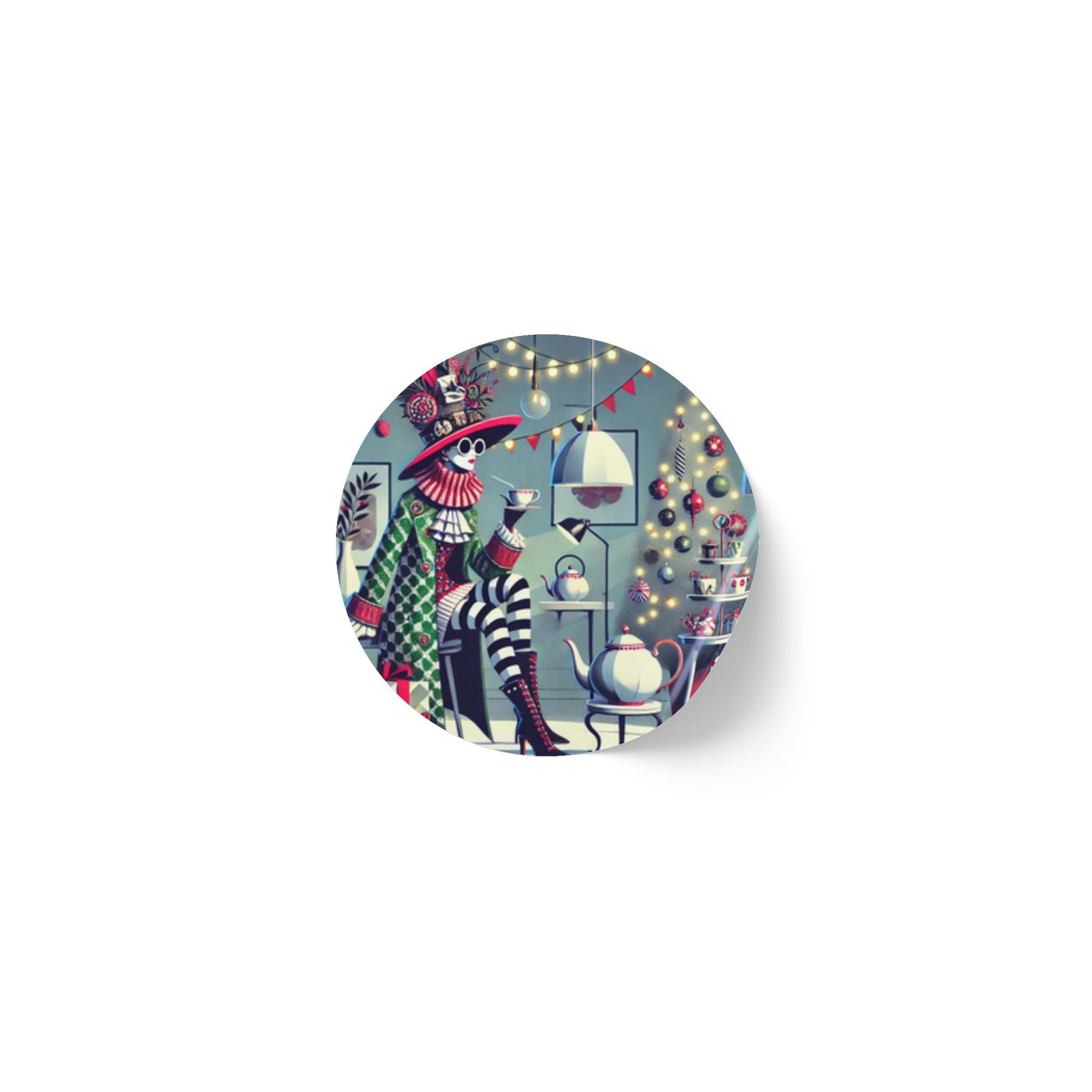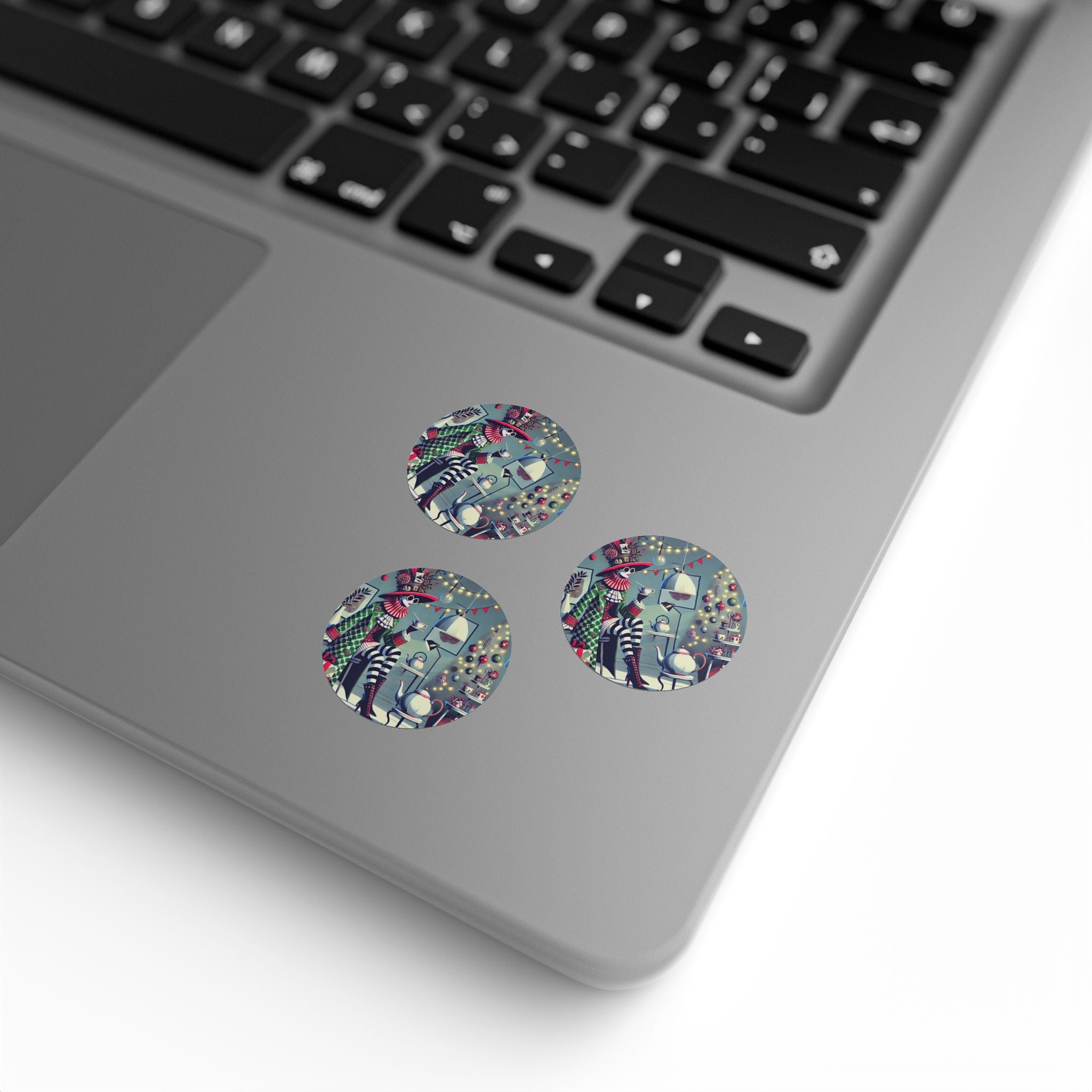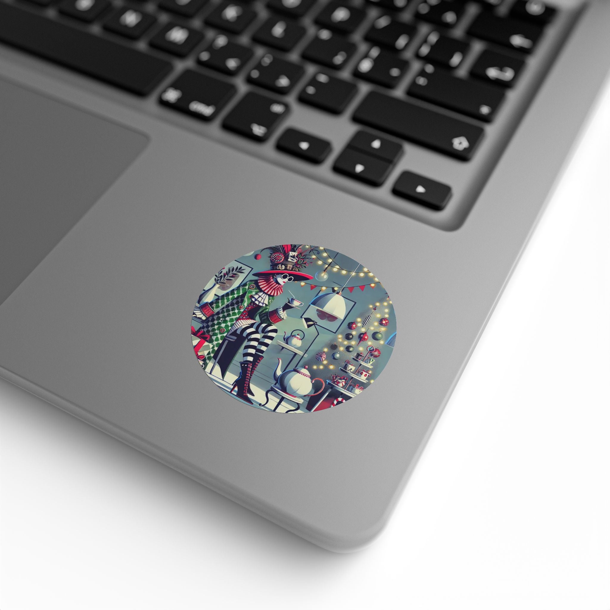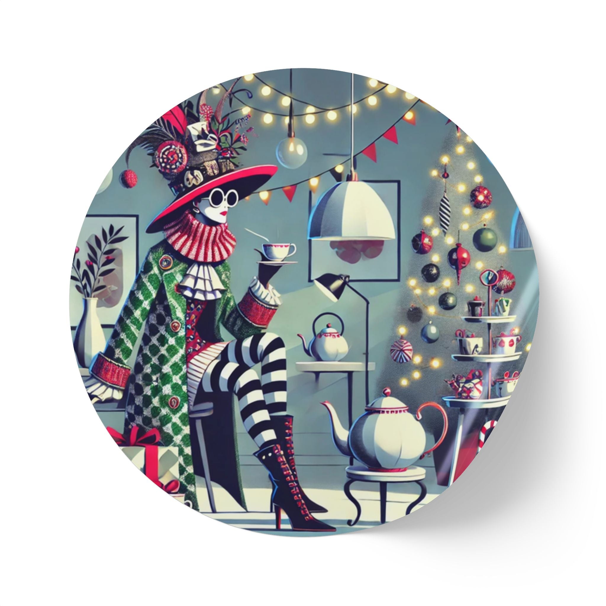 The artwork transforms each sticker into a whimsical holiday scene. A chic lady in a lavish feathered hat and patterned coat pauses to sip tea beneath glowing string lights. Her striped stockings, high-heeled boots, and bold accessories bring a fashionable, theatrical energy that blends modern elegance with playful charm.