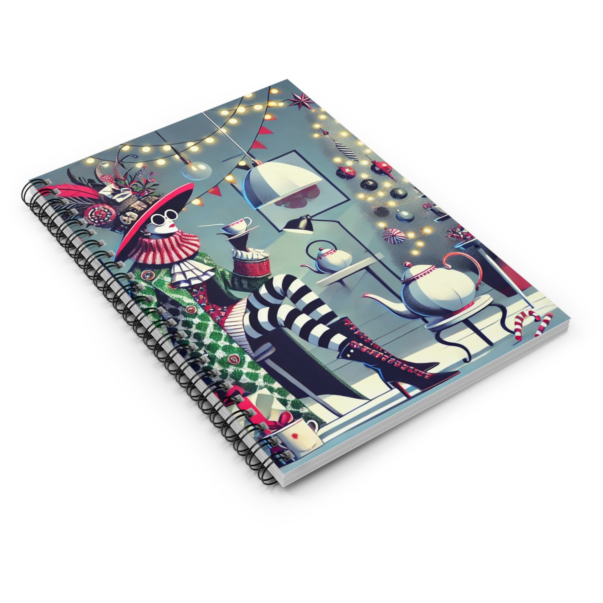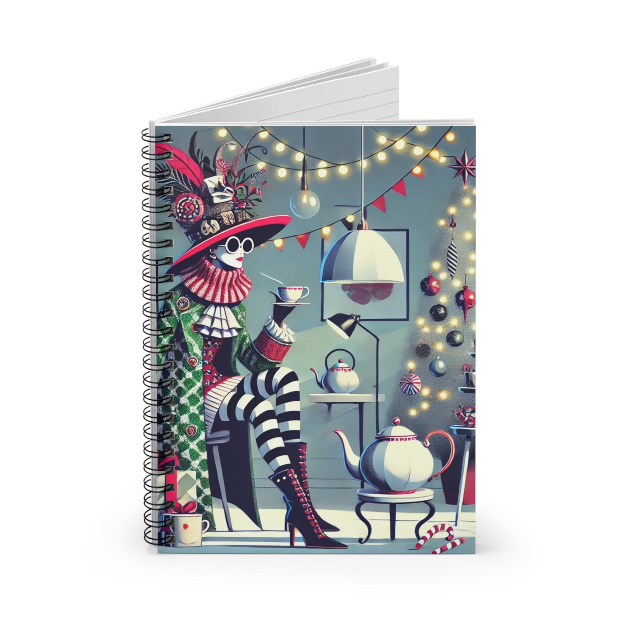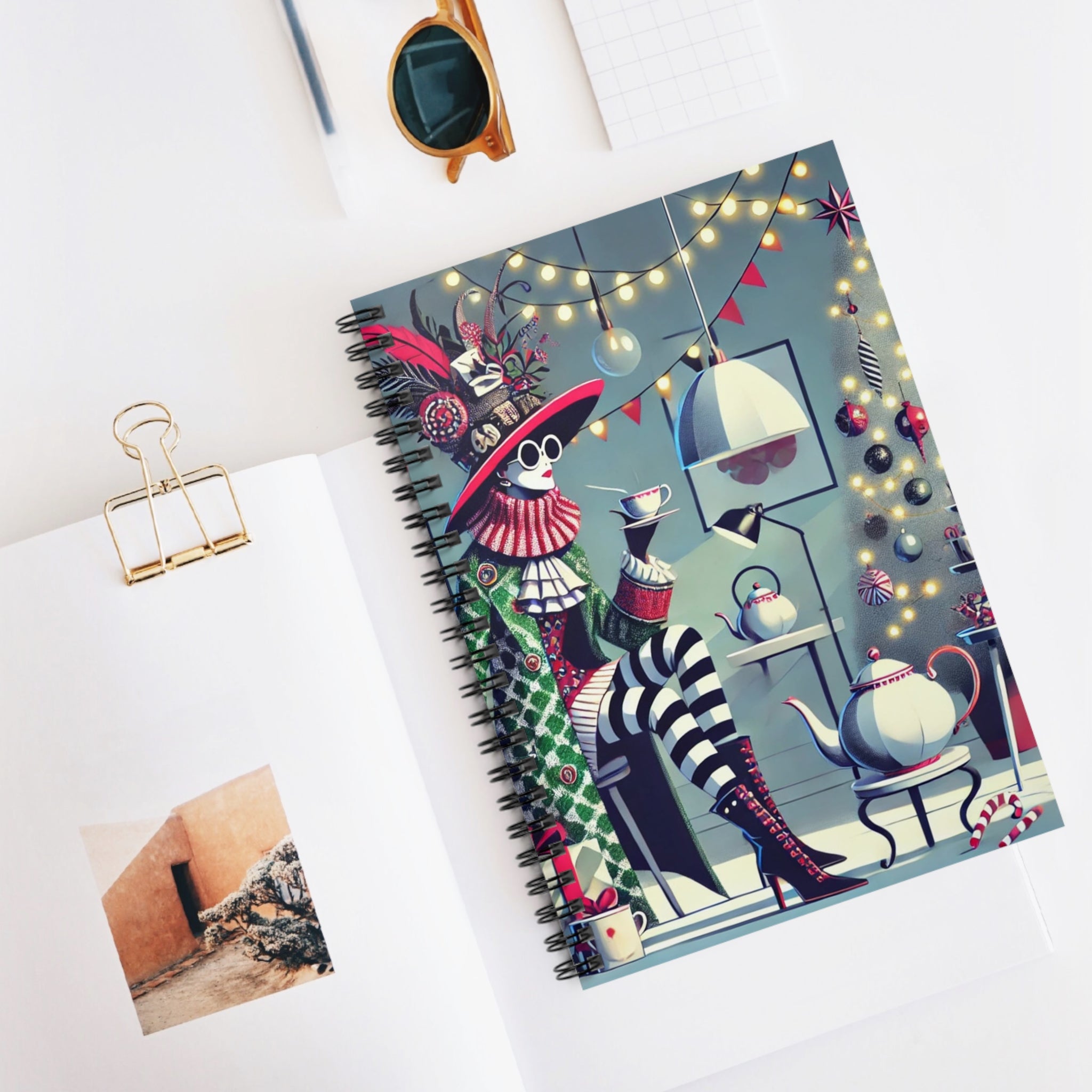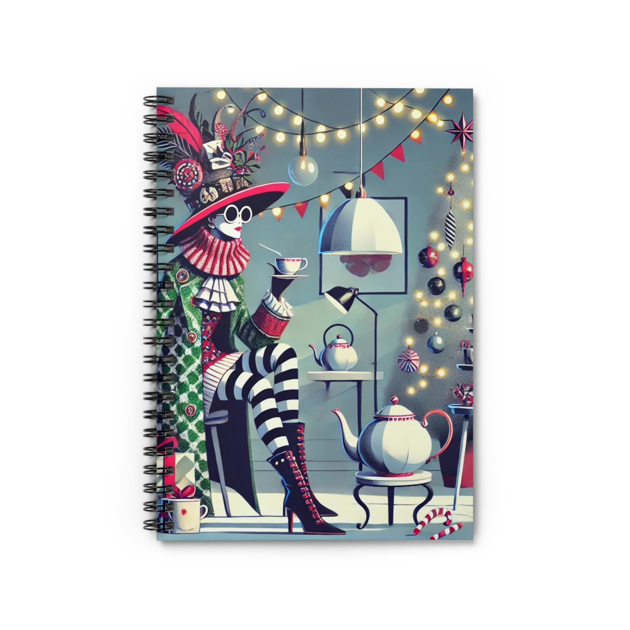 The cover artwork transforms this notebook into something magical. A chic lady in a lavish feathered hat and patterned coat pauses for a moment of indulgence, sipping tea beneath the soft glow of holiday string lights. Her striped stockings, high-heeled boots, and bold accessories add a theatrical flair, striking a balance between elegance and playful whimsy.
