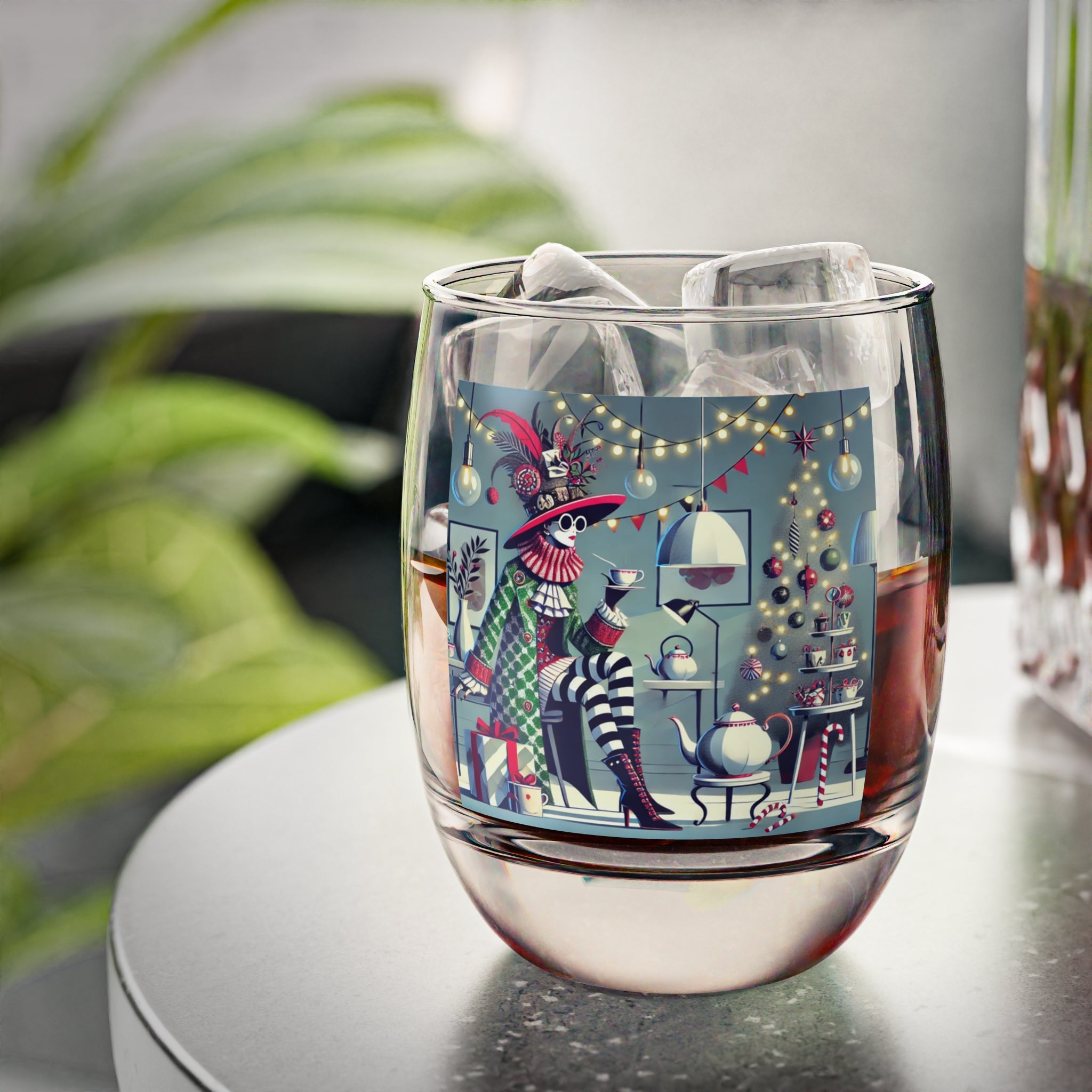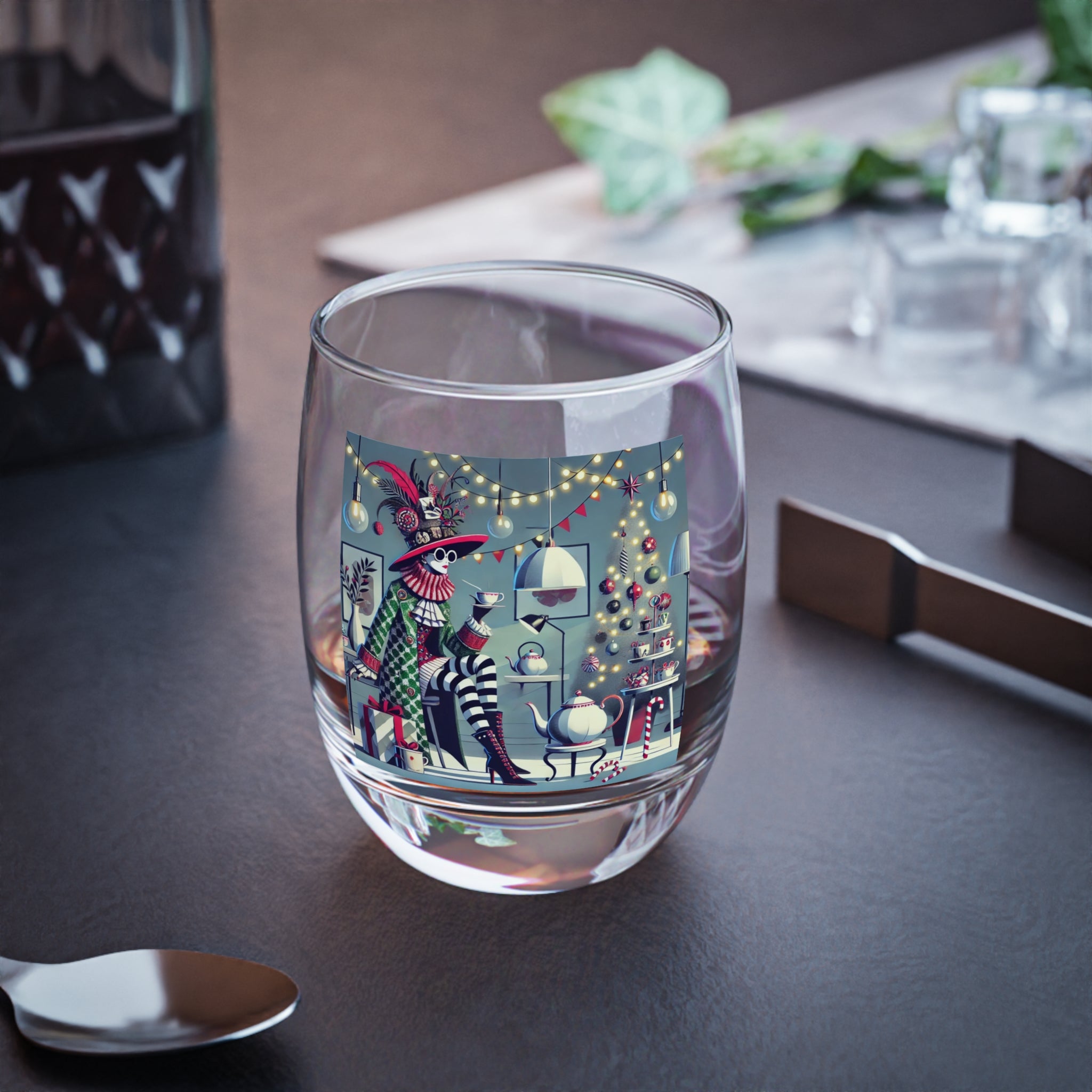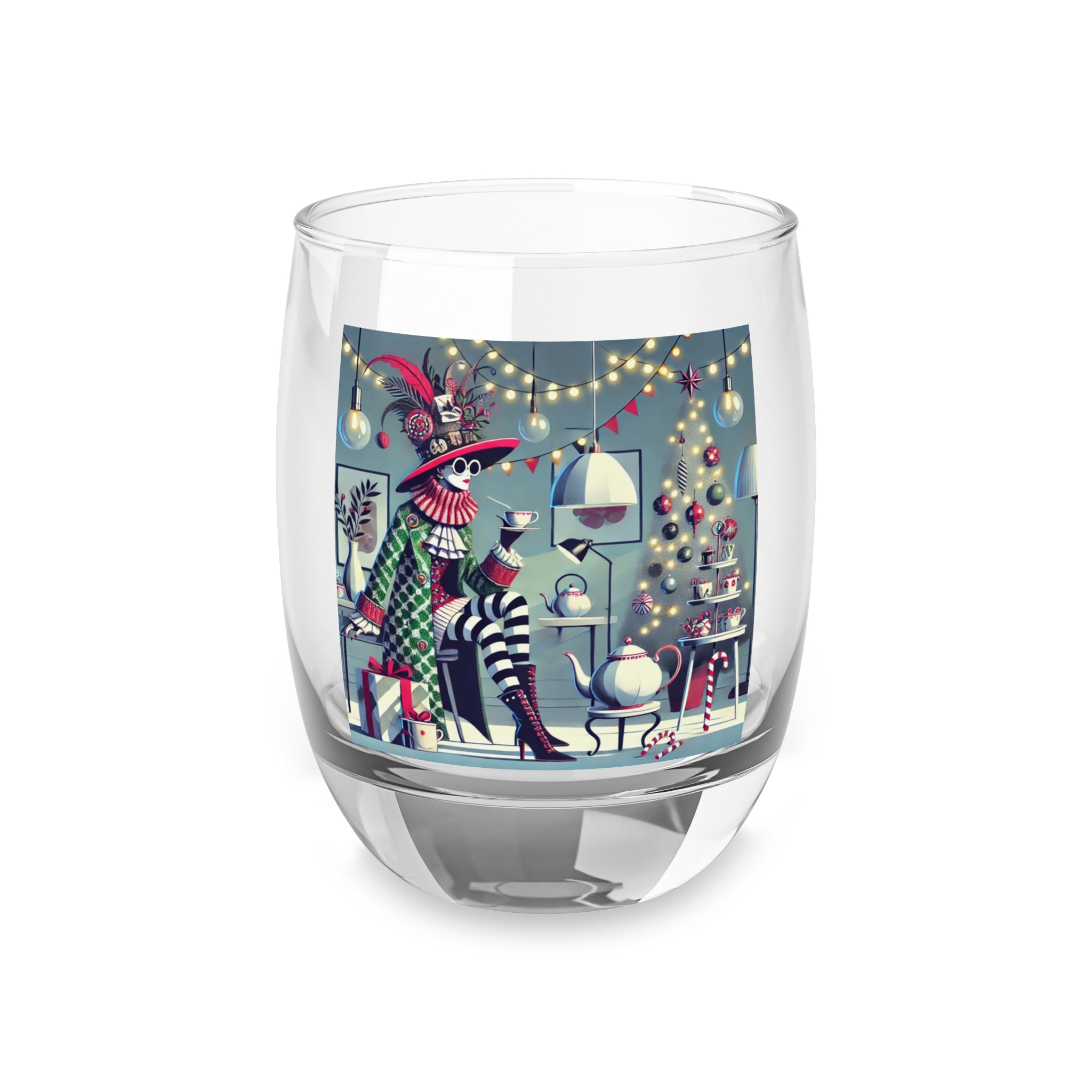 Every sip is infused with the magic of the season. Christmas ornaments shimmer in the background, candy canes and ribbons accent the décor, and a glowing tea set radiates warmth and joy. The glossy finish of the glass enhances the artwork’s vibrant colors, turning this whiskey glass into more than drinkware—it’s a statement piece of holiday celebration.