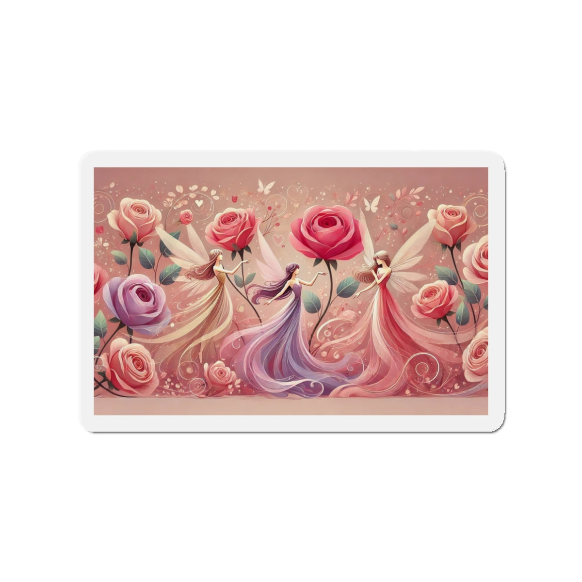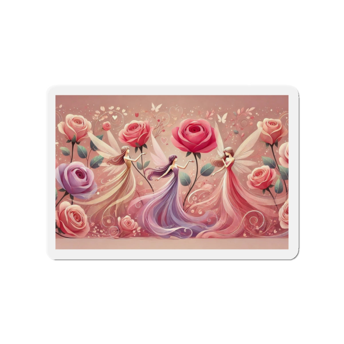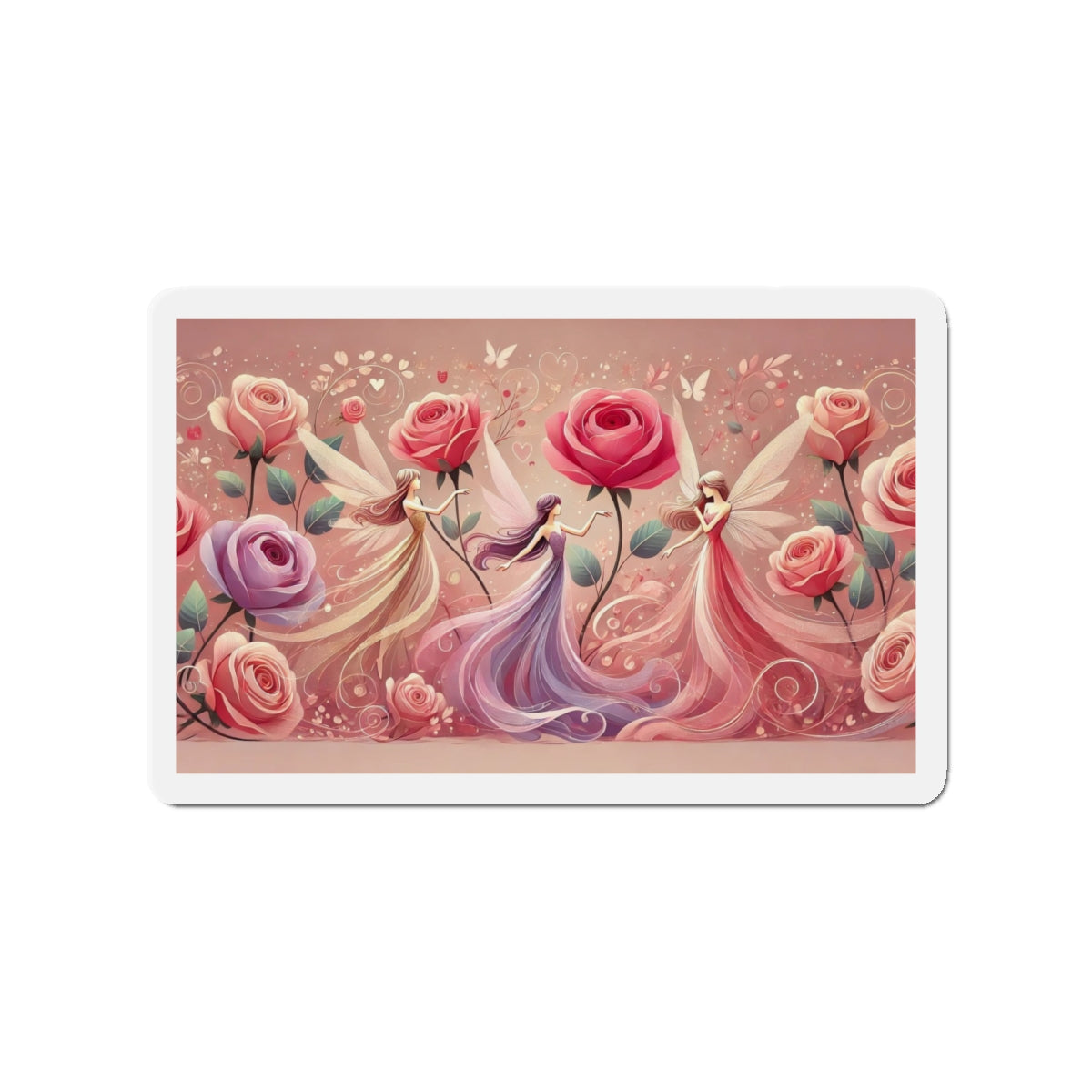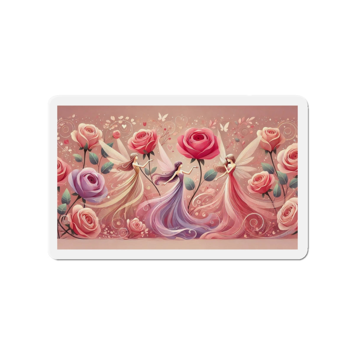 Add a touch of magic to any space with Whimsical Fairies Die-Cut Magnets. These flexible and durable magnets feature an enchanting scene of three elegant fairies in flowing blush pink, lavender, and pale gold gowns. Their delicate wings glisten as they interact with oversized, blooming red and pink peonies, surrounded by whimsical vine-like greenery. The dreamy gradient background, adorned with heart-shaped patterns and sparkles, completes this romantic Valentine's Day design.