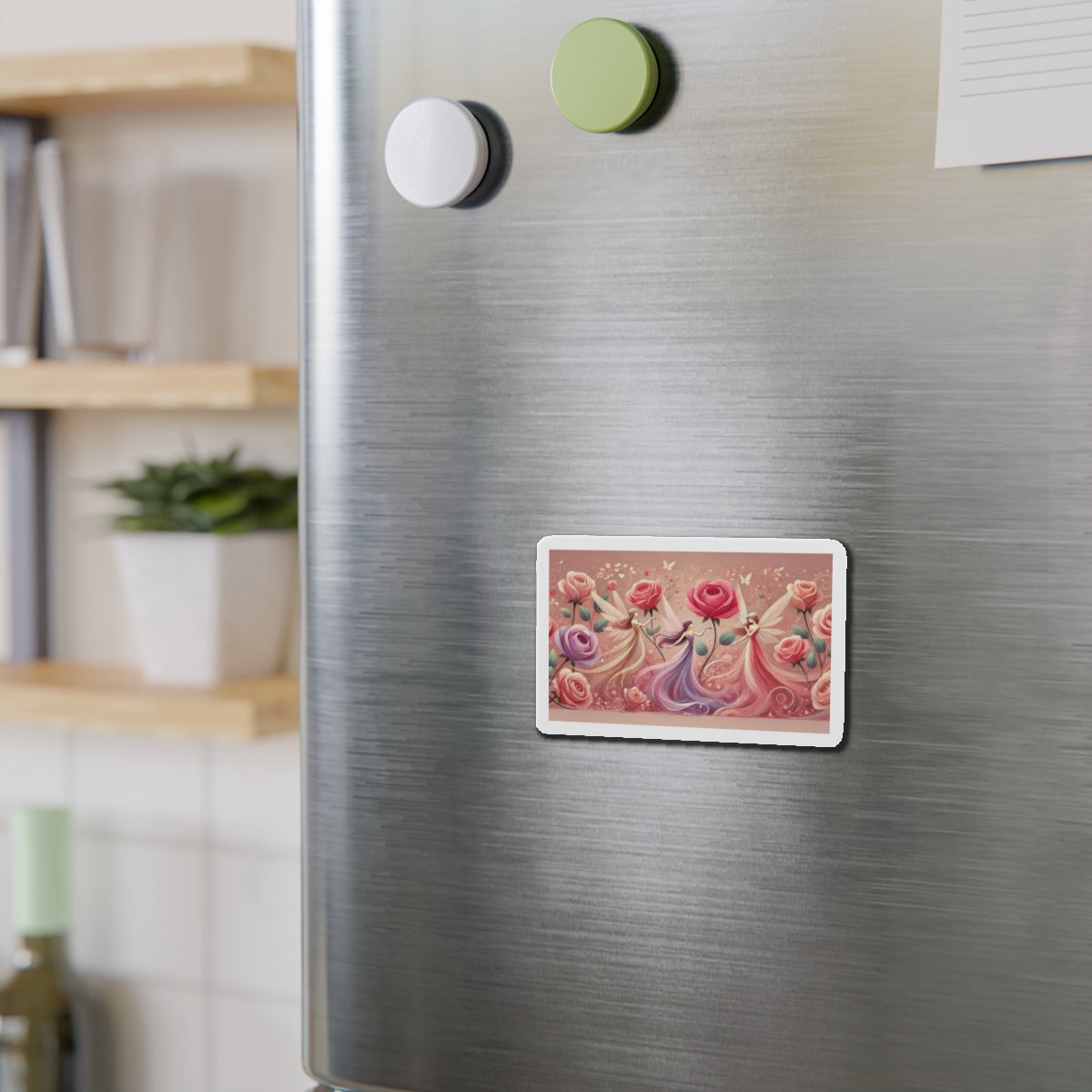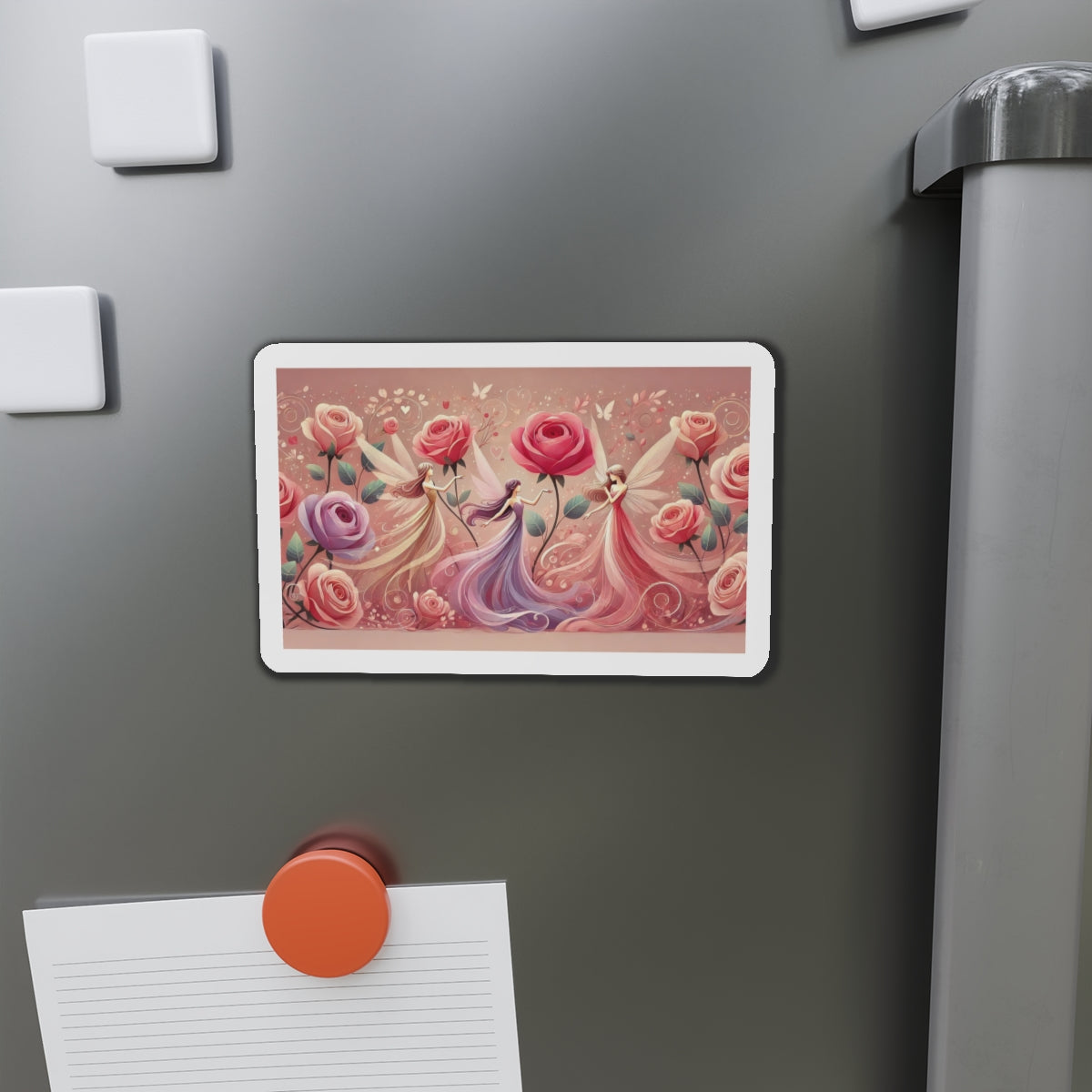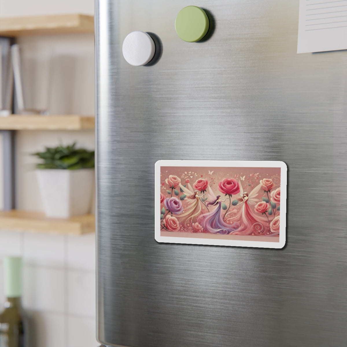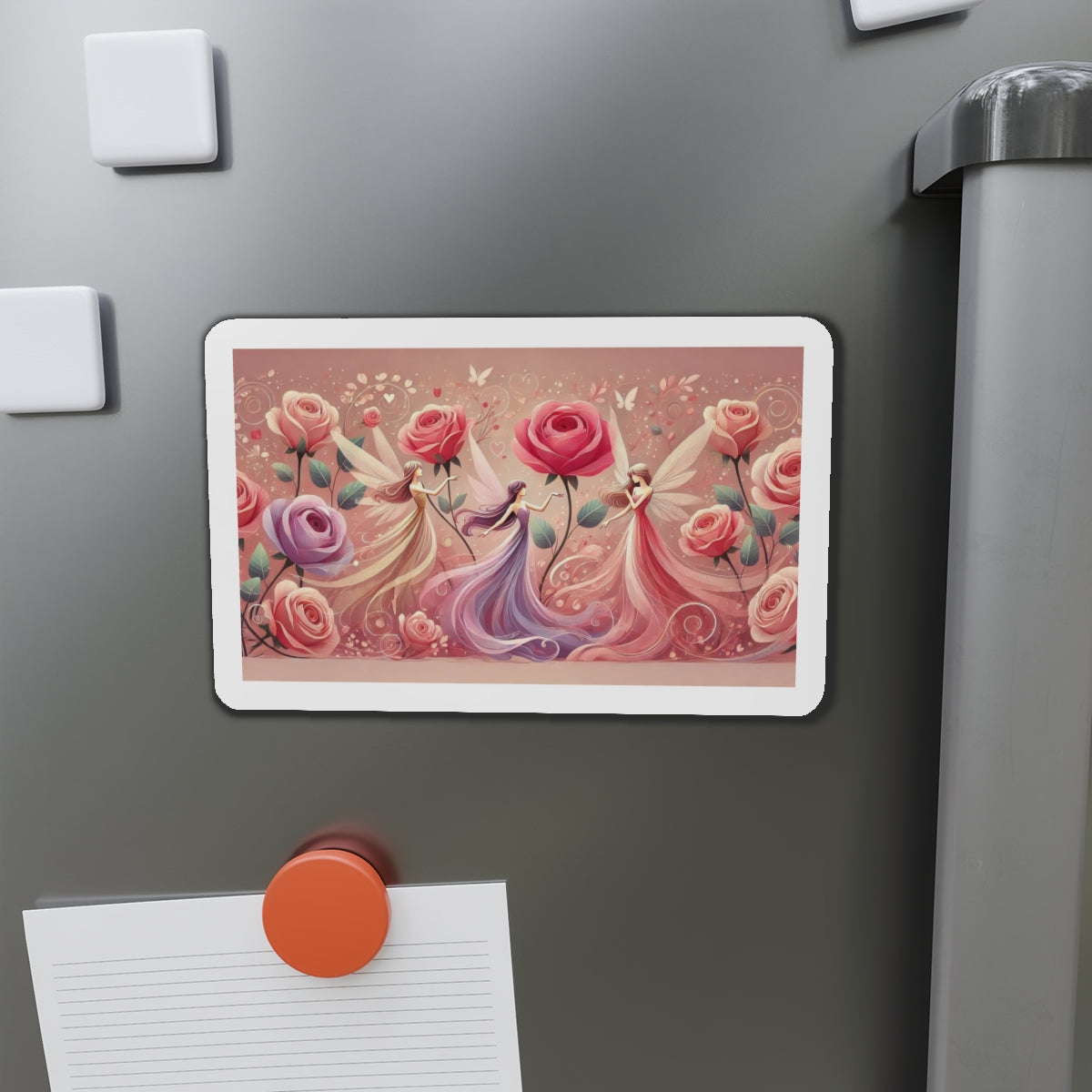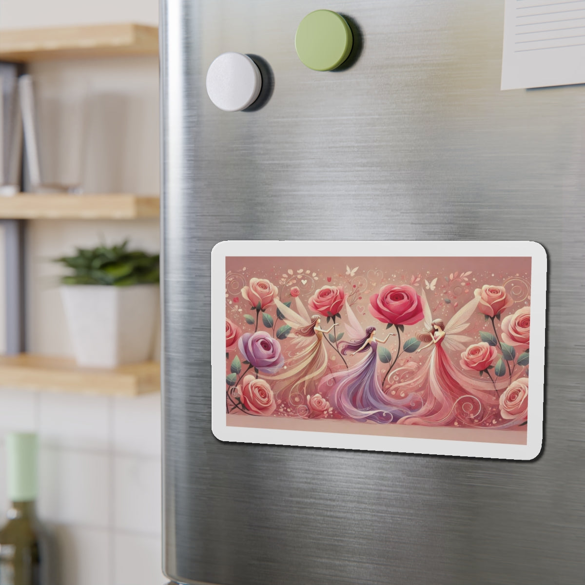 Add a touch of magic to any space with Whimsical Fairies Die-Cut Magnets. These flexible and durable magnets feature an enchanting scene of three elegant fairies in flowing blush pink, lavender, and pale gold gowns. Their delicate wings glisten as they interact with oversized, blooming red and pink peonies, surrounded by whimsical vine-like greenery. The dreamy gradient background, adorned with heart-shaped patterns and sparkles, completes this romantic Valentine's Day design.