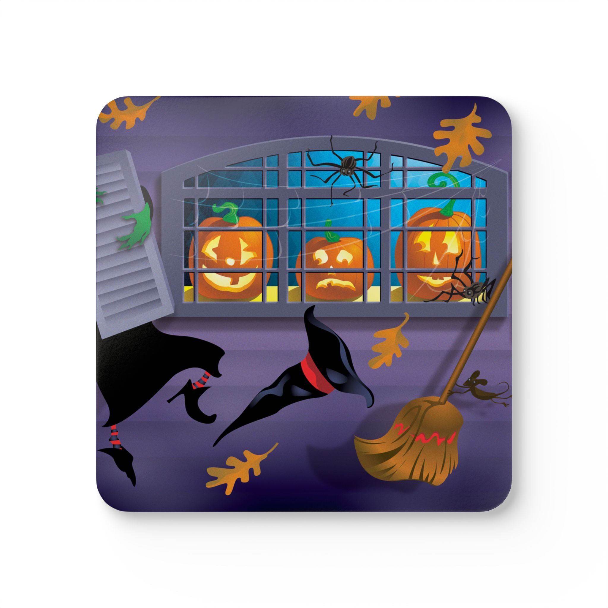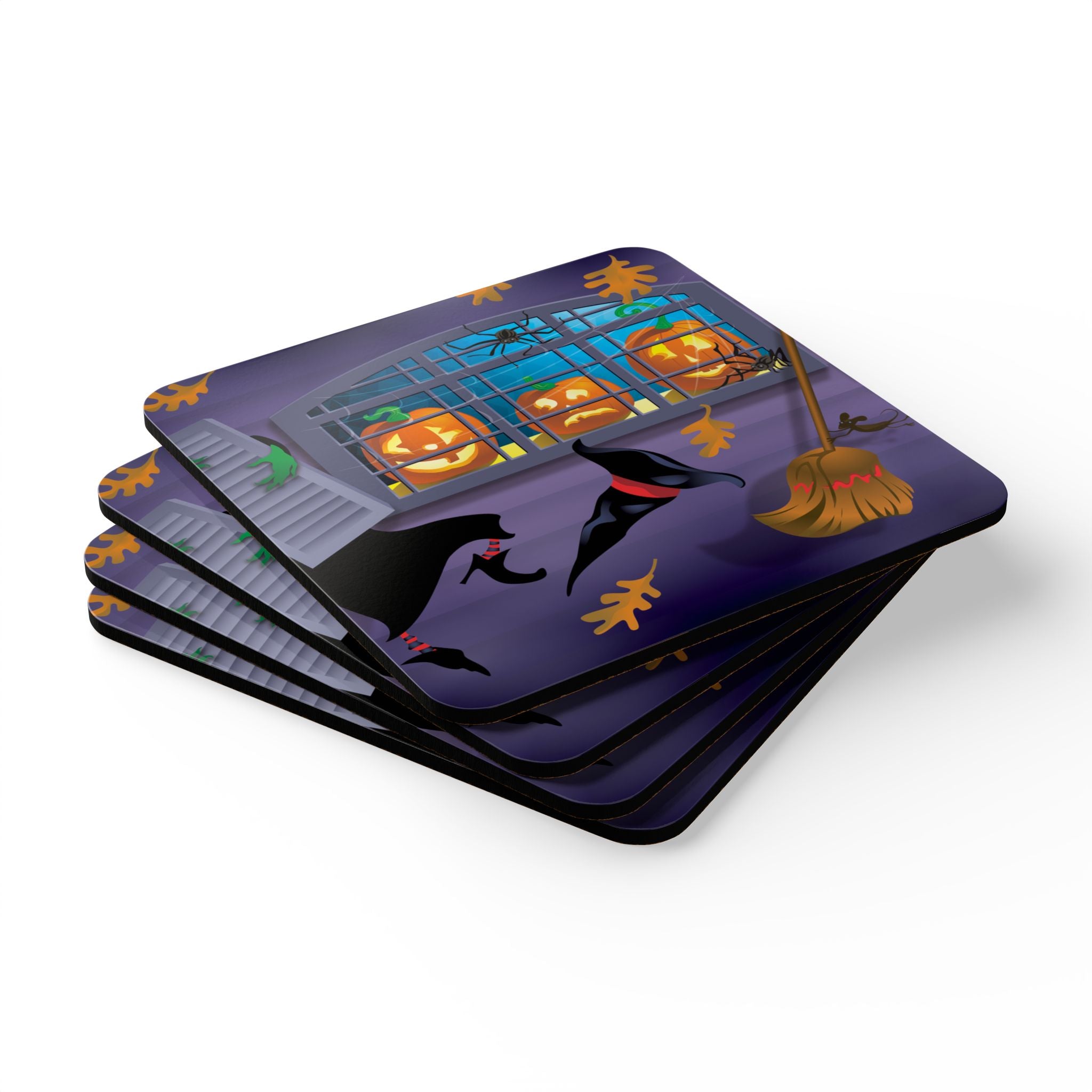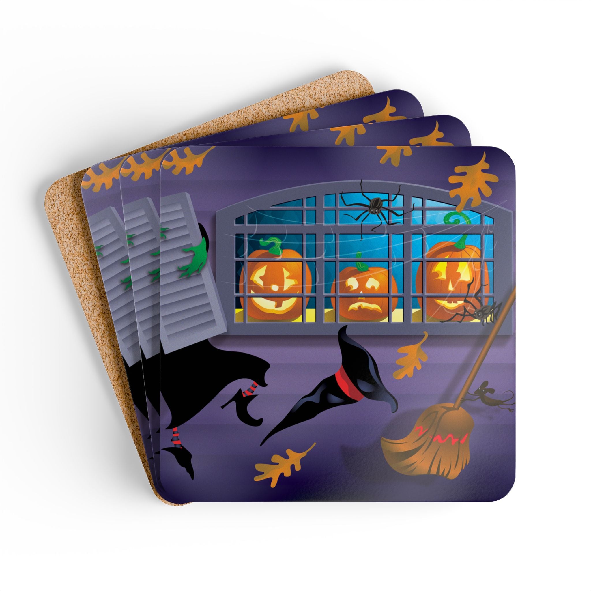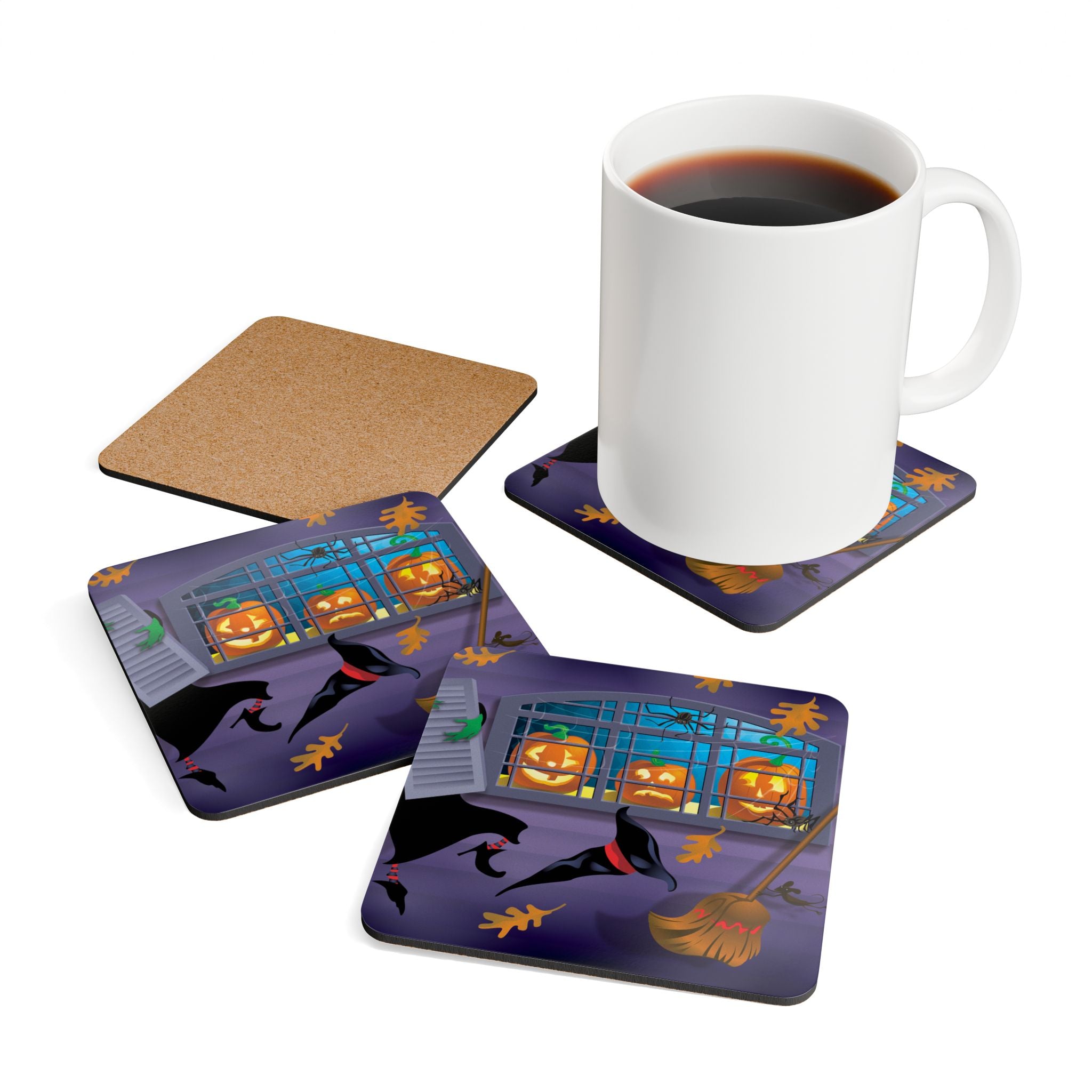 Add a festive touch to your Halloween decor with this elegant set of coasters. Each set includes four coasters, all featuring captivating Halloween designs. Crafted with a high-gloss top and a cork back, these coasters offer both style and functionality, preventing any unwanted sliding while adding a spooky charm to your home or business.