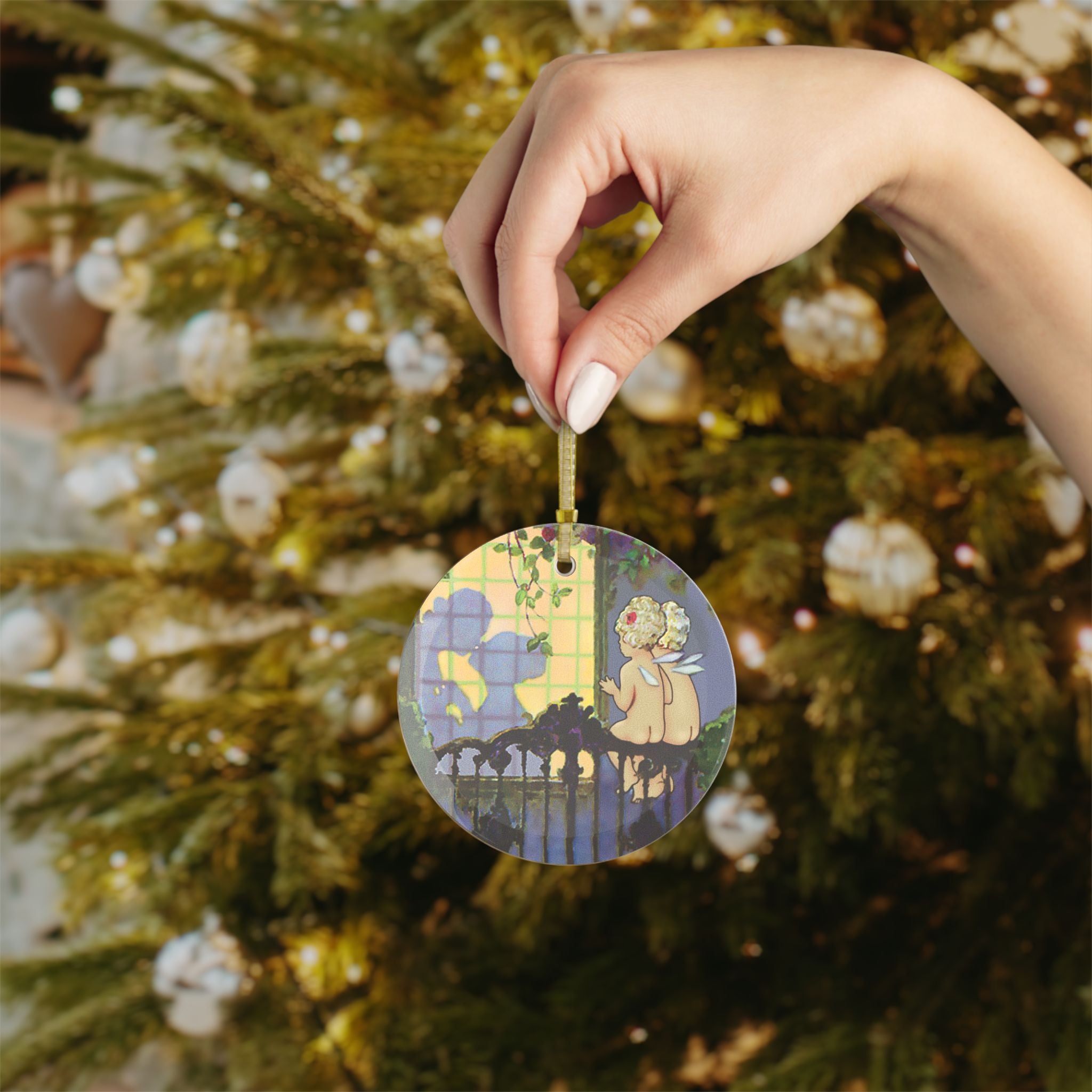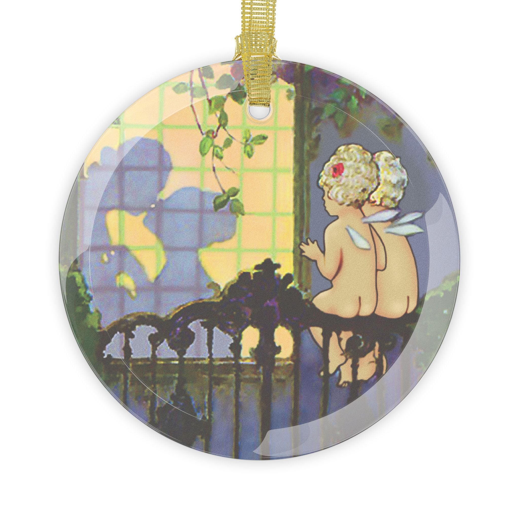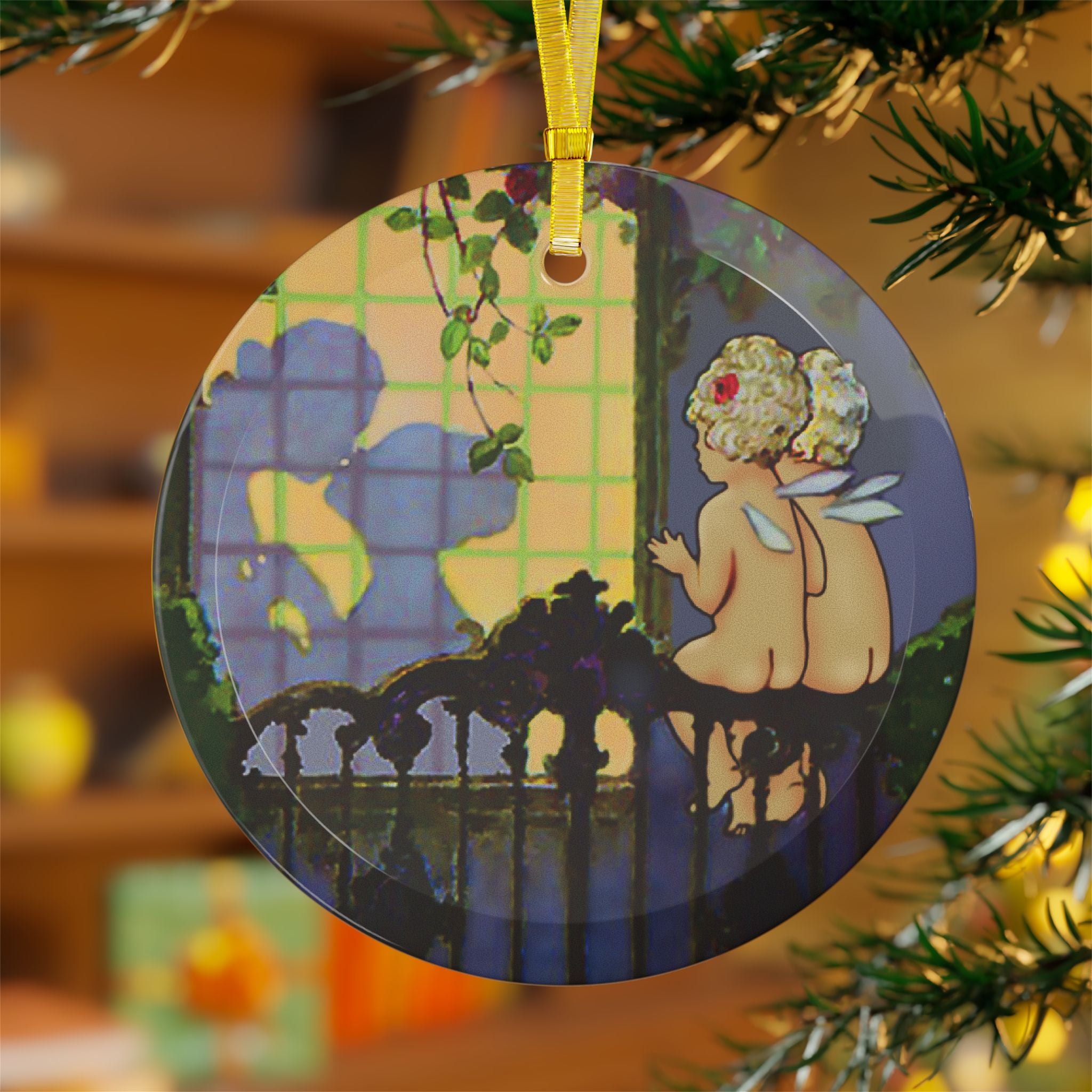 Whispers of Love Glass Ornament brings whimsical romance and Art Deco elegance to your holiday décor. This exquisite 100% glass ornament features a silhouetted couple locked in a passionate kiss, framed by cascading blossoms that spill softly over the window edge. Two ethereal fairies perch nearby, their shimmering wings capturing the magical atmosphere of a moment suspended in time. A perfect collectible for lovers of vintage aesthetics, fantasy art, and dreamy holiday storytelling.