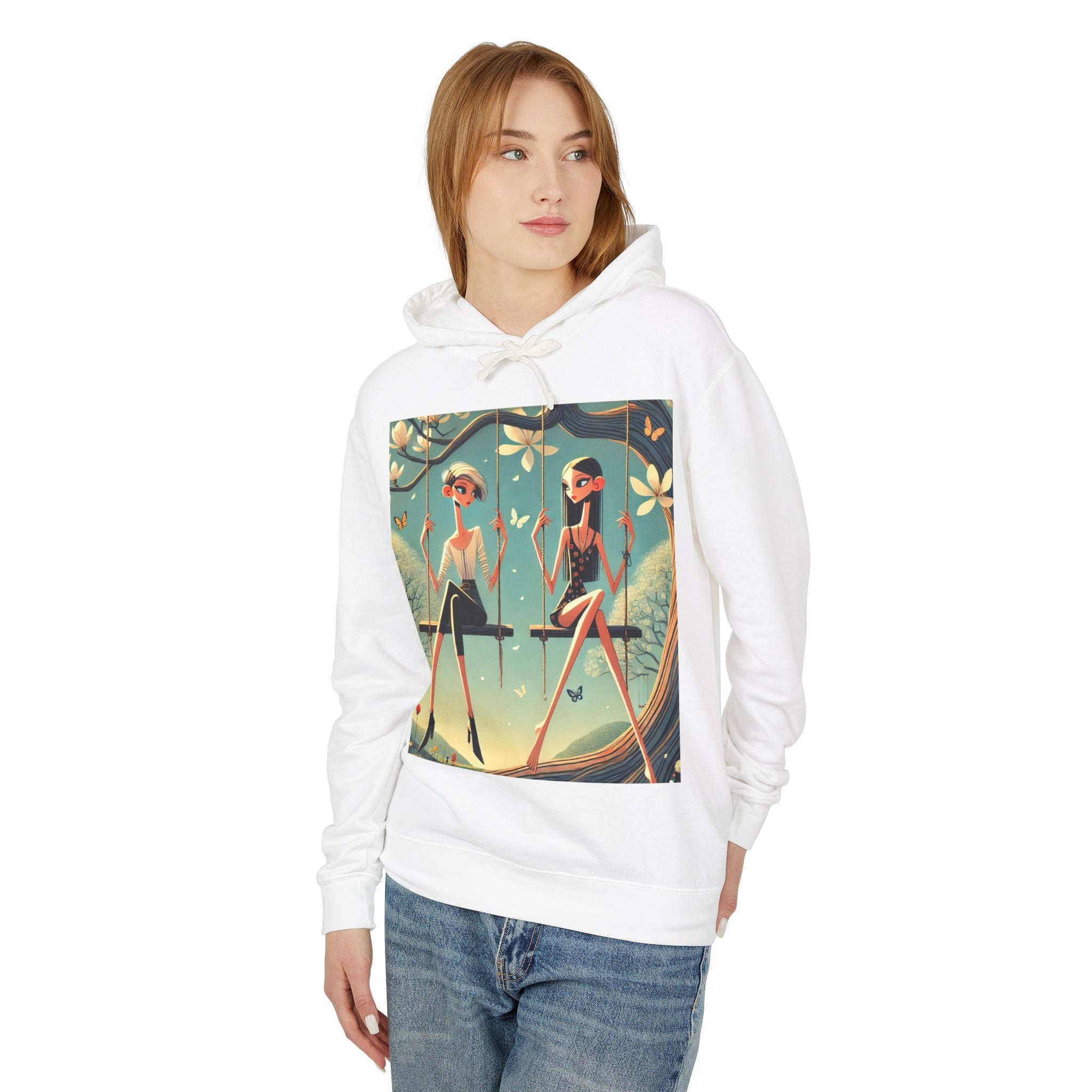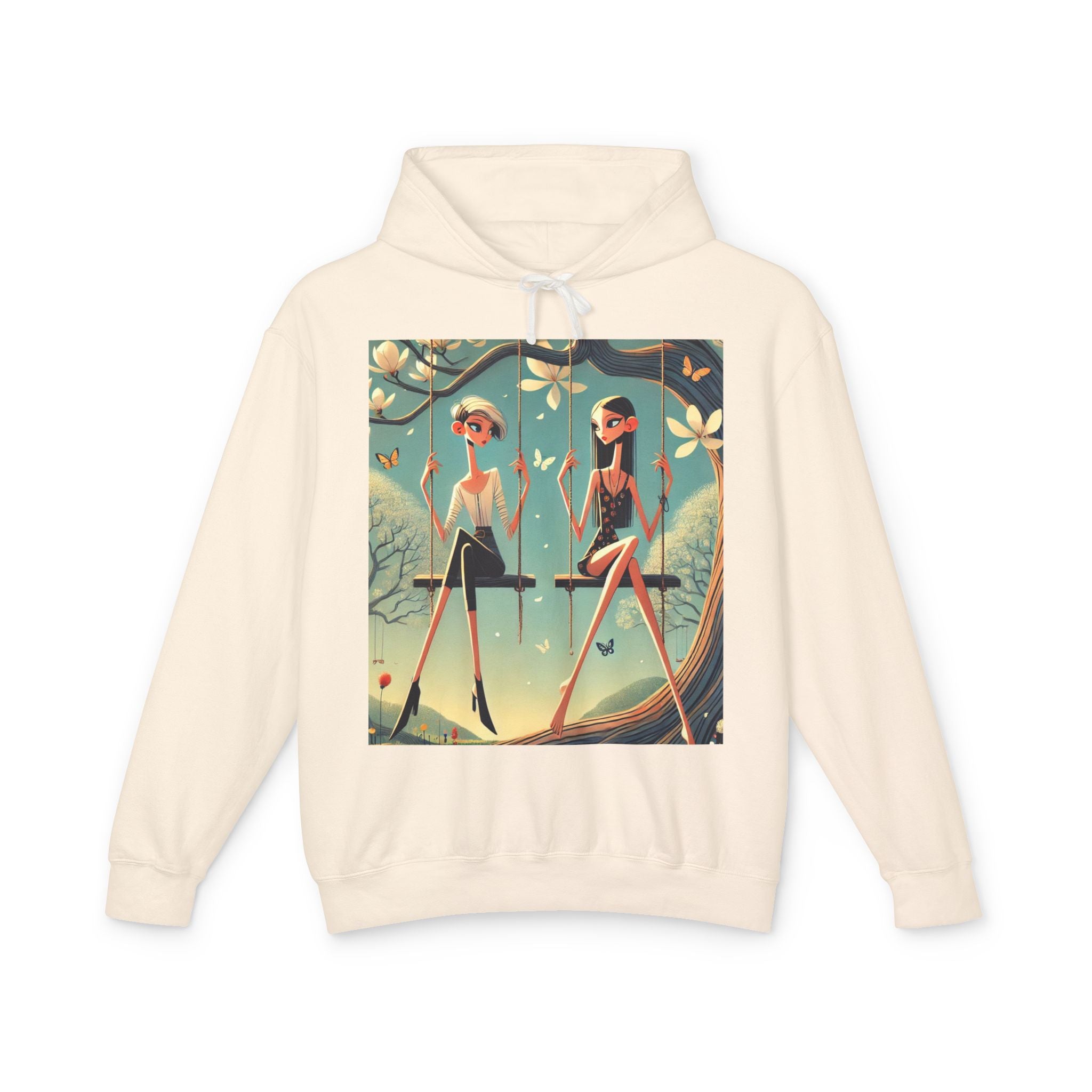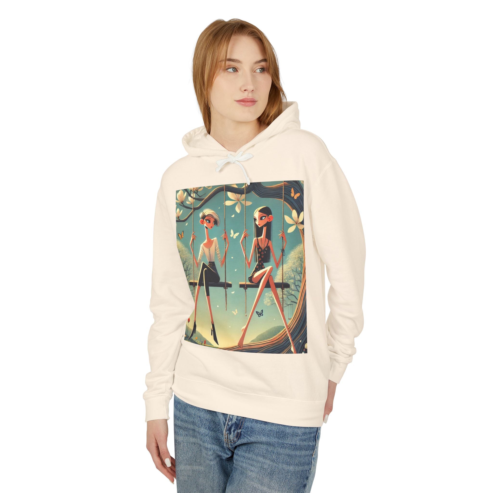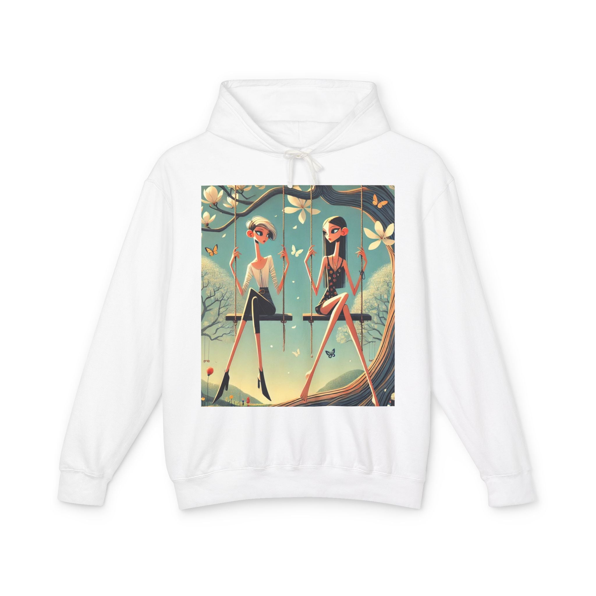 Whispers on the Spring Lightweight Hooded Sweatshirt brings calm, fashion-forward fairy-tale style to relaxed everyday comfort, pairing ultra-soft cotton with a scene that feels airy and poetic. Featuring Whispers on the Spring Swing, the artwork shows two stylized figures seated on delicate swings beneath a flowering tree, their long, graceful forms echoing the gentle rhythm of spring. Curling branches, pale blossoms, drifting petals, and fluttering butterflies add quiet motion throughout, while muted teals and soft light create a serene, modern elegance.