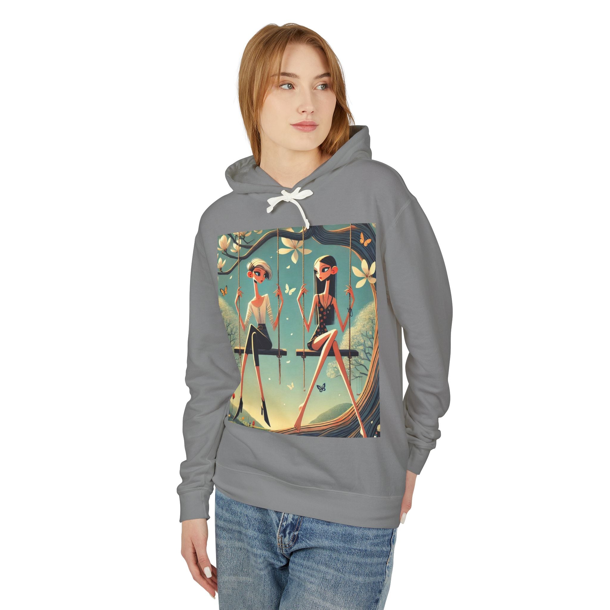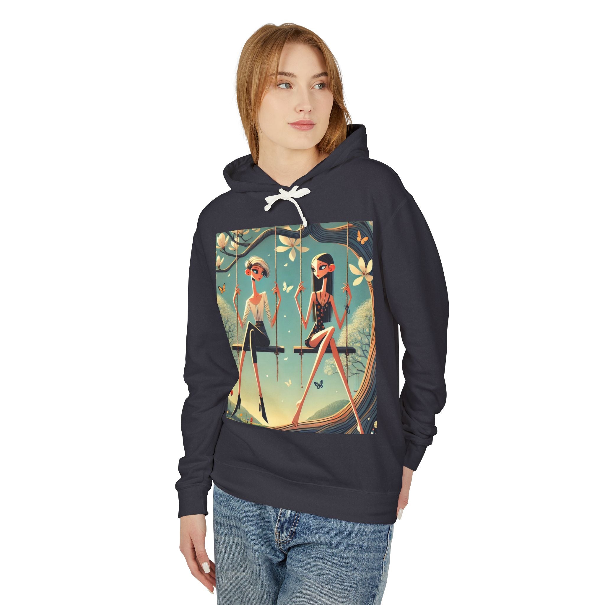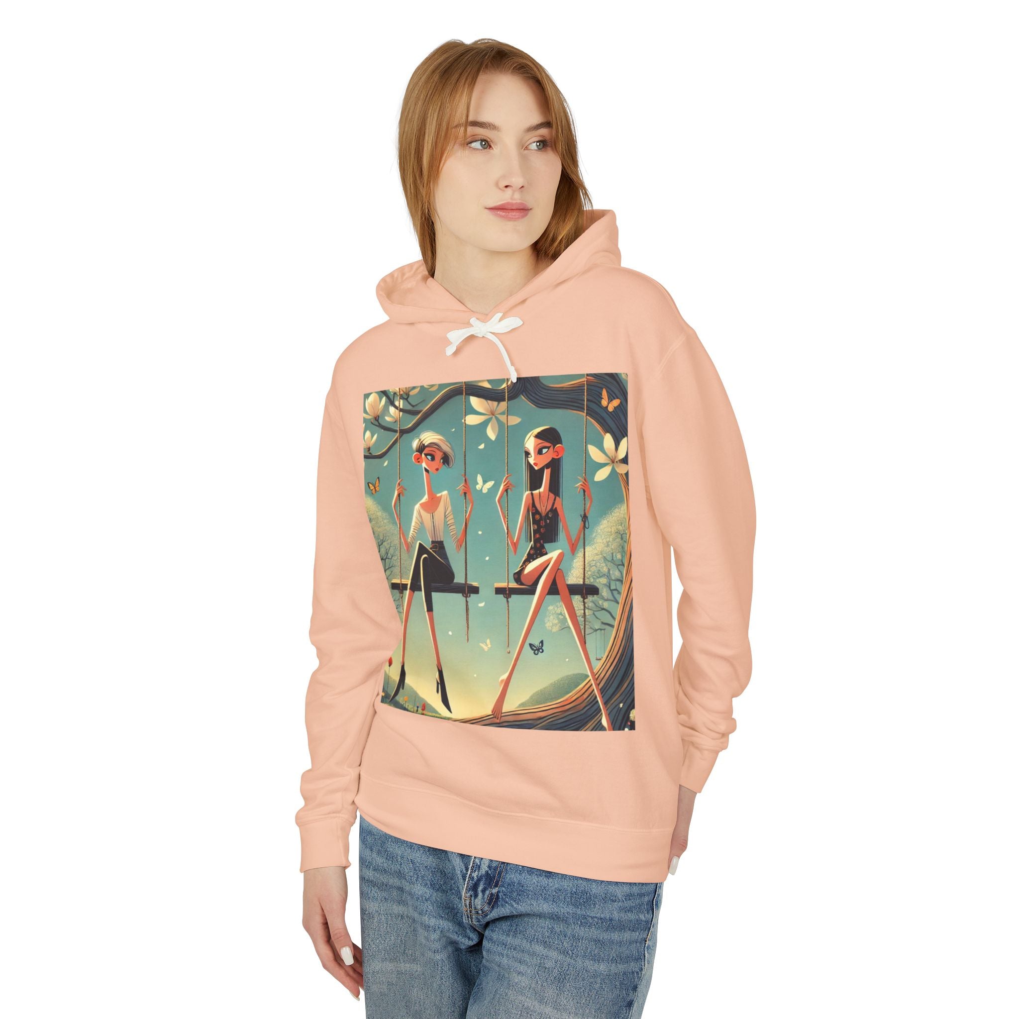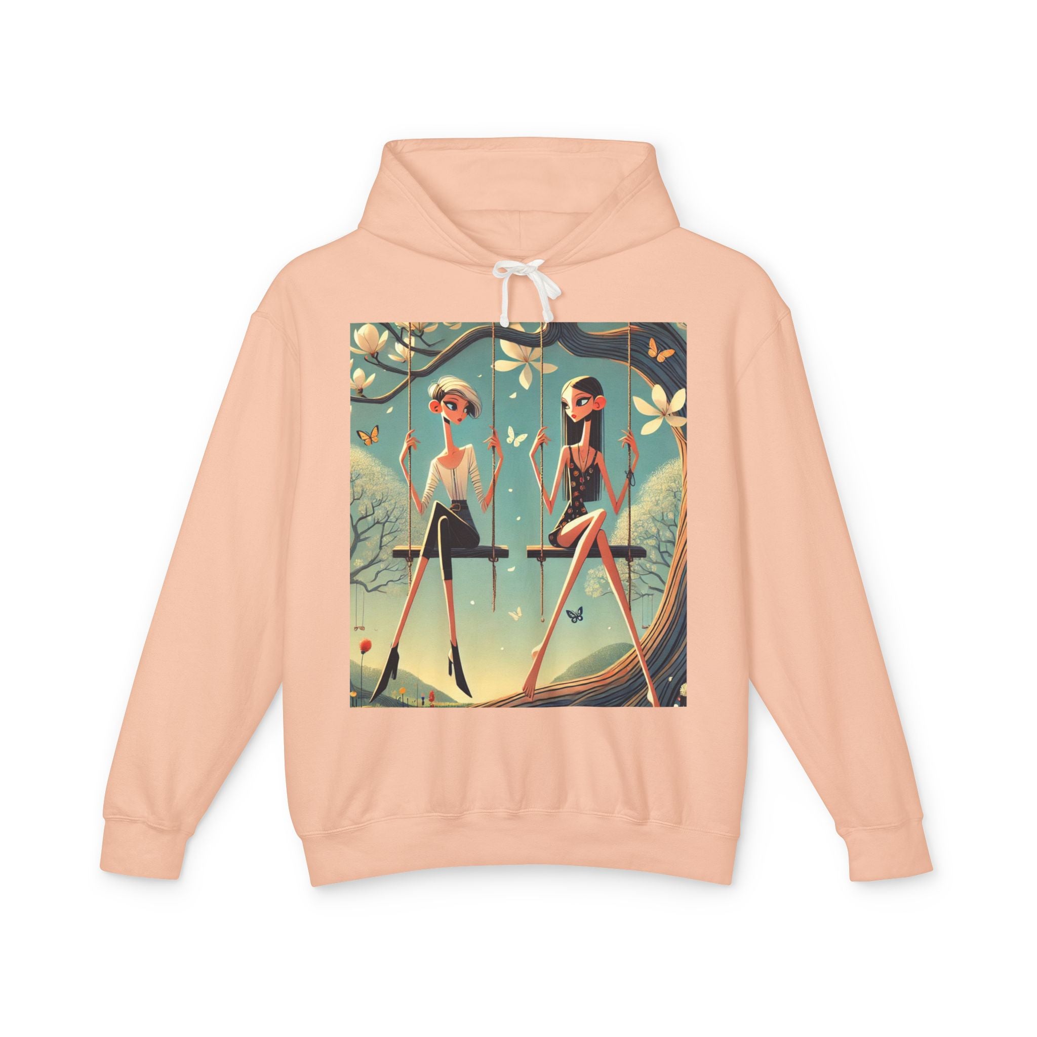 Whispers on the Spring Lightweight Hooded Sweatshirt brings calm, fashion-forward fairy-tale style to relaxed everyday comfort, pairing ultra-soft cotton with a scene that feels airy and poetic. Featuring Whispers on the Spring Swing, the artwork shows two stylized figures seated on delicate swings beneath a flowering tree, their long, graceful forms echoing the gentle rhythm of spring. Curling branches, pale blossoms, drifting petals, and fluttering butterflies add quiet motion throughout, while muted teals and soft light create a serene, modern elegance.