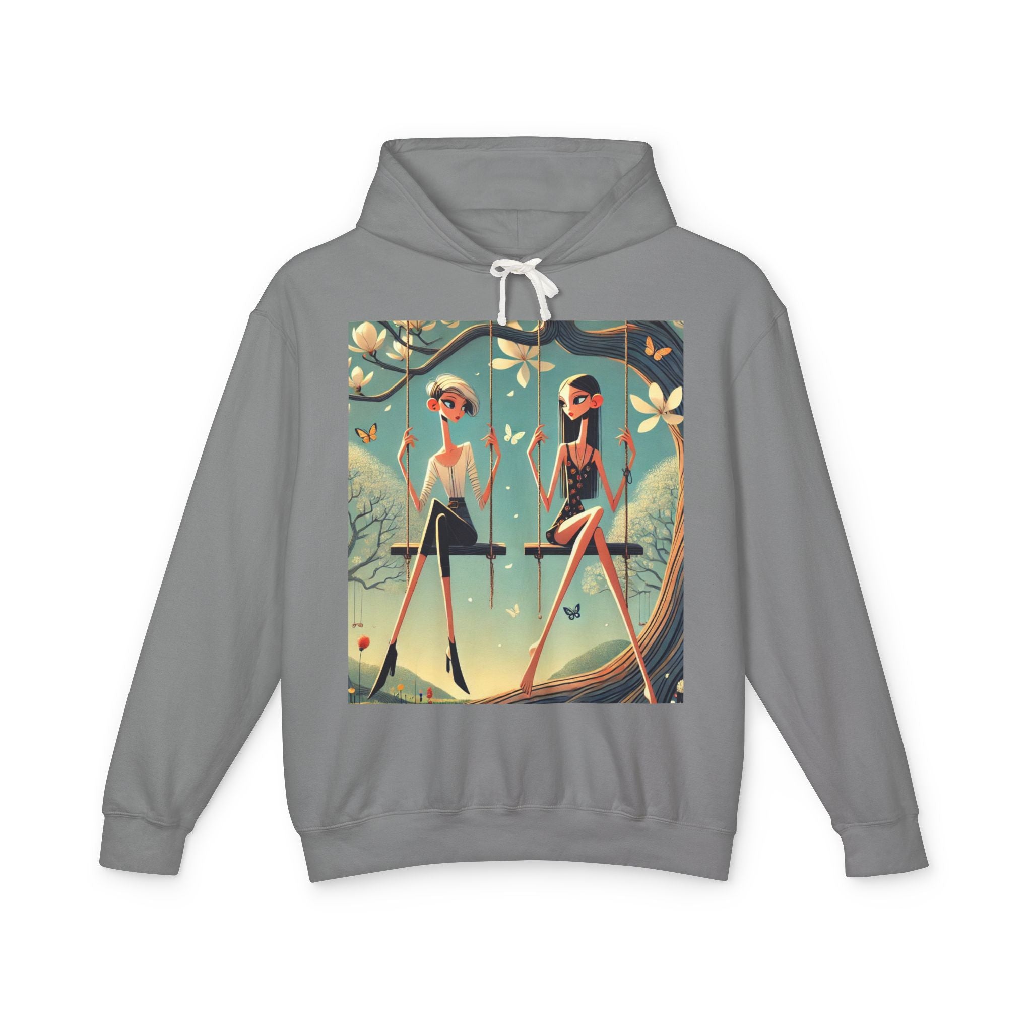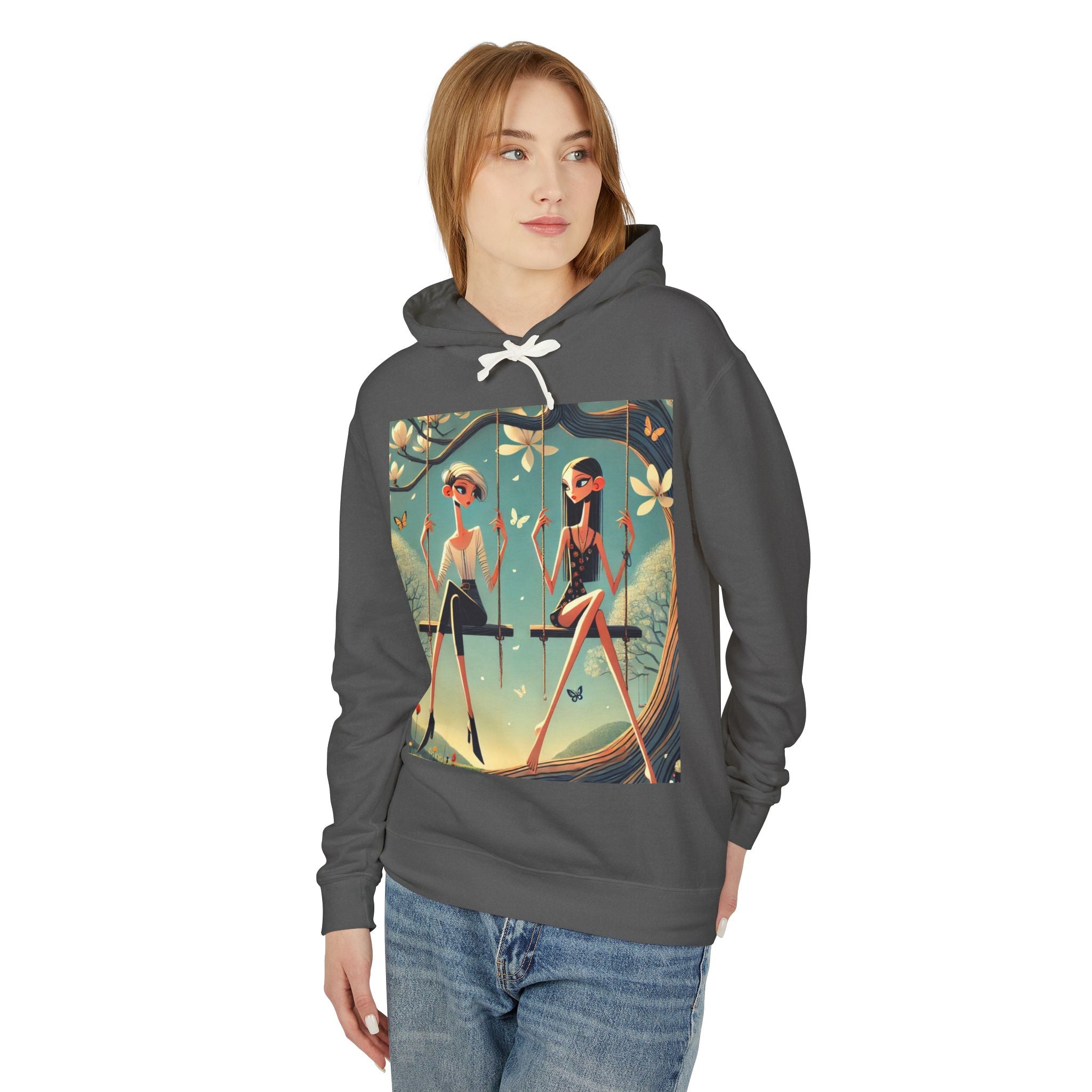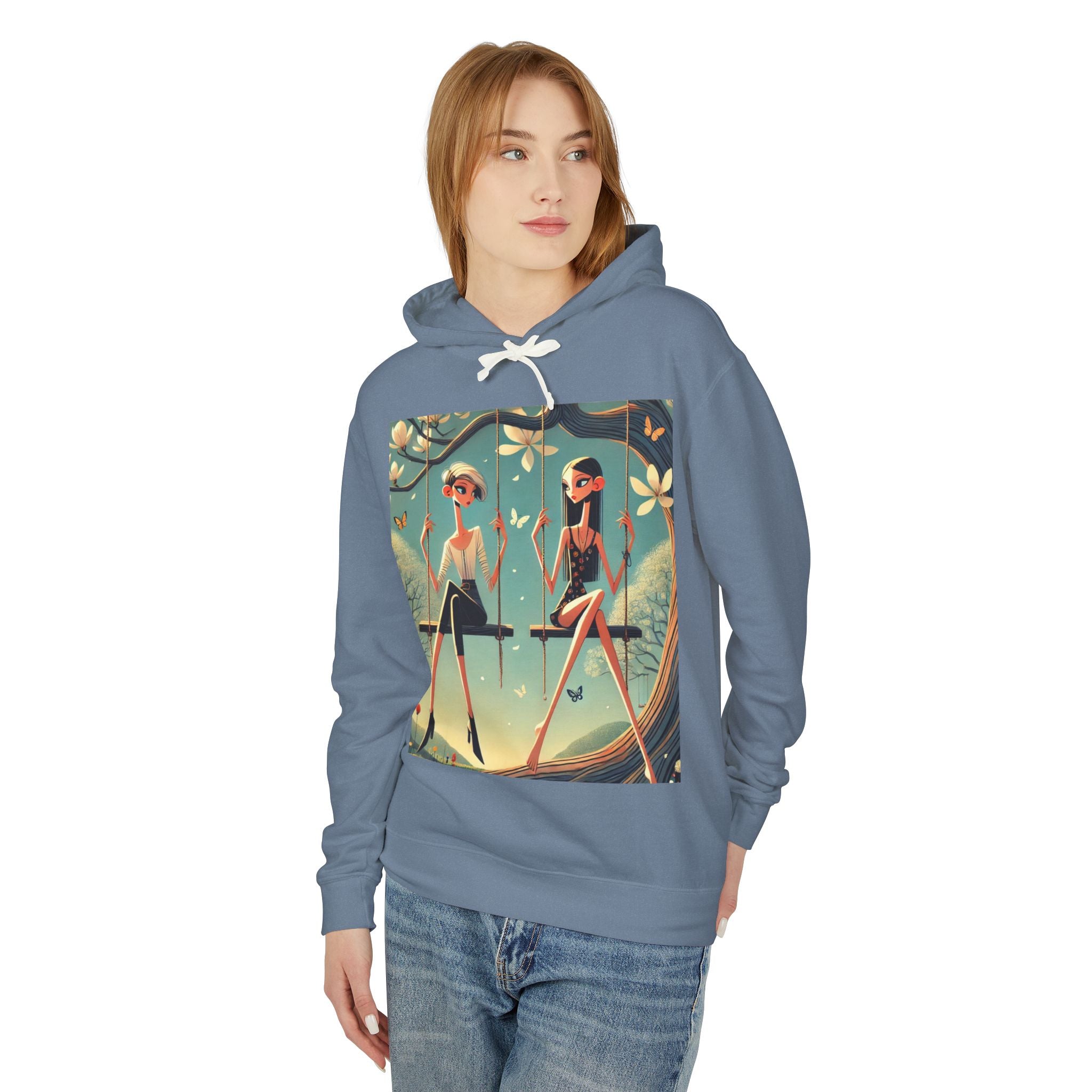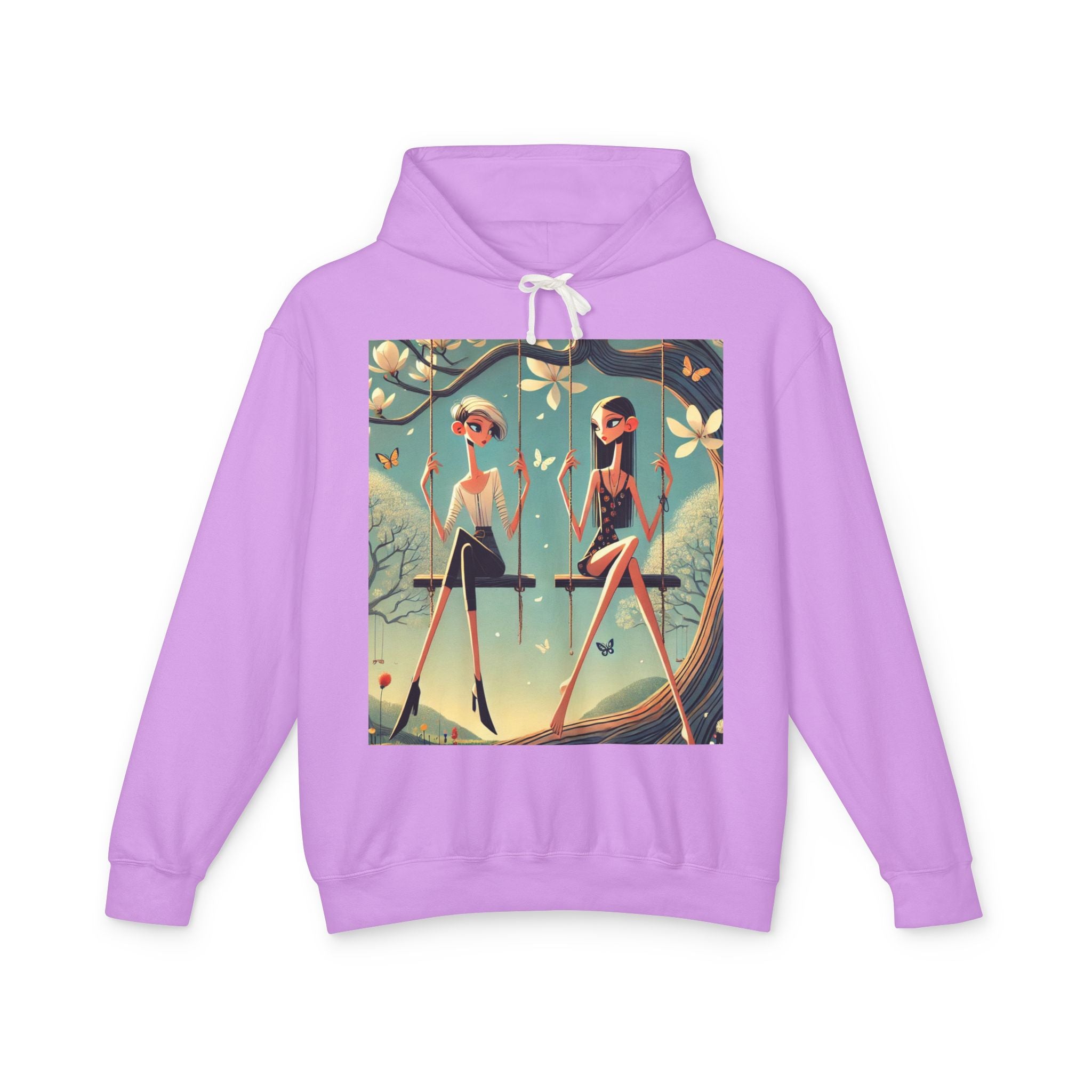 Whispers on the Spring Lightweight Hooded Sweatshirt brings calm, fashion-forward fairy-tale style to relaxed everyday comfort, pairing ultra-soft cotton with a scene that feels airy and poetic. Featuring Whispers on the Spring Swing, the artwork shows two stylized figures seated on delicate swings beneath a flowering tree, their long, graceful forms echoing the gentle rhythm of spring. Curling branches, pale blossoms, drifting petals, and fluttering butterflies add quiet motion throughout, while muted teals and soft light create a serene, modern elegance.