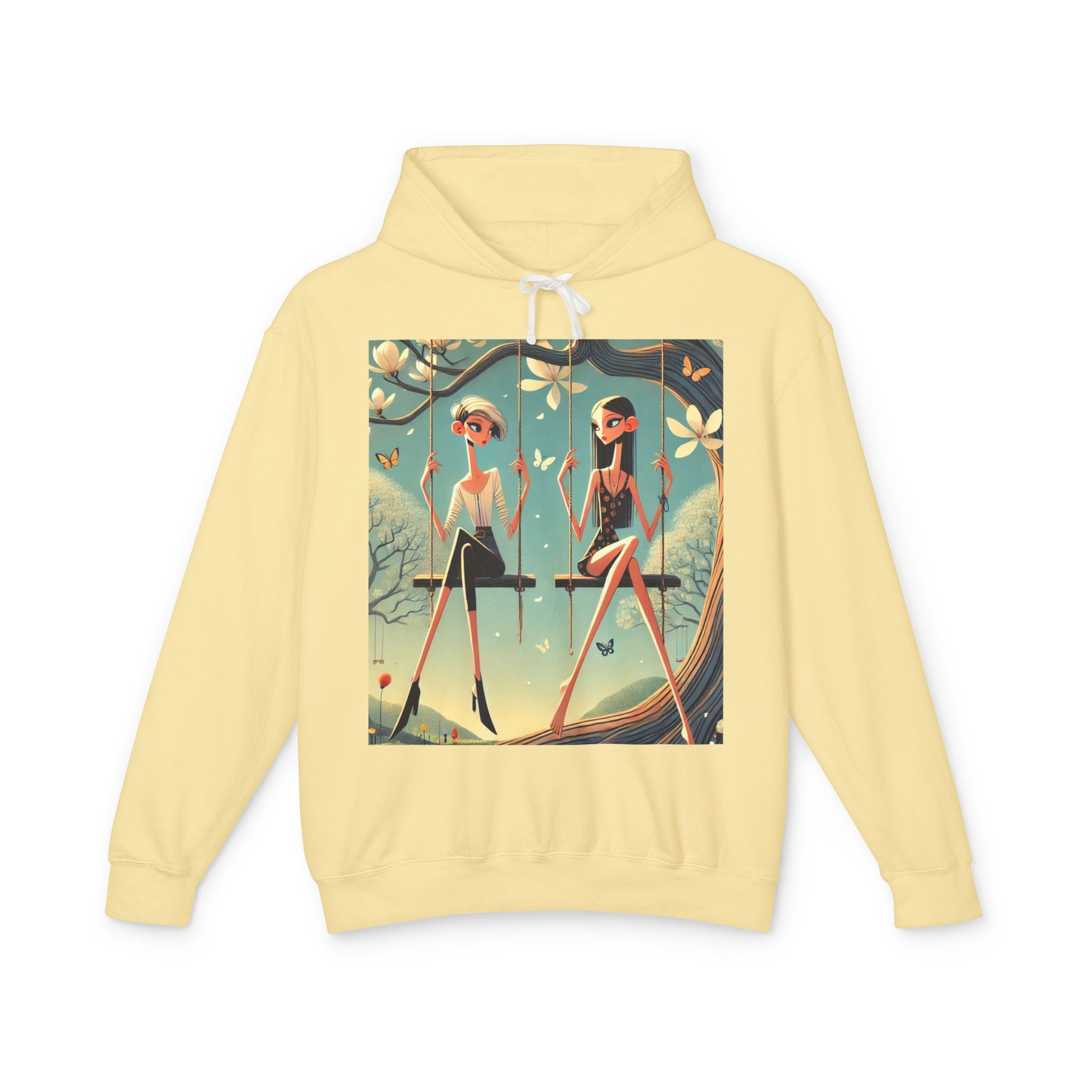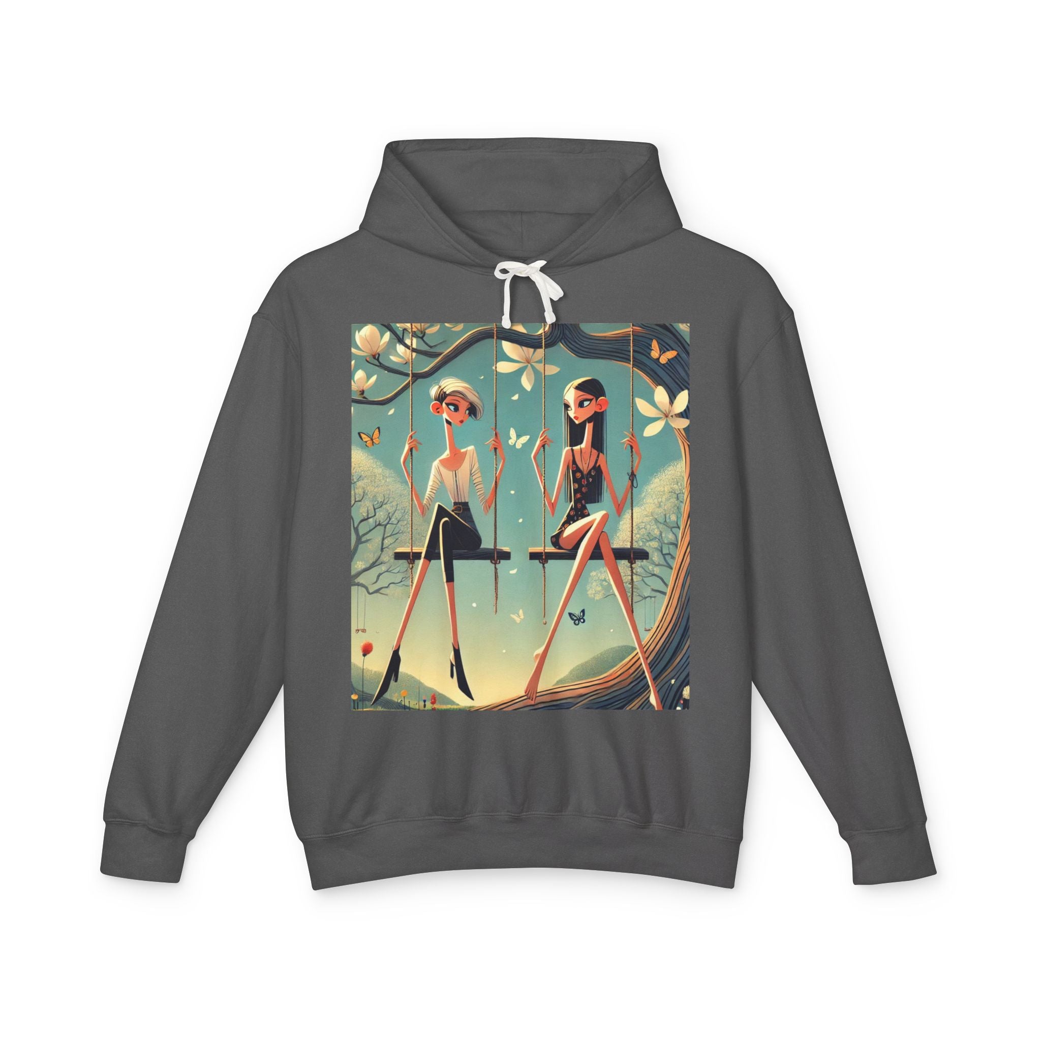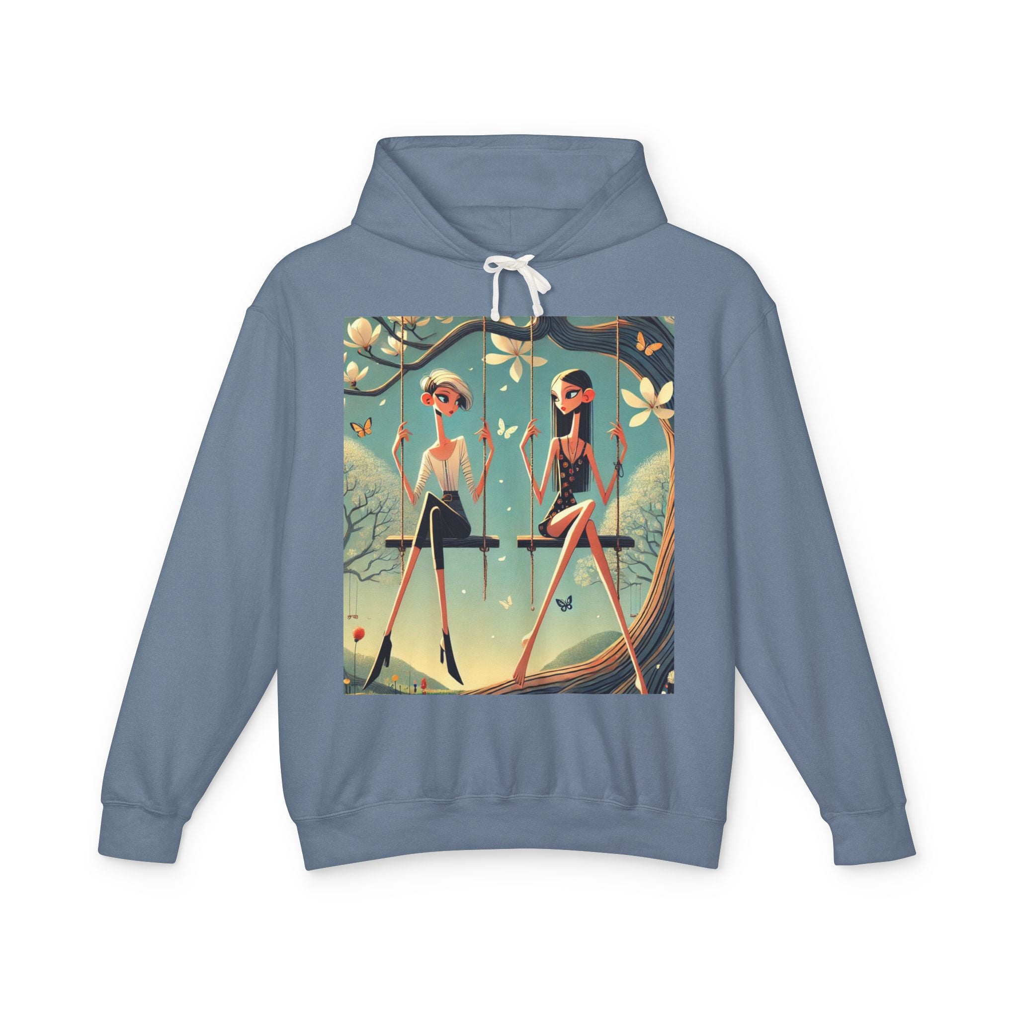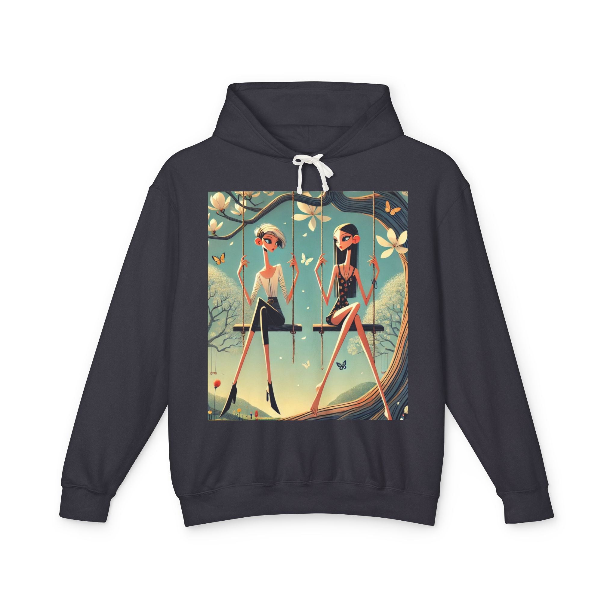 Whispers on the Spring Lightweight Hooded Sweatshirt brings calm, fashion-forward fairy-tale style to relaxed everyday comfort, pairing ultra-soft cotton with a scene that feels airy and poetic. Featuring Whispers on the Spring Swing, the artwork shows two stylized figures seated on delicate swings beneath a flowering tree, their long, graceful forms echoing the gentle rhythm of spring. Curling branches, pale blossoms, drifting petals, and fluttering butterflies add quiet motion throughout, while muted teals and soft light create a serene, modern elegance.