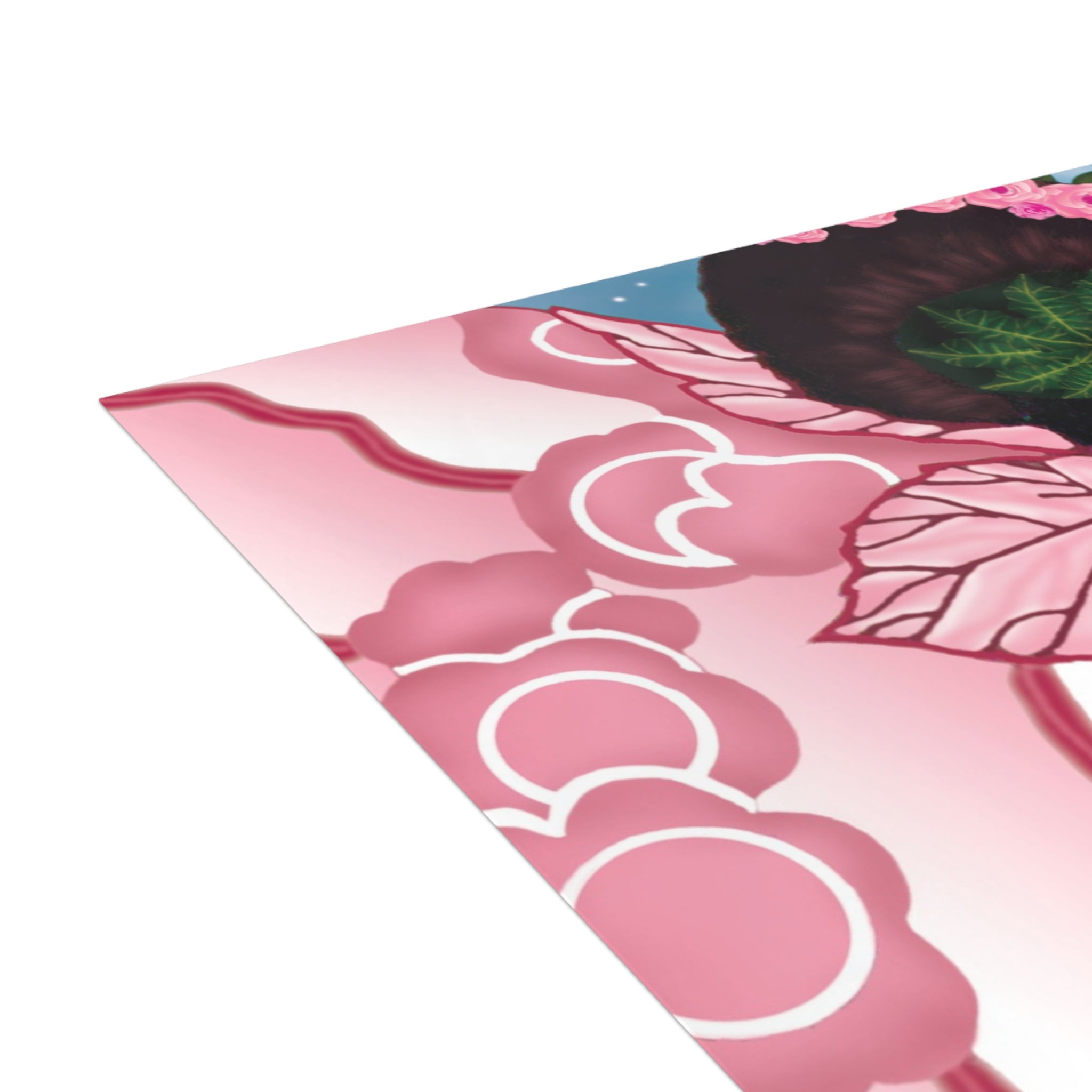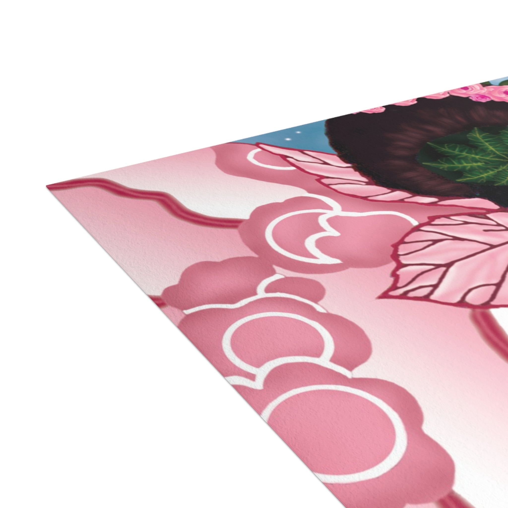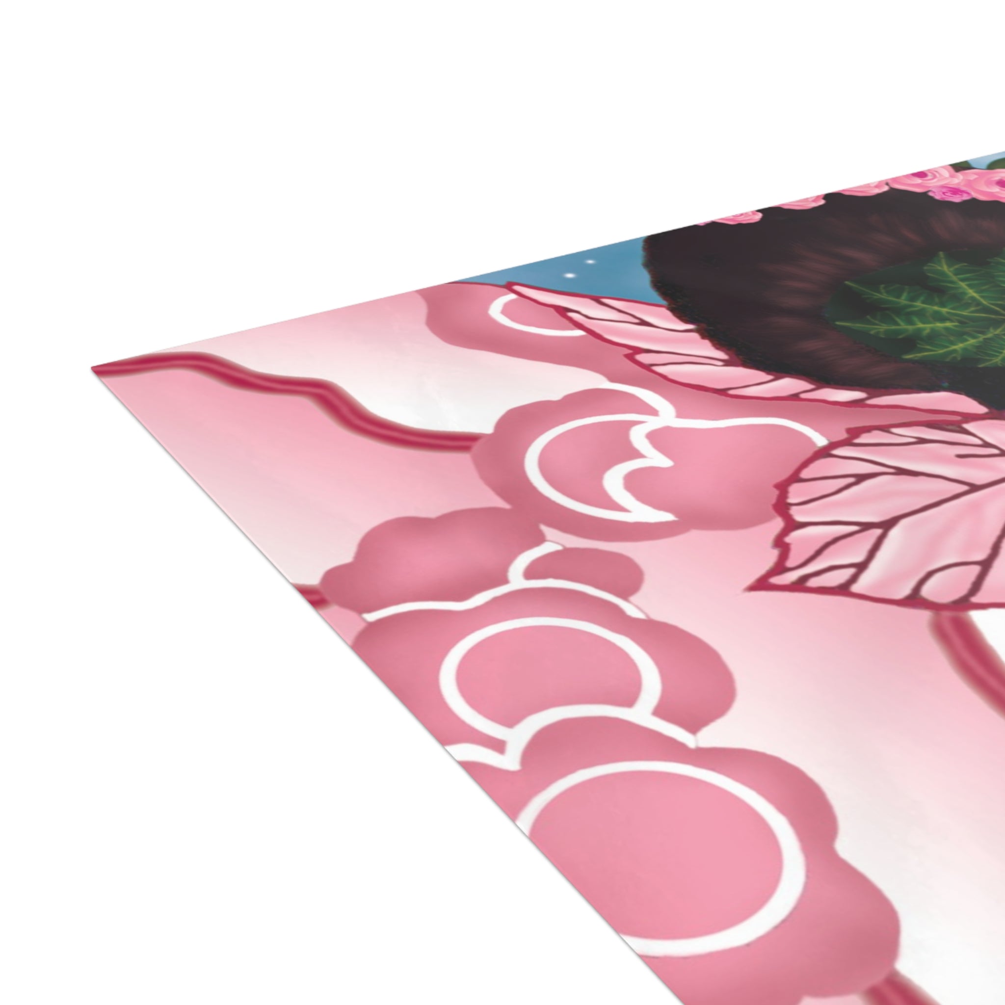 Step into a scene of enchanting winter elegance with the Winter Rose Empress. This captivating artwork blends whimsy and sophistication, featuring a regal woman draped in a sweeping chocolate-brown fur cloak adorned with soft pink roses. Her tall, sculpted headdress, crowned with blossoms, adds a dramatic touch of fantasy, while delicate golden curls frame her serene expression.