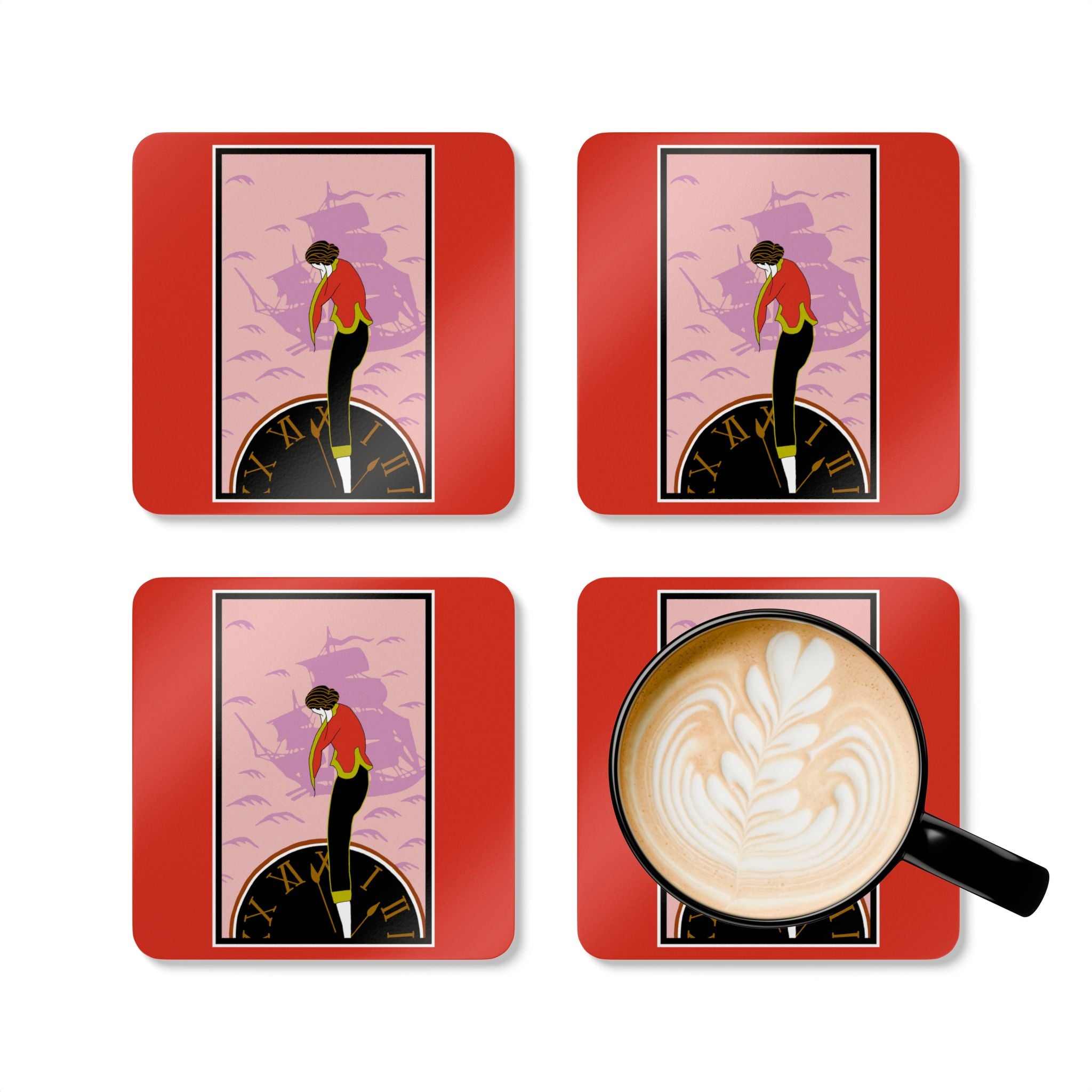 Artwork designed and digitally remastered by Sarasvati Designs. The original “Woman Waiting for Her Beloved at 1:59” is part of the celebrated series “Waiting for Her Beloved in the Early Night Hours” by Kobayashi Kaichi, a renowned Japanese printmaker of the 1920s and early 1930s. The piece masterfully merges Japanese aesthetics with European Art Deco, Art Nouveau, and Expressionist influences. With its dramatic composition and rich color palette, Kaichi’s work conveys emotion, longing, and elegance—making this coaster set a tribute to both love and artistic innovation.