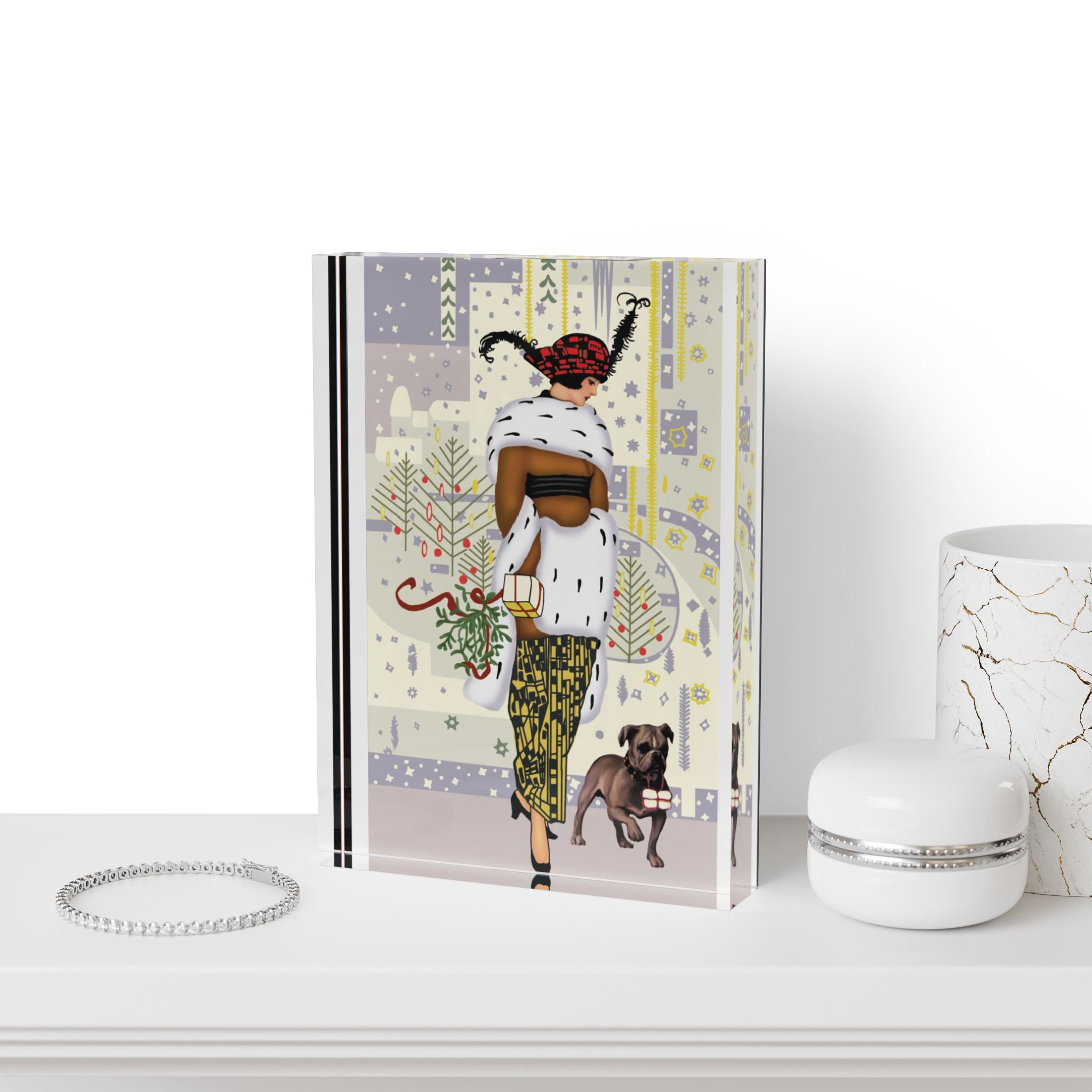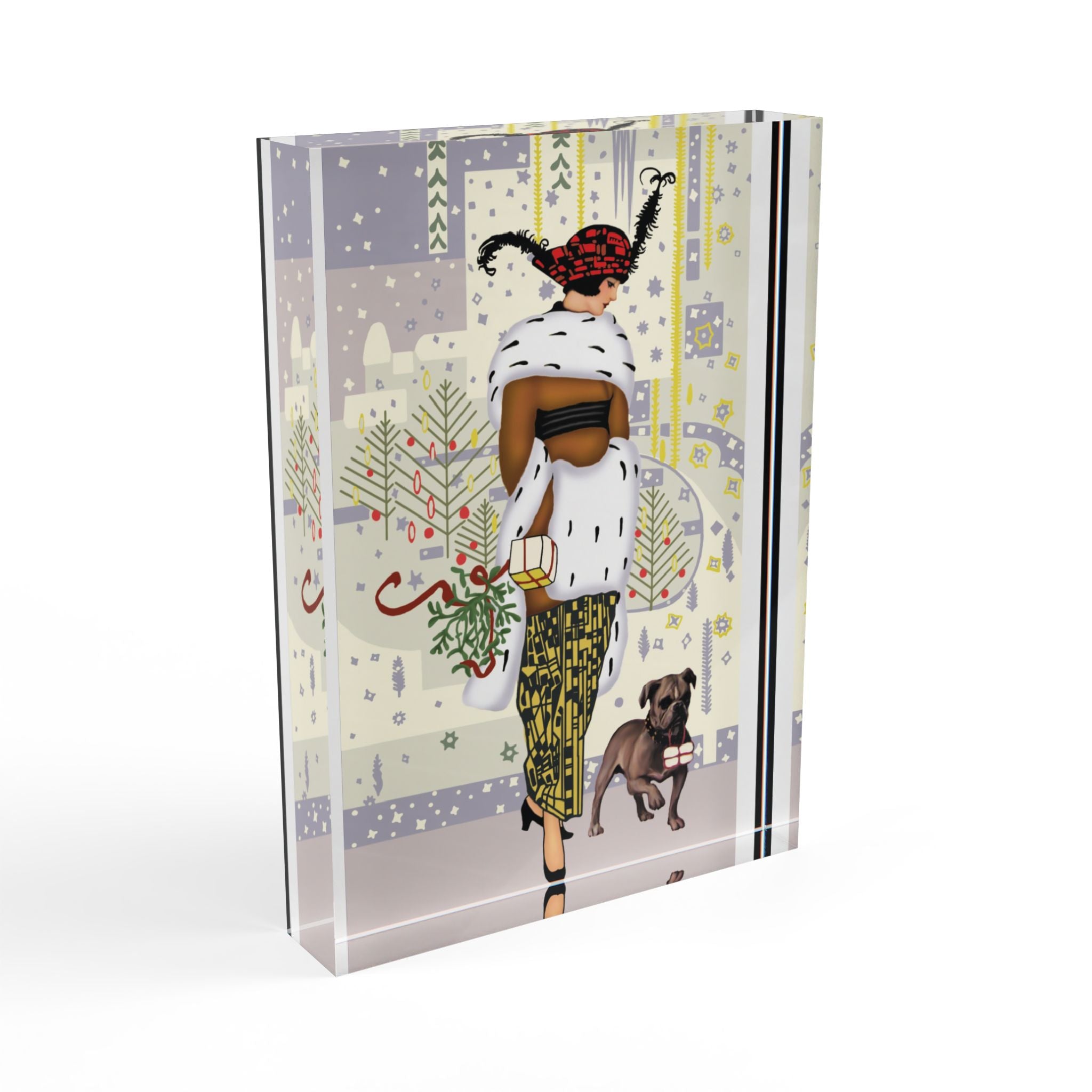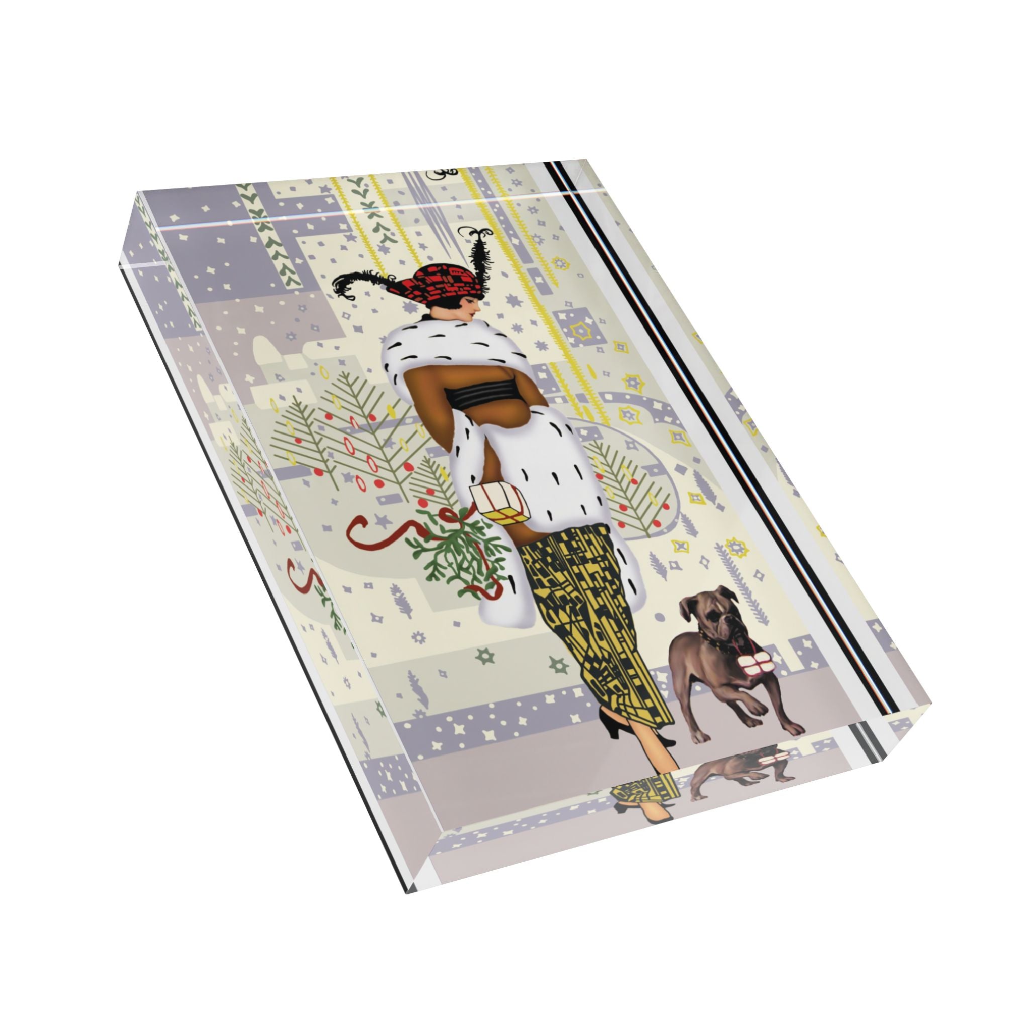 Across its surface, the artwork brings the holidays to life with timeless charm. A stylish woman wrapped in a white fur stole and patterned golden skirt walks with elegance, her red headscarf crowned with bold black plumes. She carries mistletoe and a wrapped present, embodying holiday grace, while at her side a loyal bulldog trots proudly, tiny gifts tied neatly to its collar. Behind them, a geometric backdrop of trees, stars, and winter tones frames the scene, blending glamour, whimsy, and Christmas cheer into a single radiant display.
