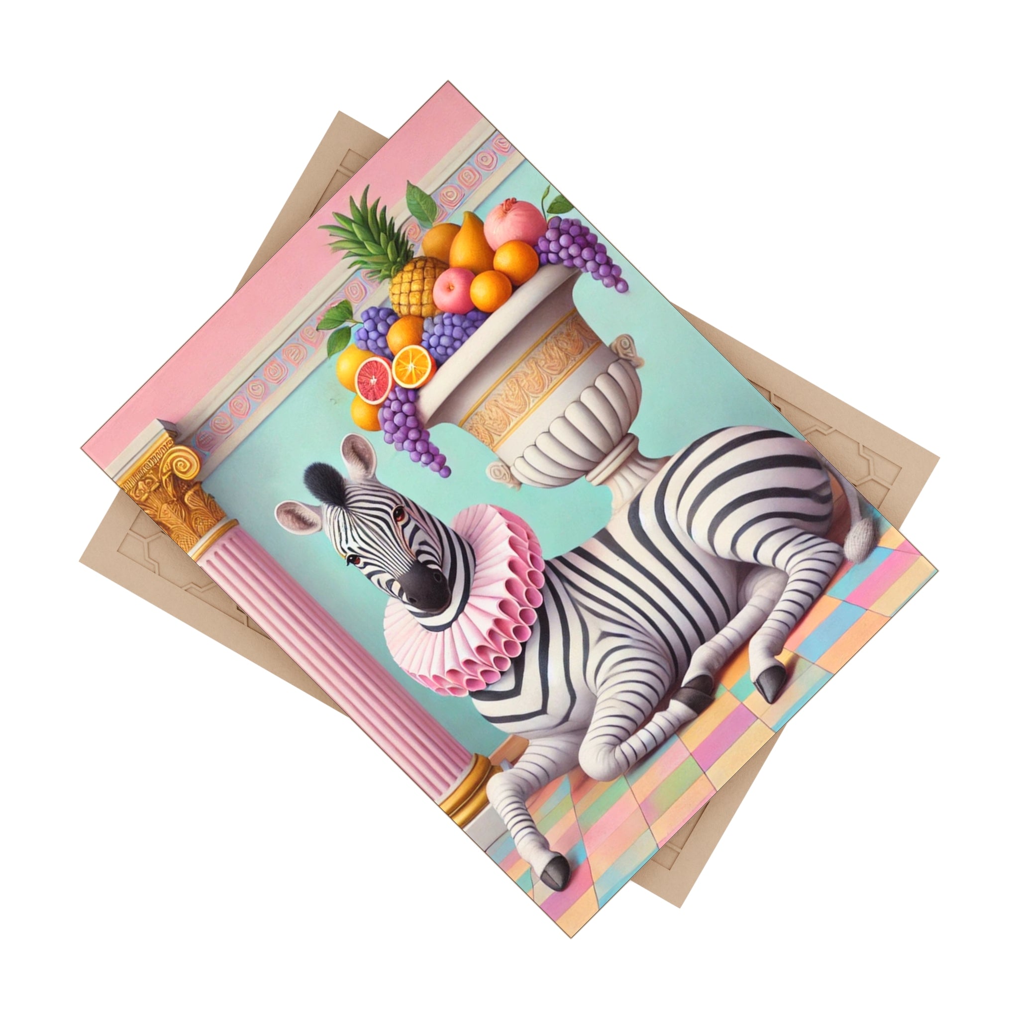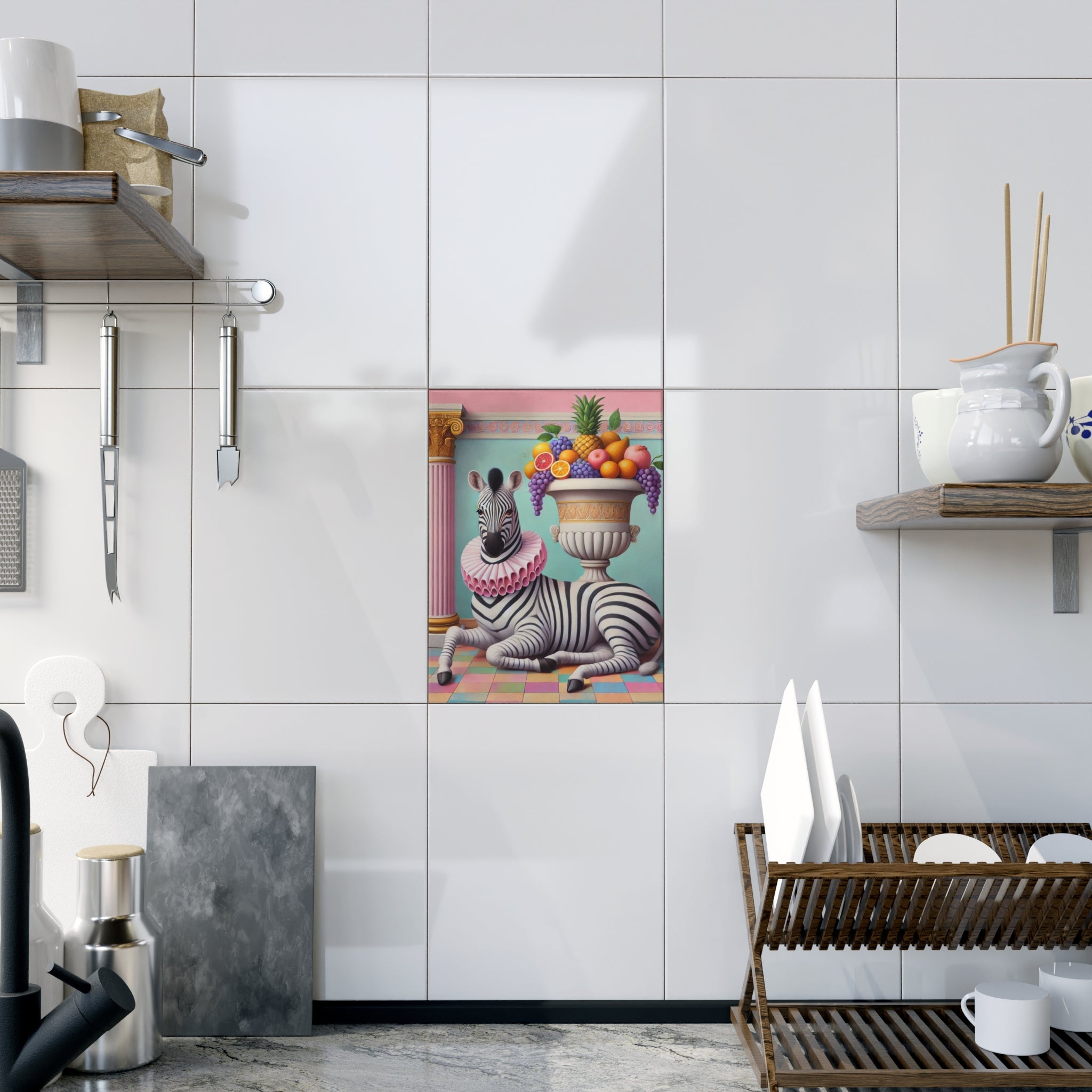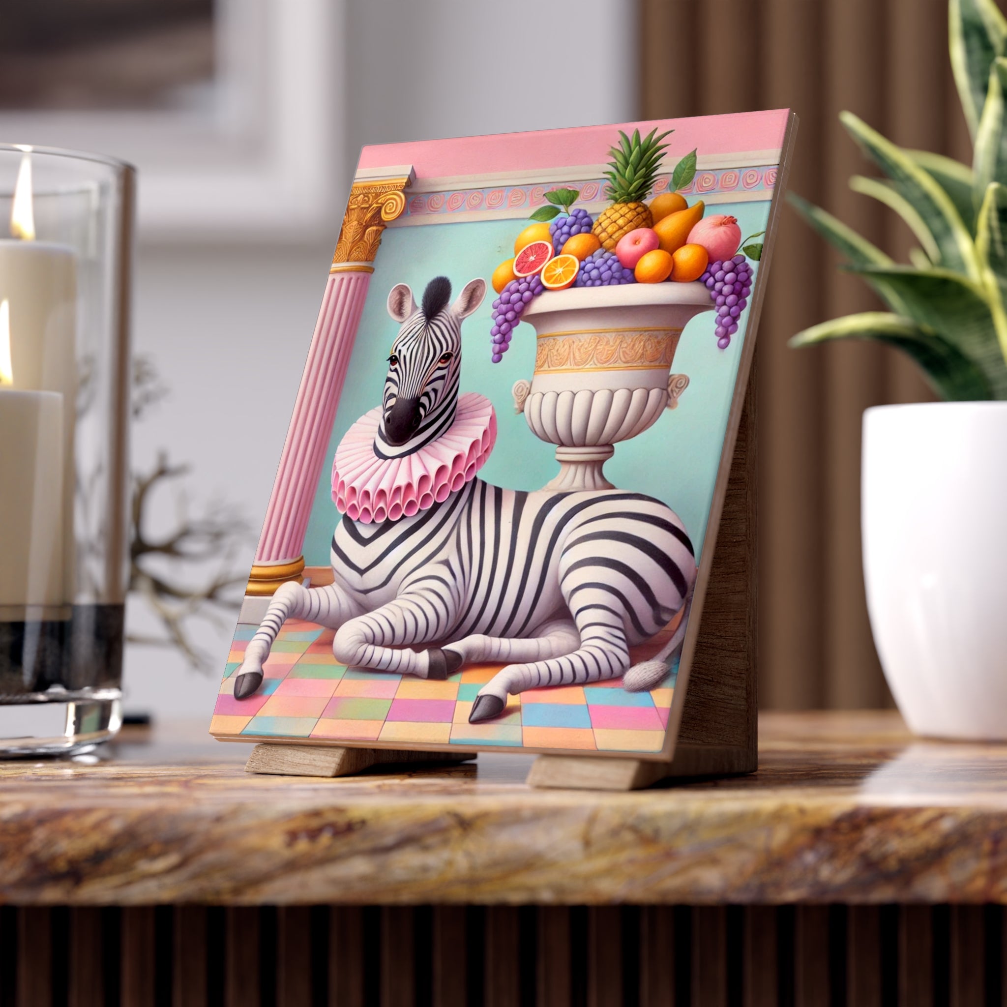 Zebra, Fruit, and Pink Columns Ceramic Tile brings a pastel-toned classical tableau into your space, where a lounging zebra becomes the unlikely star beneath pink fluted columns and beside an overflowing amphora of fruit. Grapes cascade, citrus glows, and a pineapple crowns the arrangement, while a split pomegranate on the tiled floor adds a quiet note of abundance and symbolism. Dressed in a ruffled pink collar, the zebra blends elegance with absurdity—transforming the traditions of Greco-Roman still life into something playful, modern, and surreal in soft mint, blush, gold, and ivory.