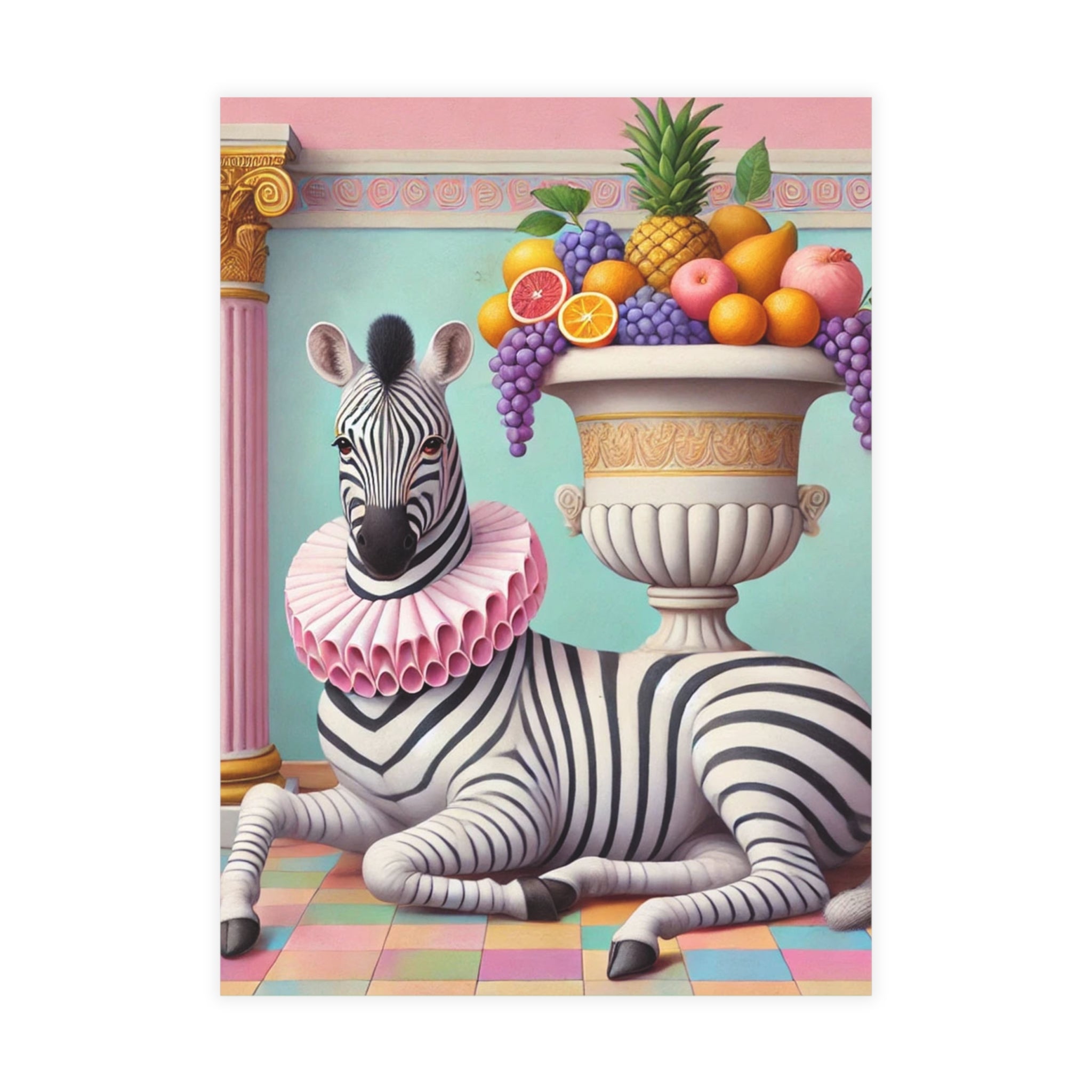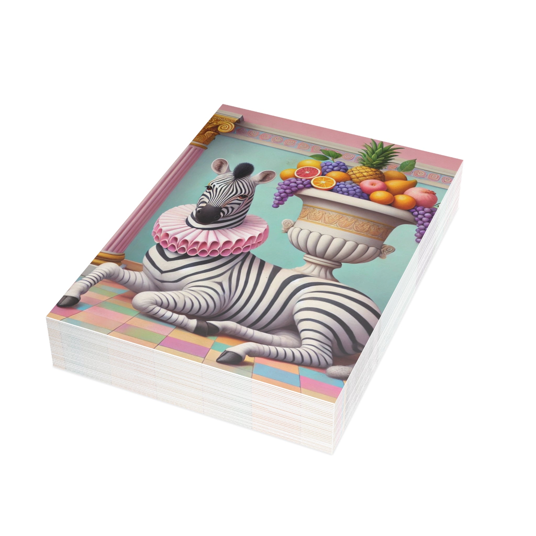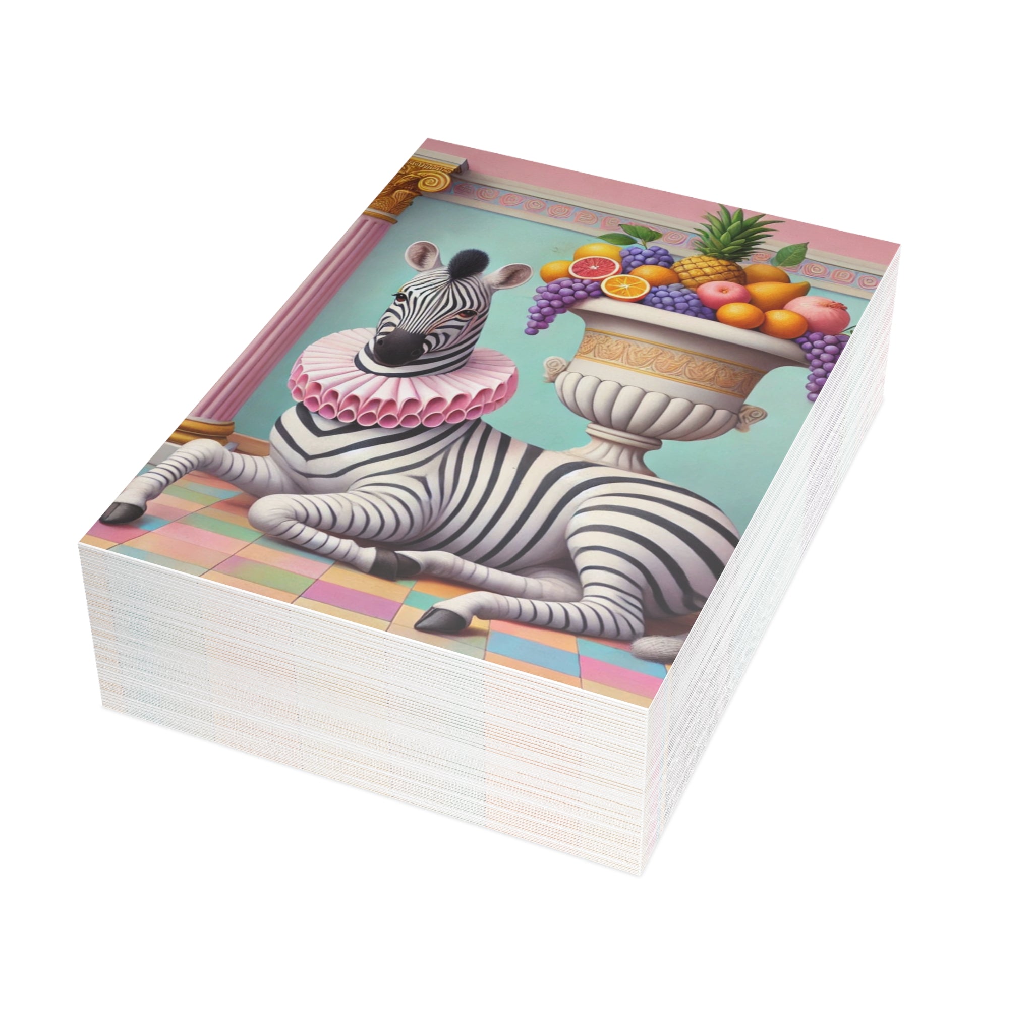 Zebra, Fruit, and Pink Columns Postcard Bundles capture a pastel-toned classical tableau in miniature, where a lounging zebra becomes the unlikely star beneath pink fluted columns and beside an overflowing amphora of fruit. Grapes cascade, citrus glows, and a pineapple crowns the arrangement, while a split pomegranate on the tiled floor adds a quiet note of abundance and symbolism. Dressed in a ruffled pink collar, the zebra blends elegance with absurdity—transforming the traditions of Greco-Roman still life into something playful, modern, and surreal in soft mint, blush, gold, and ivory.