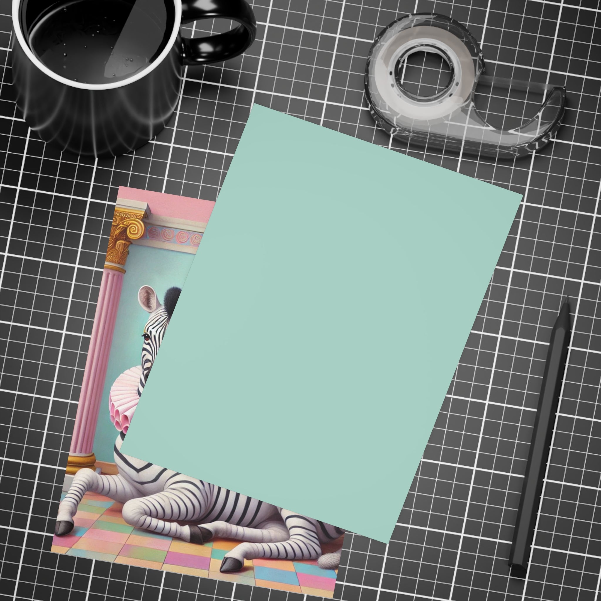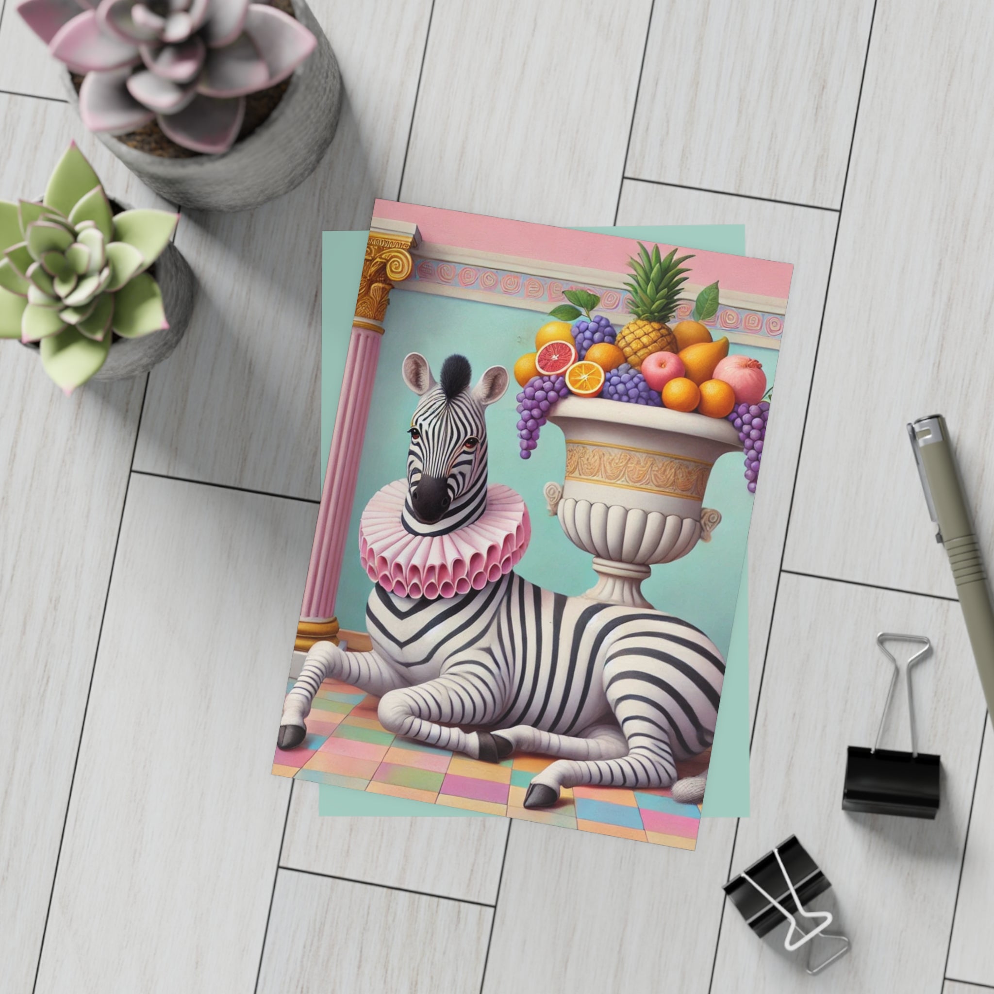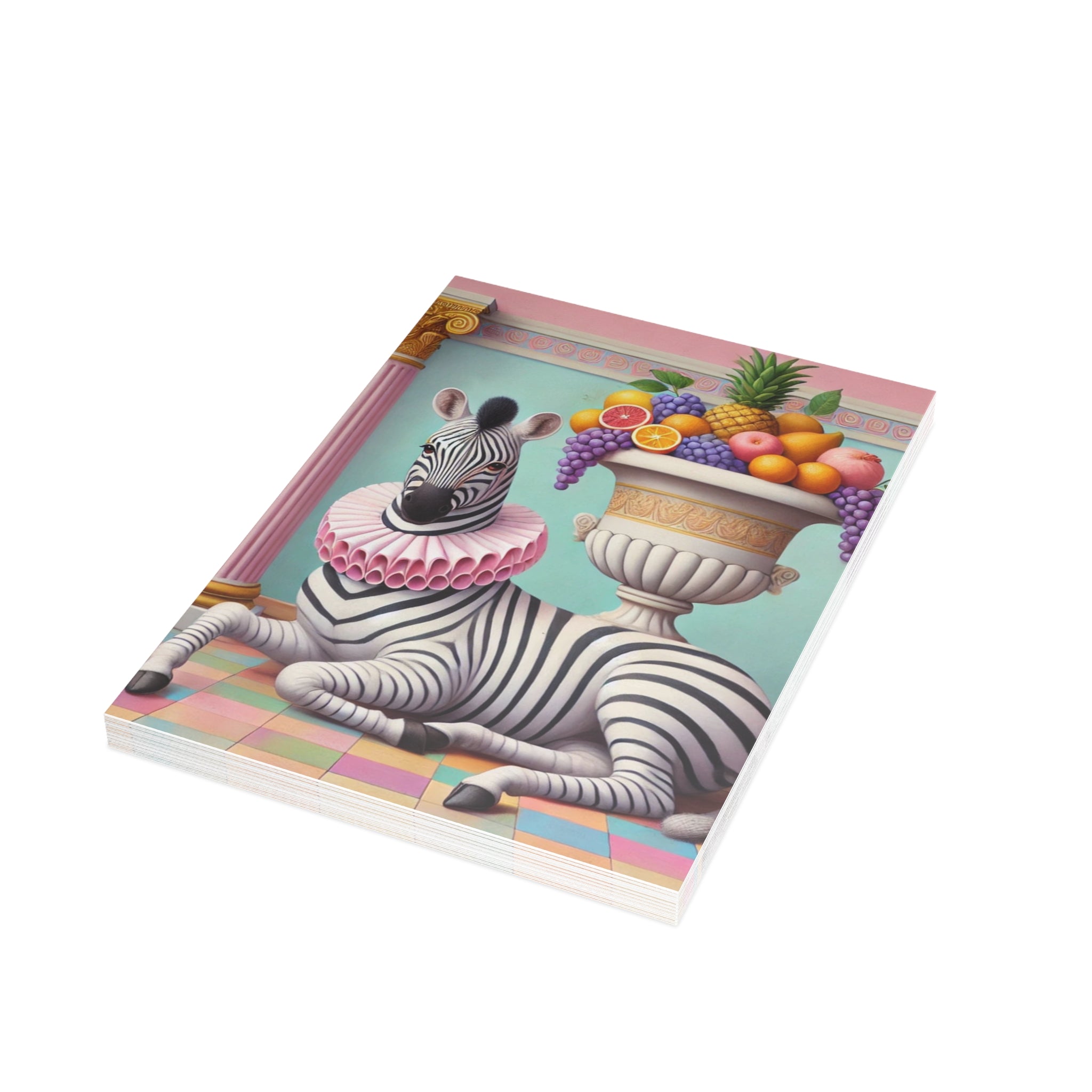 Zebra, Fruit, and Pink Columns Postcard Bundles capture a pastel-toned classical tableau in miniature, where a lounging zebra becomes the unlikely star beneath pink fluted columns and beside an overflowing amphora of fruit. Grapes cascade, citrus glows, and a pineapple crowns the arrangement, while a split pomegranate on the tiled floor adds a quiet note of abundance and symbolism. Dressed in a ruffled pink collar, the zebra blends elegance with absurdity—transforming the traditions of Greco-Roman still life into something playful, modern, and surreal in soft mint, blush, gold, and ivory.