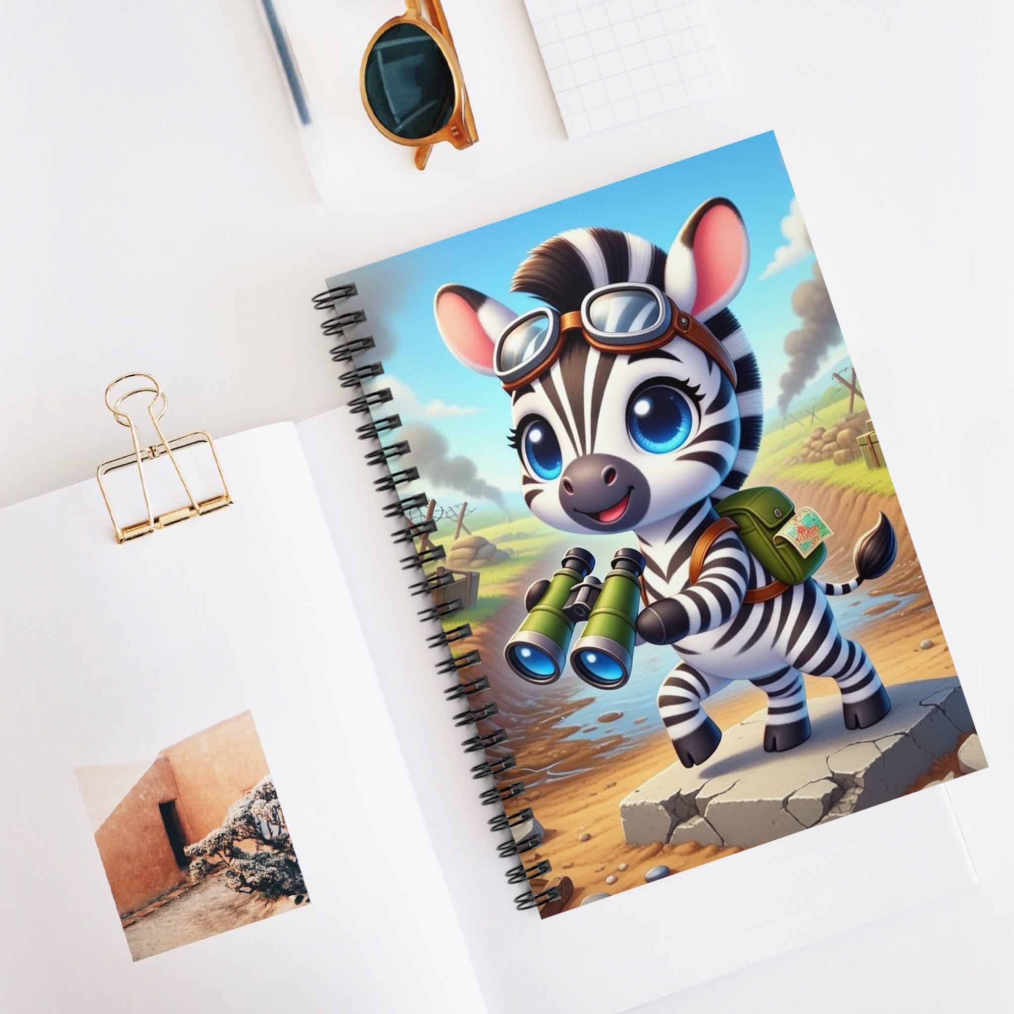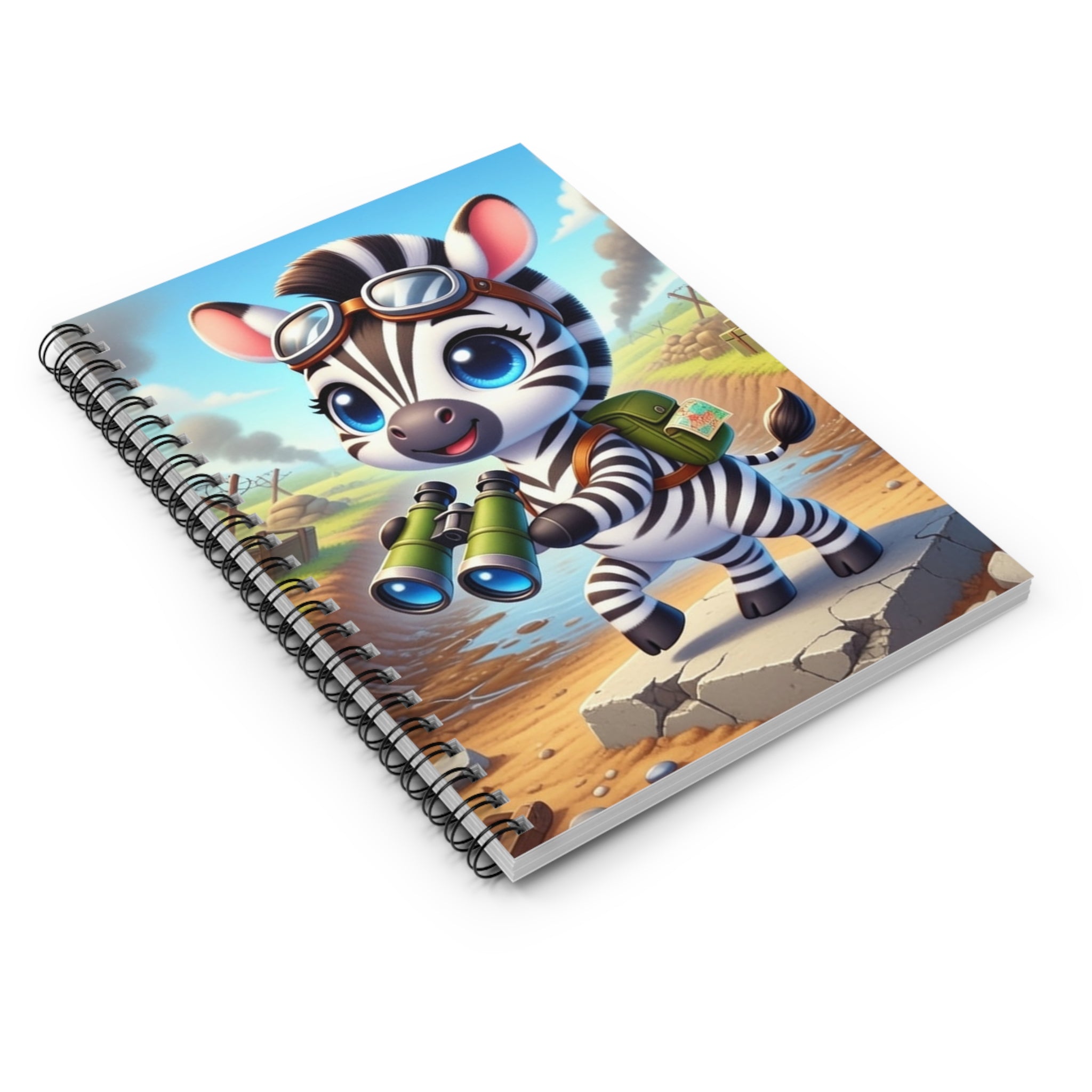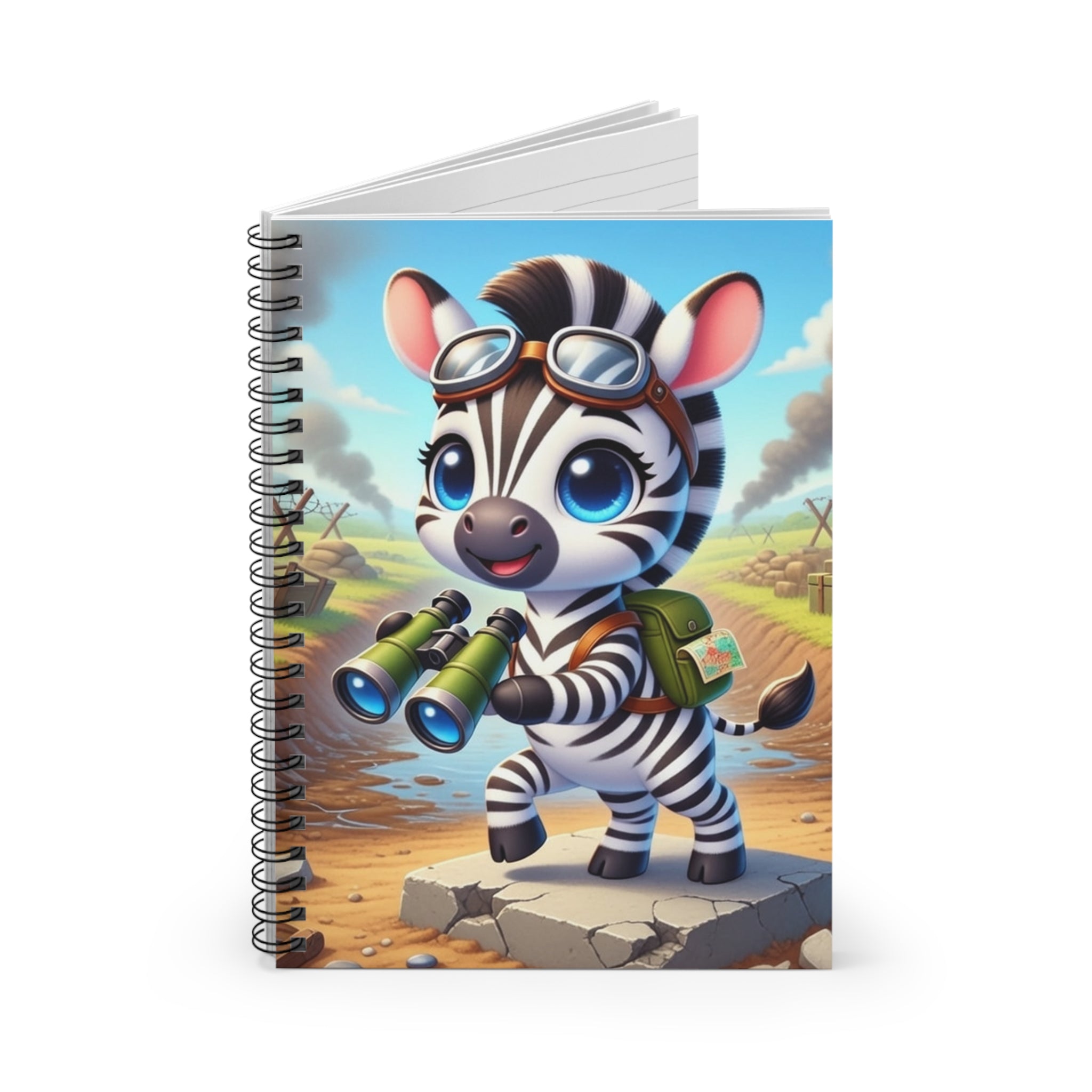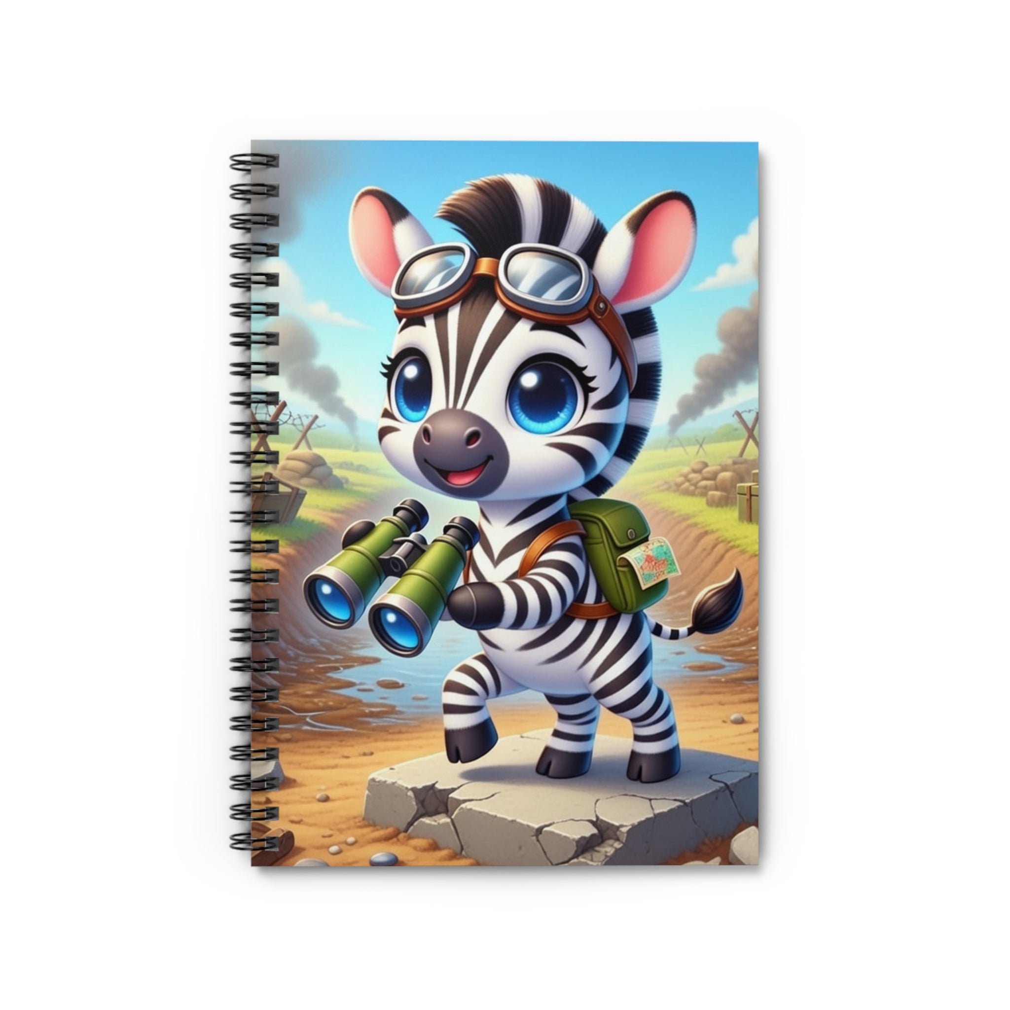 Zebra Look Out Spiral Notebook features a cheerful zebra standing alert atop a stone path with binoculars in hand—capturing a moment of curiosity and courage. Dressed like a young explorer and framed by a whimsical landscape of rolling fields and weathered ruins, this charming character embodies discovery, optimism, and youthful bravery. Shopping lists, school notes, or poems—this 118-page spiral notebook with ruled line paper is a perfect companion in everyday life, and the durable printed cover makes the owner proud to carry it everywhere.