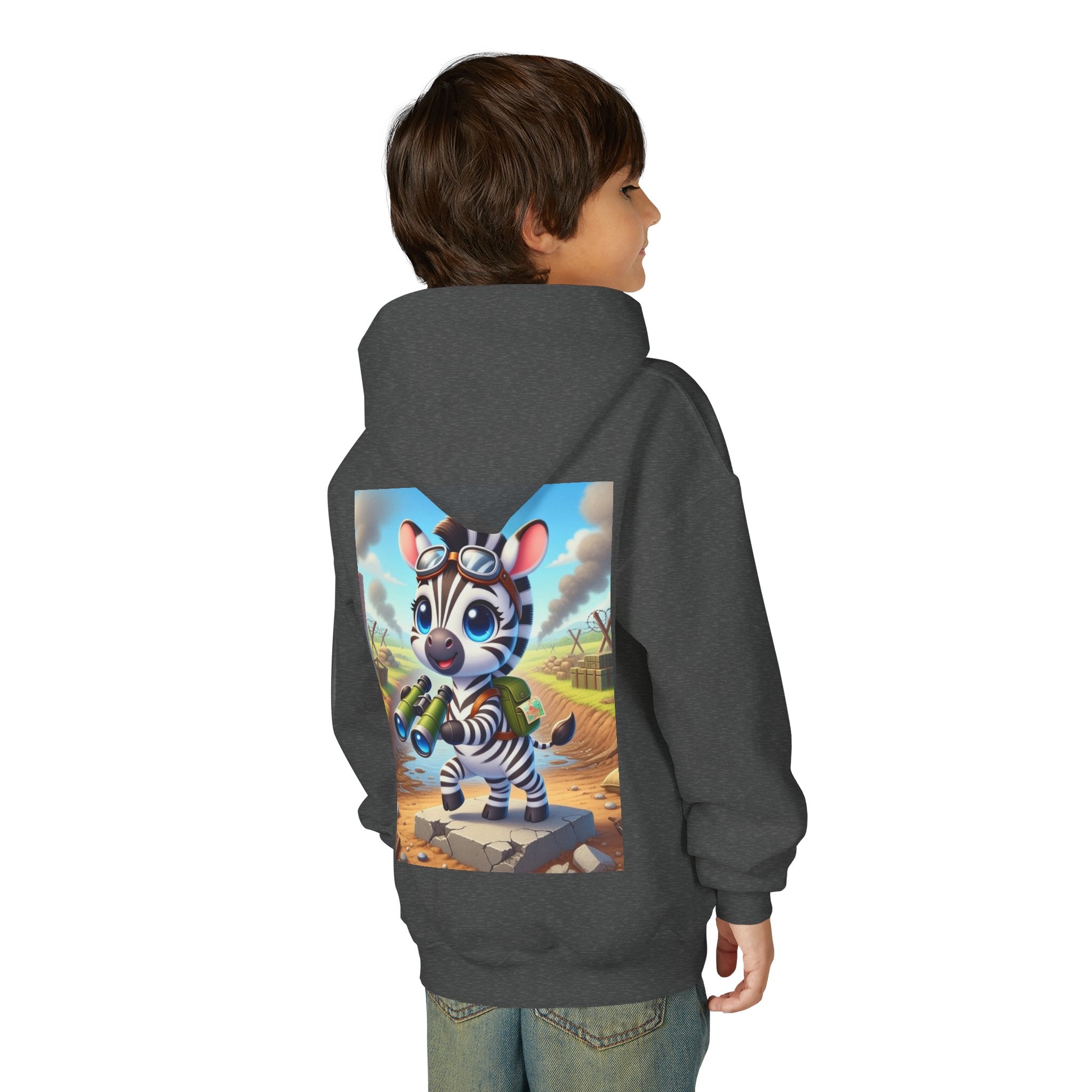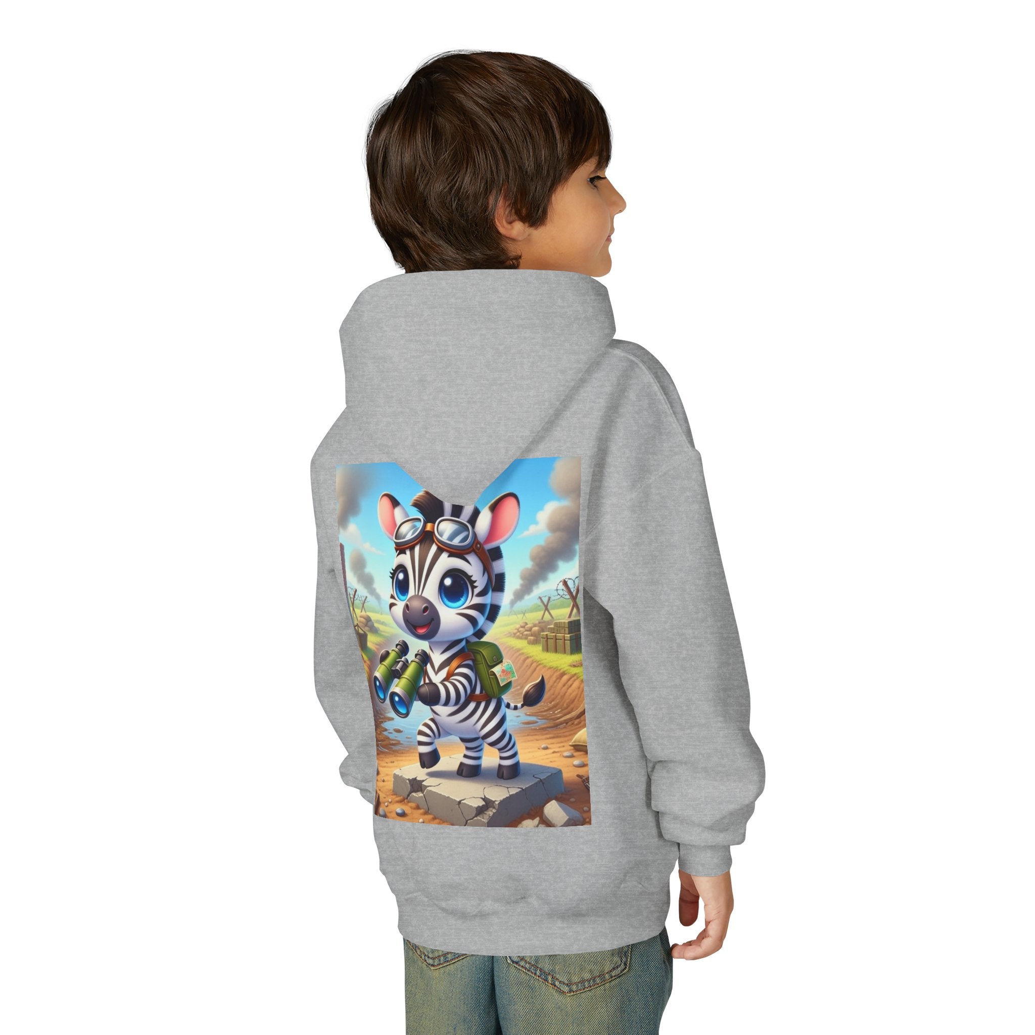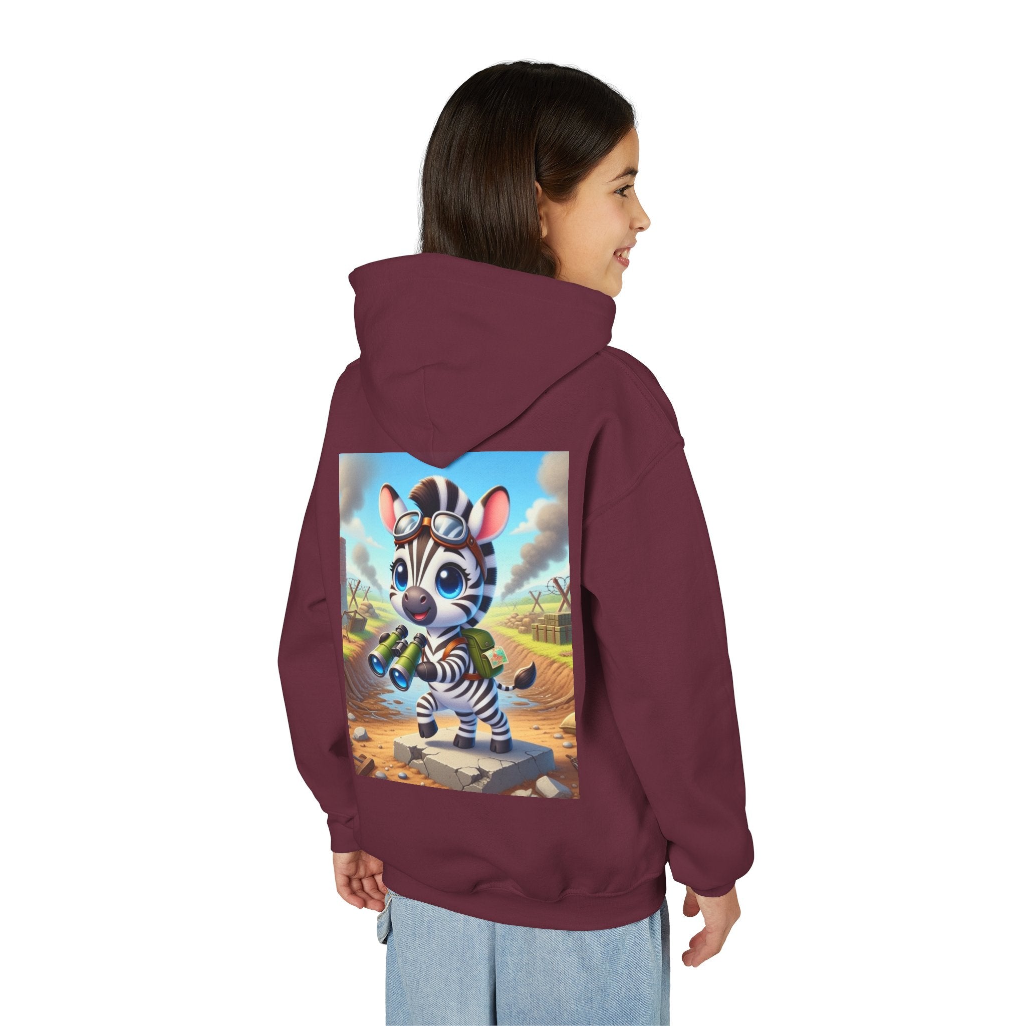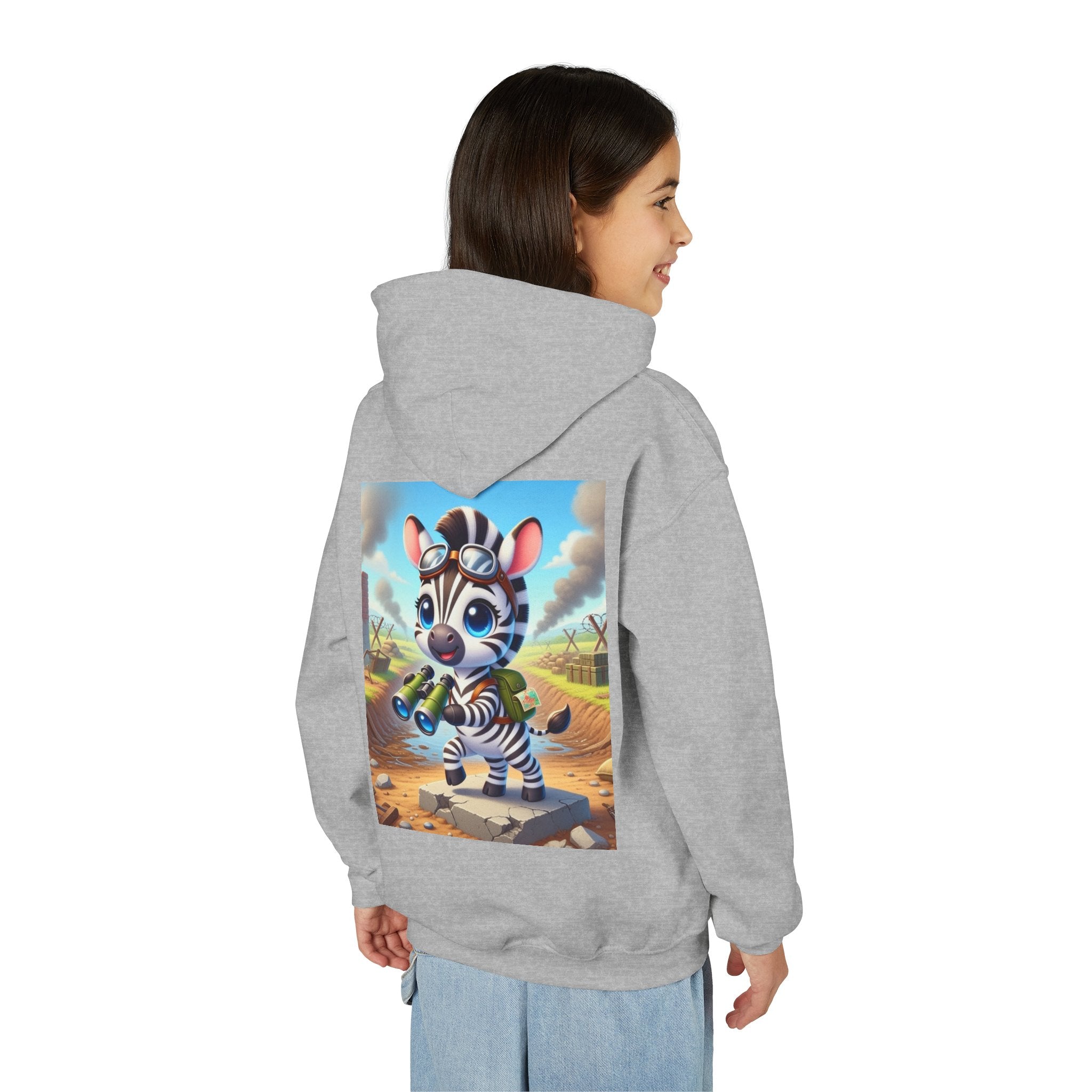 Zebra Lookout Youth Heavy Blend Hooded Sweatshirt brings playful adventure and cheerful bravery to a cozy everyday layer. The artwork features a bright-eyed zebra standing alert atop a stone path with binoculars in hand, capturing a spirited moment of curiosity and courage. Dressed like a young explorer and framed by a whimsical landscape of rolling fields and weathered ruins, this charming character evokes discovery, optimism, and youthful imagination.