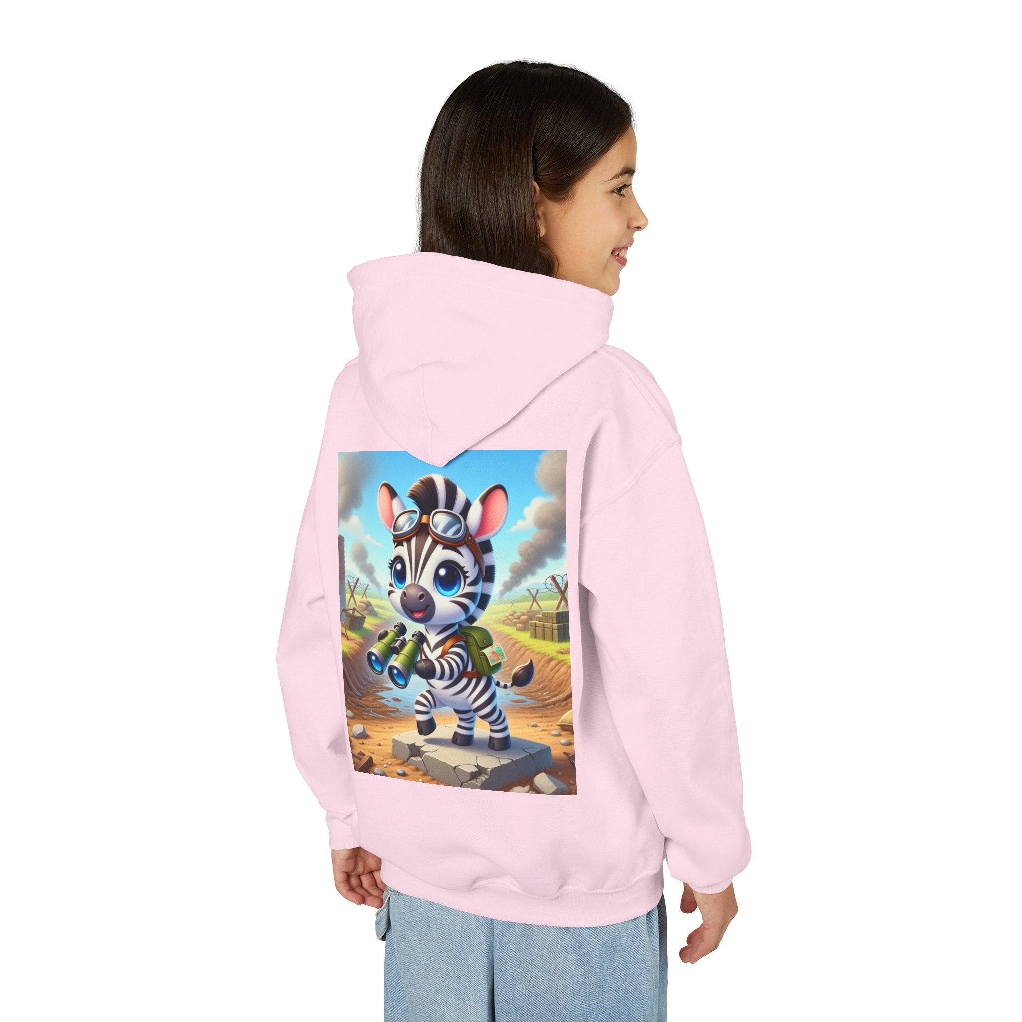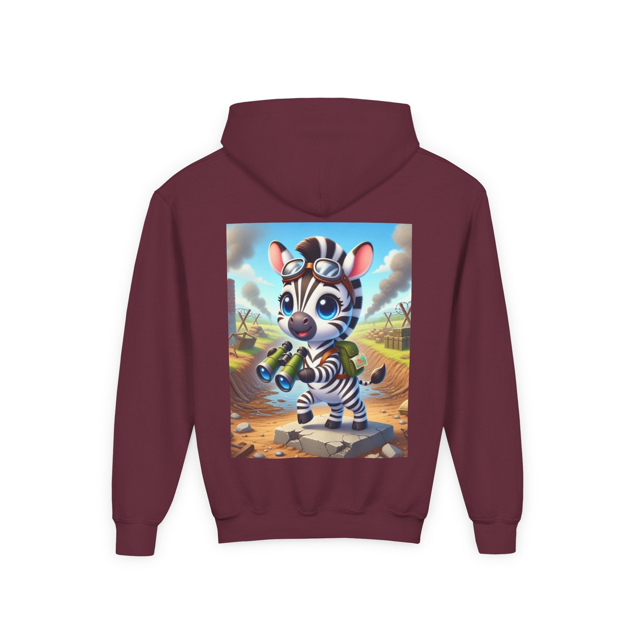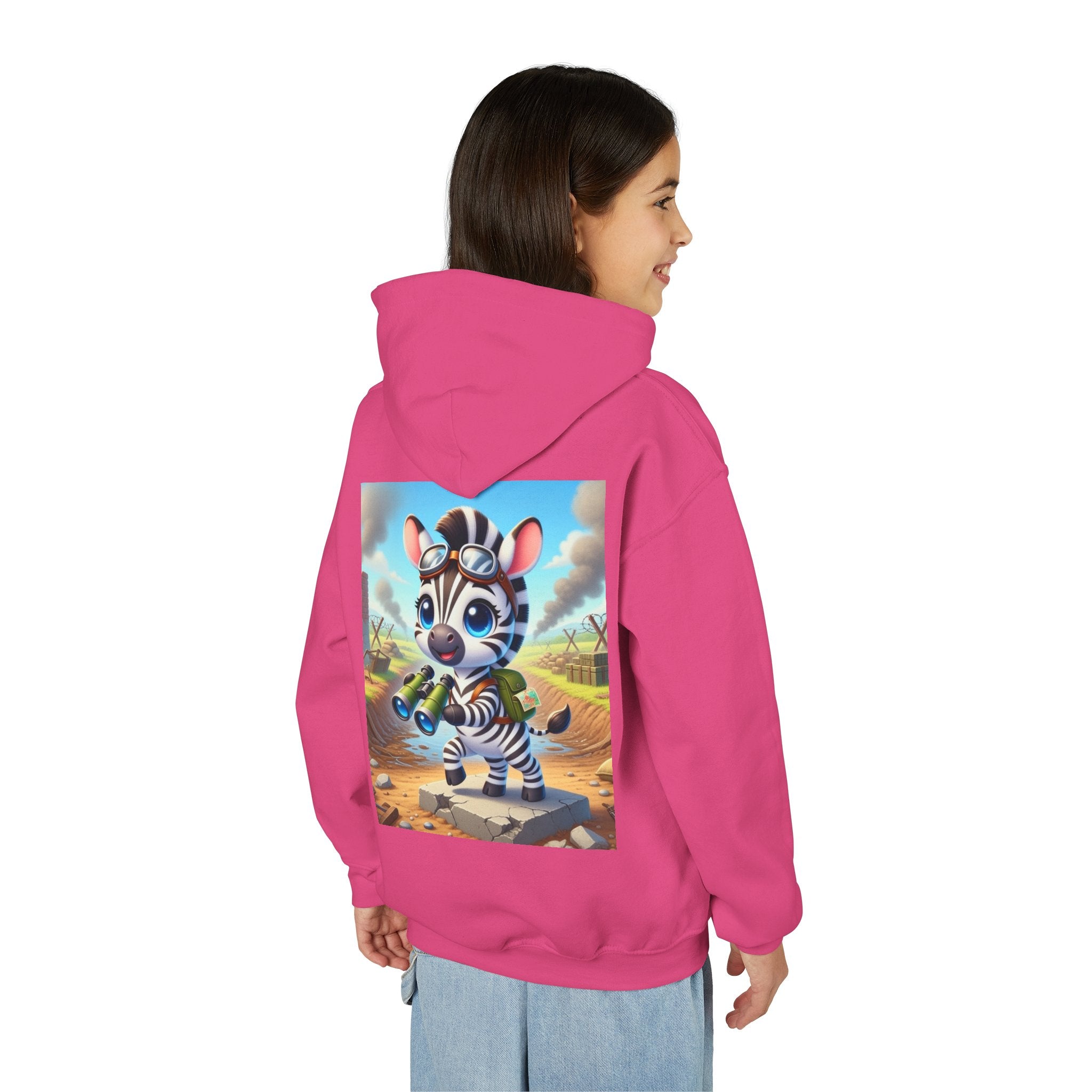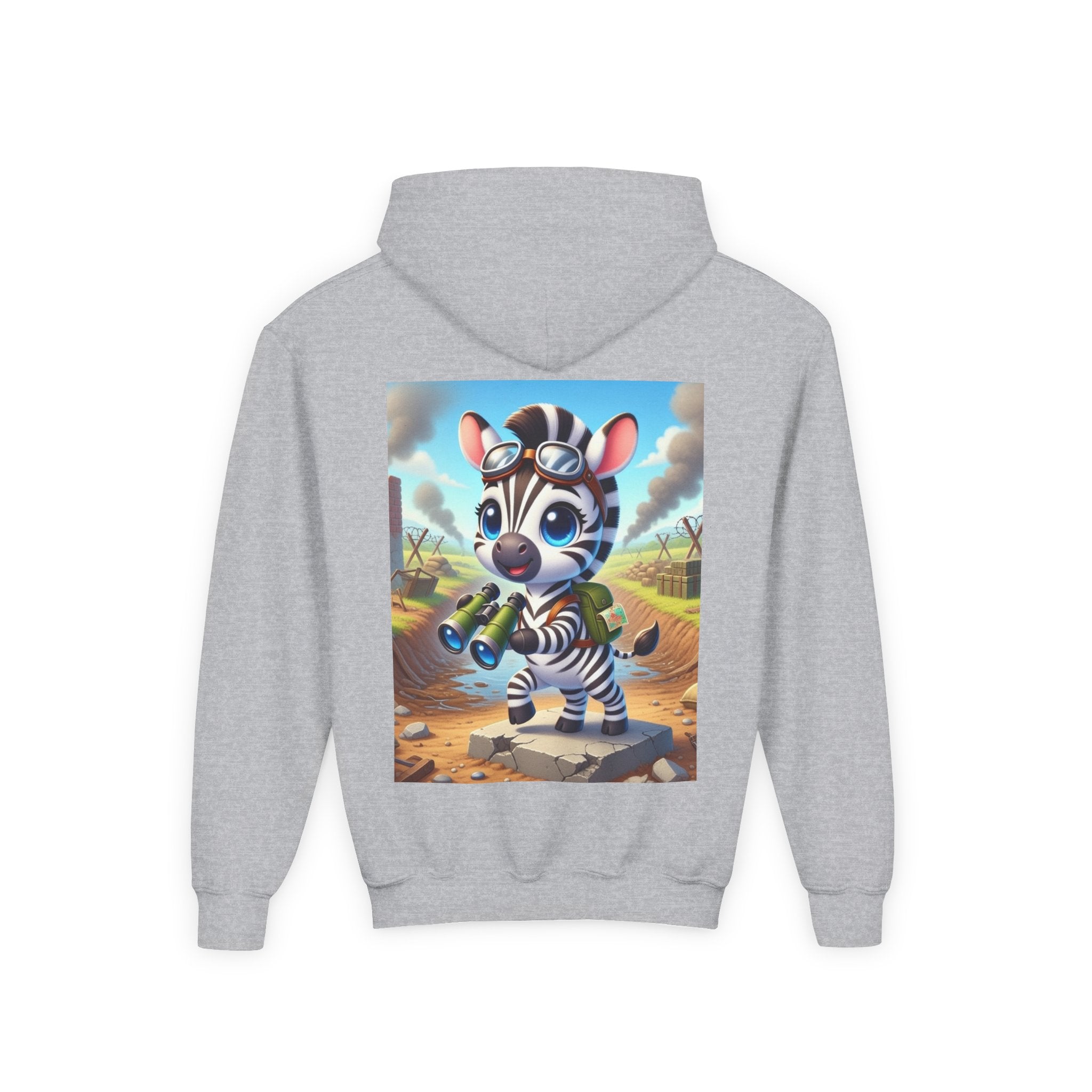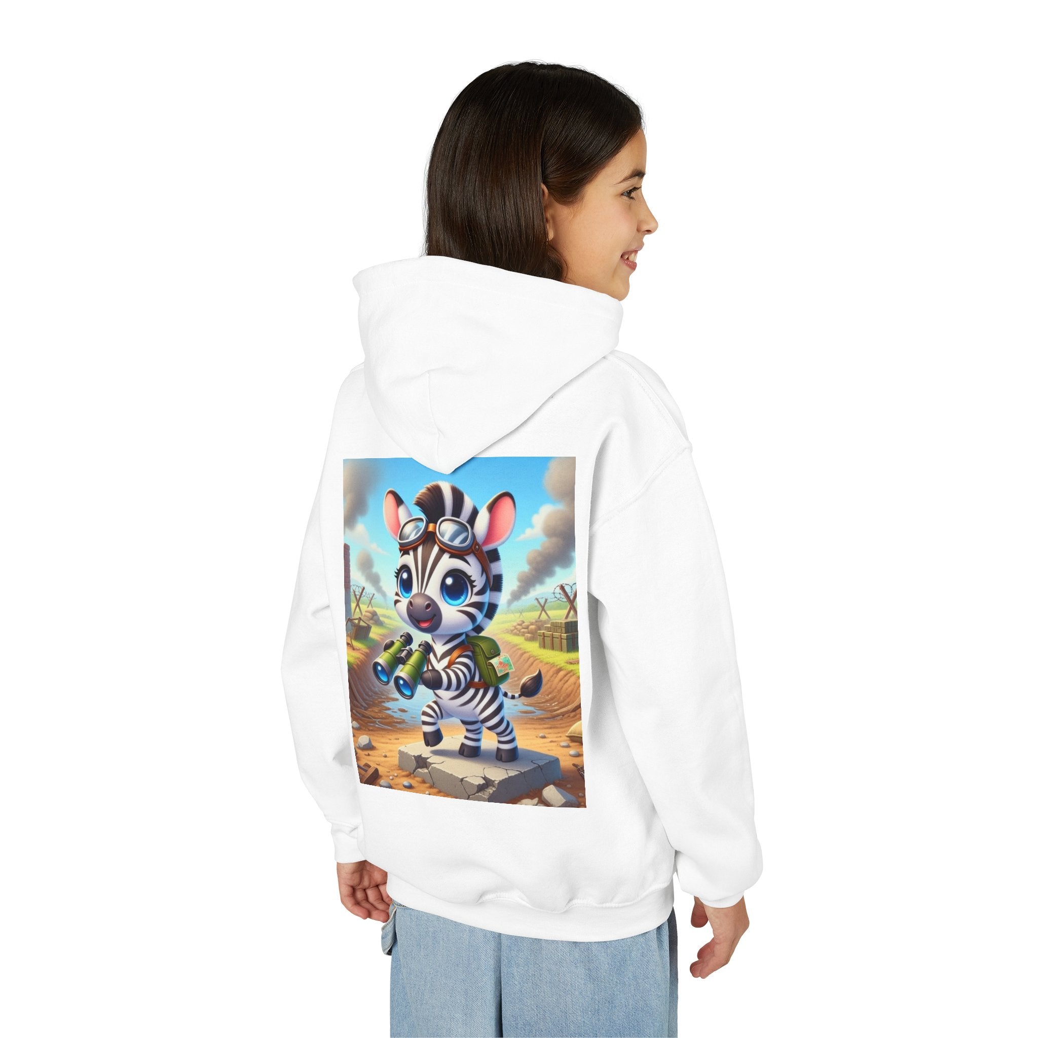 Zebra Lookout Youth Heavy Blend Hooded Sweatshirt brings playful adventure and cheerful bravery to a cozy everyday layer. The artwork features a bright-eyed zebra standing alert atop a stone path with binoculars in hand, capturing a spirited moment of curiosity and courage. Dressed like a young explorer and framed by a whimsical landscape of rolling fields and weathered ruins, this charming character evokes discovery, optimism, and youthful imagination.