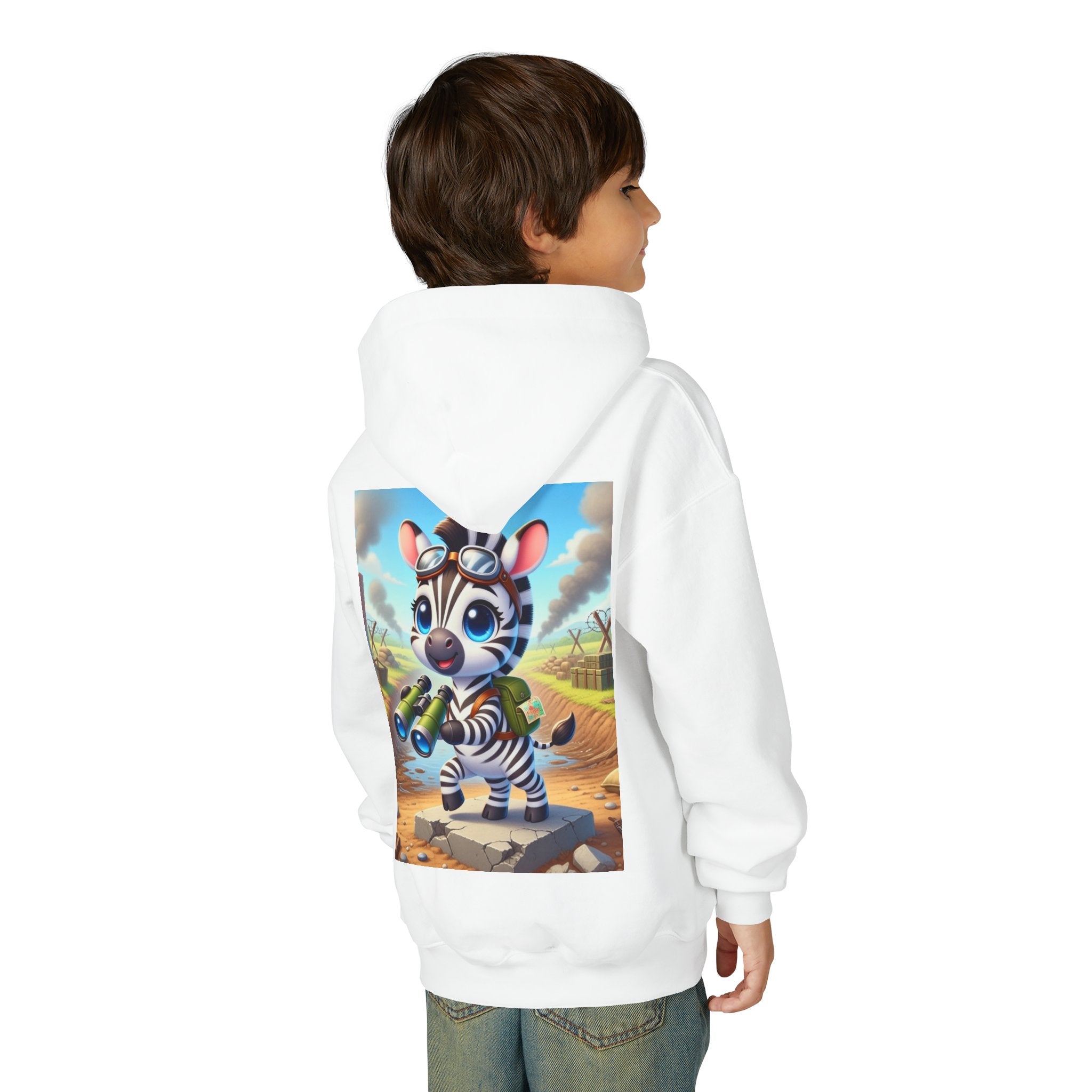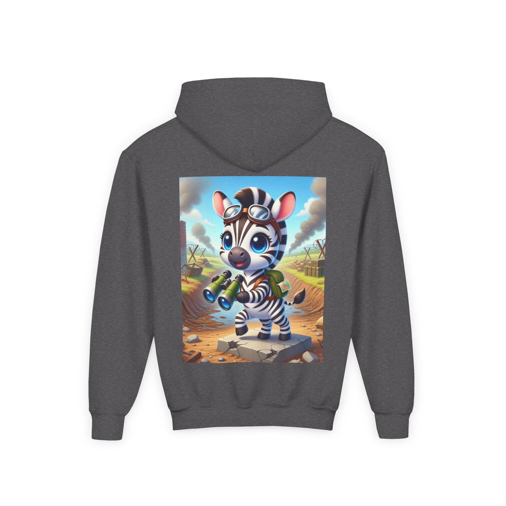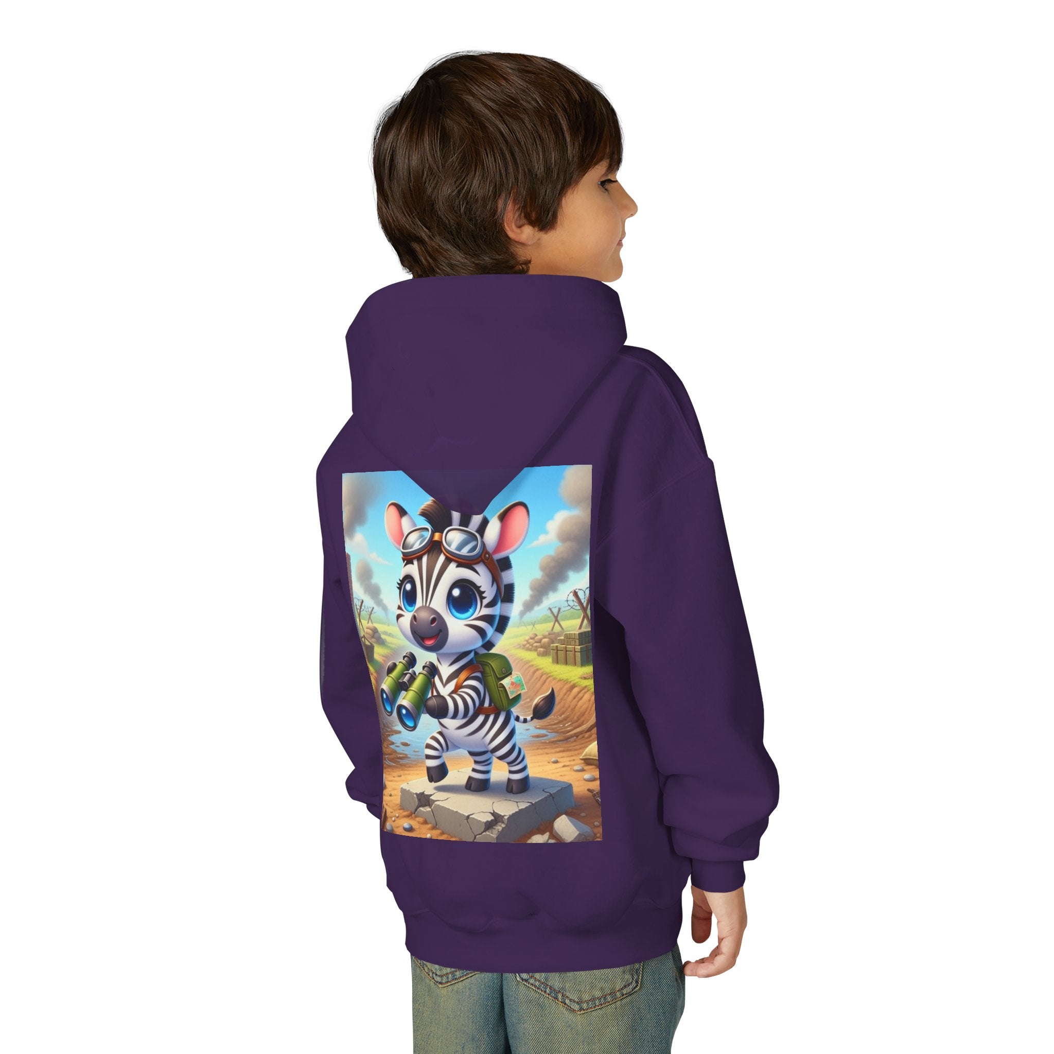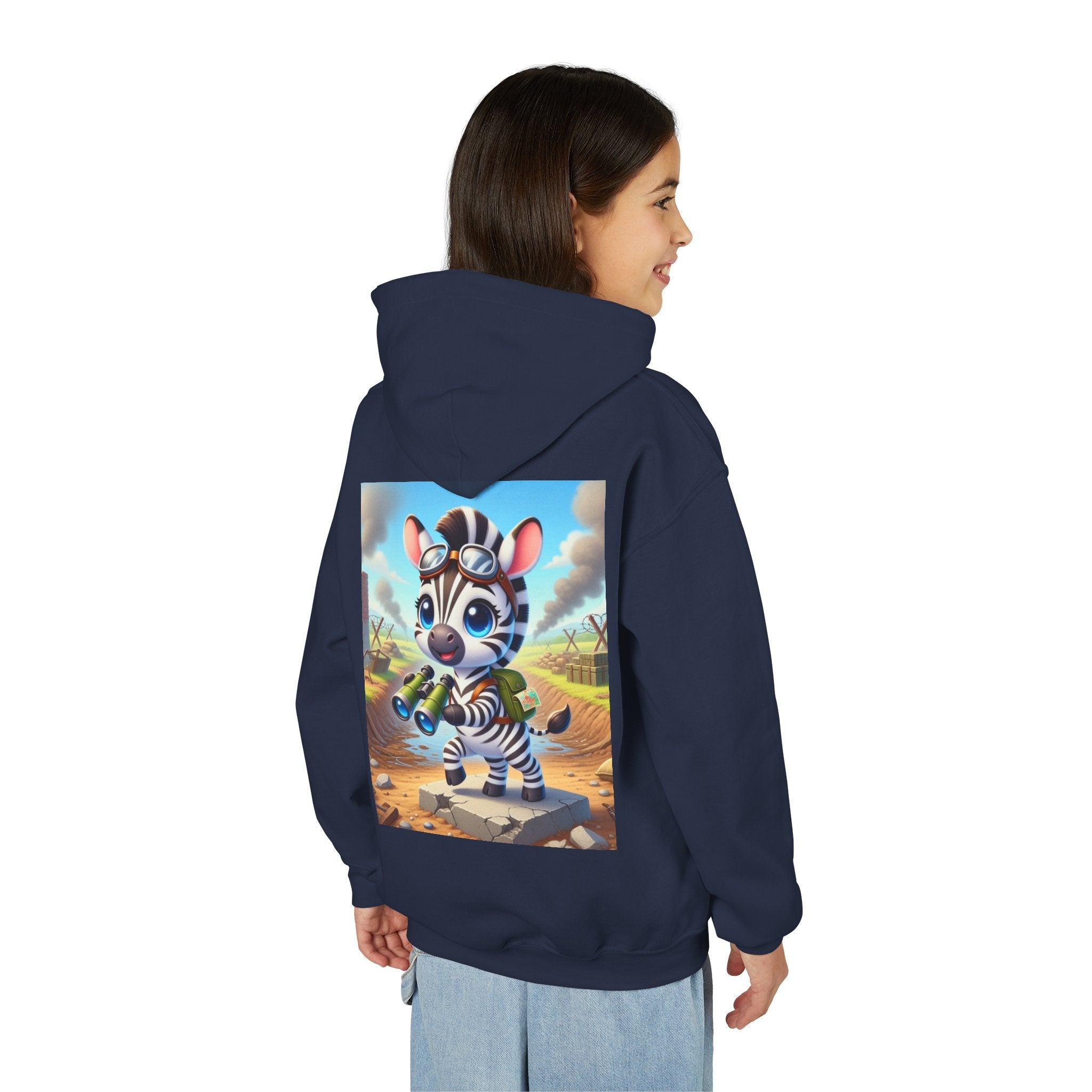 Zebra Lookout Youth Heavy Blend Hooded Sweatshirt brings playful adventure and cheerful bravery to a cozy everyday layer. The artwork features a bright-eyed zebra standing alert atop a stone path with binoculars in hand, capturing a spirited moment of curiosity and courage. Dressed like a young explorer and framed by a whimsical landscape of rolling fields and weathered ruins, this charming character evokes discovery, optimism, and youthful imagination.