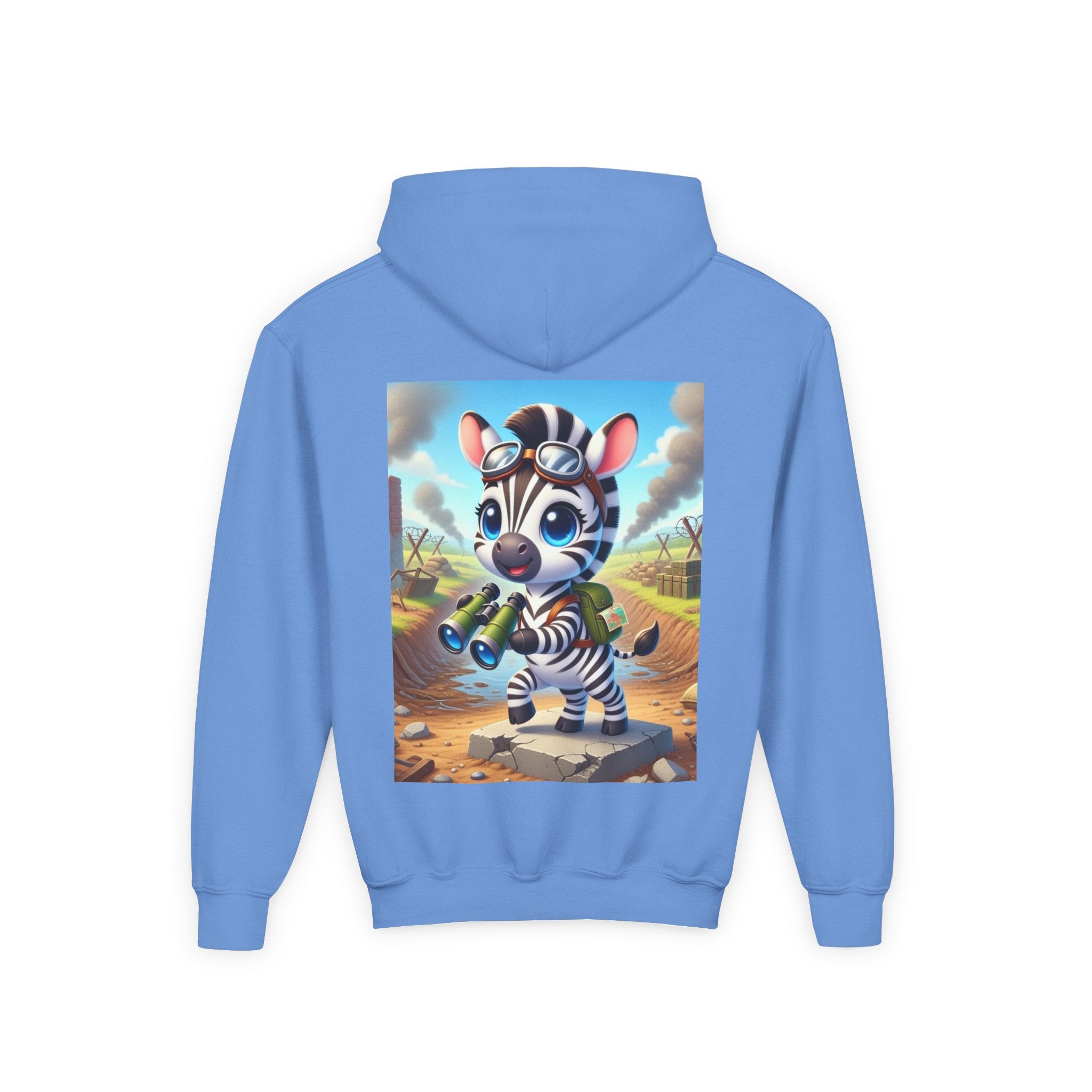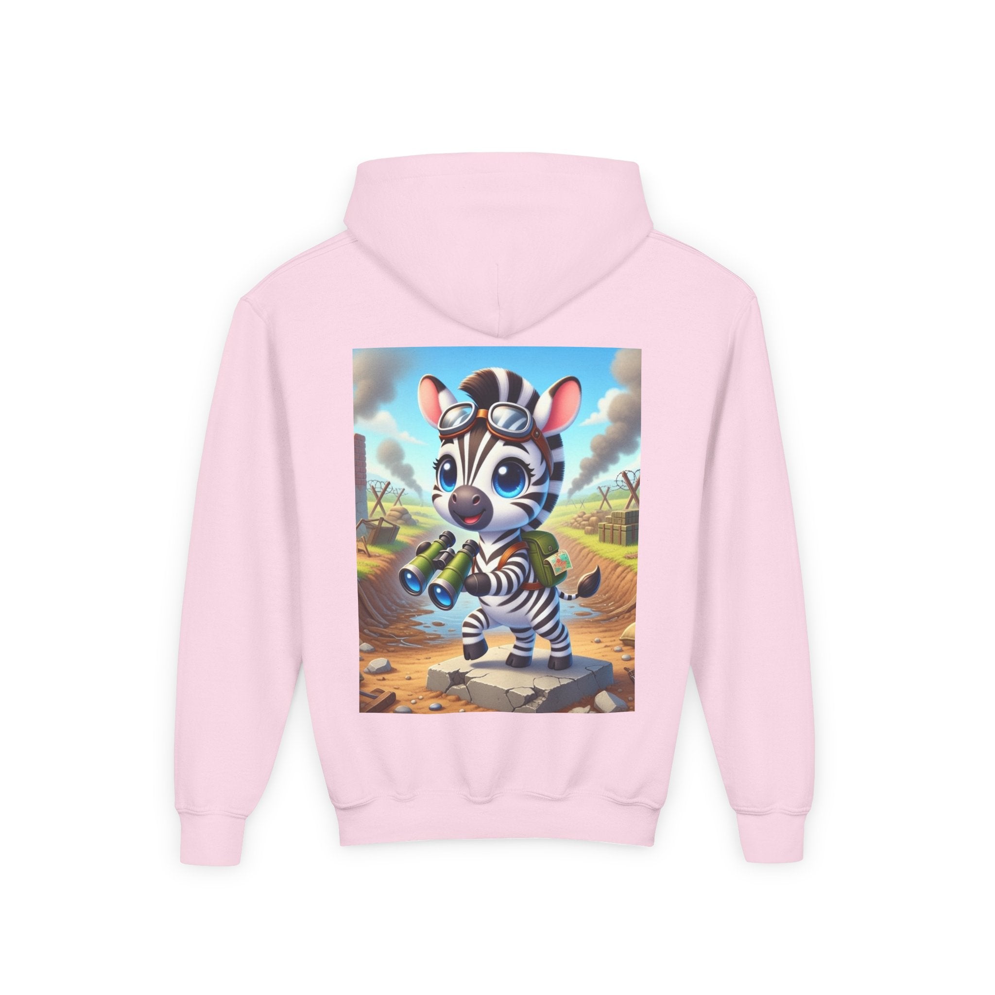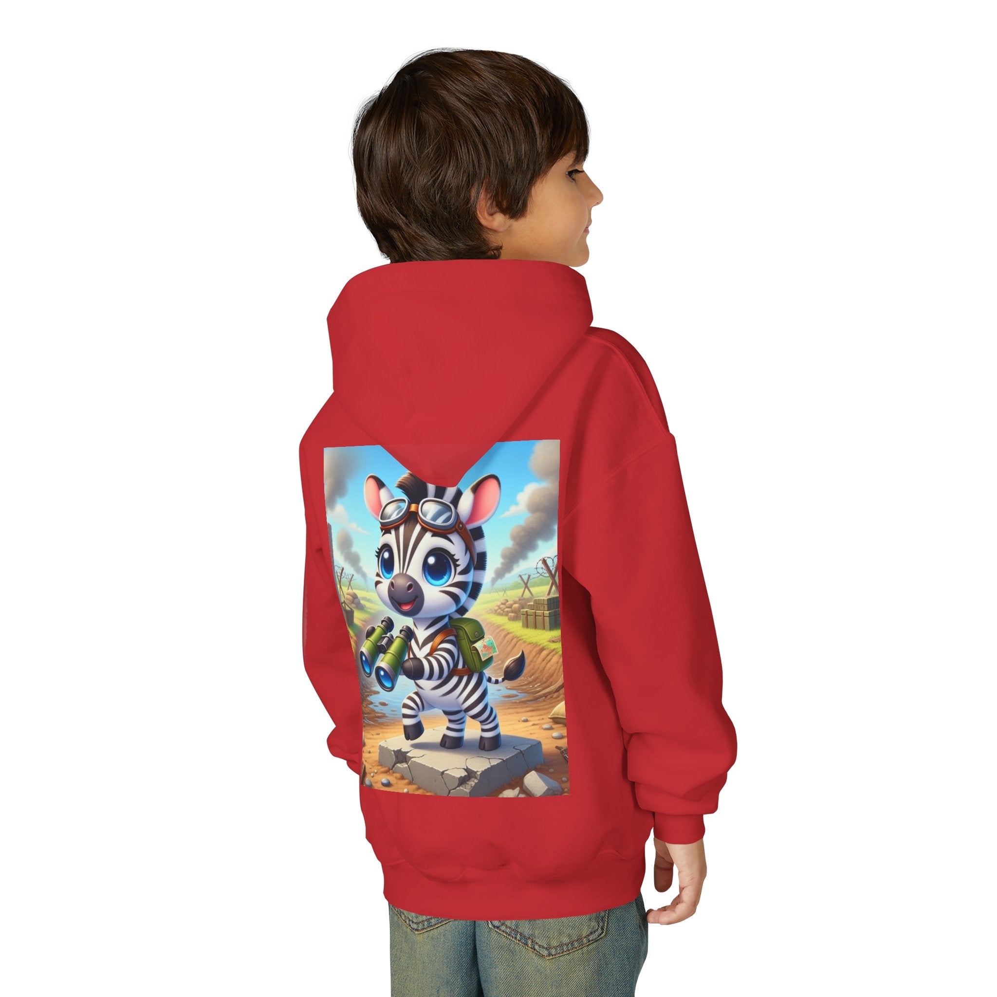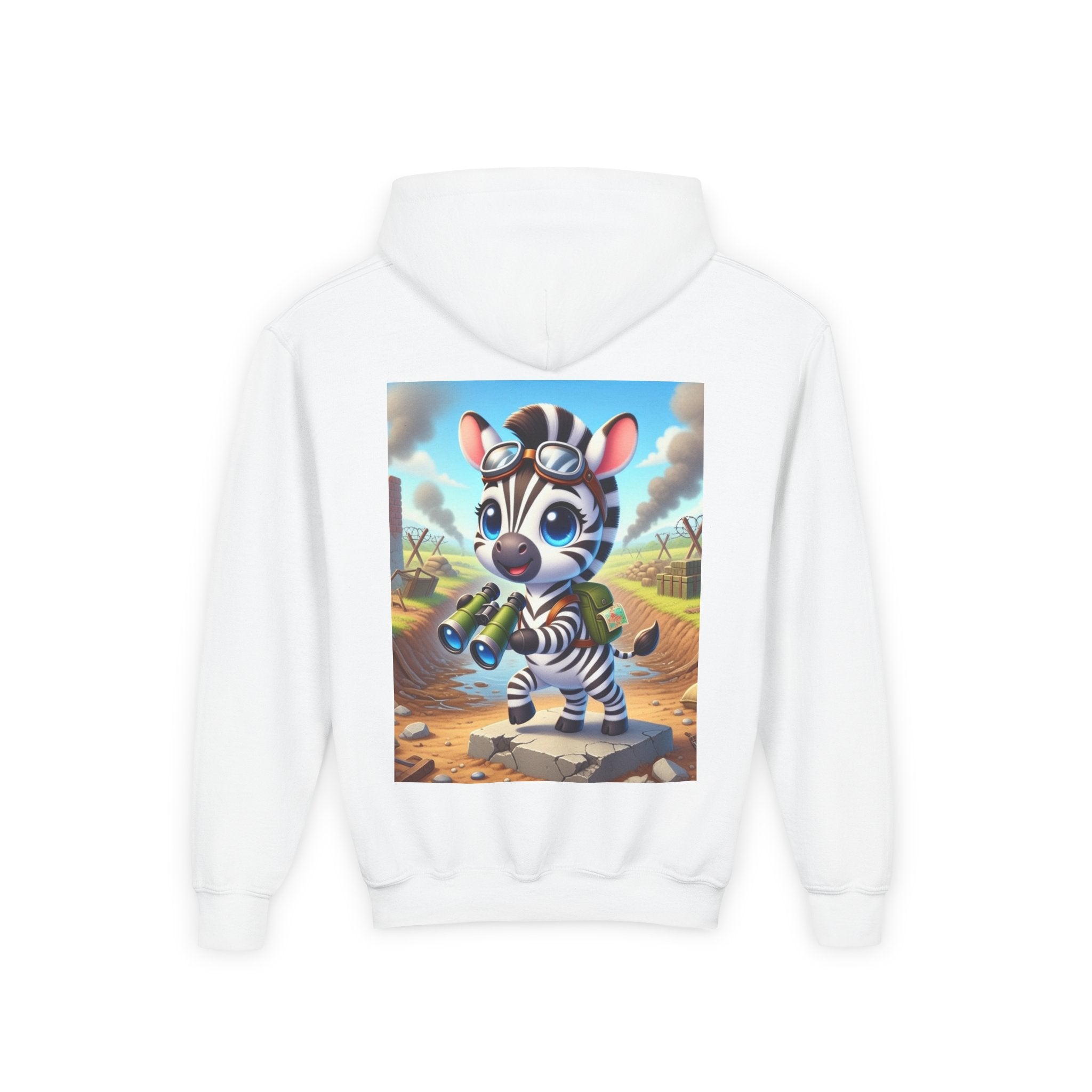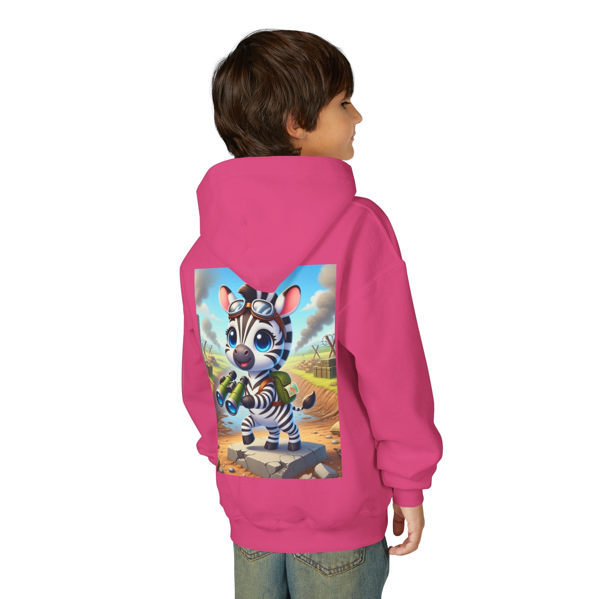 Zebra Lookout Youth Heavy Blend Hooded Sweatshirt brings playful adventure and cheerful bravery to a cozy everyday layer. The artwork features a bright-eyed zebra standing alert atop a stone path with binoculars in hand, capturing a spirited moment of curiosity and courage. Dressed like a young explorer and framed by a whimsical landscape of rolling fields and weathered ruins, this charming character evokes discovery, optimism, and youthful imagination.